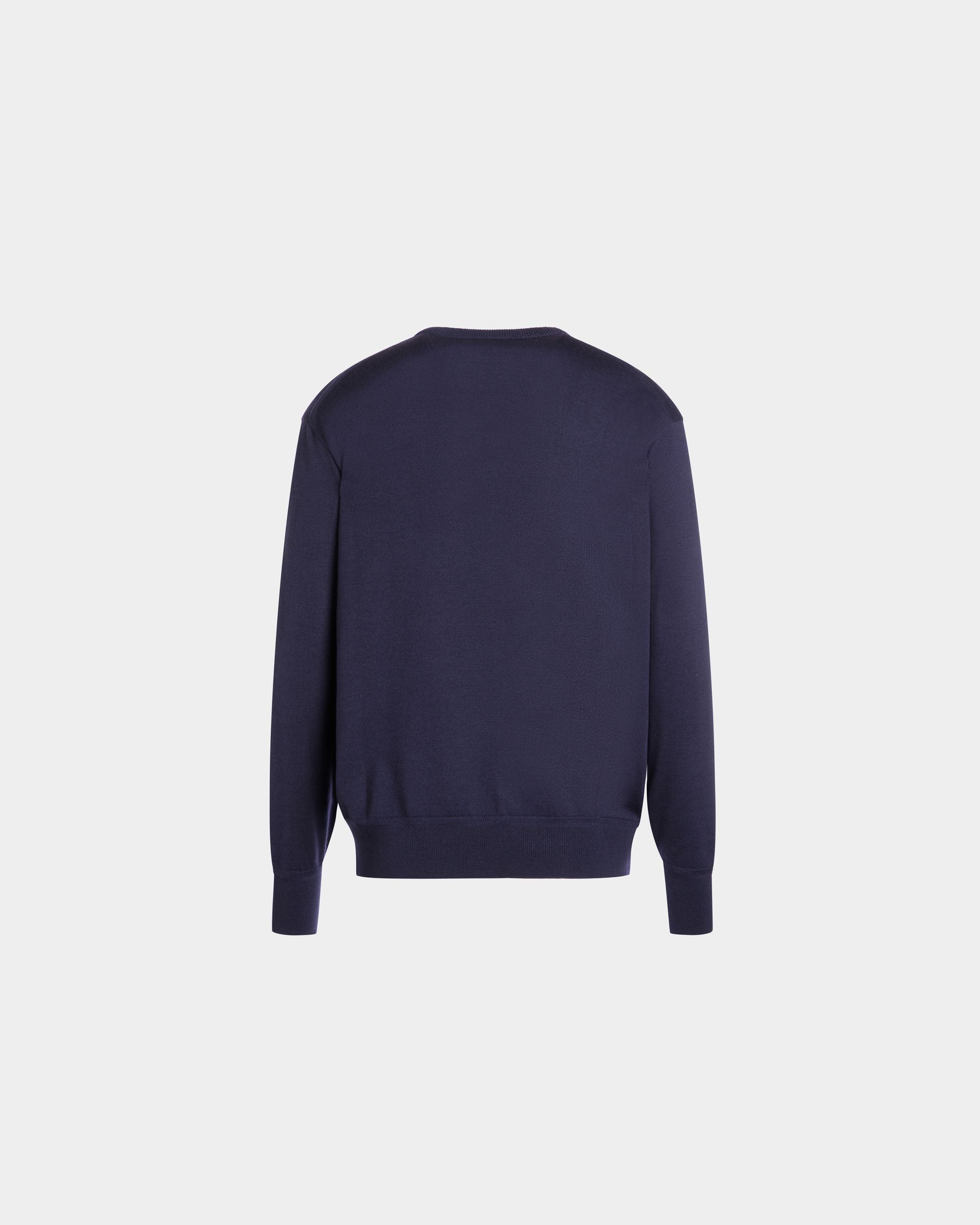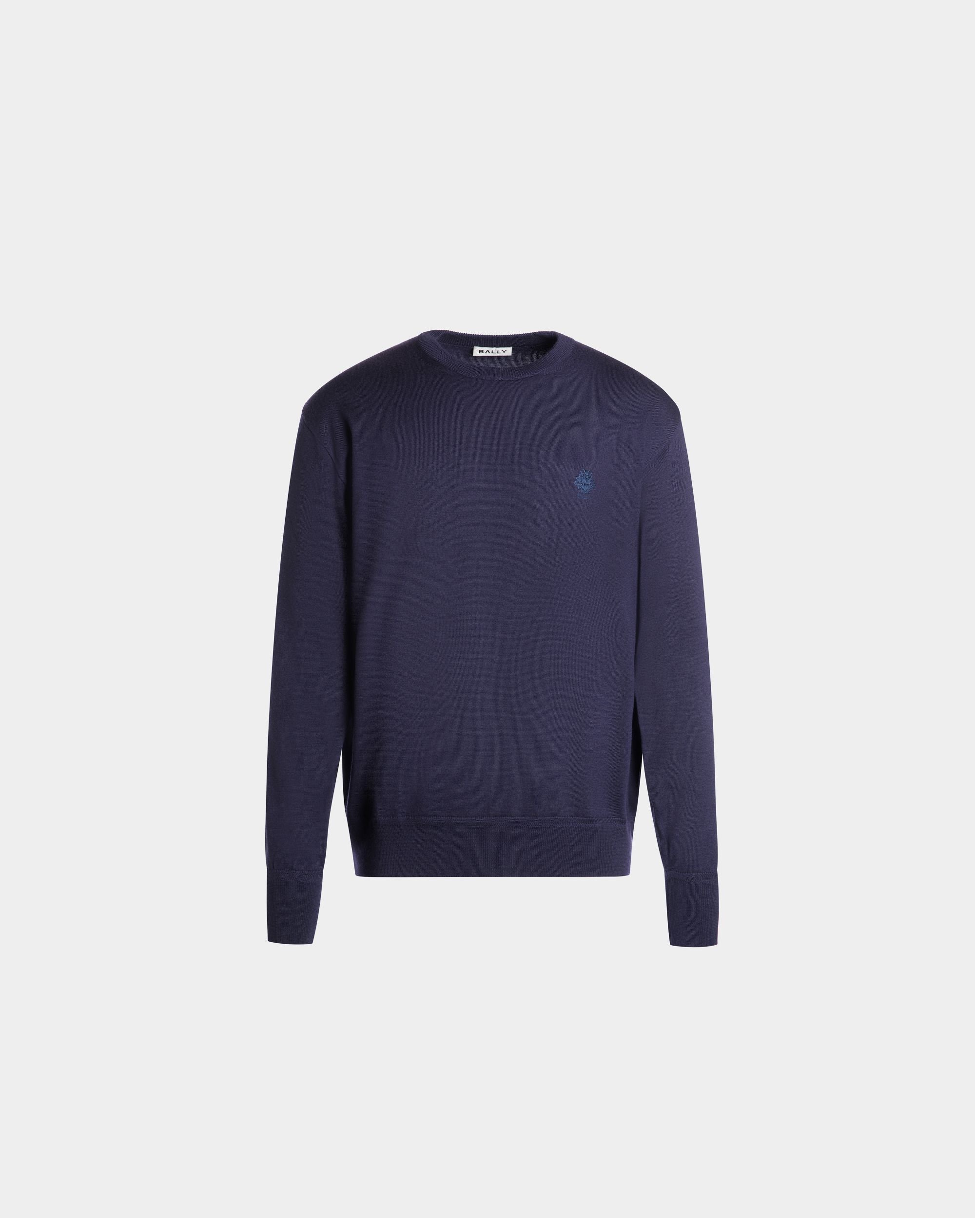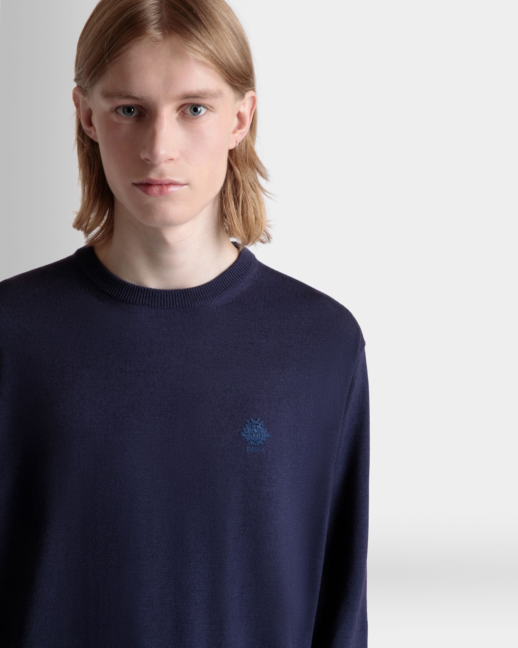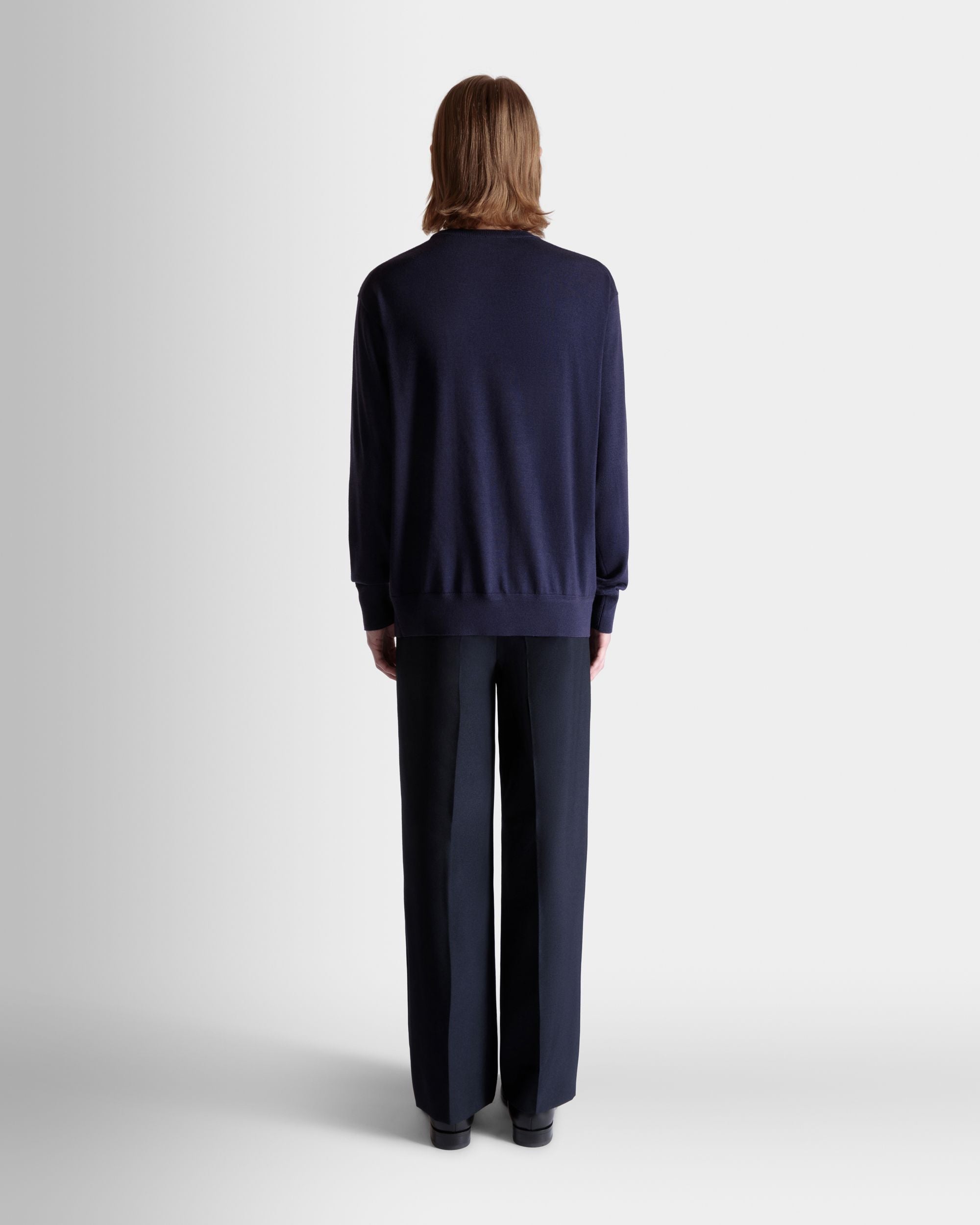 This navy blue sweater blends finest merino wool. cashmere and silk in a 14-gauge stockinette stitch with a soft. smooth feel. A Bally Crest is embroidered on the left chest.