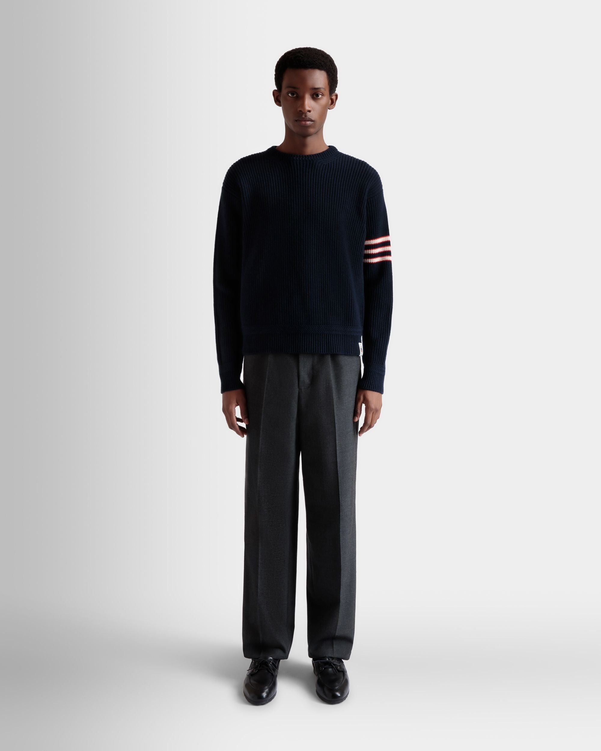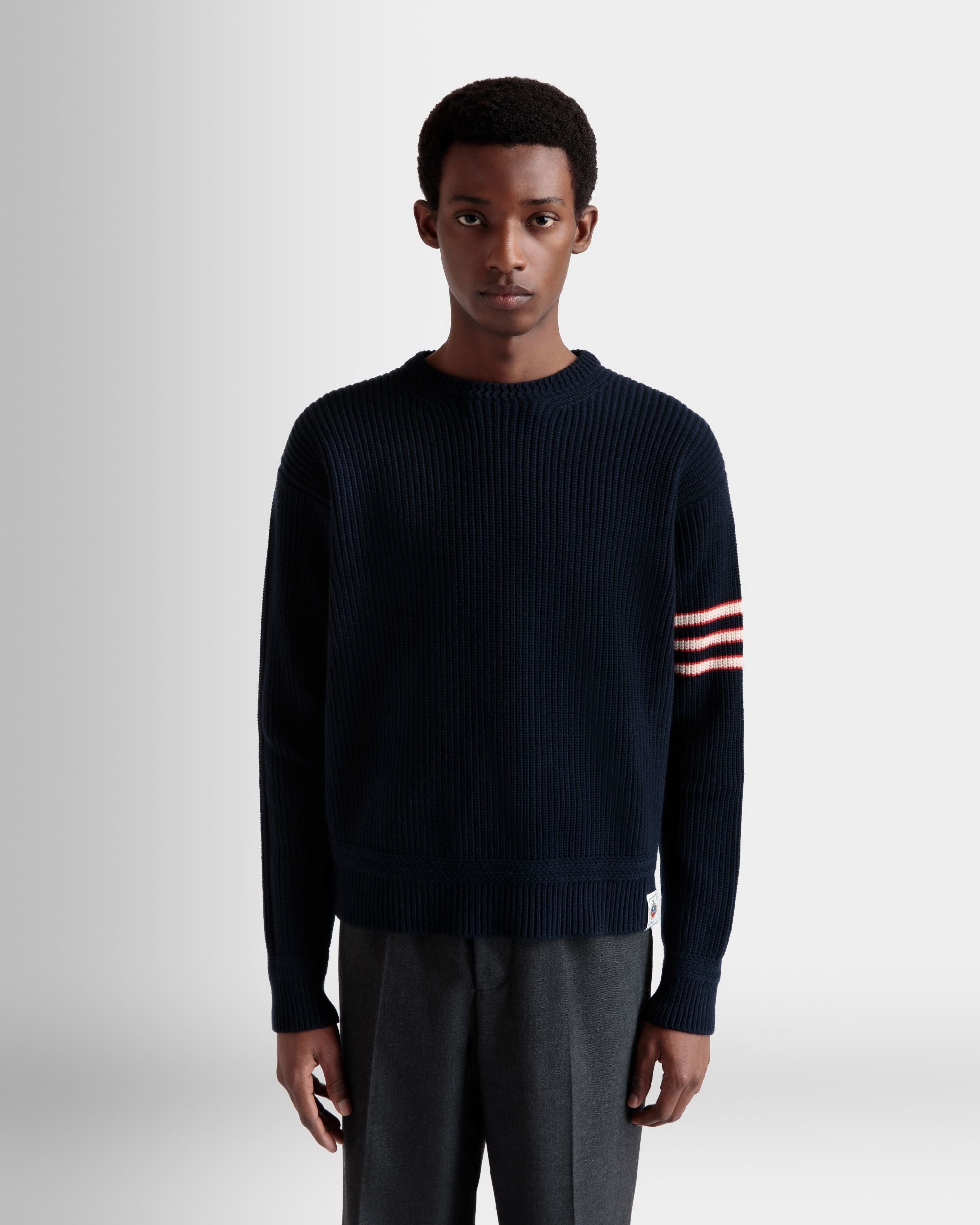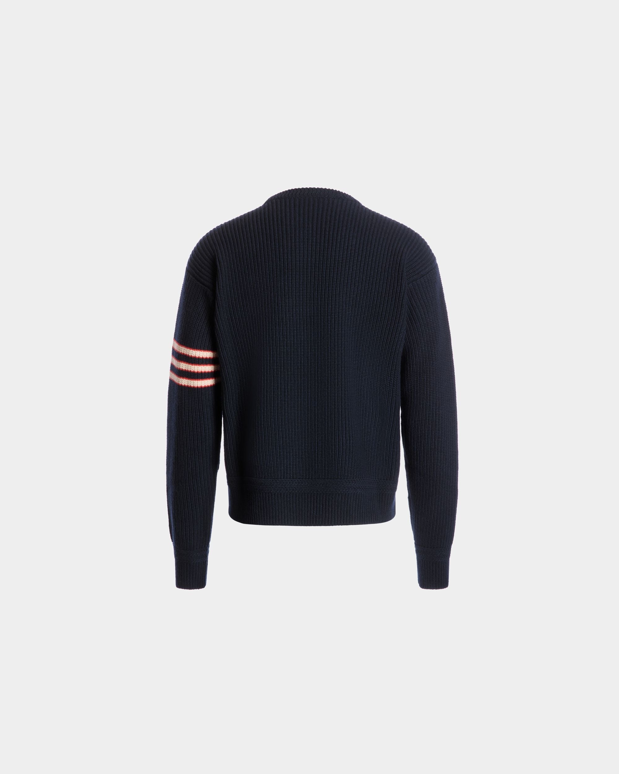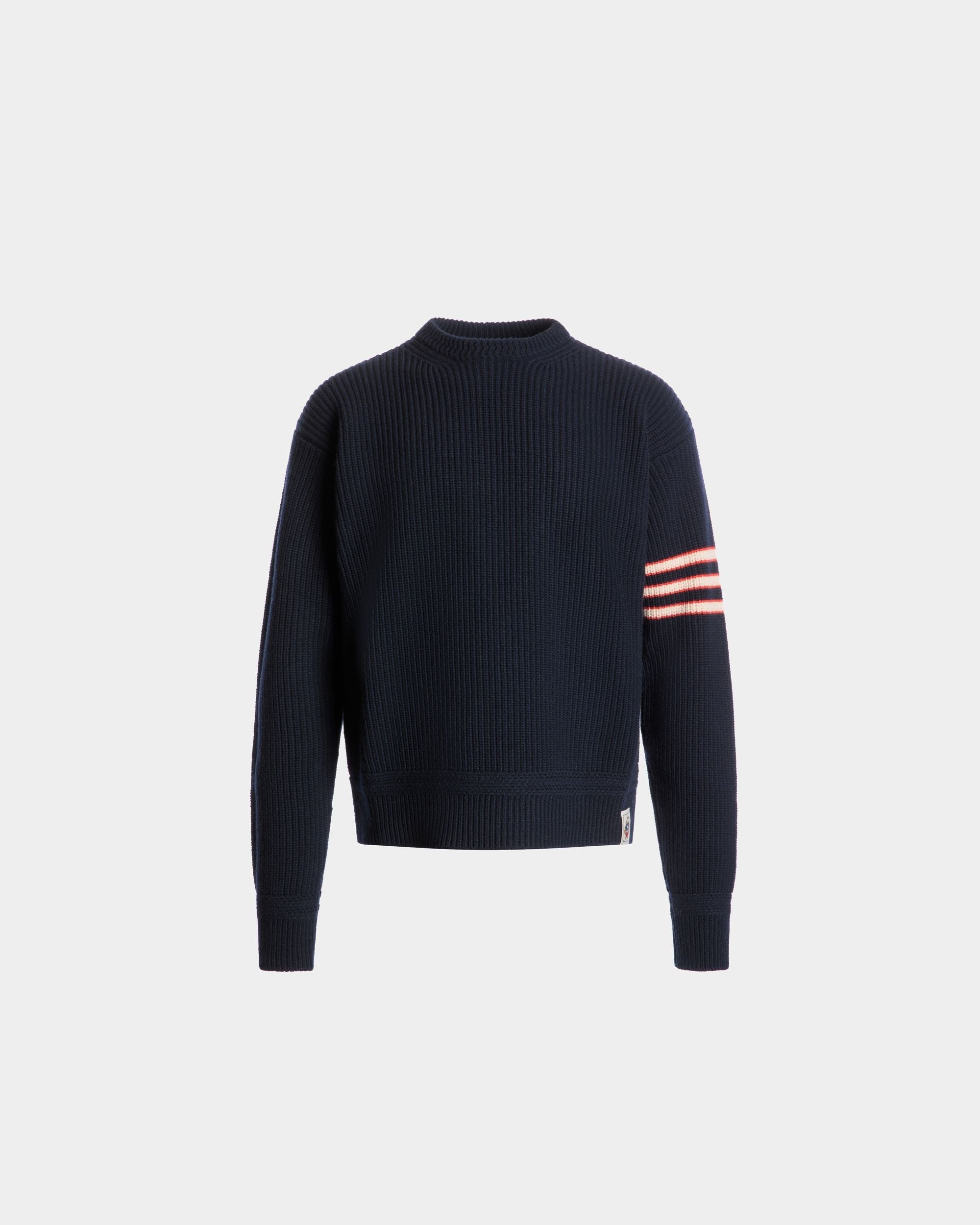 Timeless and versatile. this crewneck sweater in navy blue wool has a Bally Crest label on the hemline and a red and white Ribbon motif on one of the long sleeves.