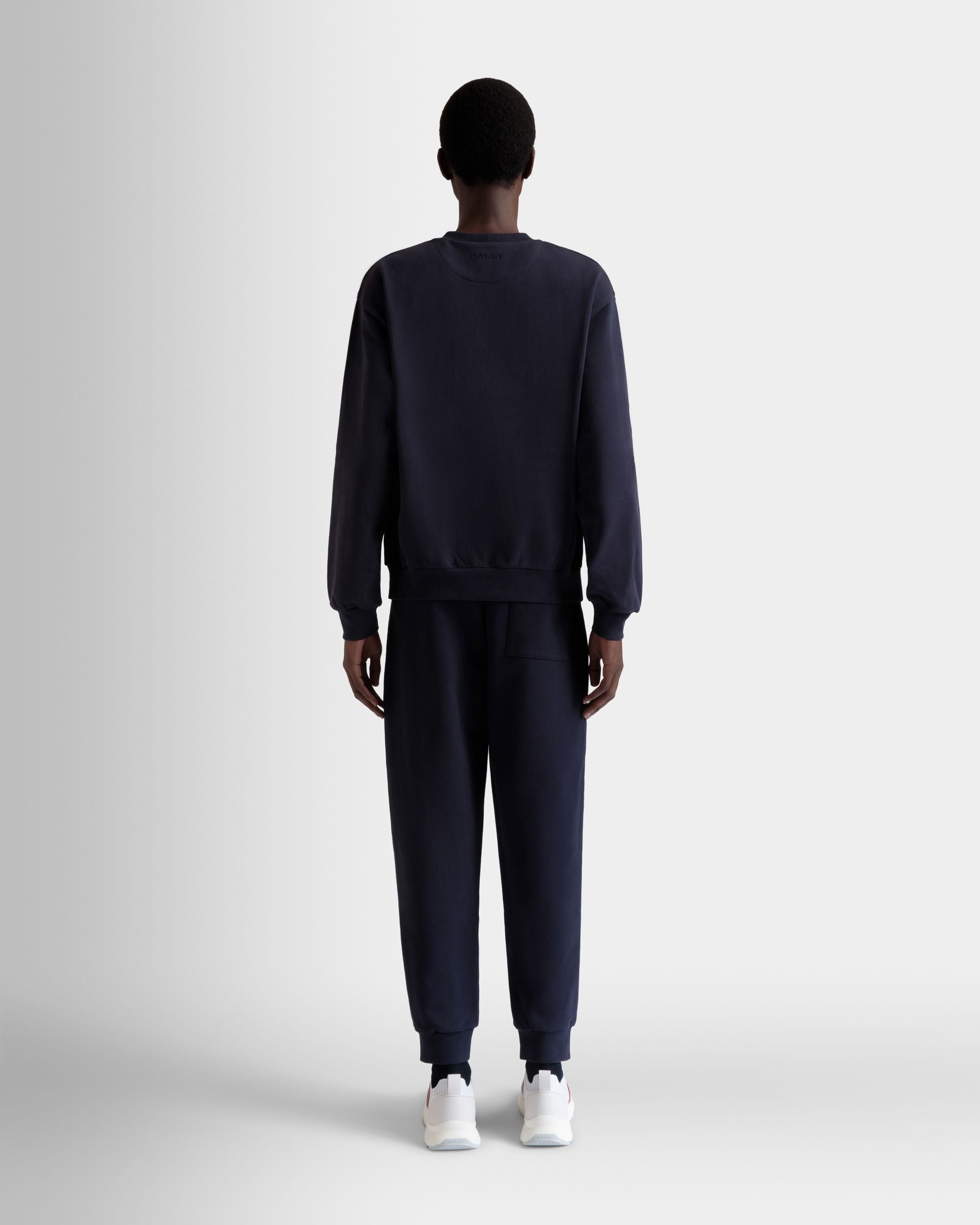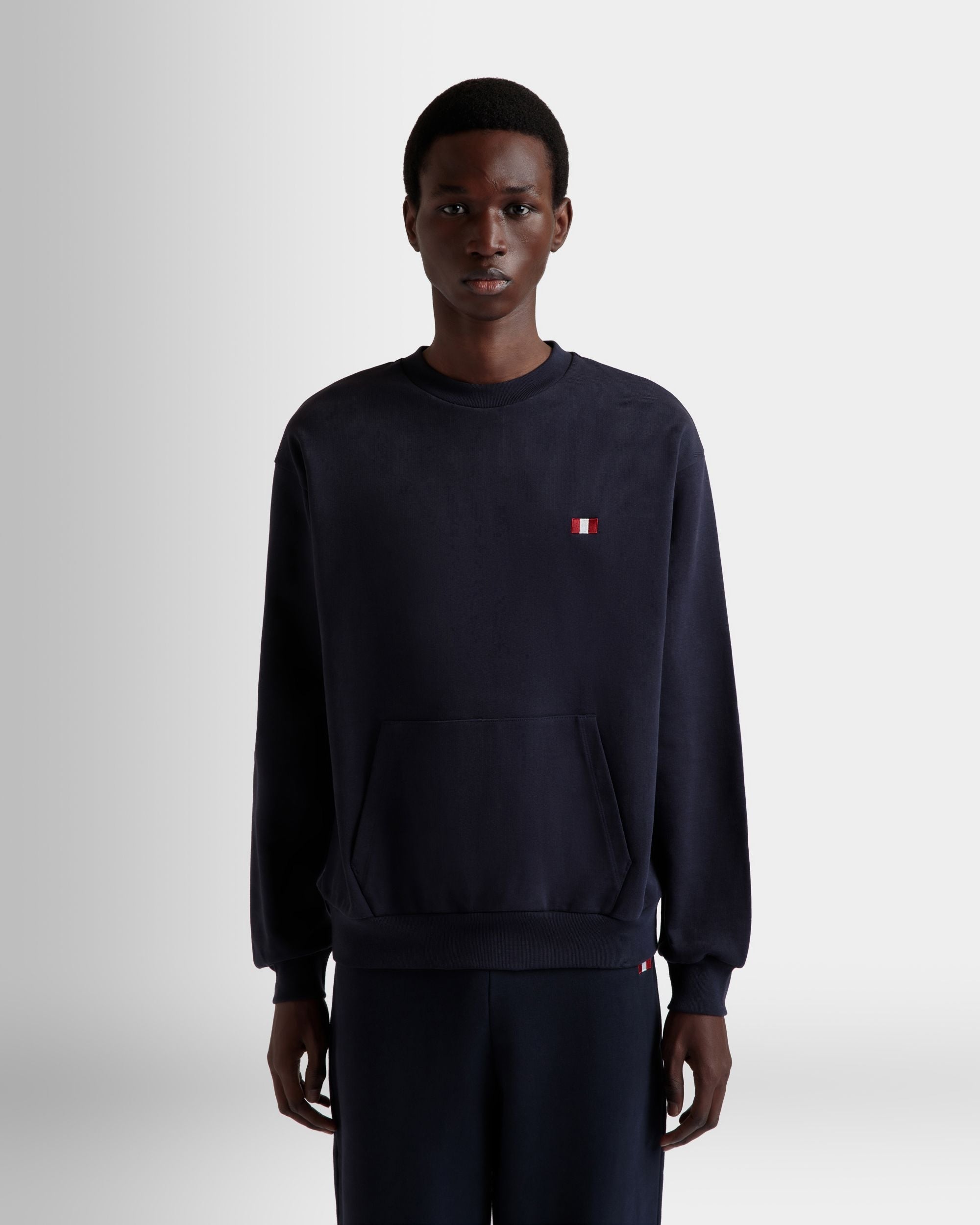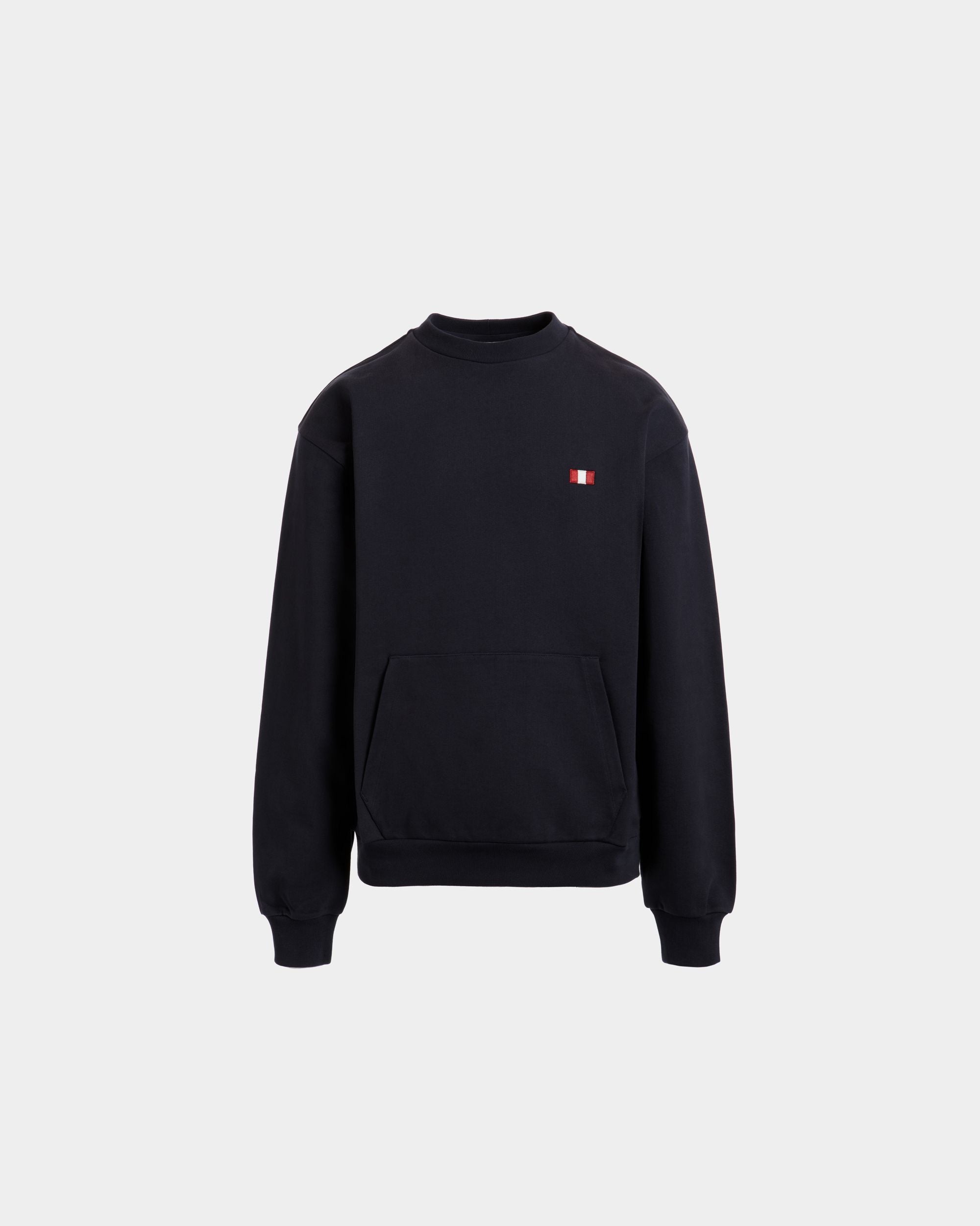 This long-sleeve crewneck sweatshirt is in finely knit navy blue cotton. An embroidered Bally Flag and a large pouch pocket finish the front.