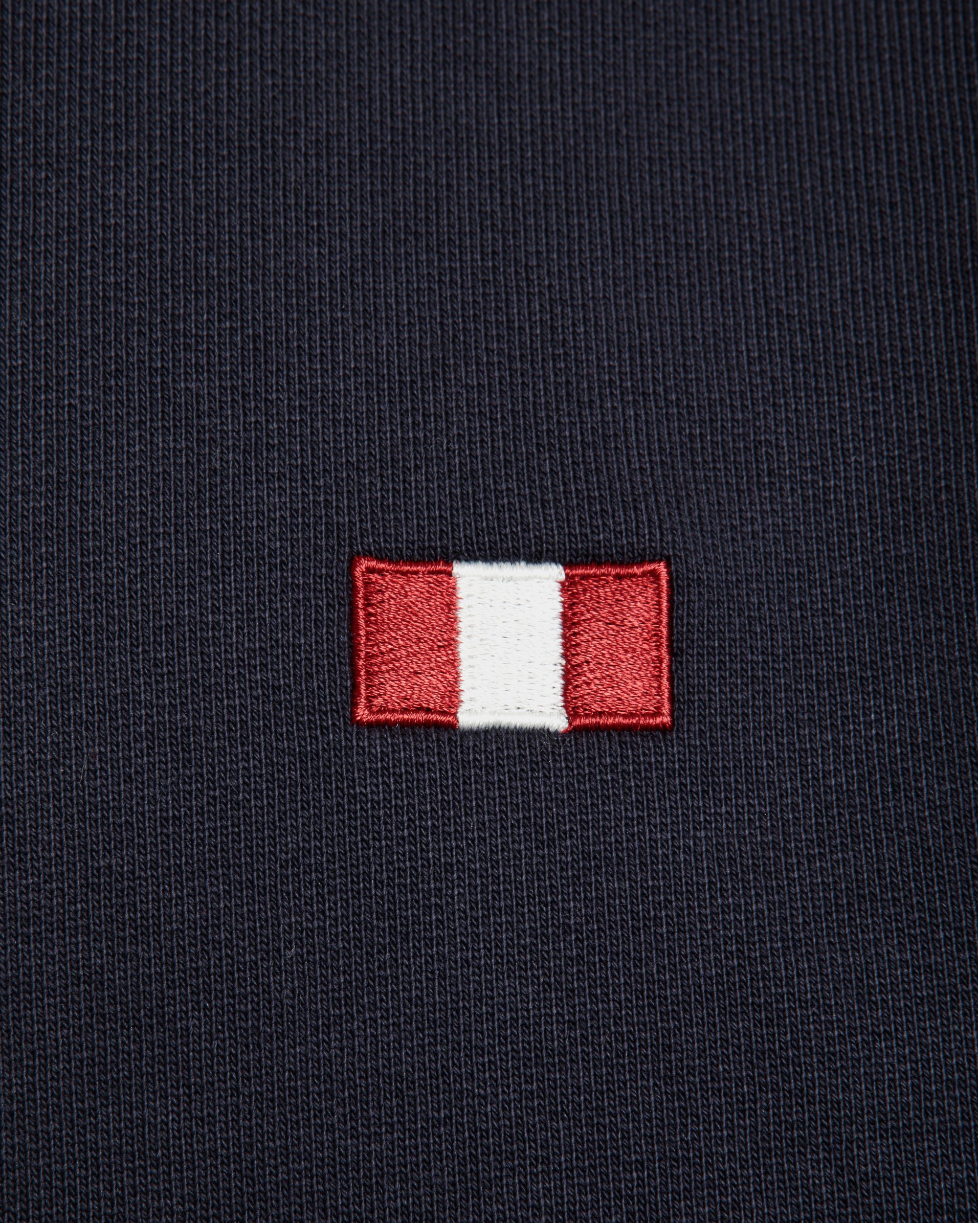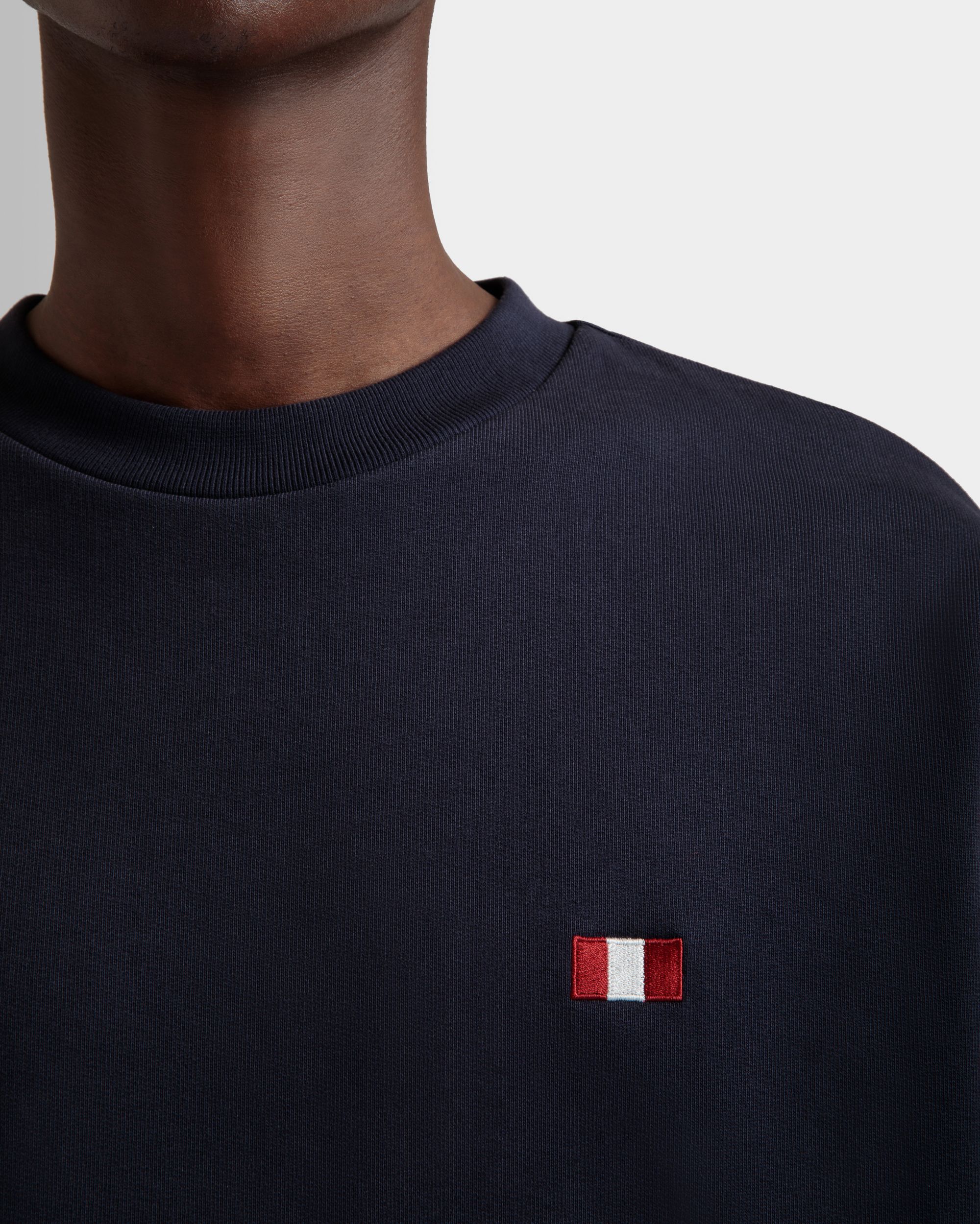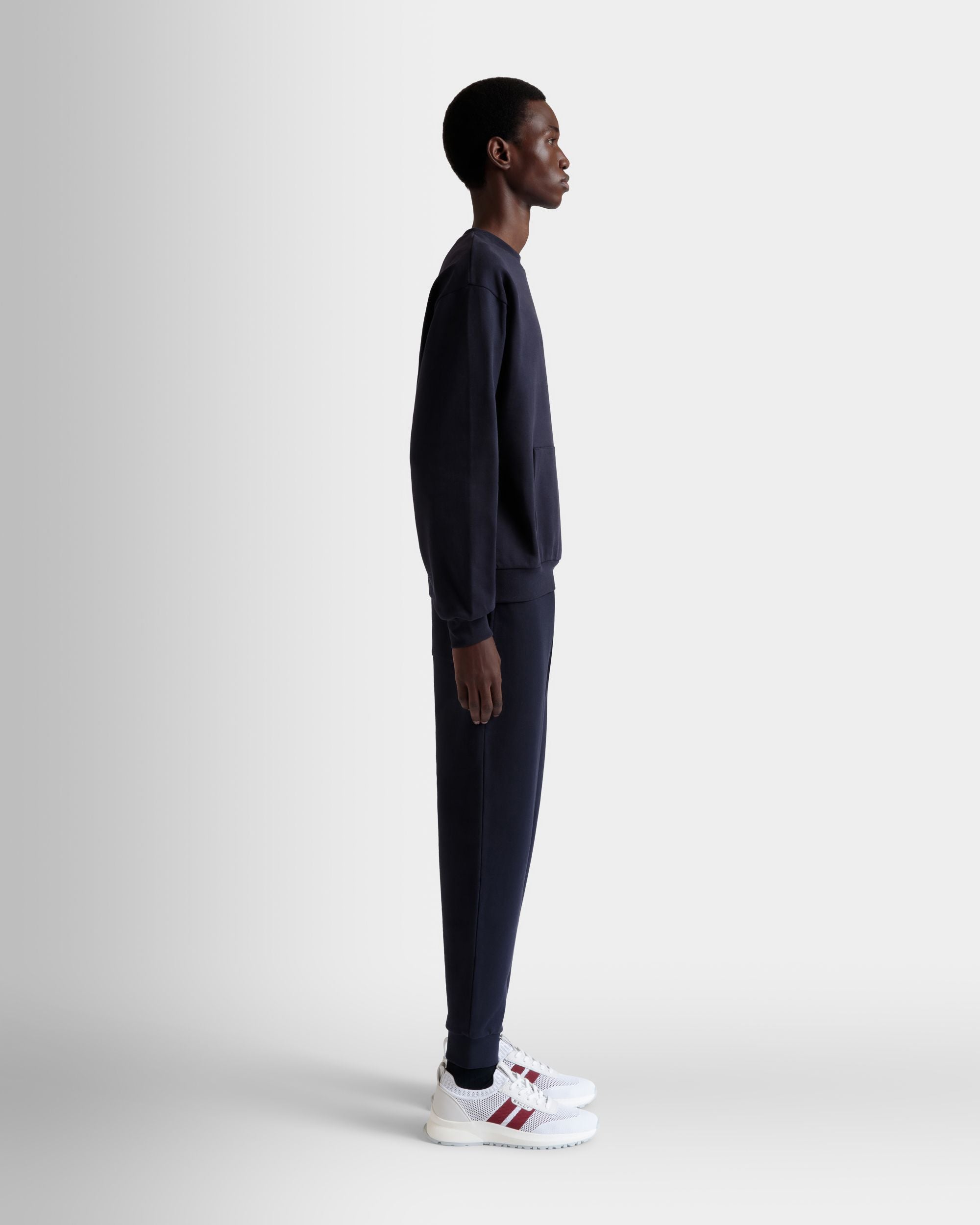 This long-sleeve crewneck sweatshirt is in finely knit navy blue cotton. An embroidered Bally Flag and a large pouch pocket finish the front.