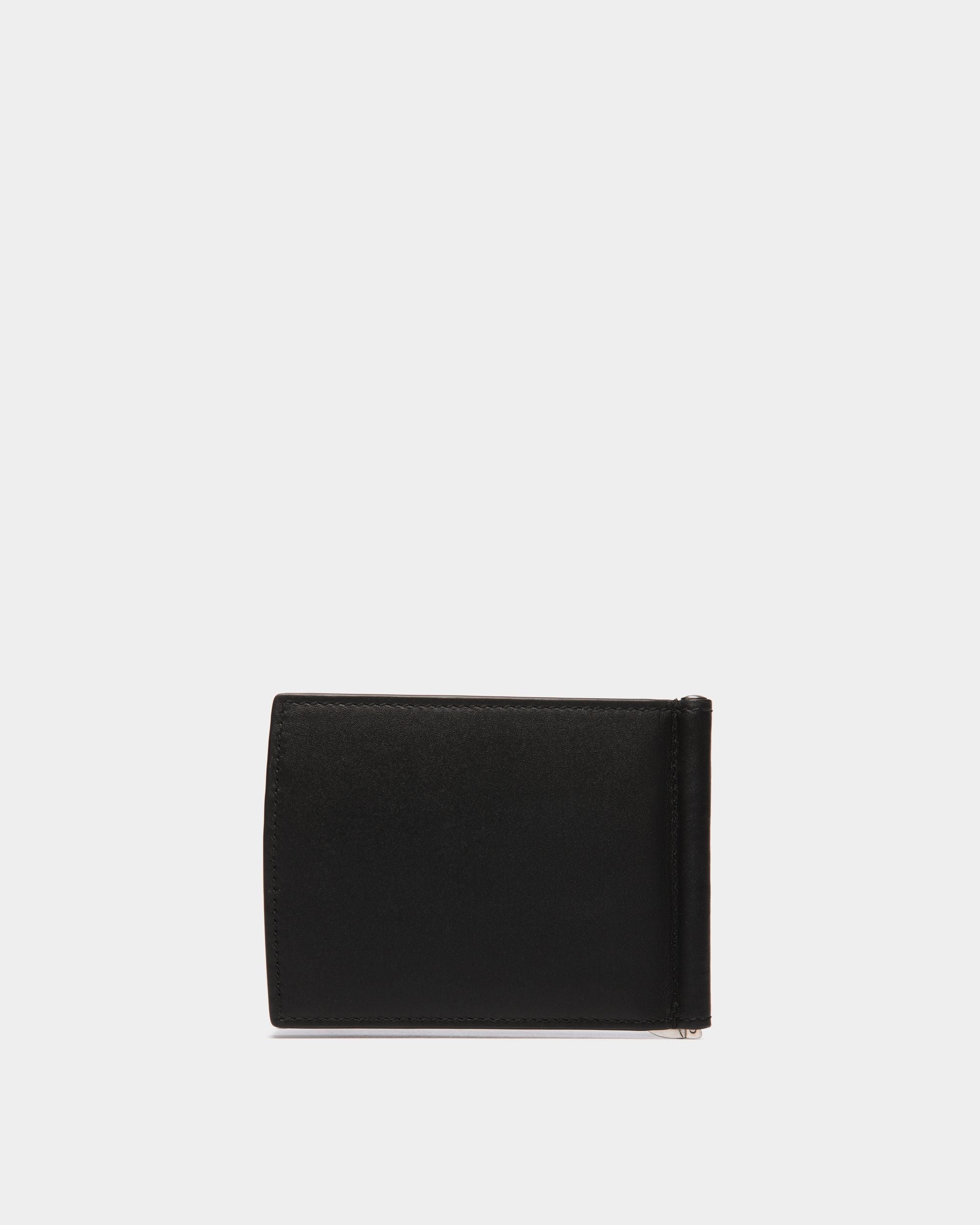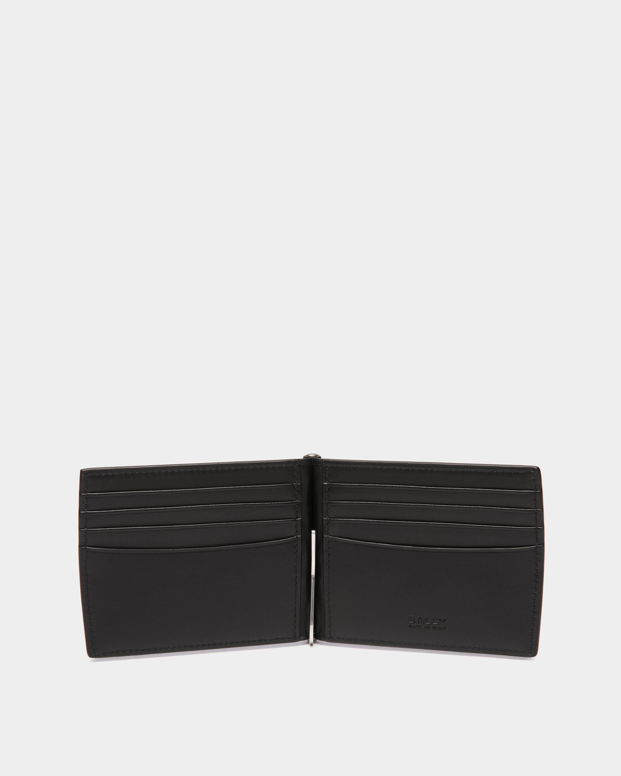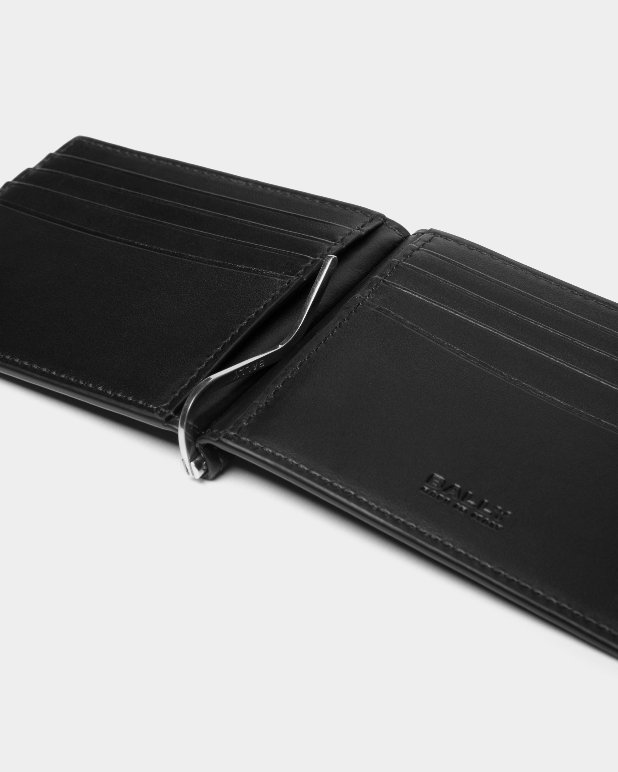 Essential with a slightly curved profile. the Deco bifold wallet in black calfskin is decorated by a foil logo on the outside and a debossed logo on the inside. Eight card slots and a metal clip for banknotes organize the inside.