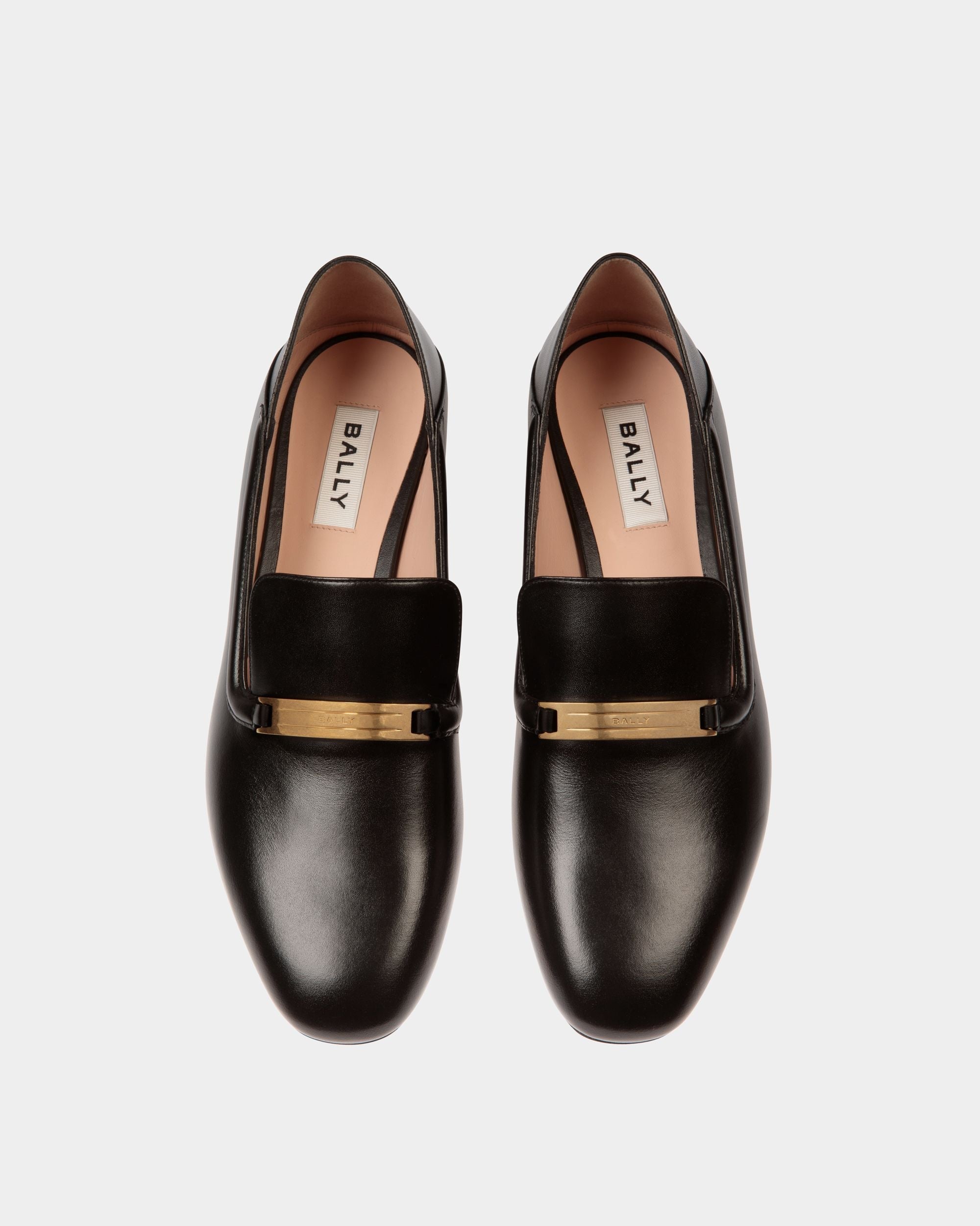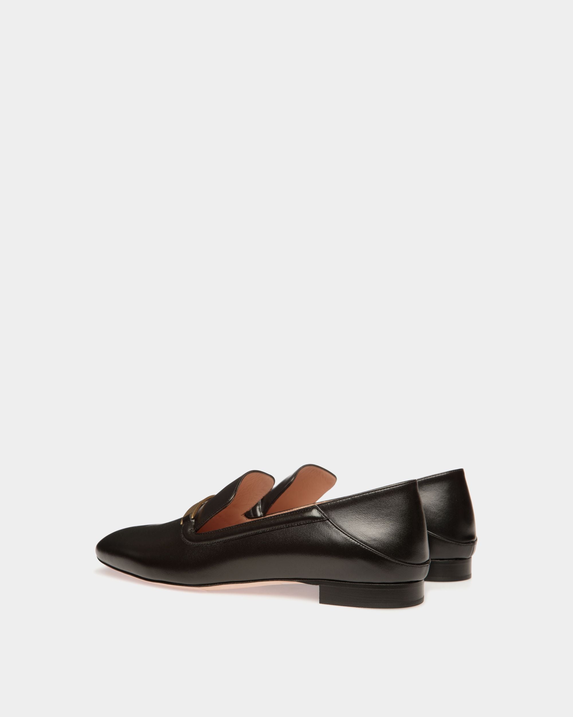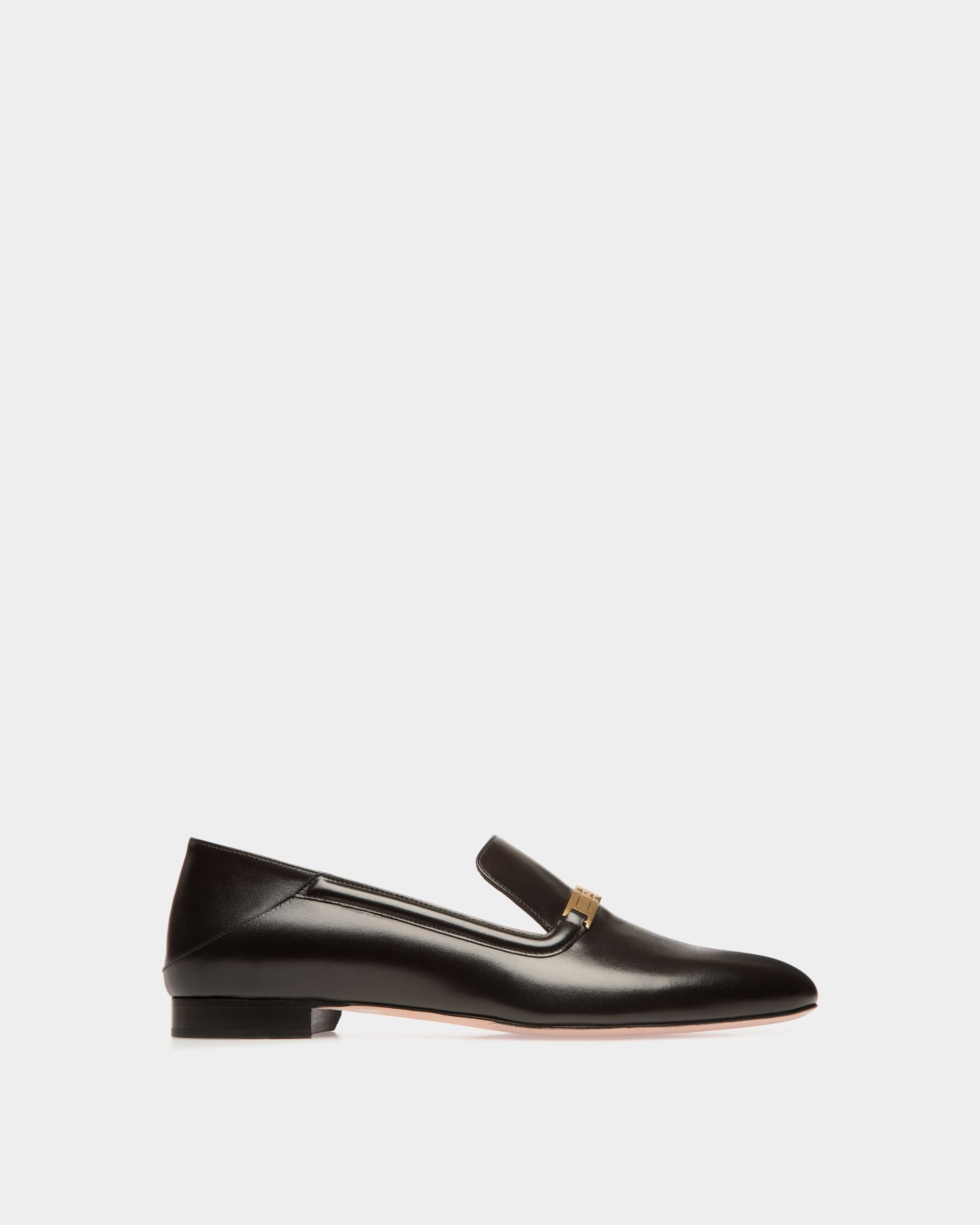 A simple metal plaque with a Bally Ribbon signifier extends across the top of this Deco loafer in black leather. The heel counter can be folded down for use as a slipper.