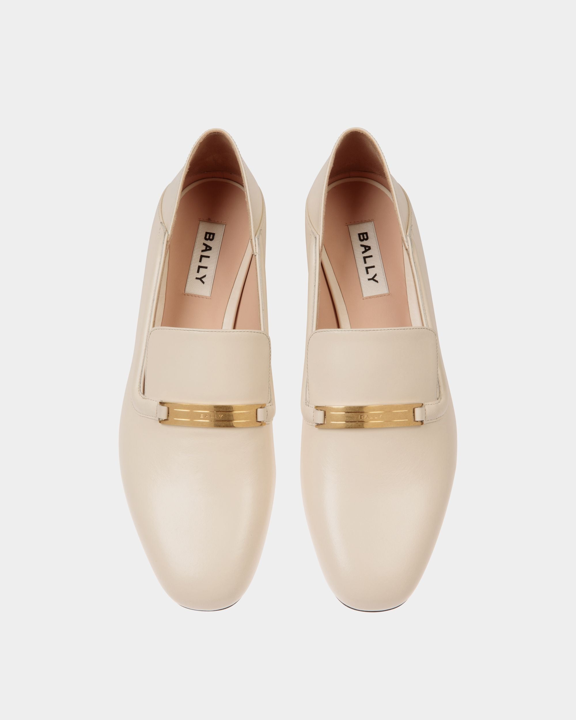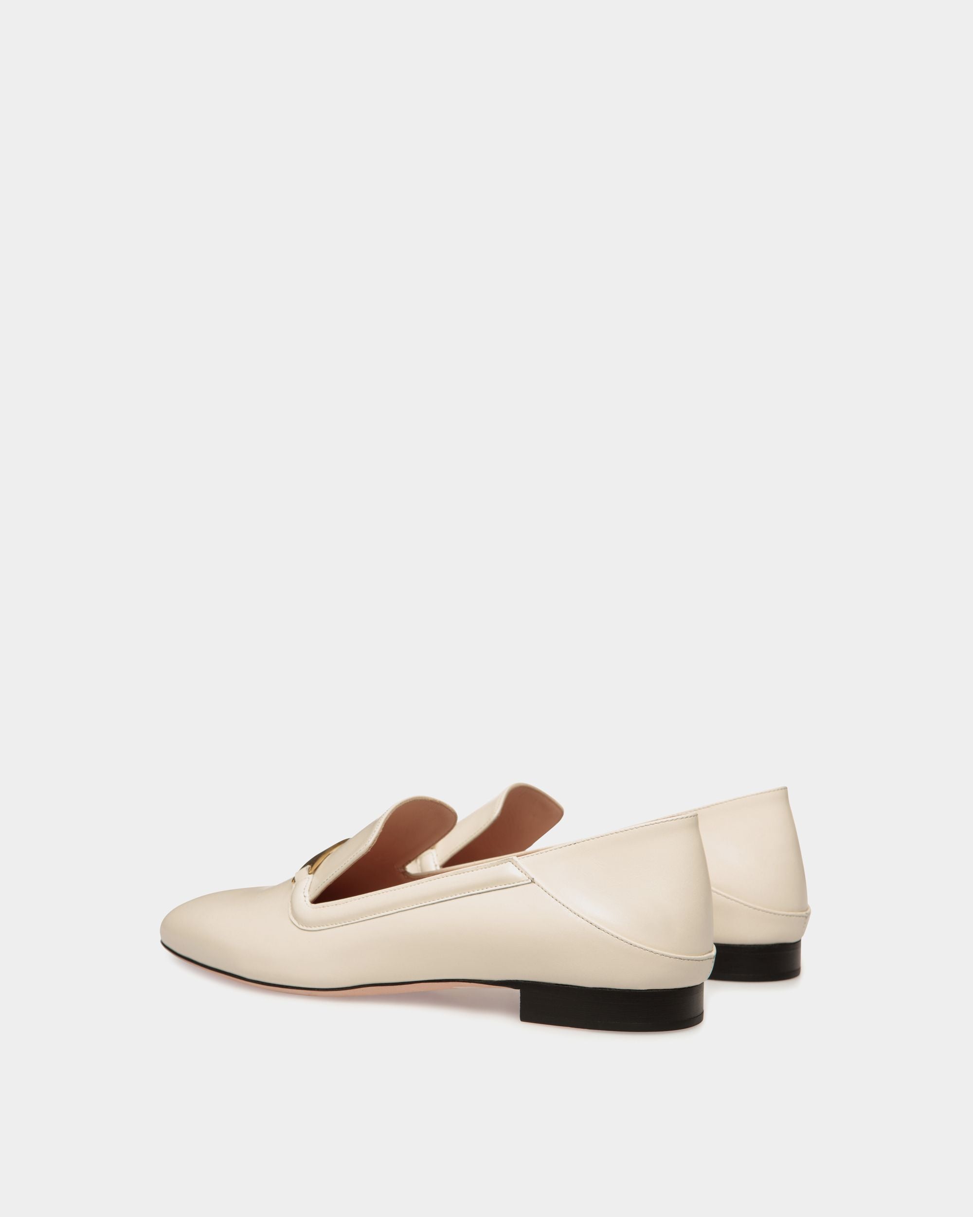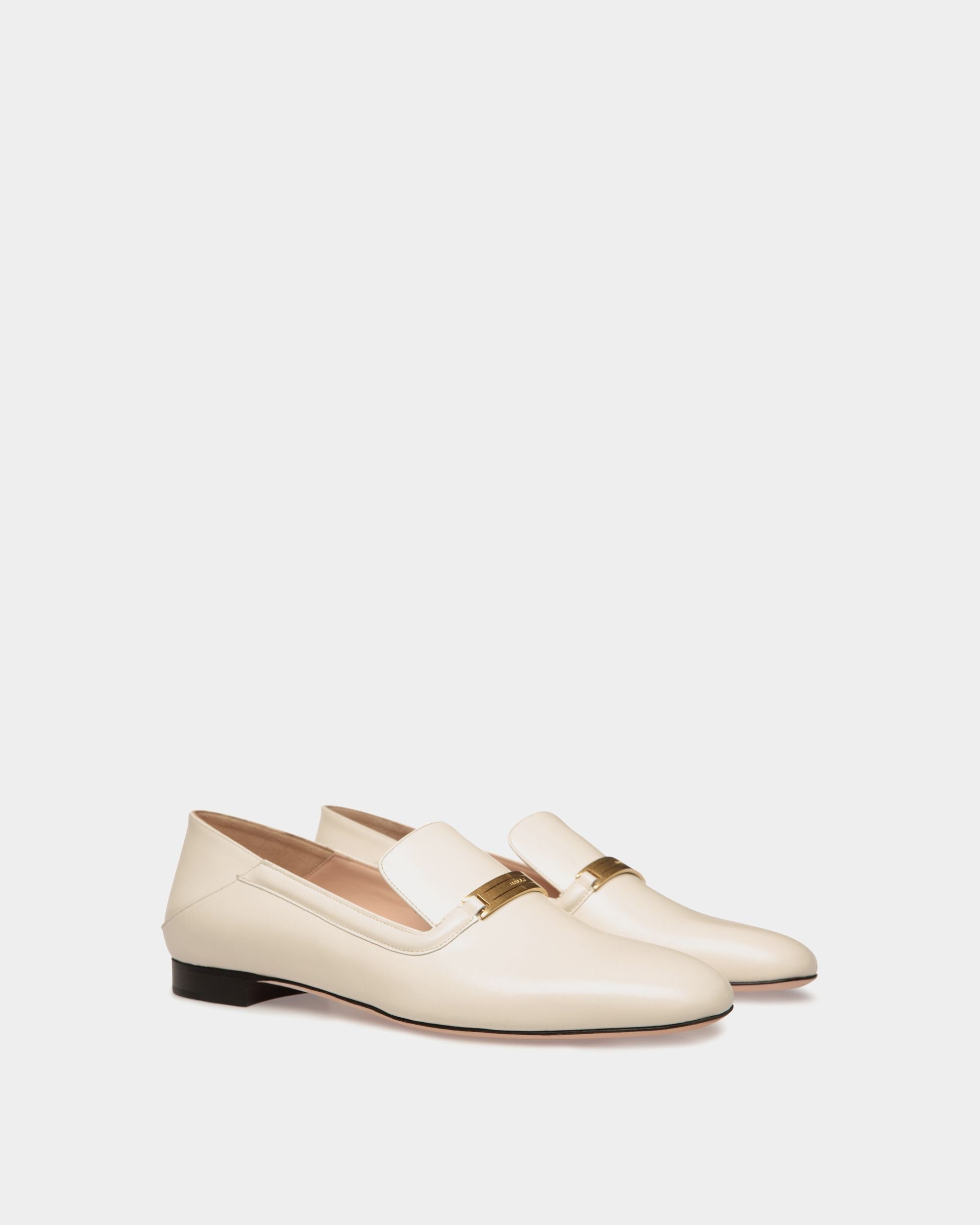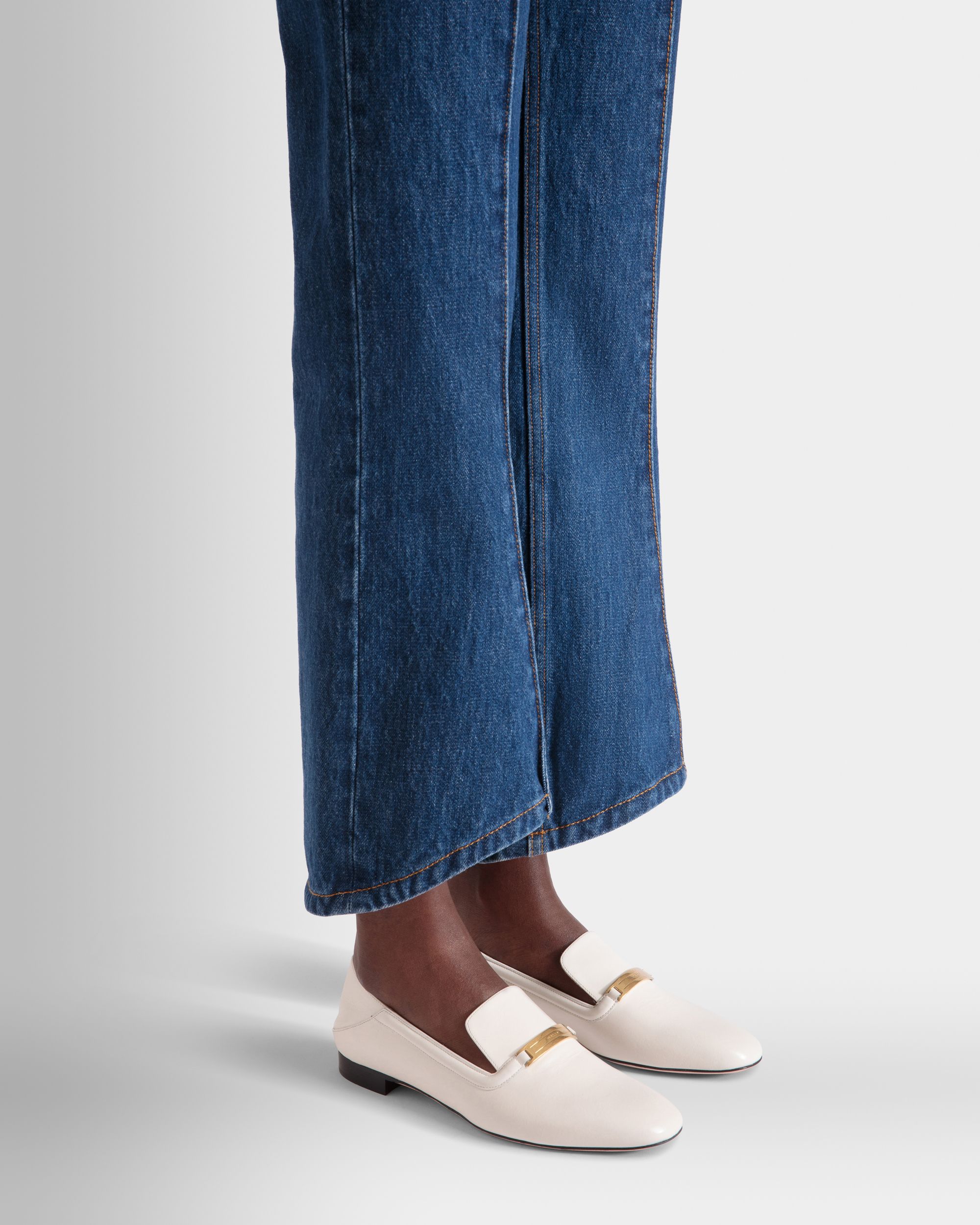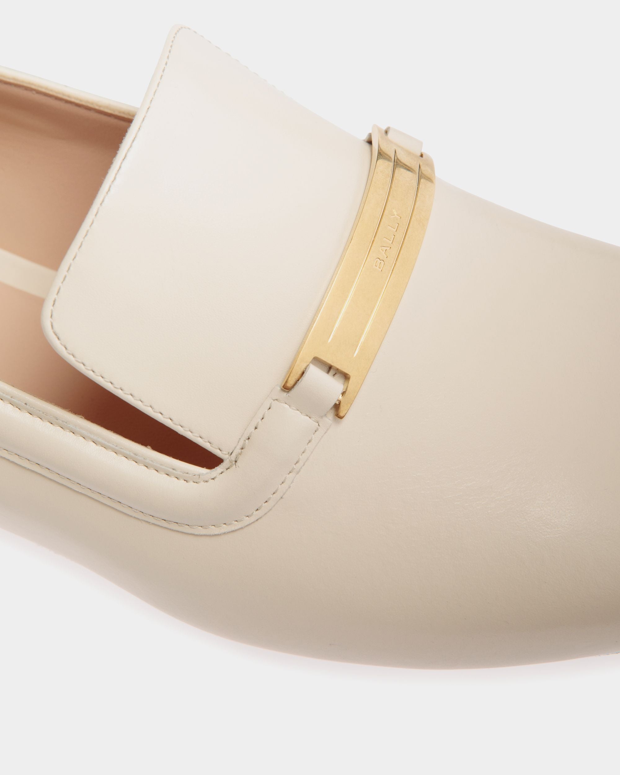 Inspired by a bag from the Bally archives. this Deco slipper in white leather features a simple metal plaque across the vamp. The hardware has been reinterpreted to recall the Bally Ribbon. expressing the brand’s heritage through a timeless detail.
