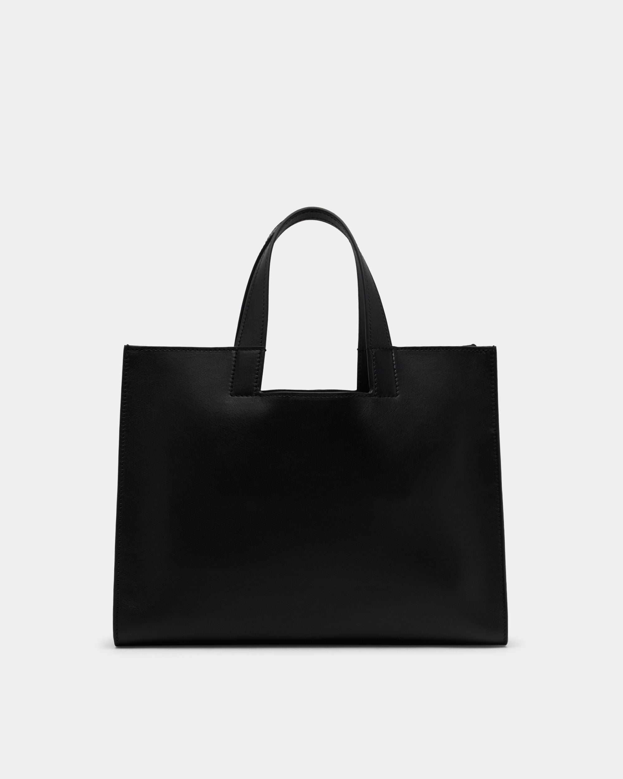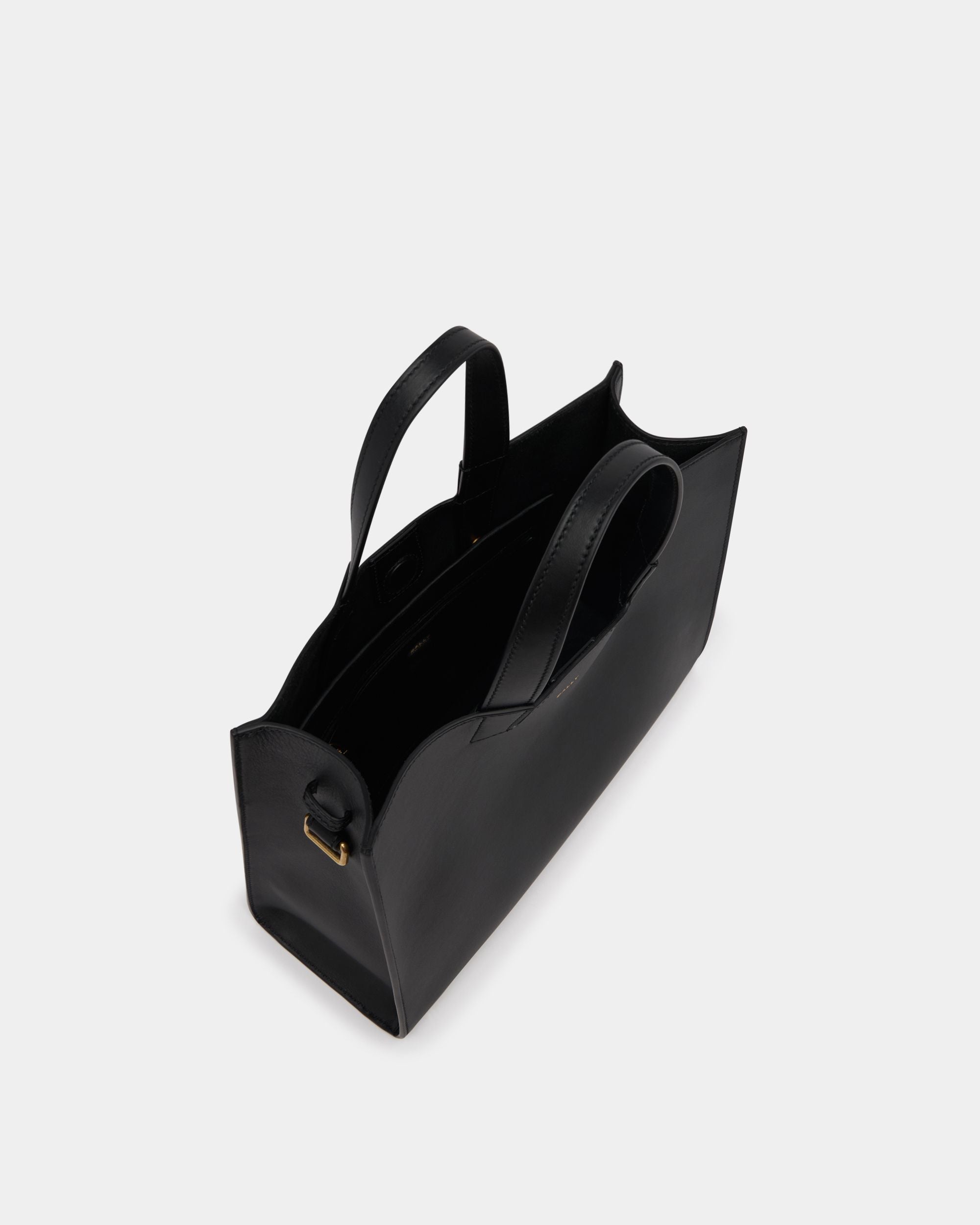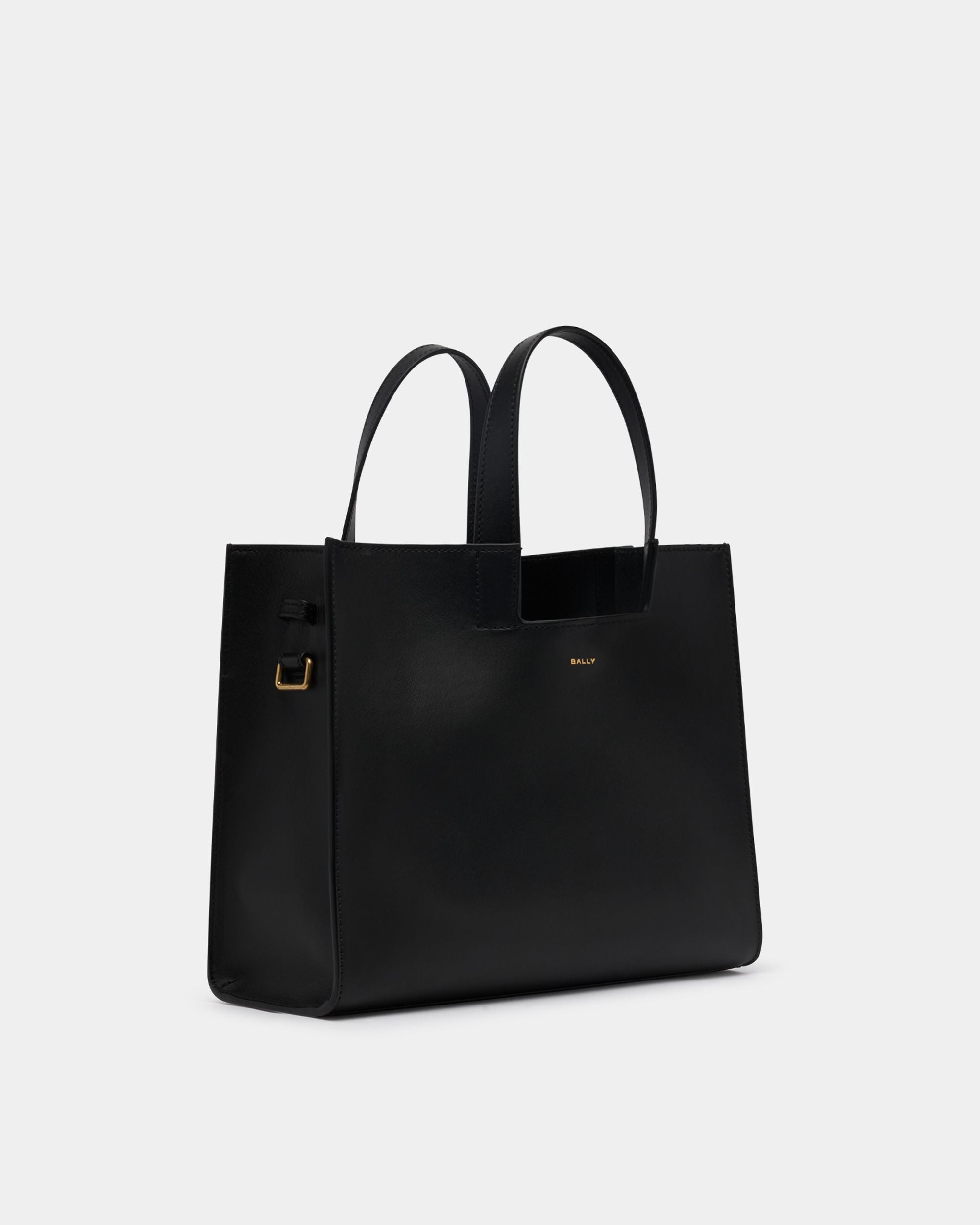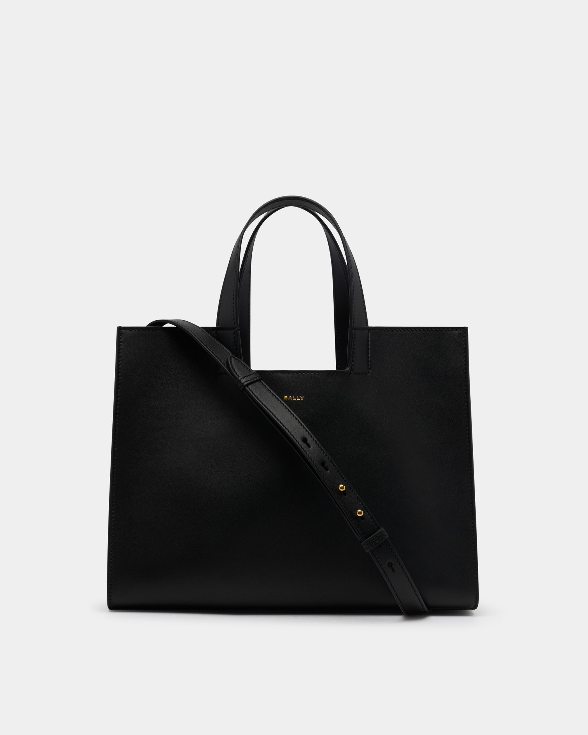 The versatile square silhouette of this Easy Bally tote bag is crafted from soft. supple black calfskin. The included leather pouch ensures its practicality. A detachable shoulder strap adds a range of portability options in addition to the two top handles.