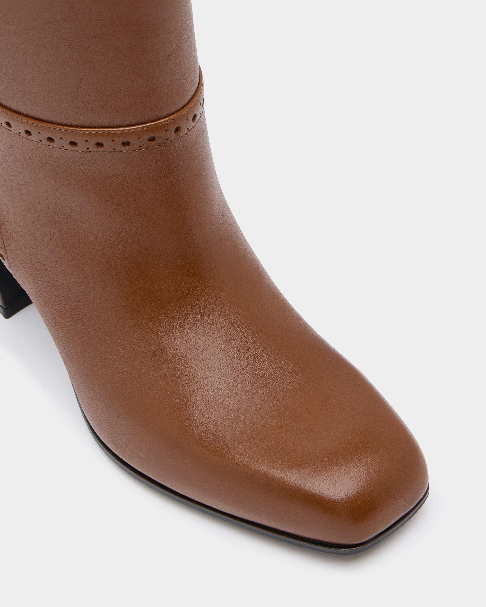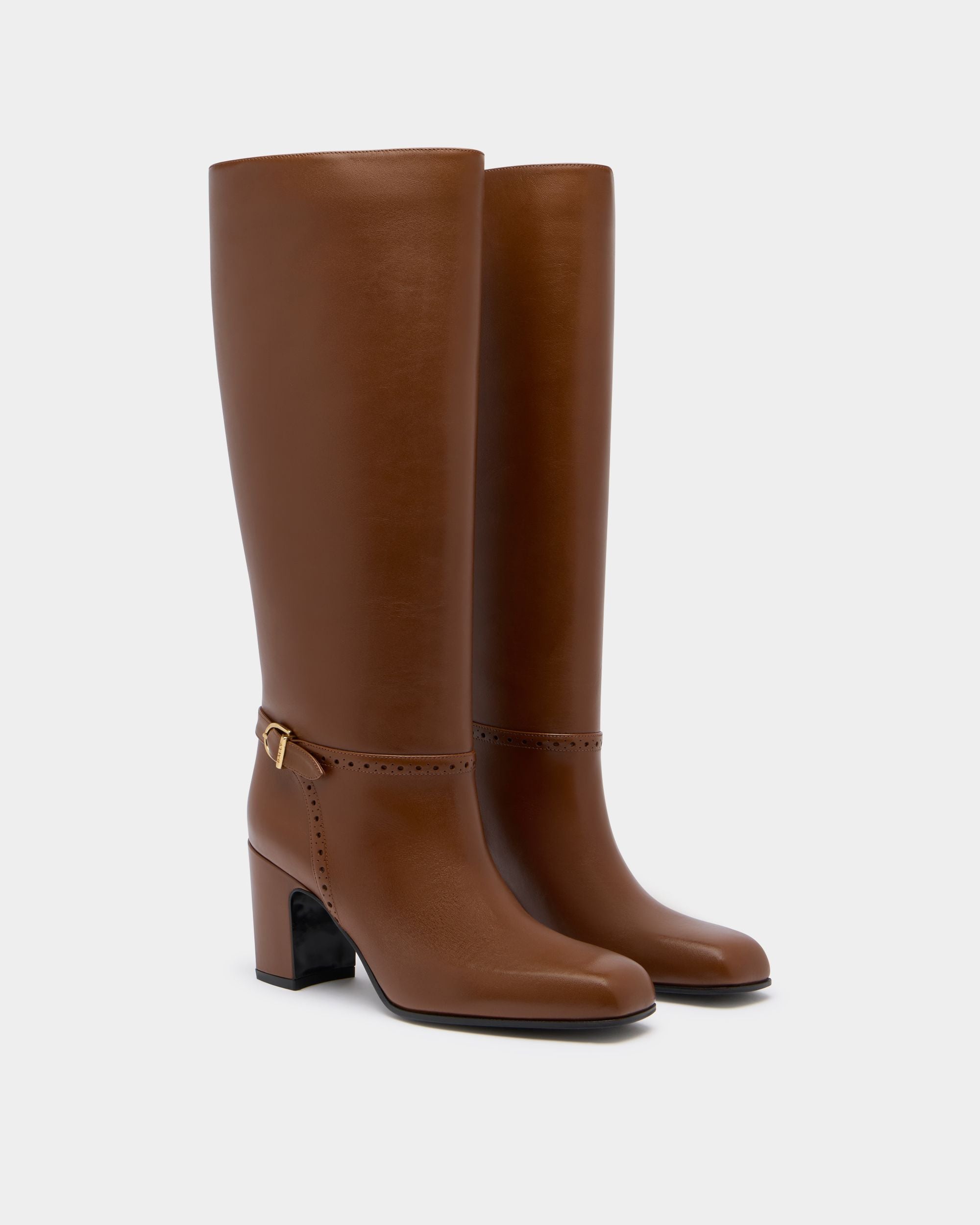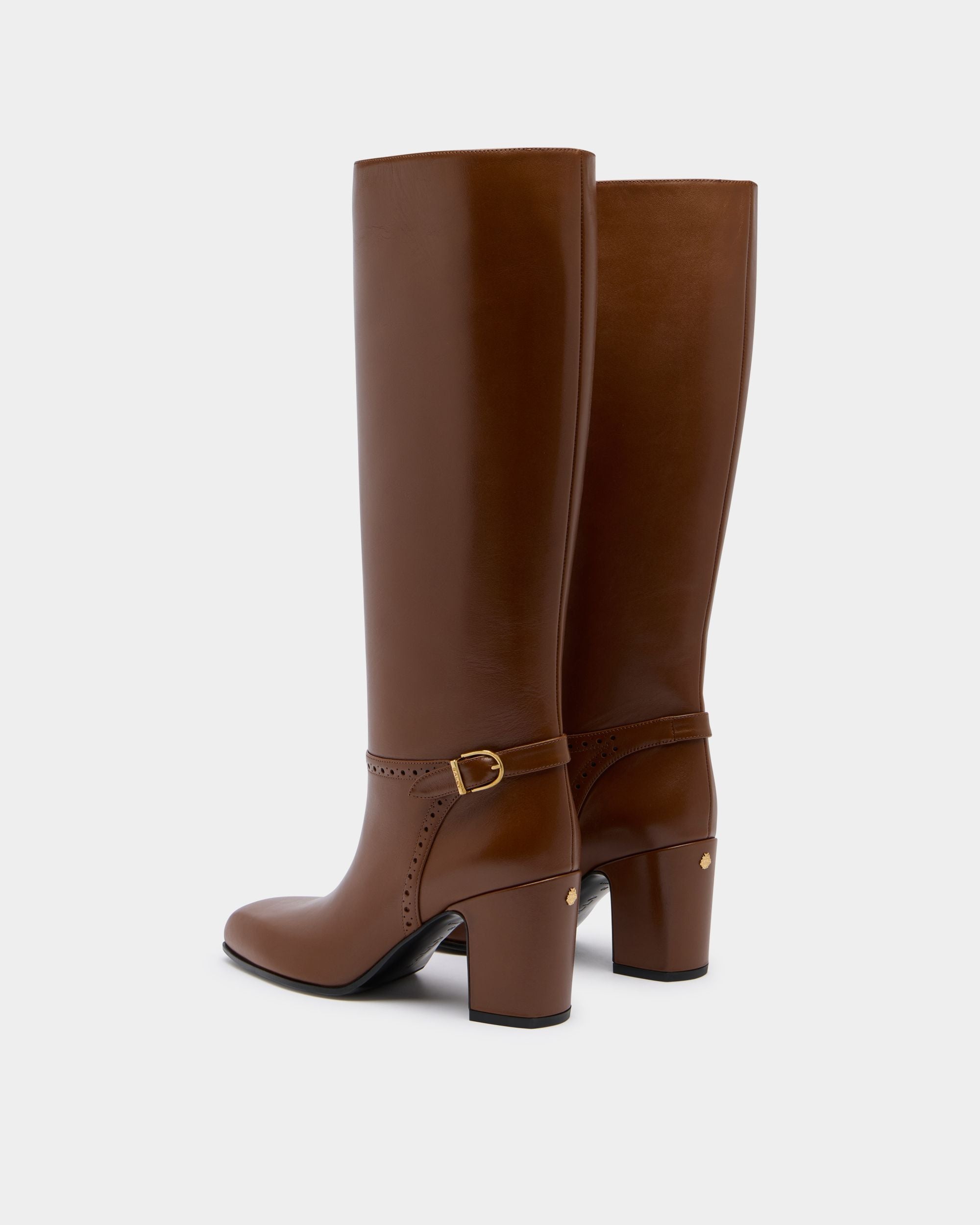 Inspired by an archival design but made for the modern day. this Eclayr boot is crafted in smooth brown calfskin with a leather sole. Gold-tone hardware and decorative perforated details add an elegant touch.