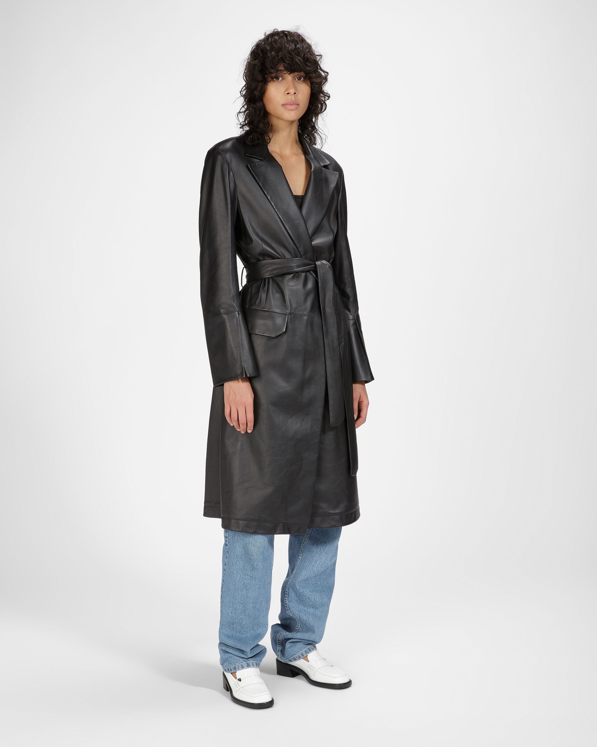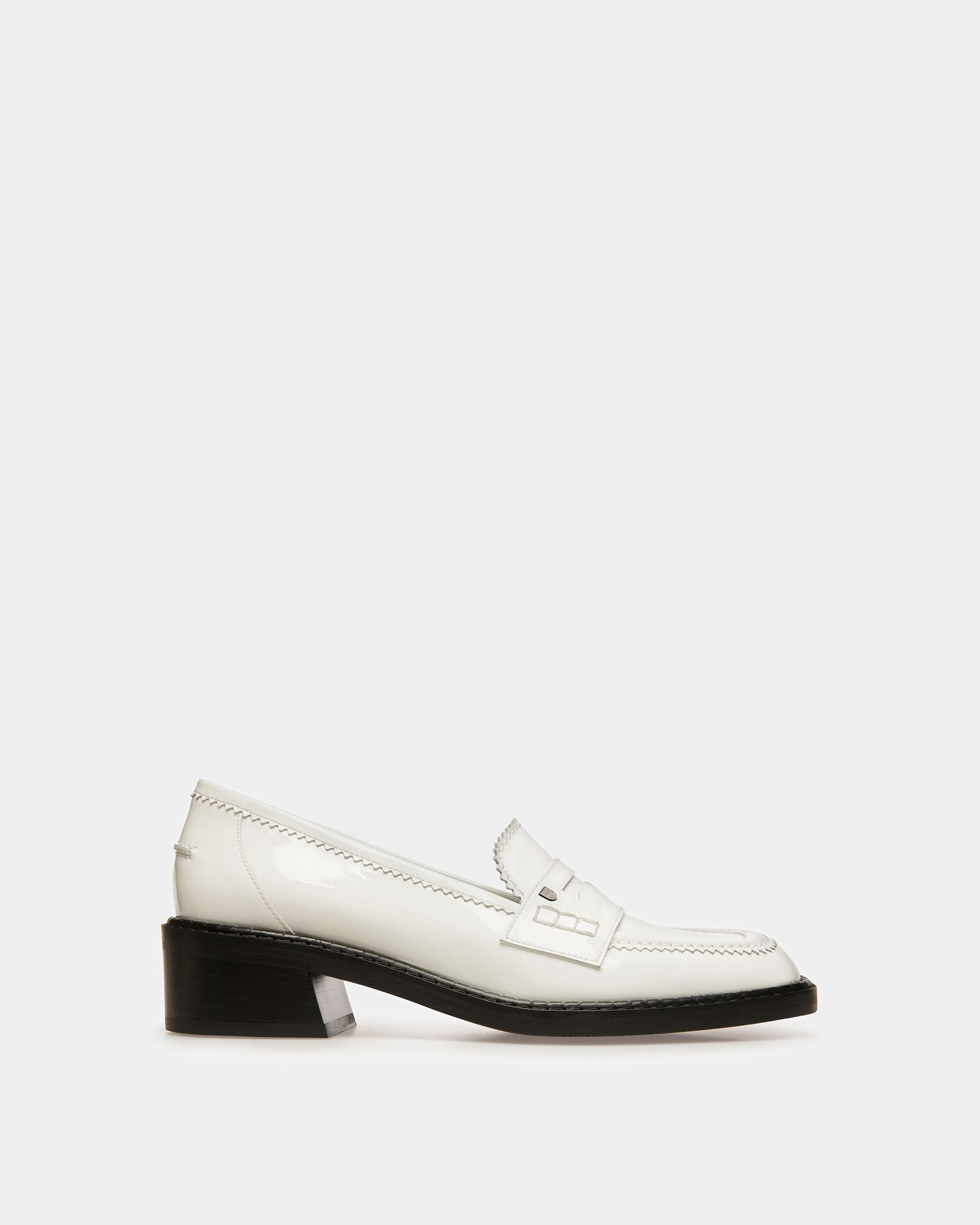 Crafted from white patent calf leather. Elly elevates the iconic moccasin silhouette with B-Chain hardware. The style is complete with a contrast rubber sole.