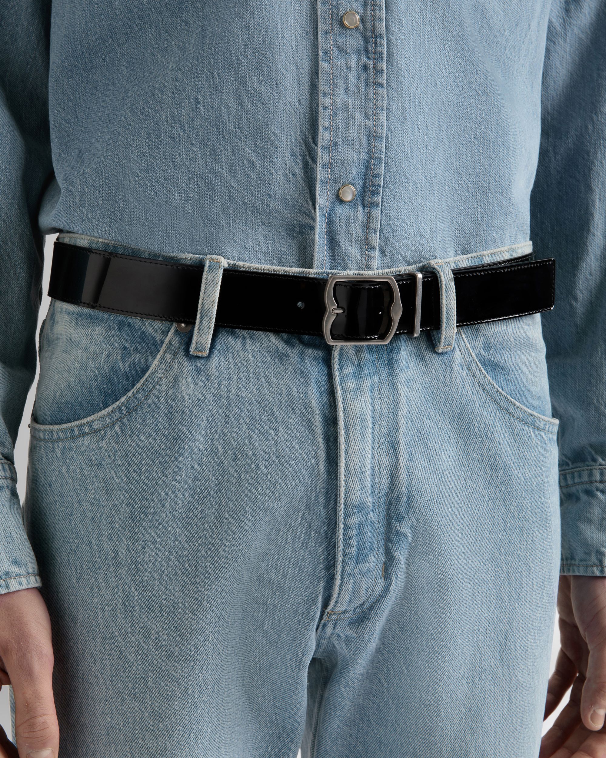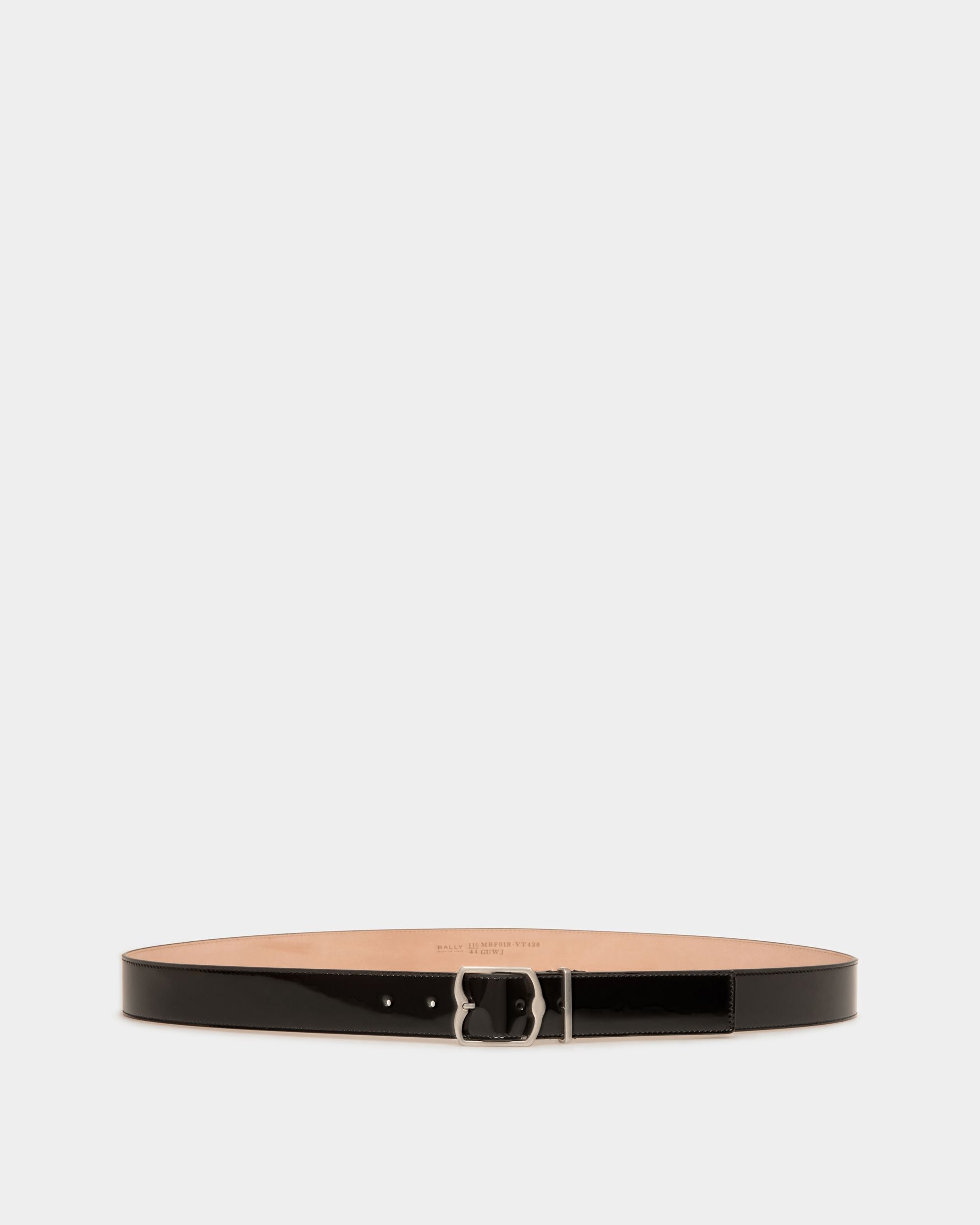 A sleek and versatile black patent leather belt featuring a polished silver buckle. adjustable length. and a durable yet elegant design. Perfect for adding a touch of sophistication to any outfit.