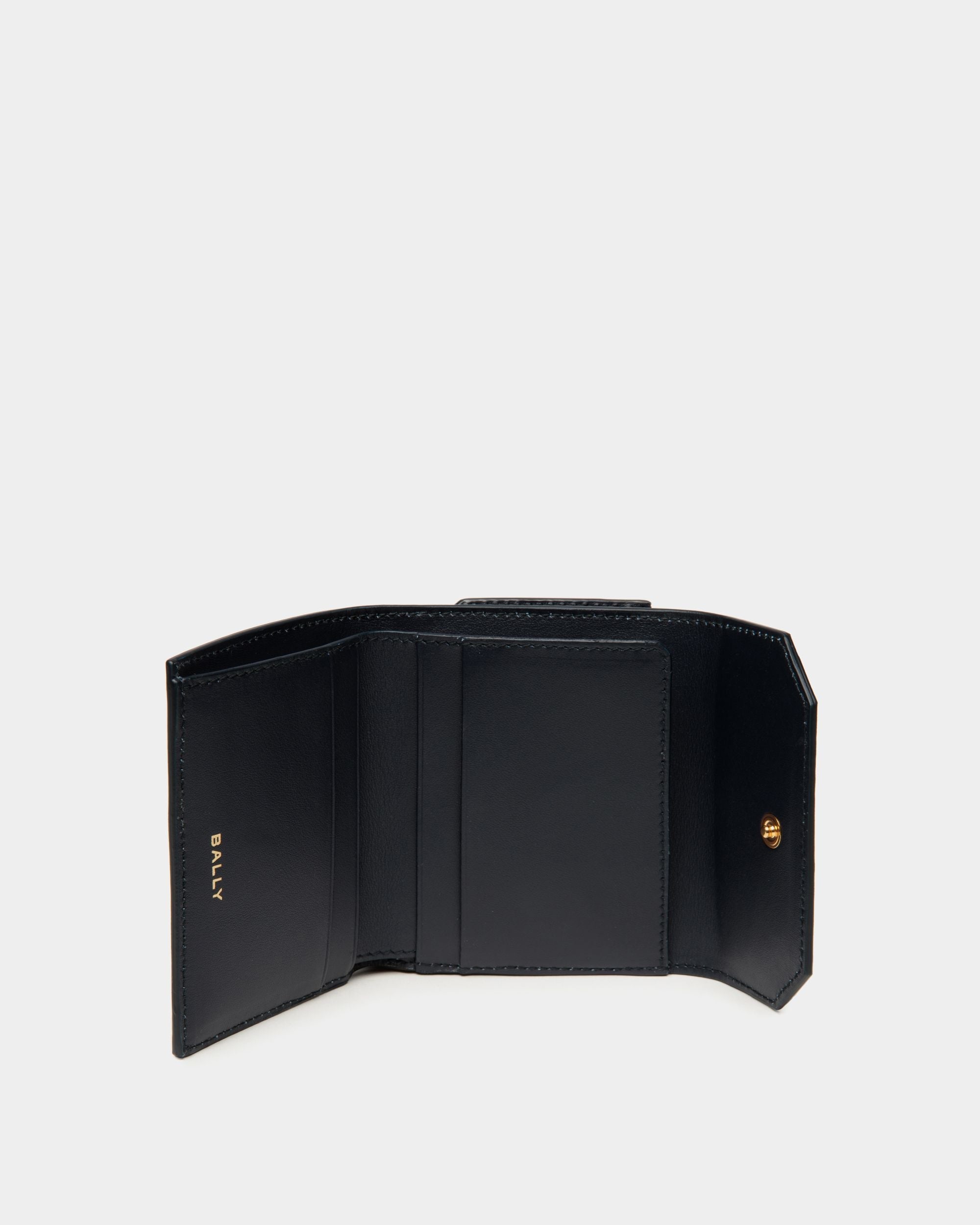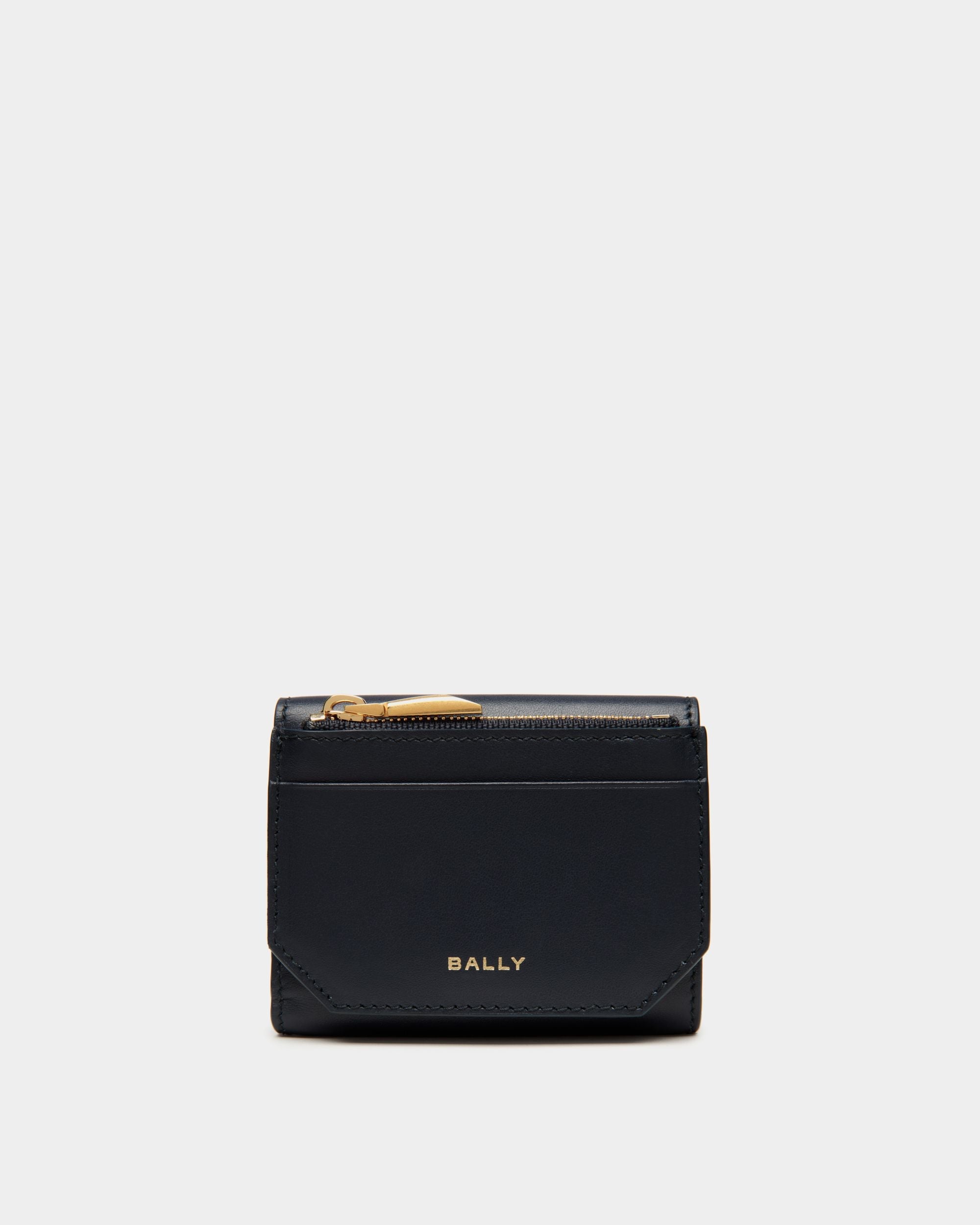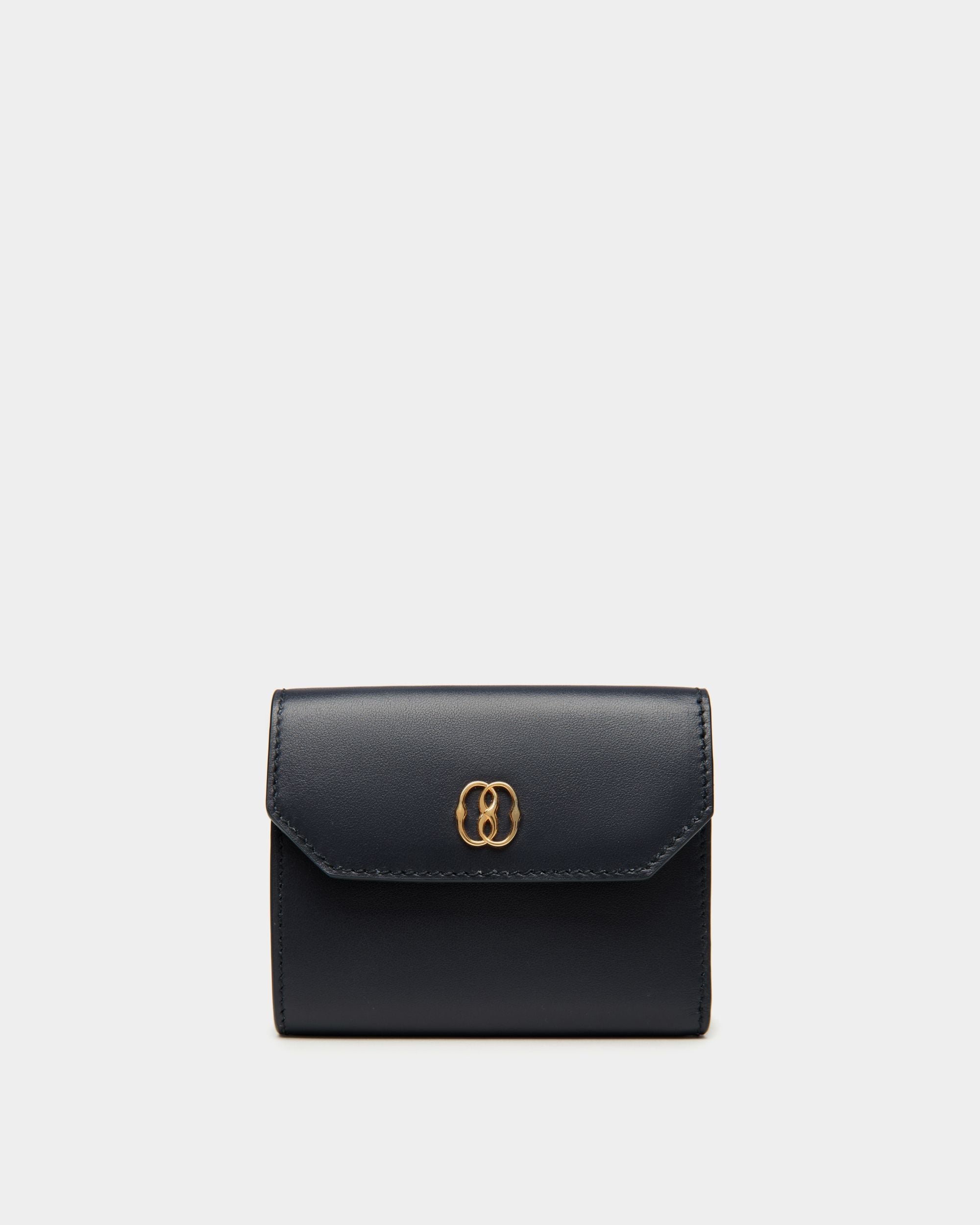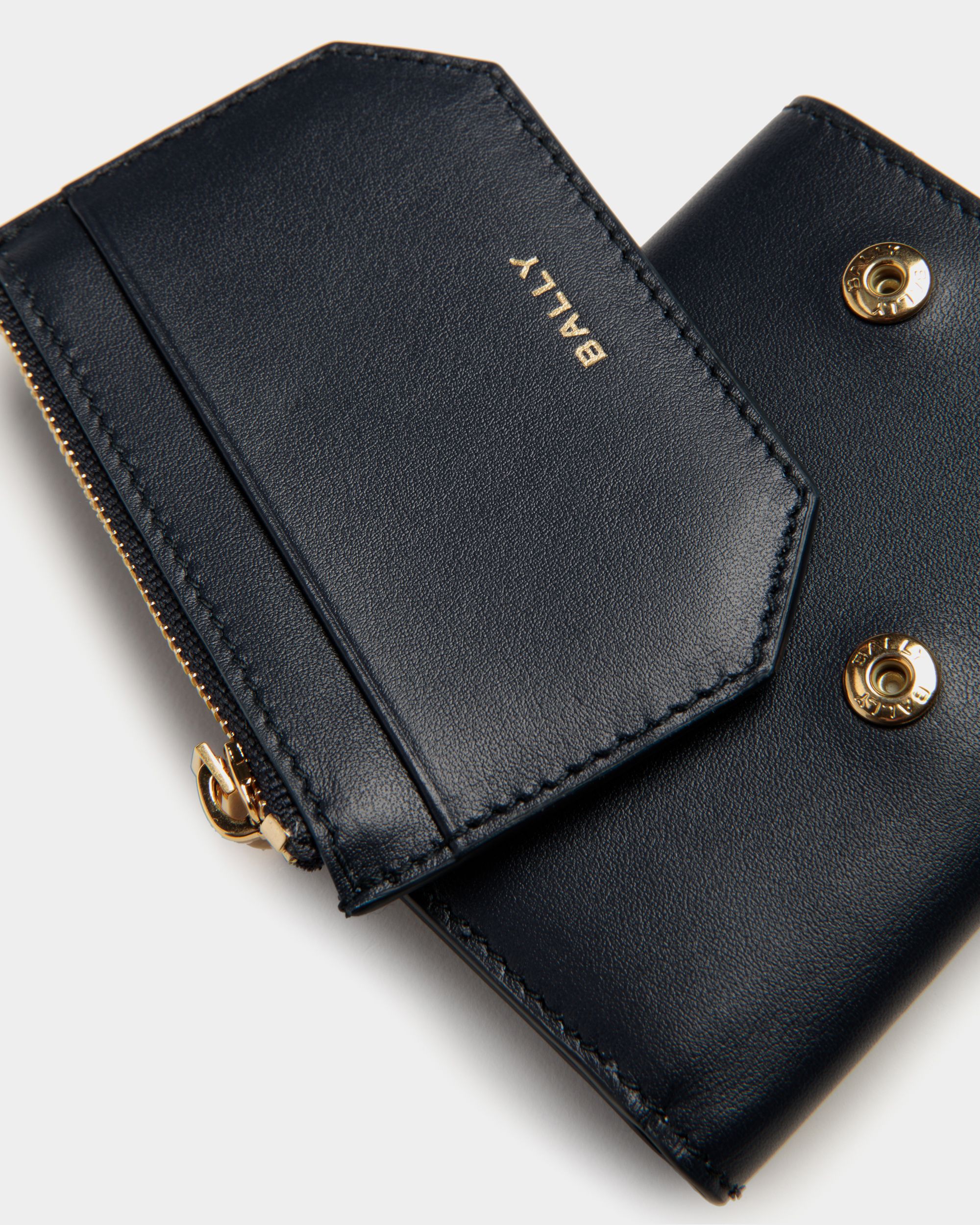 This compact Emblem wallet is crafted from navy blue leather. The zipped card and coin holder at the back can be detached and carried separately thanks to a few concealed snaps.