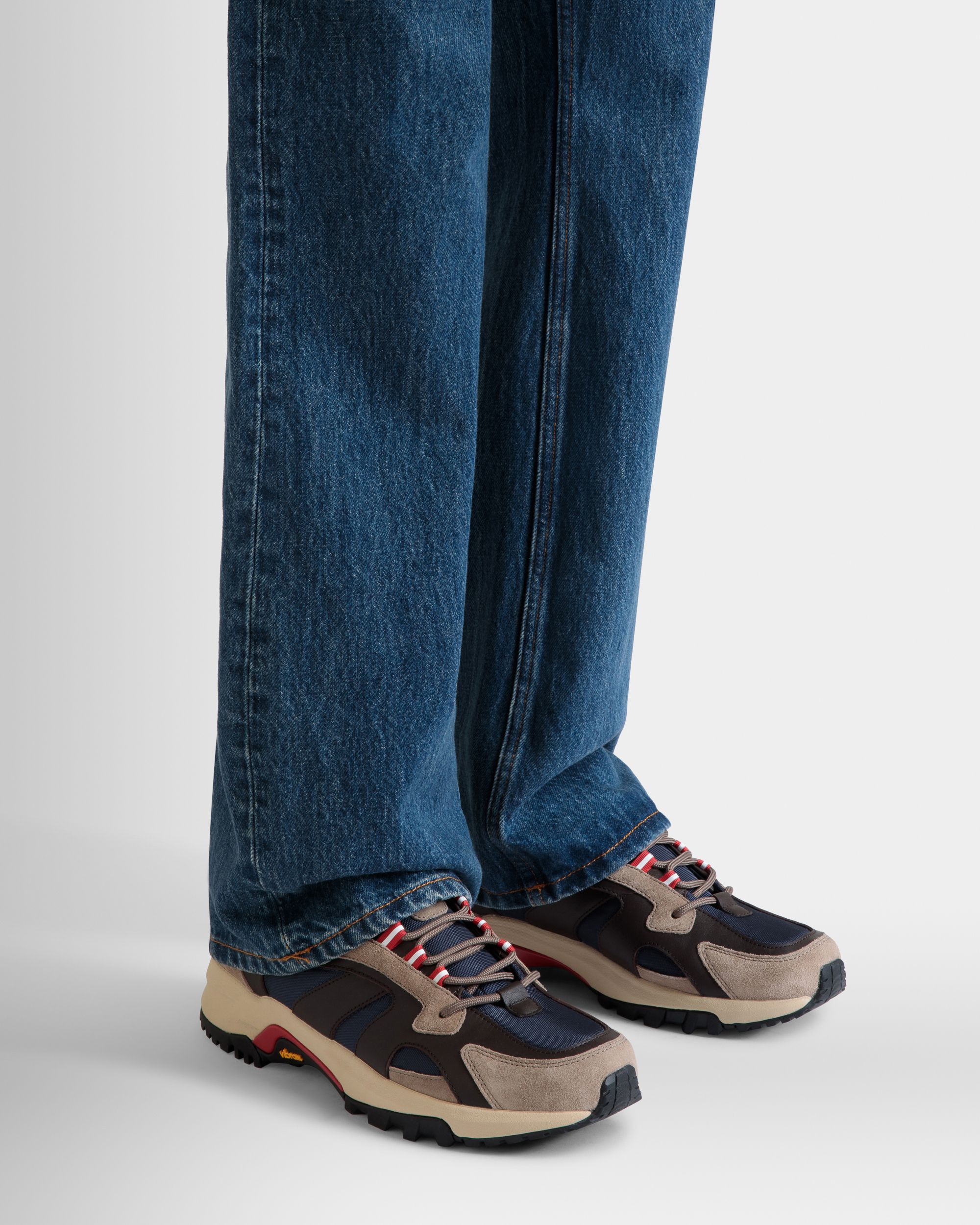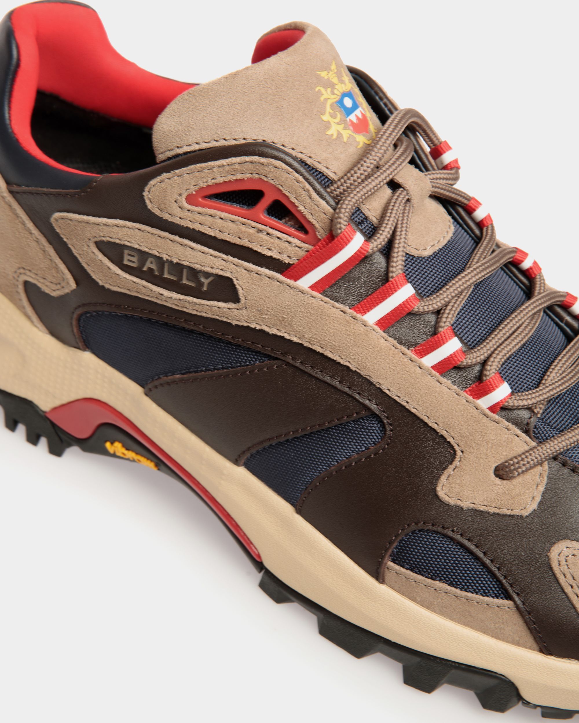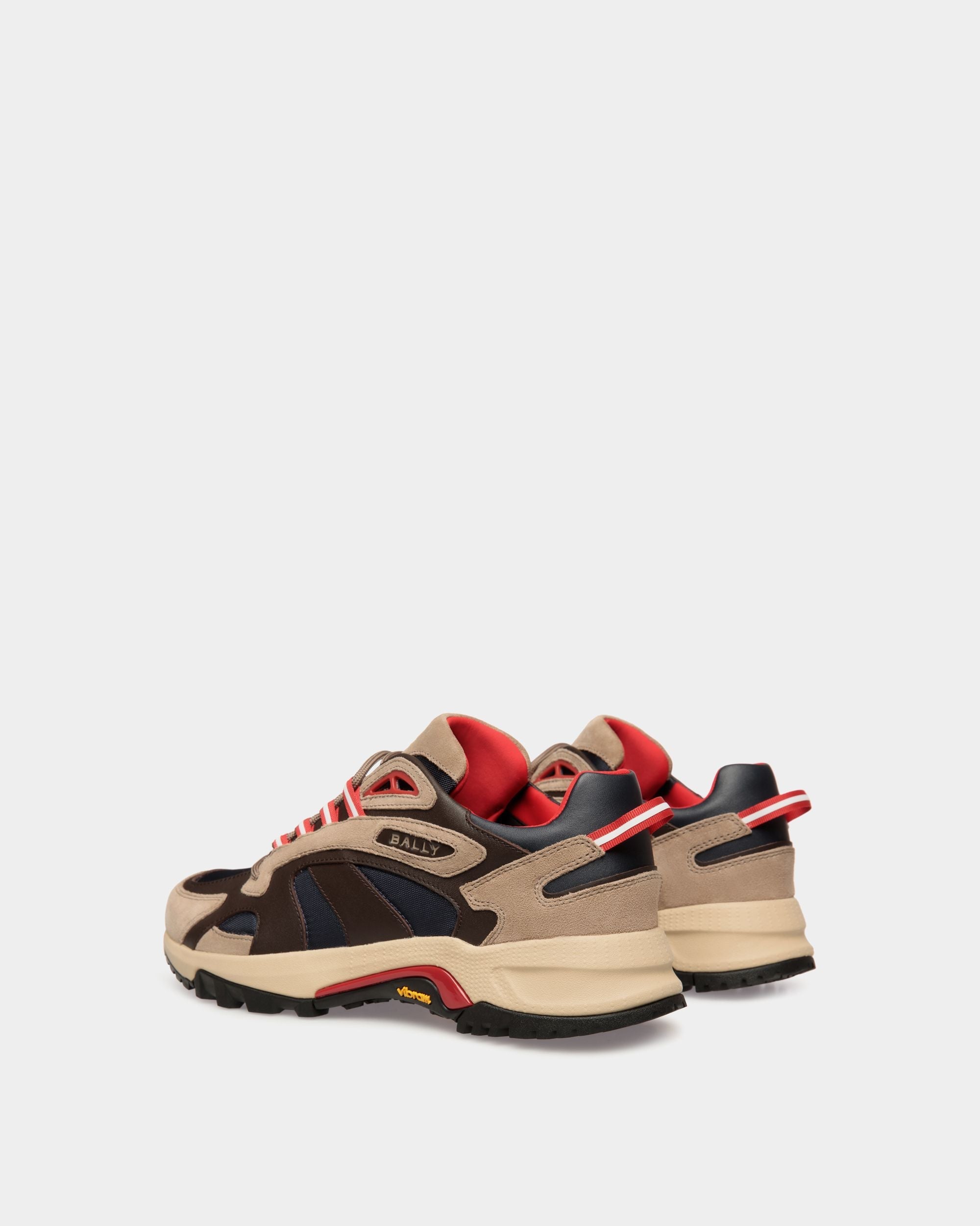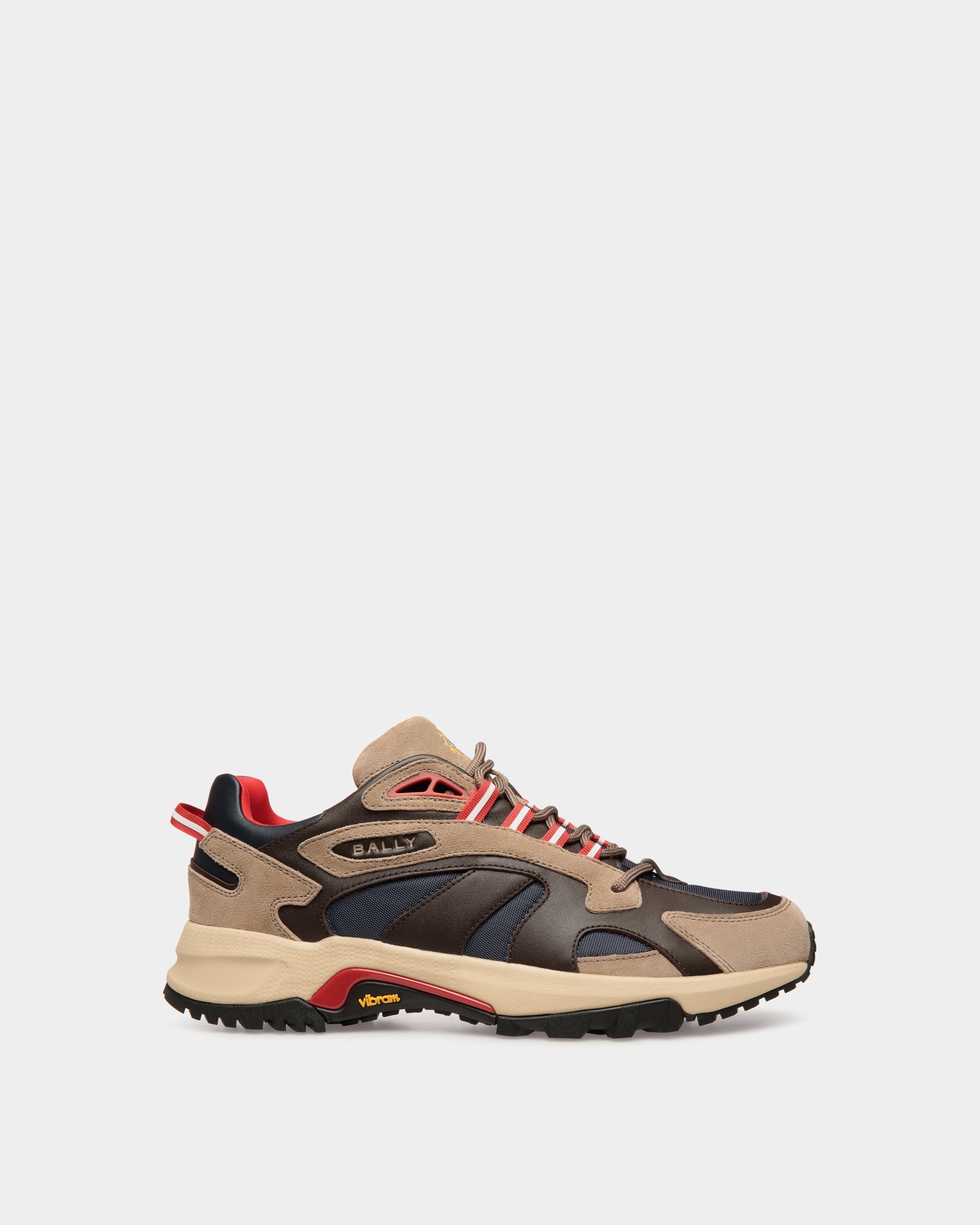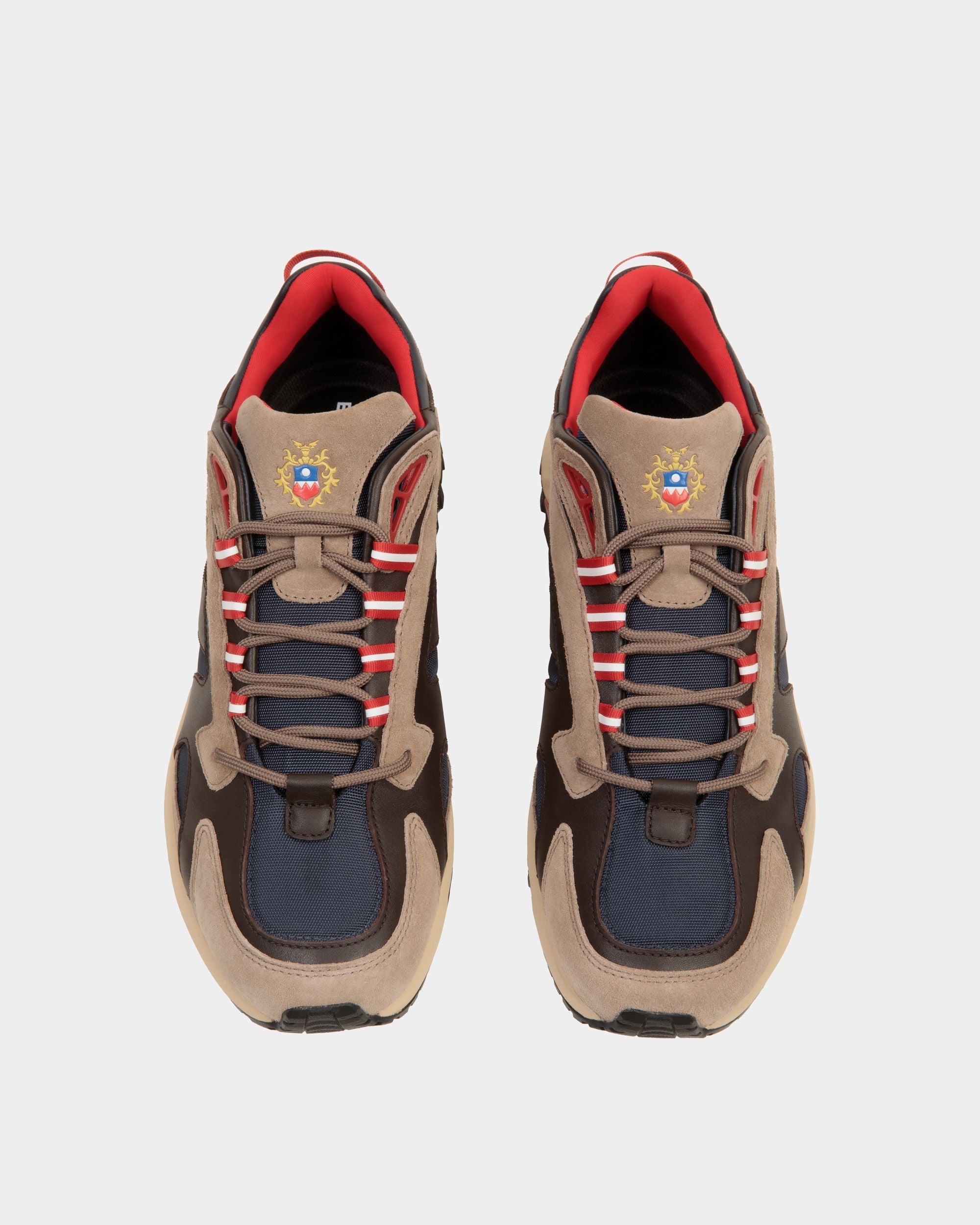 This Faster sneaker features a multicolor upper in taupe suede. Ebano leather and navy blue nylon fabric. Red and white Ribbons act as eyelets. holding the round woven laces in place. The three-hue rubber sole is flexible and ensures grip. even on wet surfaces.