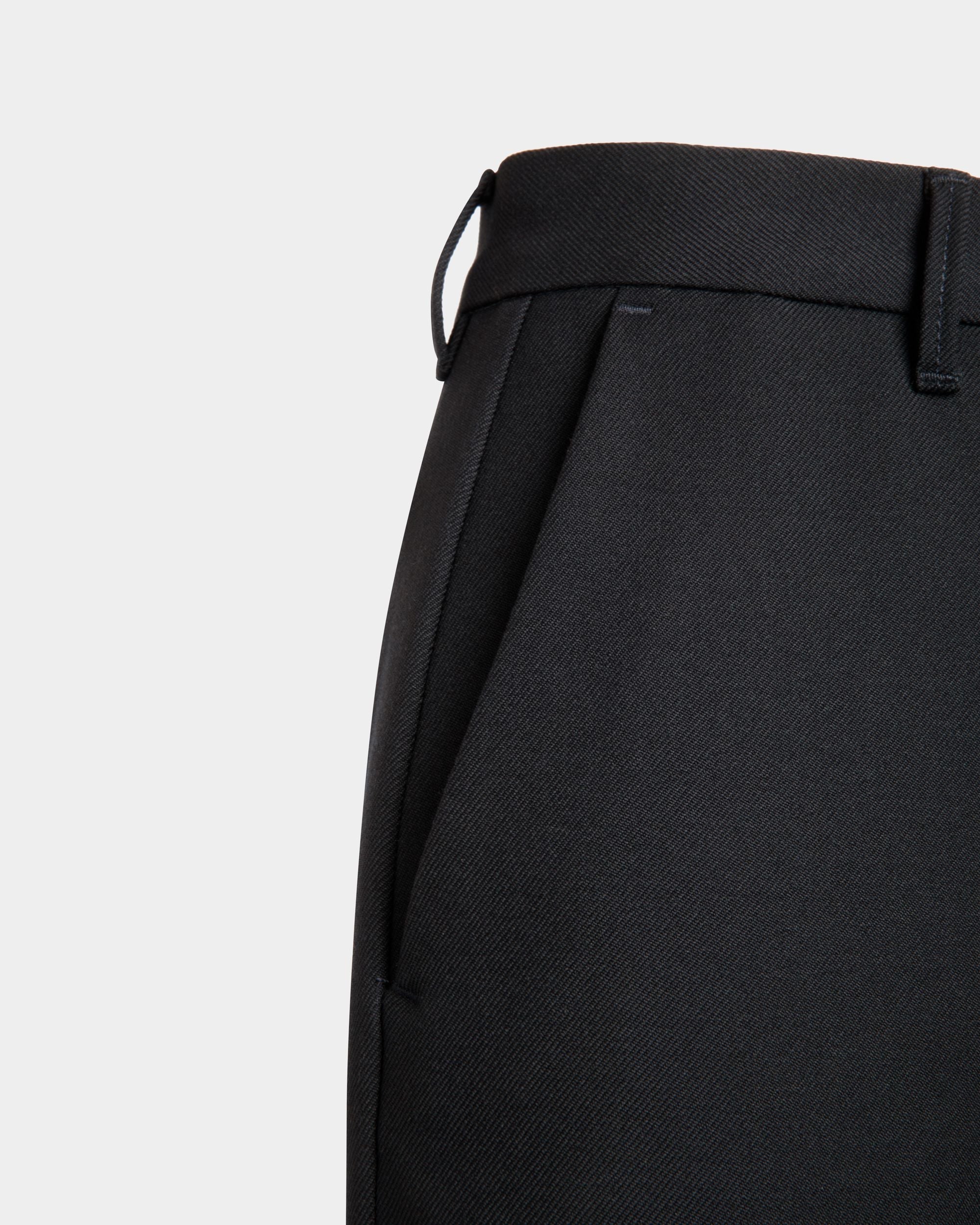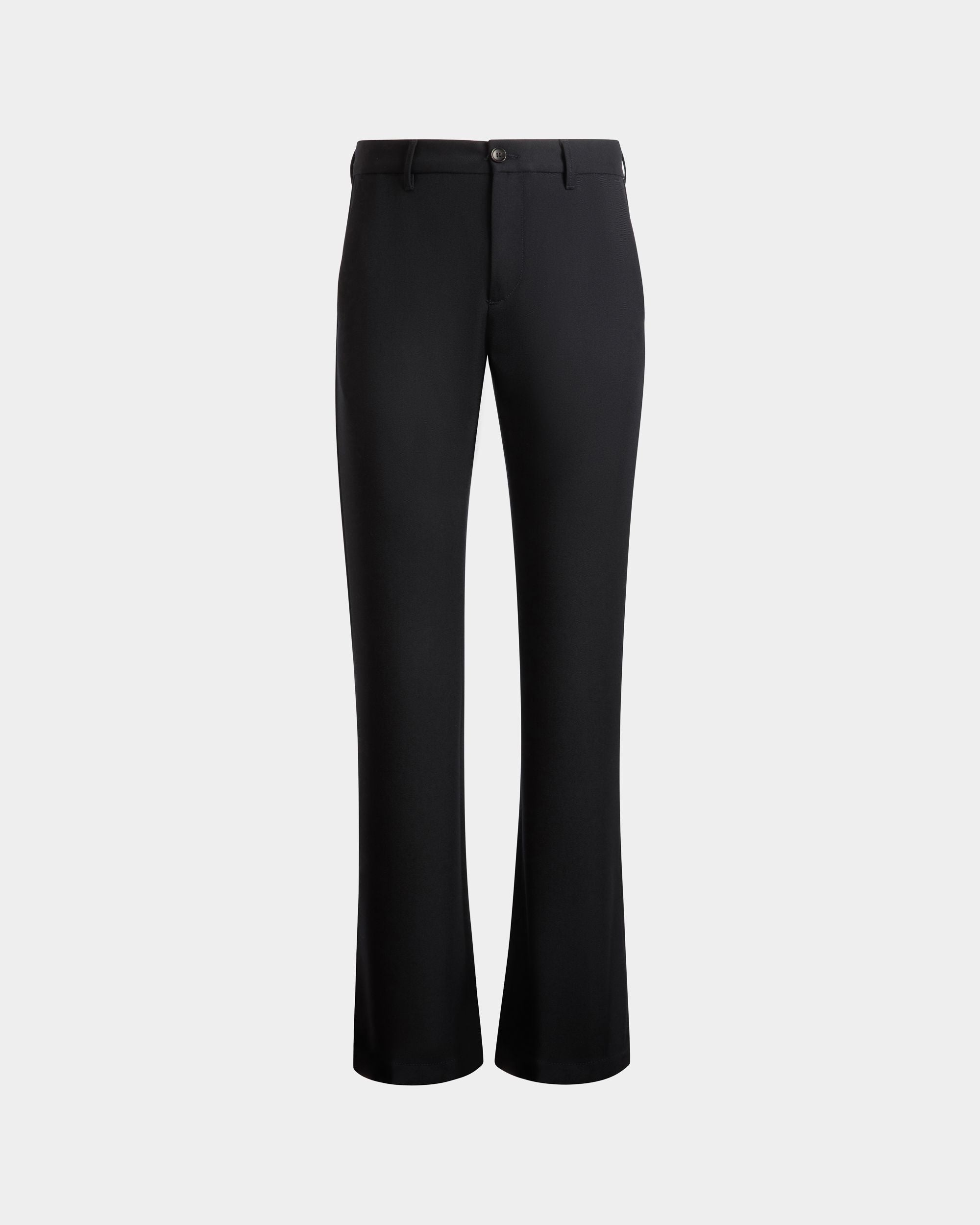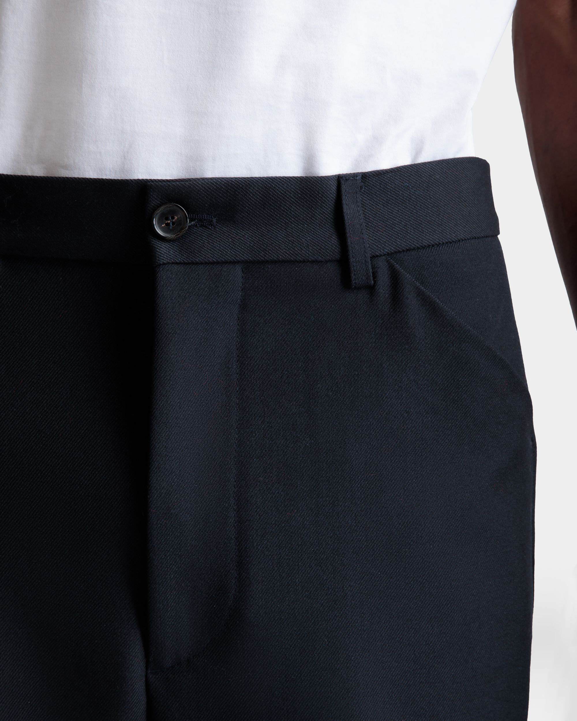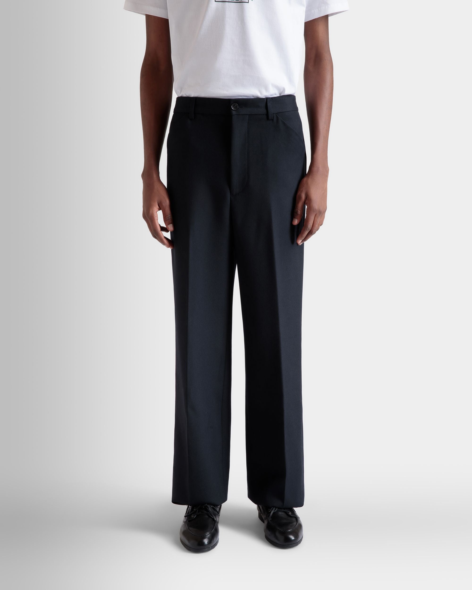These pants in navy blue woven wool cloth have a flat front and a slightly flared leg.