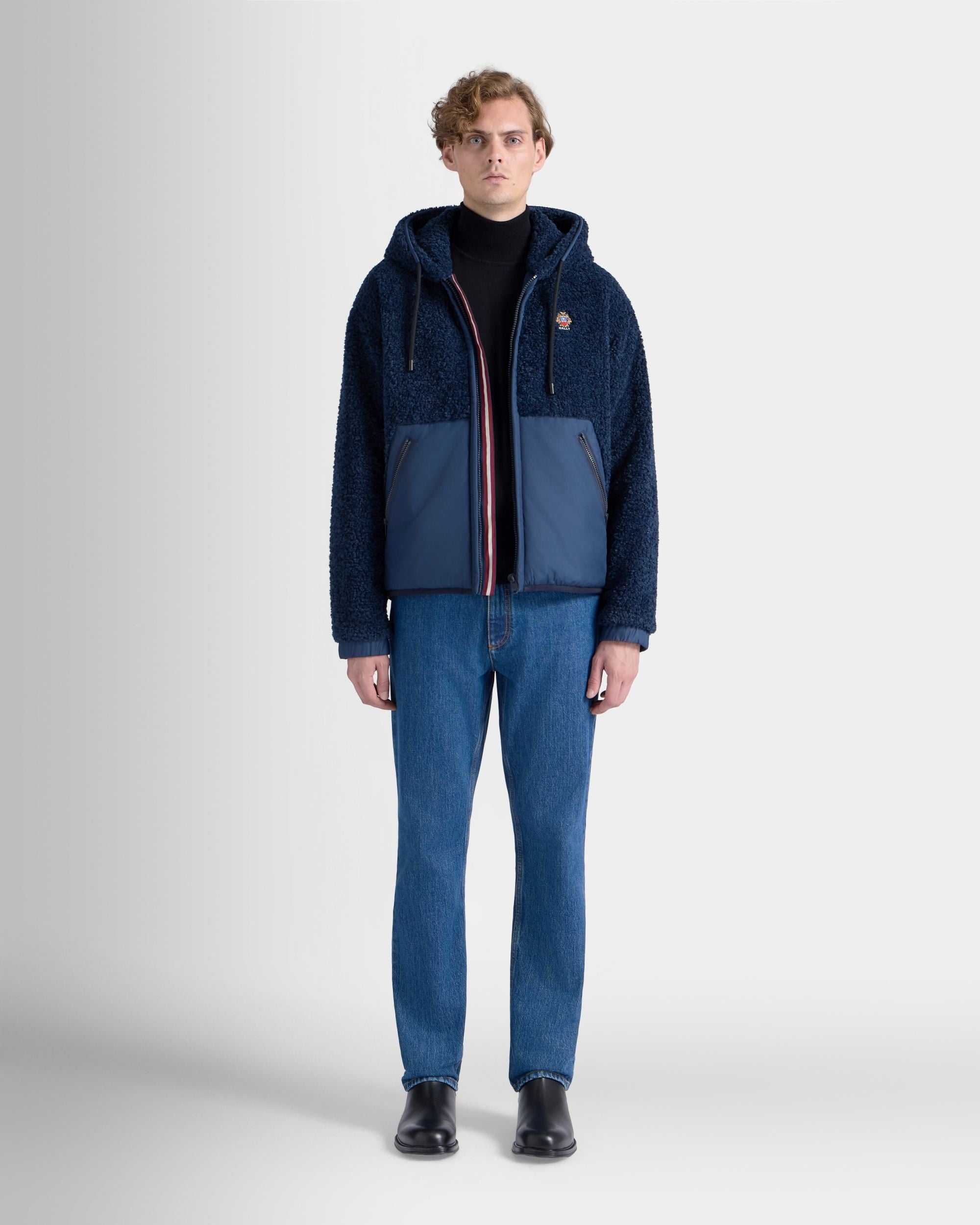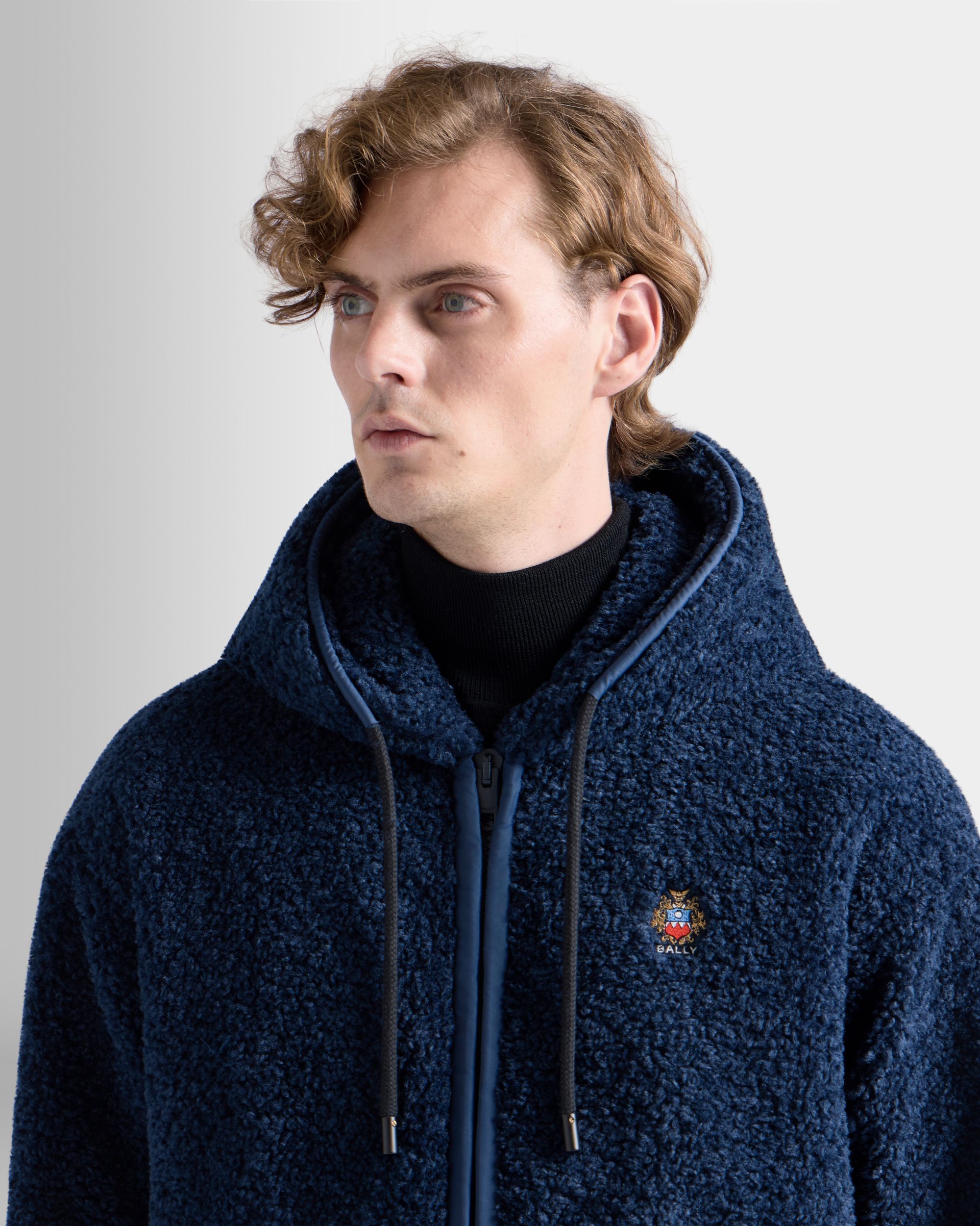In soft. plush fleece. this navy blue hooded jacket features nylon fabric pockets and covered elastic on the cuffs and hem. An embroidered Bally Crest finishes the left chest.