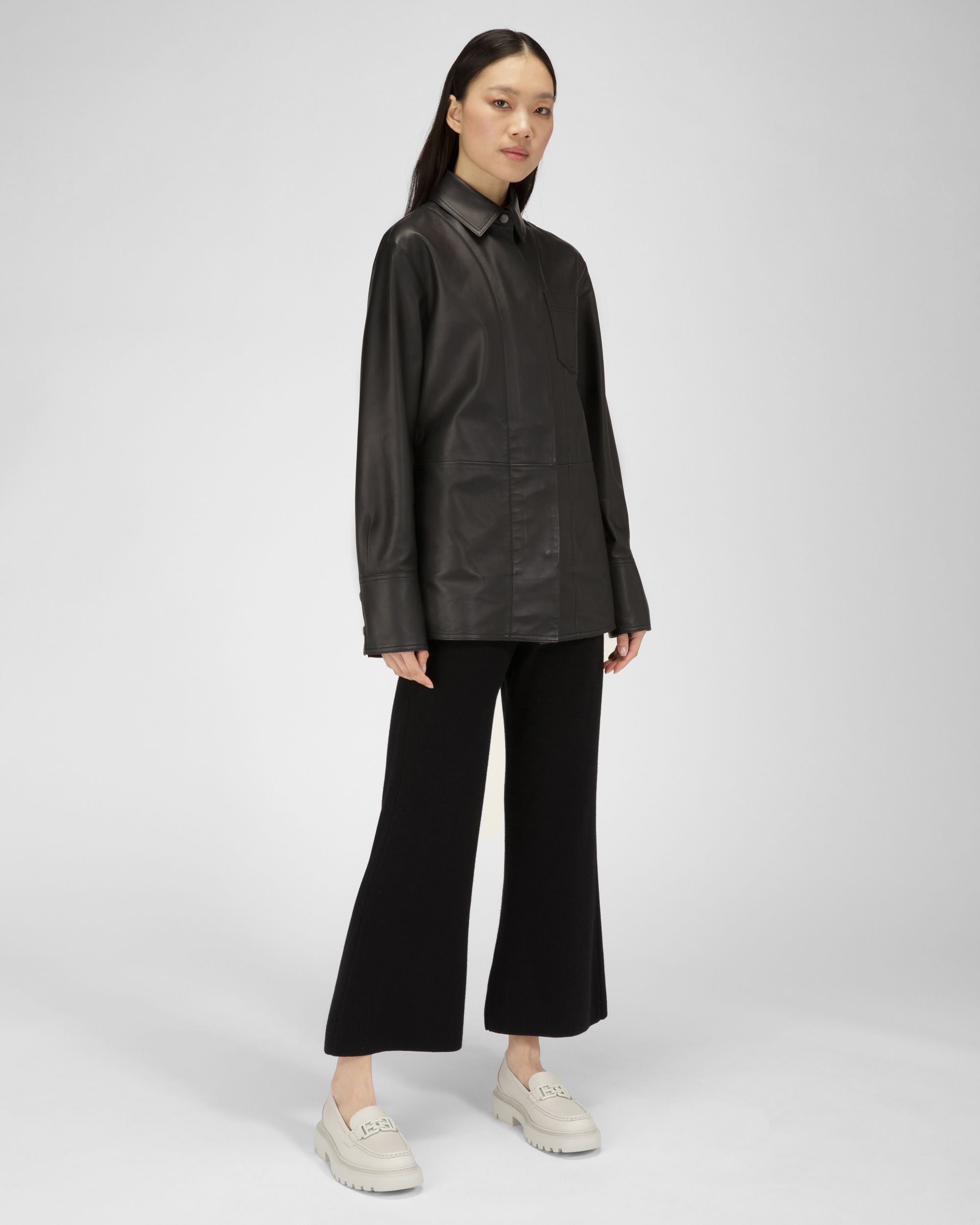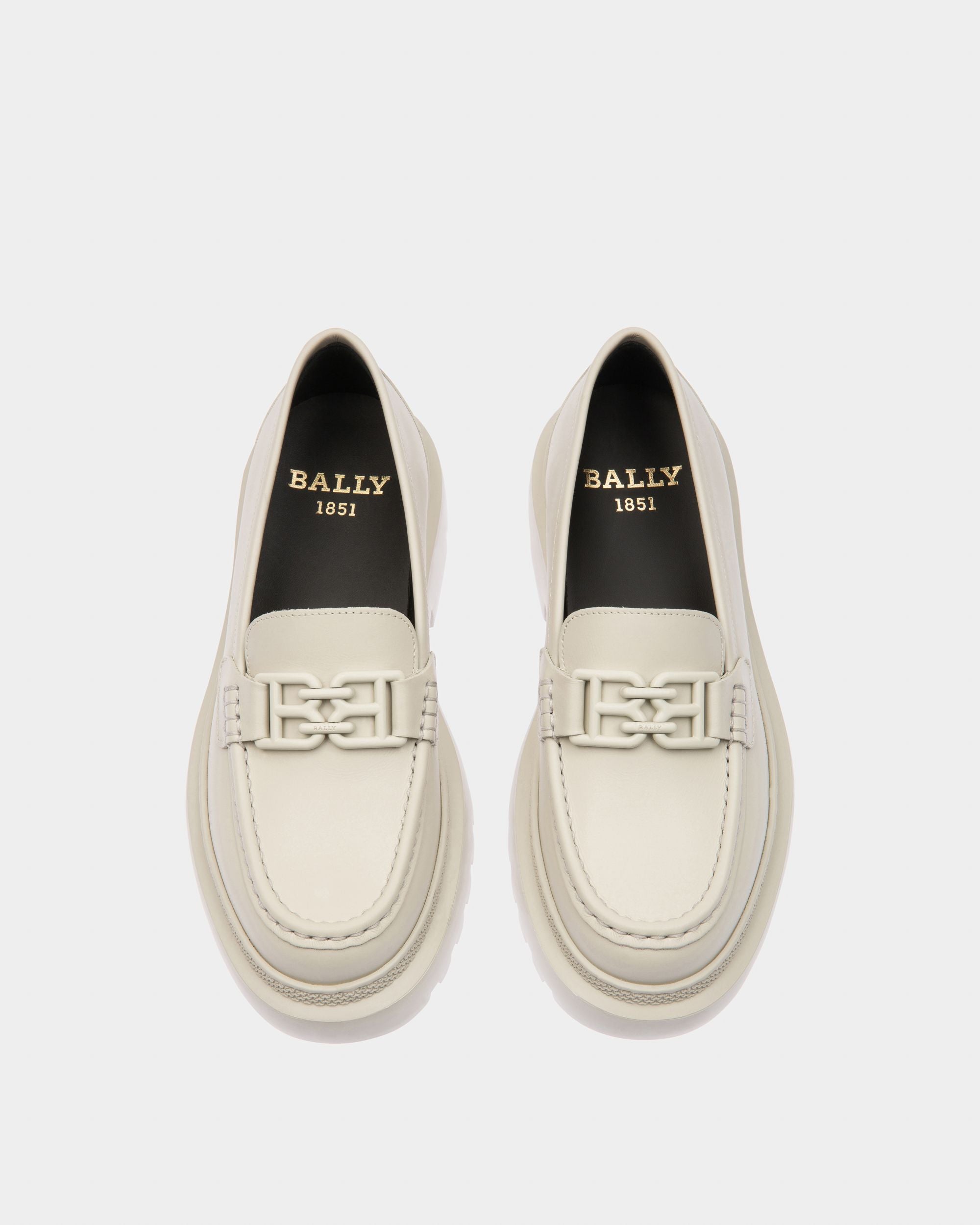 Finished in denty white leather. the Gioia Flat moccasin features a tonal B-Chain detail and chunky. extralight rubber sole.