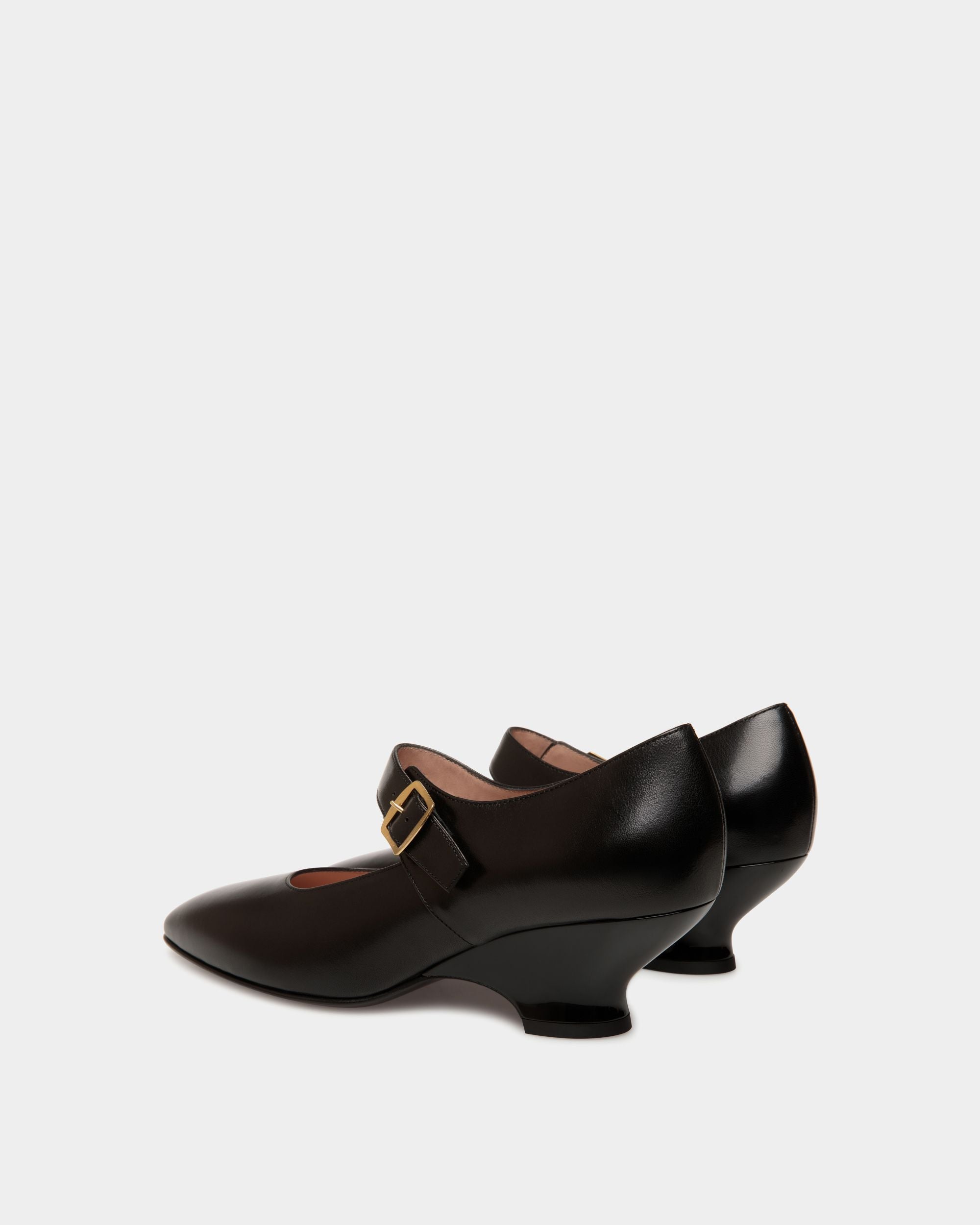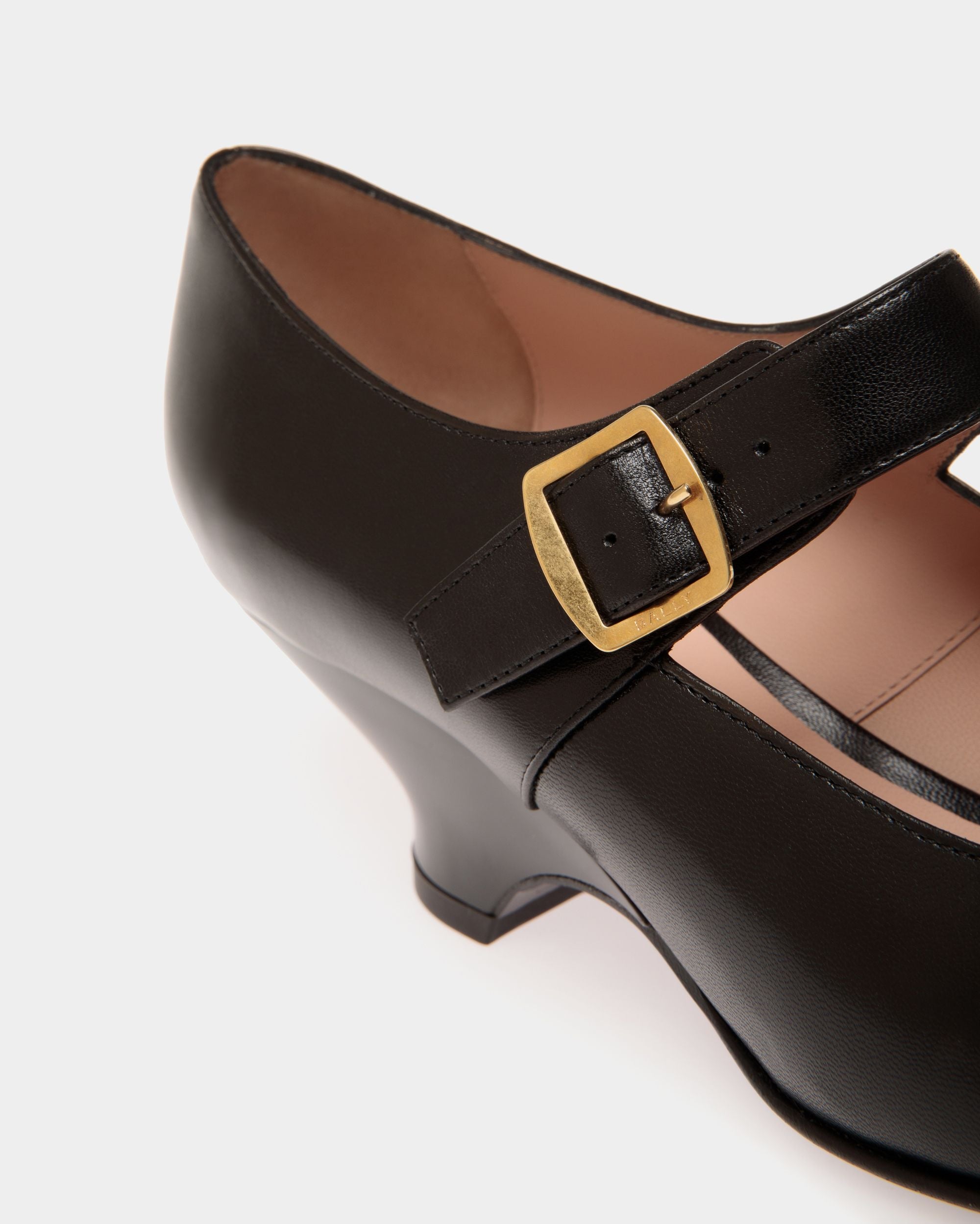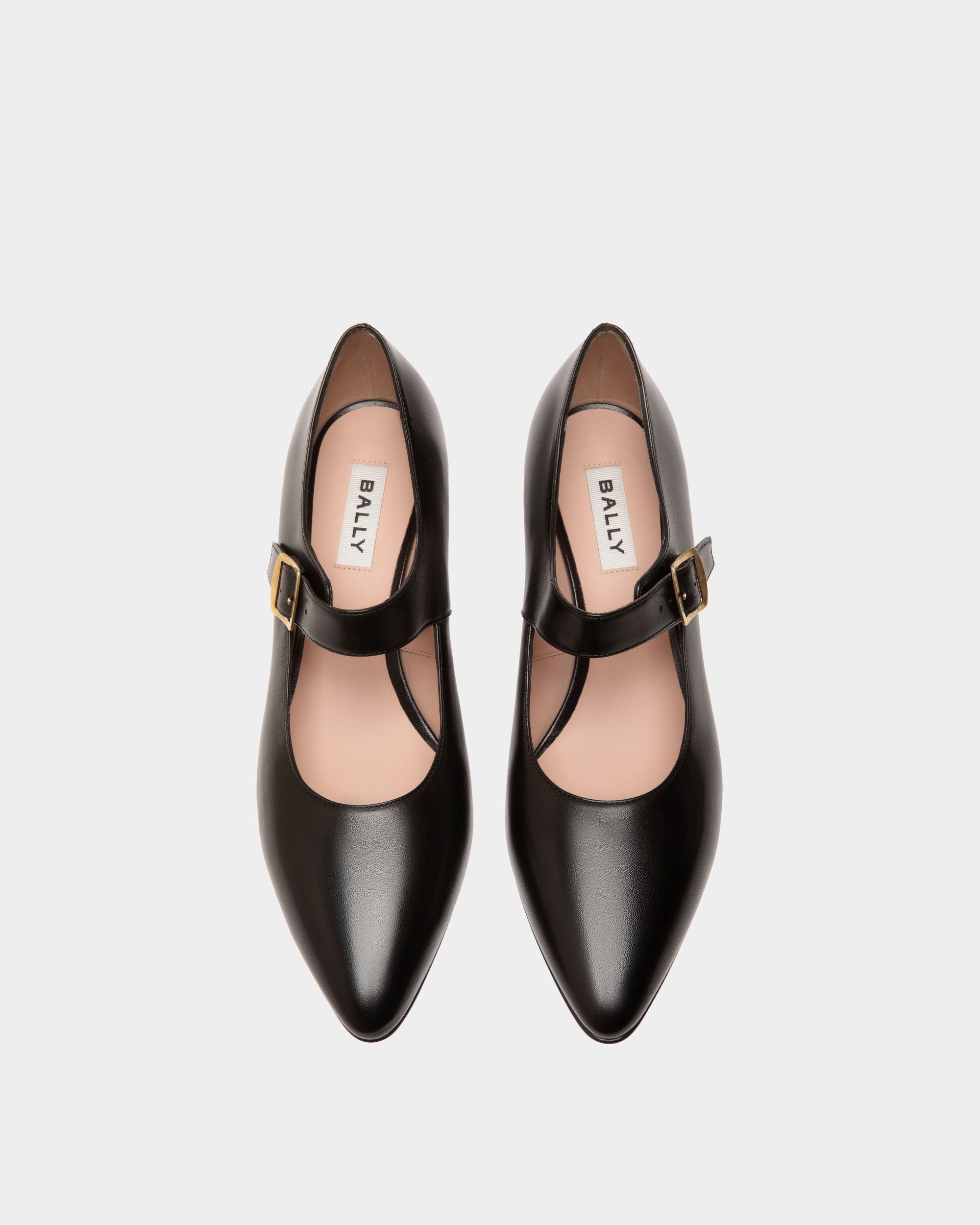 The pointed-toe silhouette of this Glendy pump in black lambskin was inspired by a vintage style found in the Bally archives. A square buckle in gold-tone metal engraved with a logo secures the strap across the top.