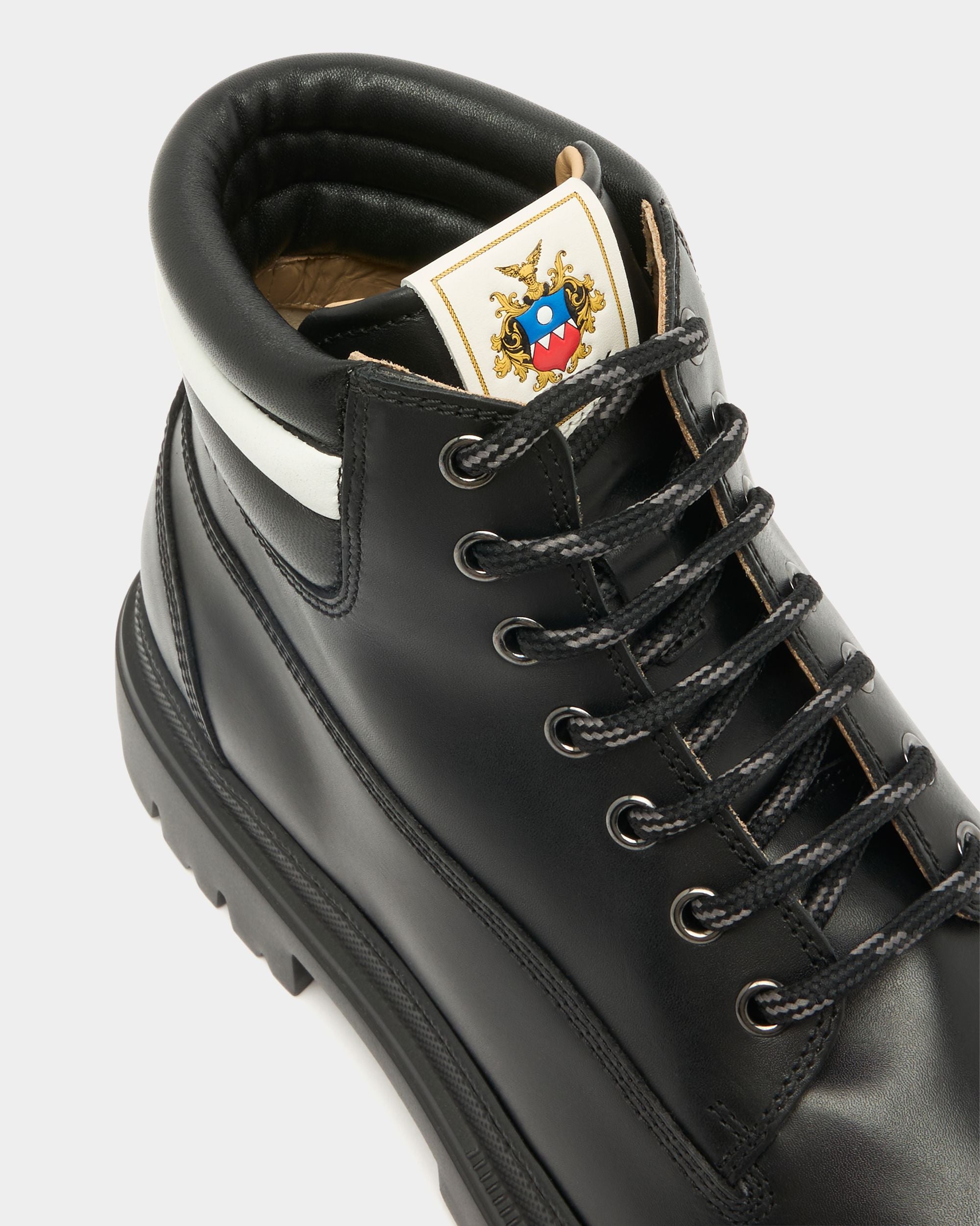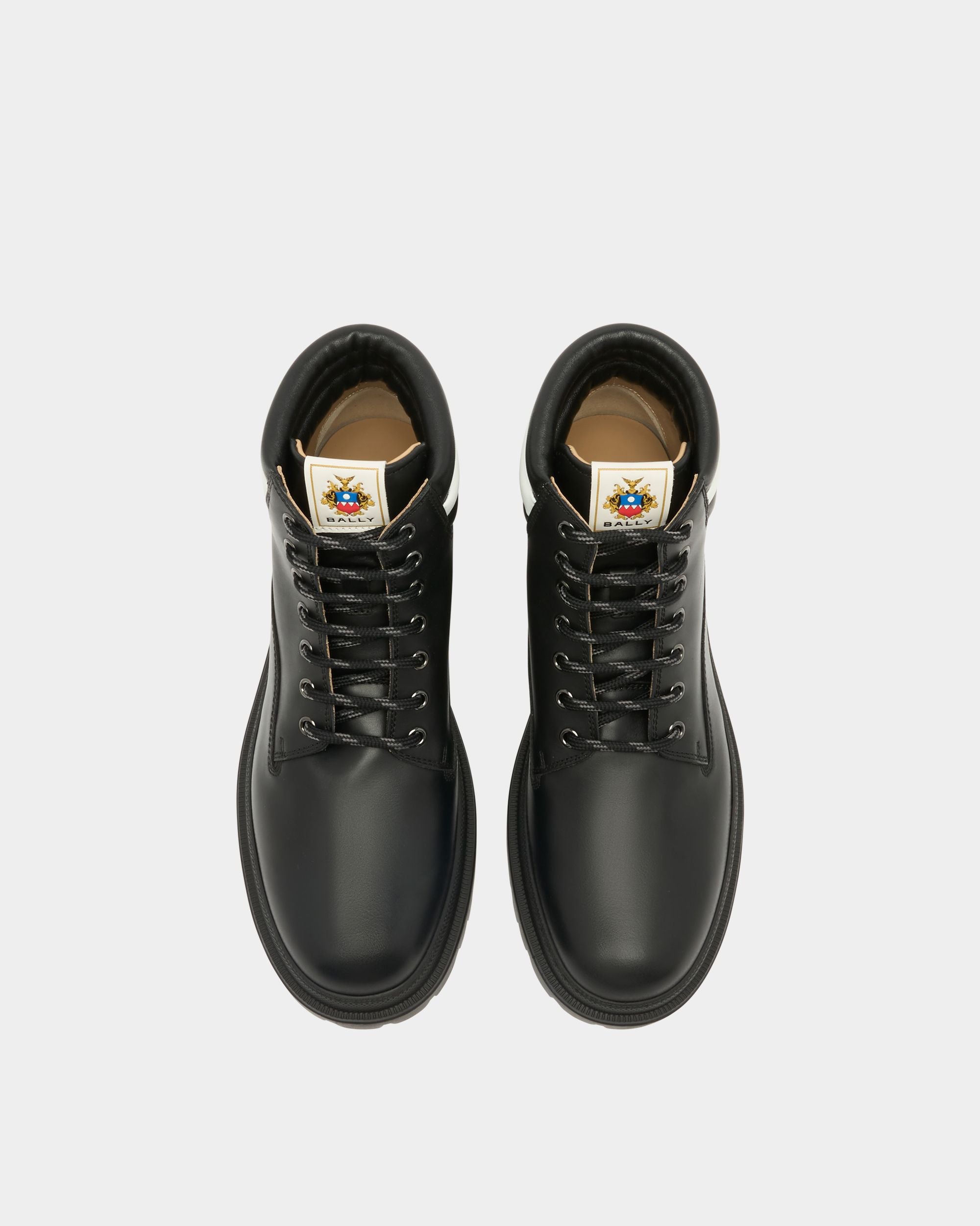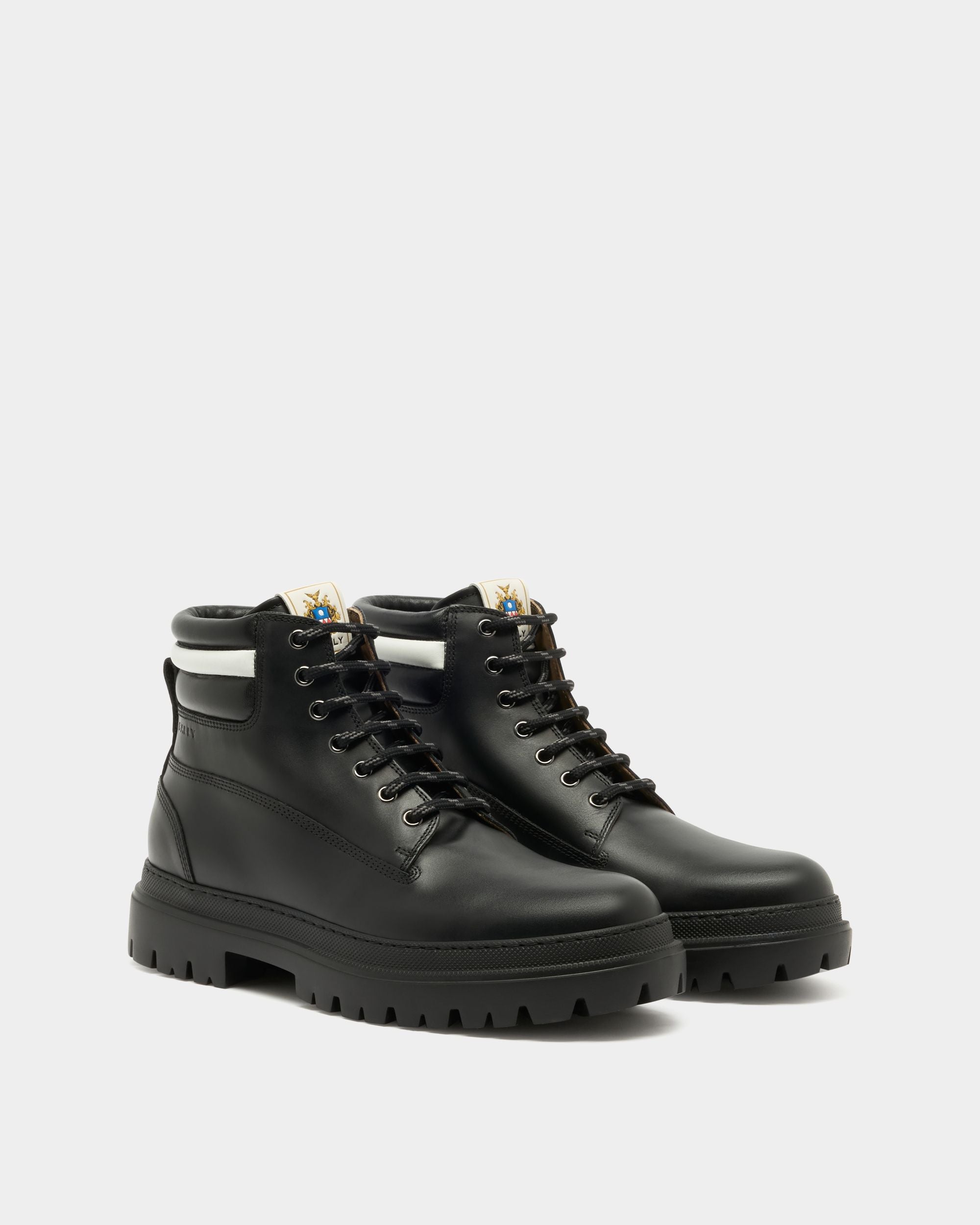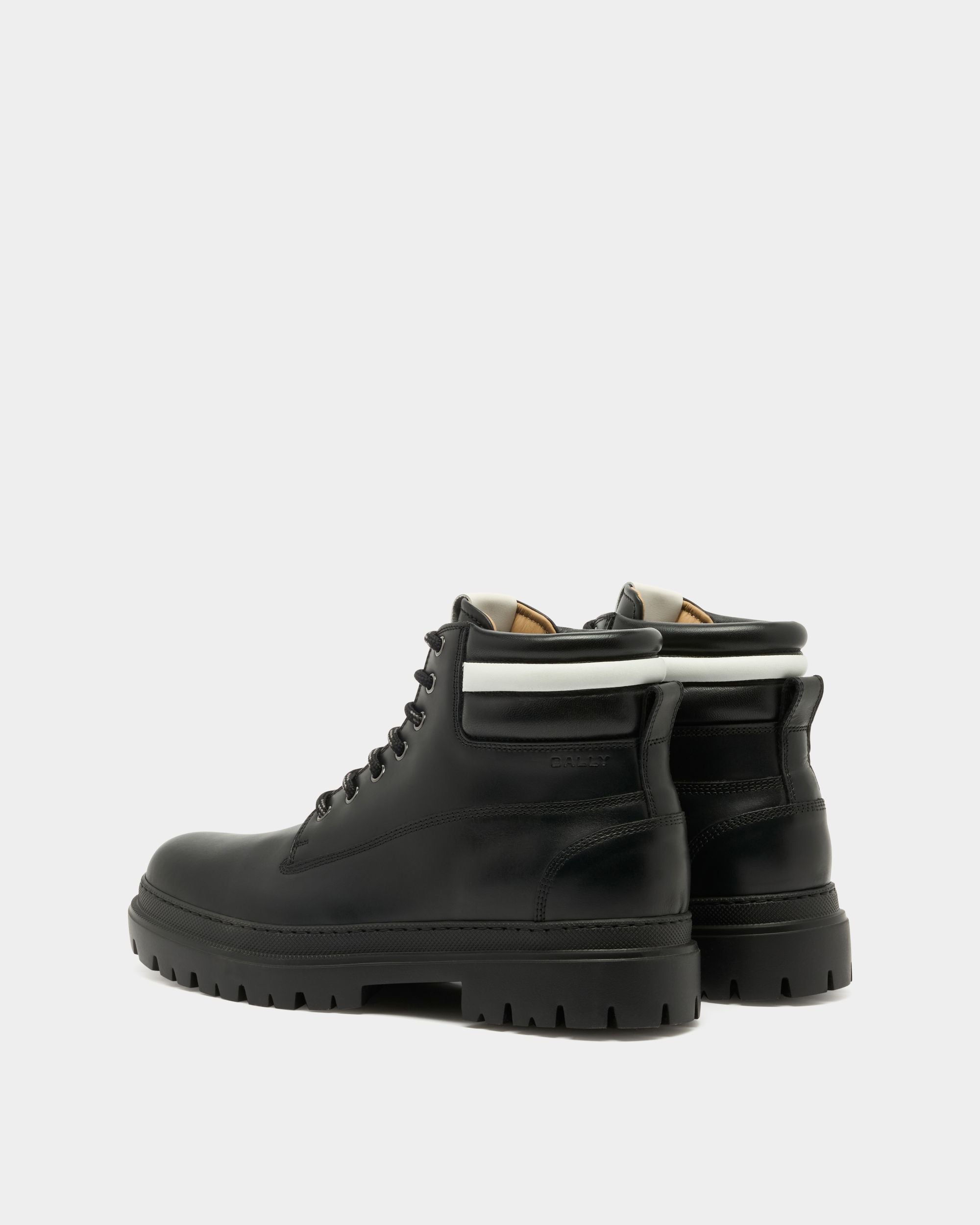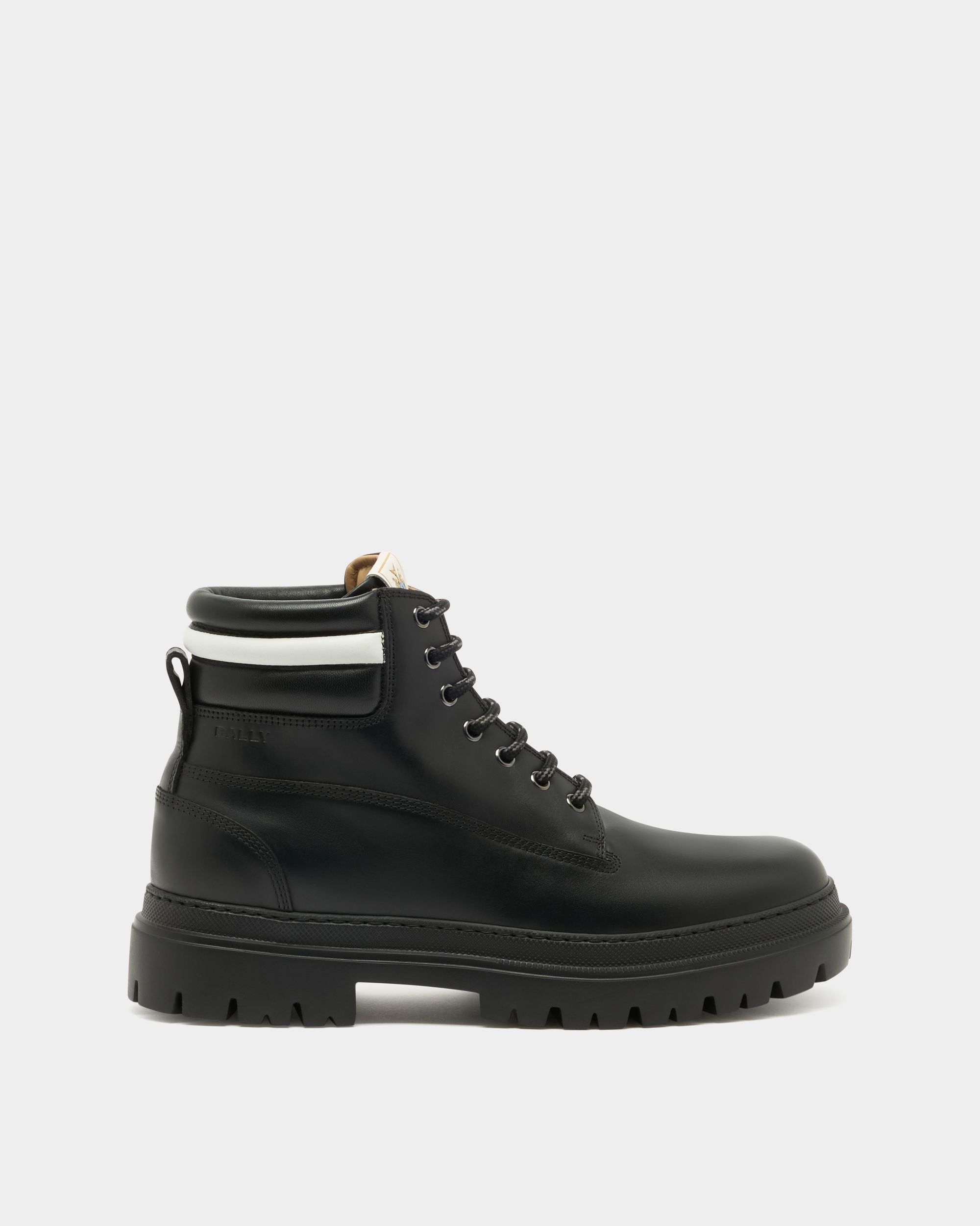 In black calfskin with a padded Ribbon signifier on the collar. this Hallen boot unites Bally aesthetics and comfort. The chunky rubber sole ensures a contemporary silhouette and stability on any terrain.