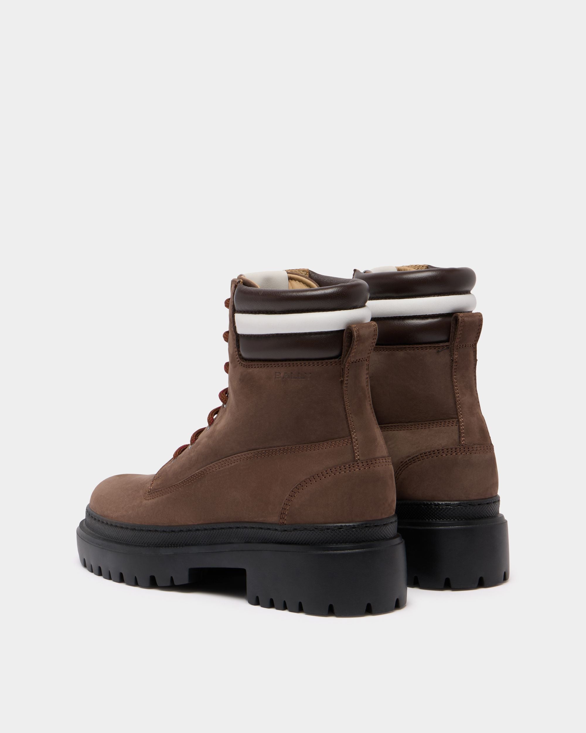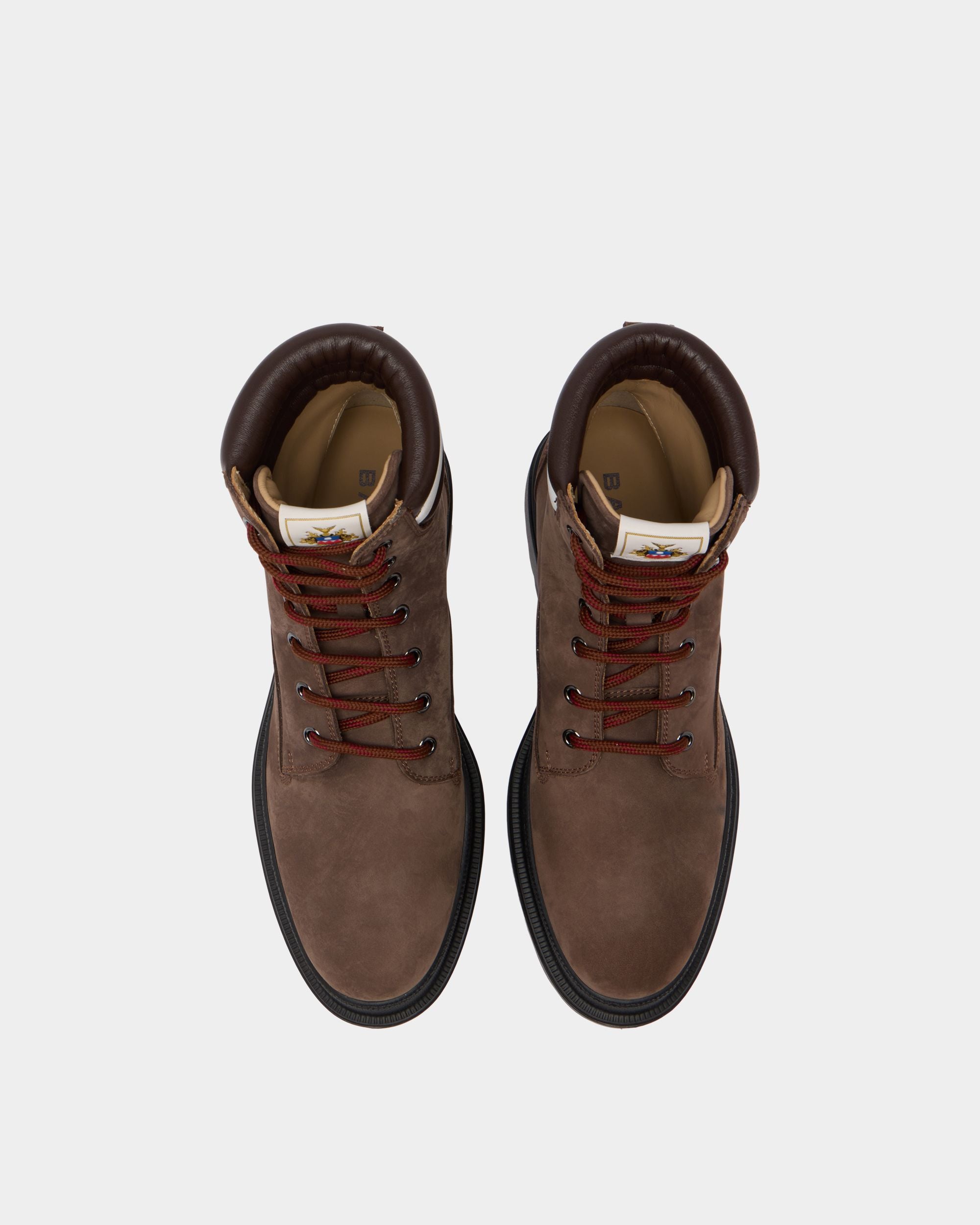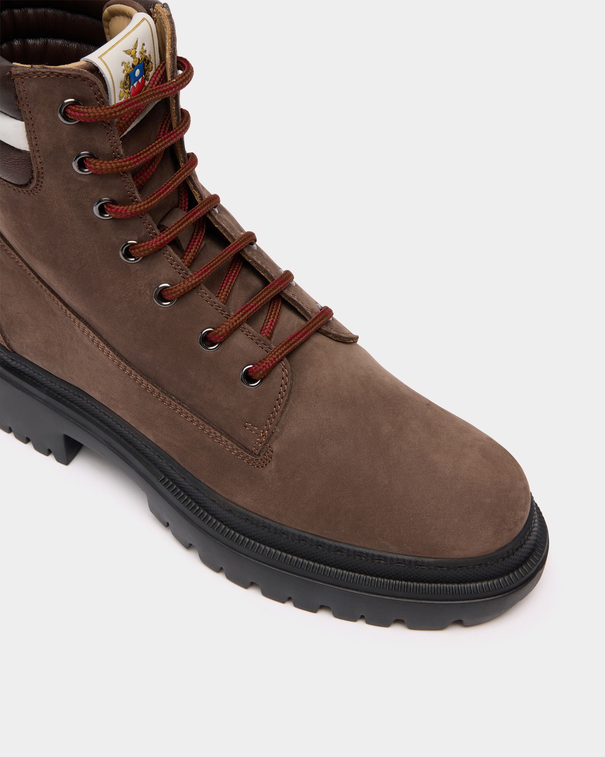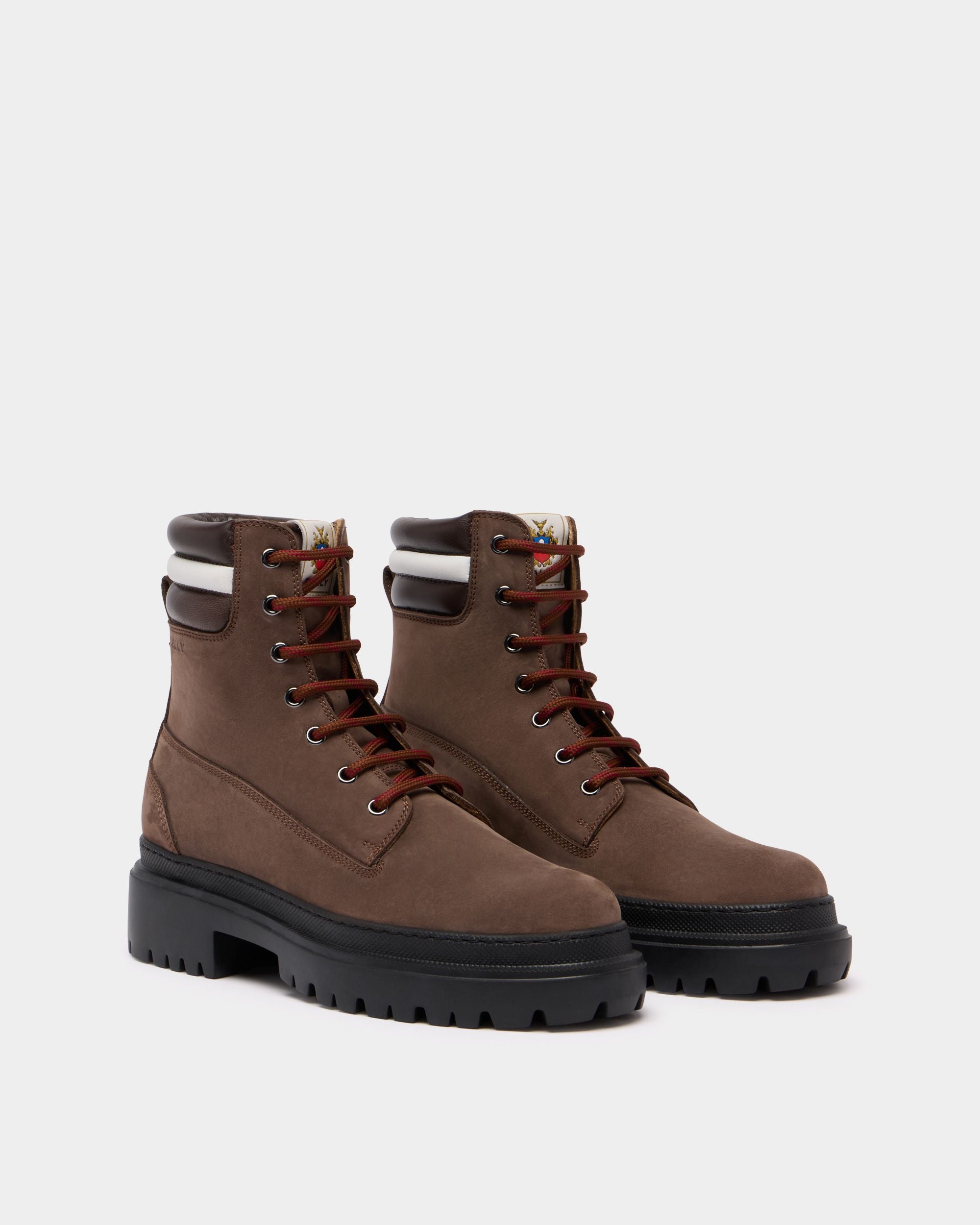 This Hallen boot is in Ebano leather with a nubuck finish. The chunky rubber sole provides a contemporary silhouette and grip on all terrain. A Bally Ribbon pads the collar along the top.