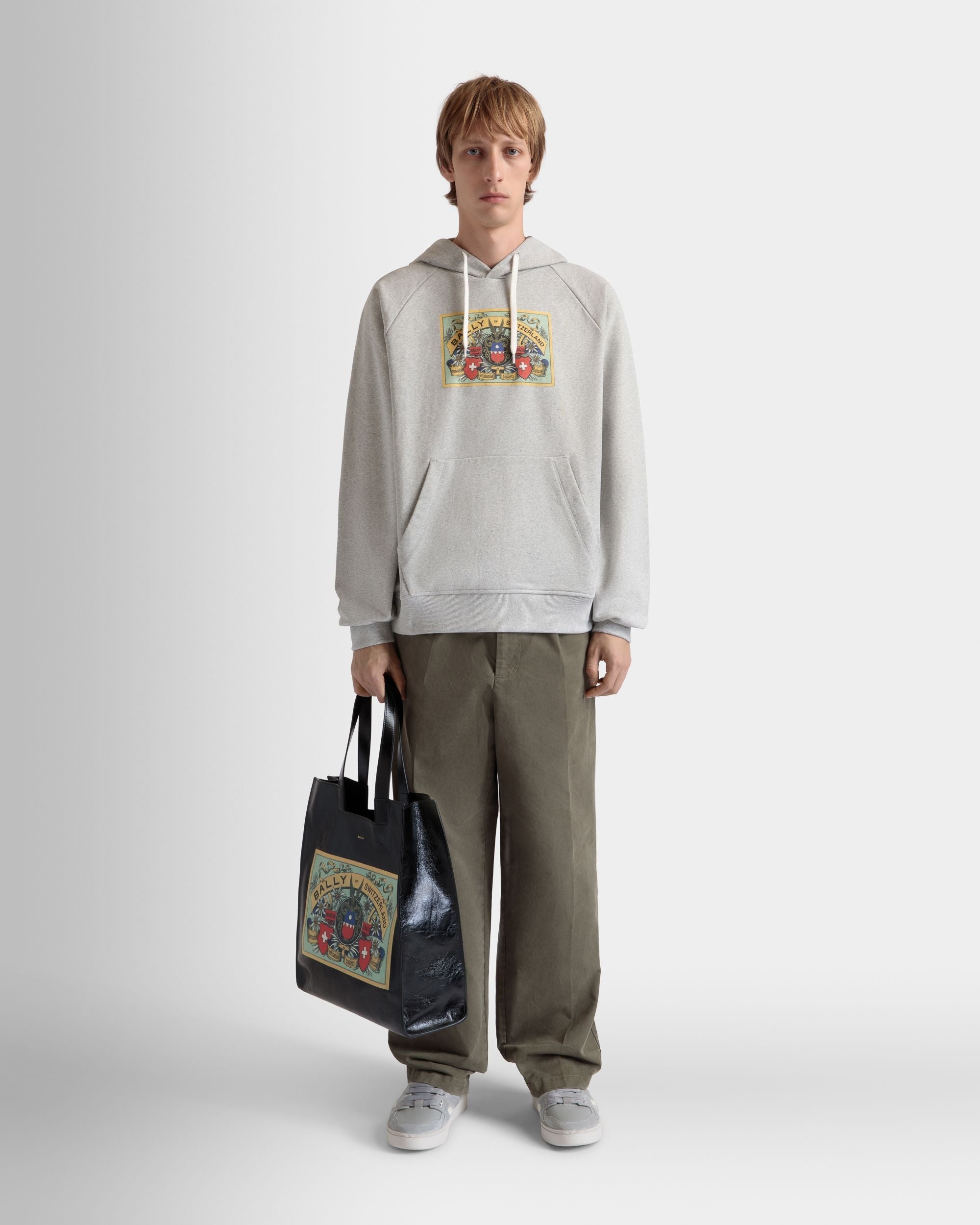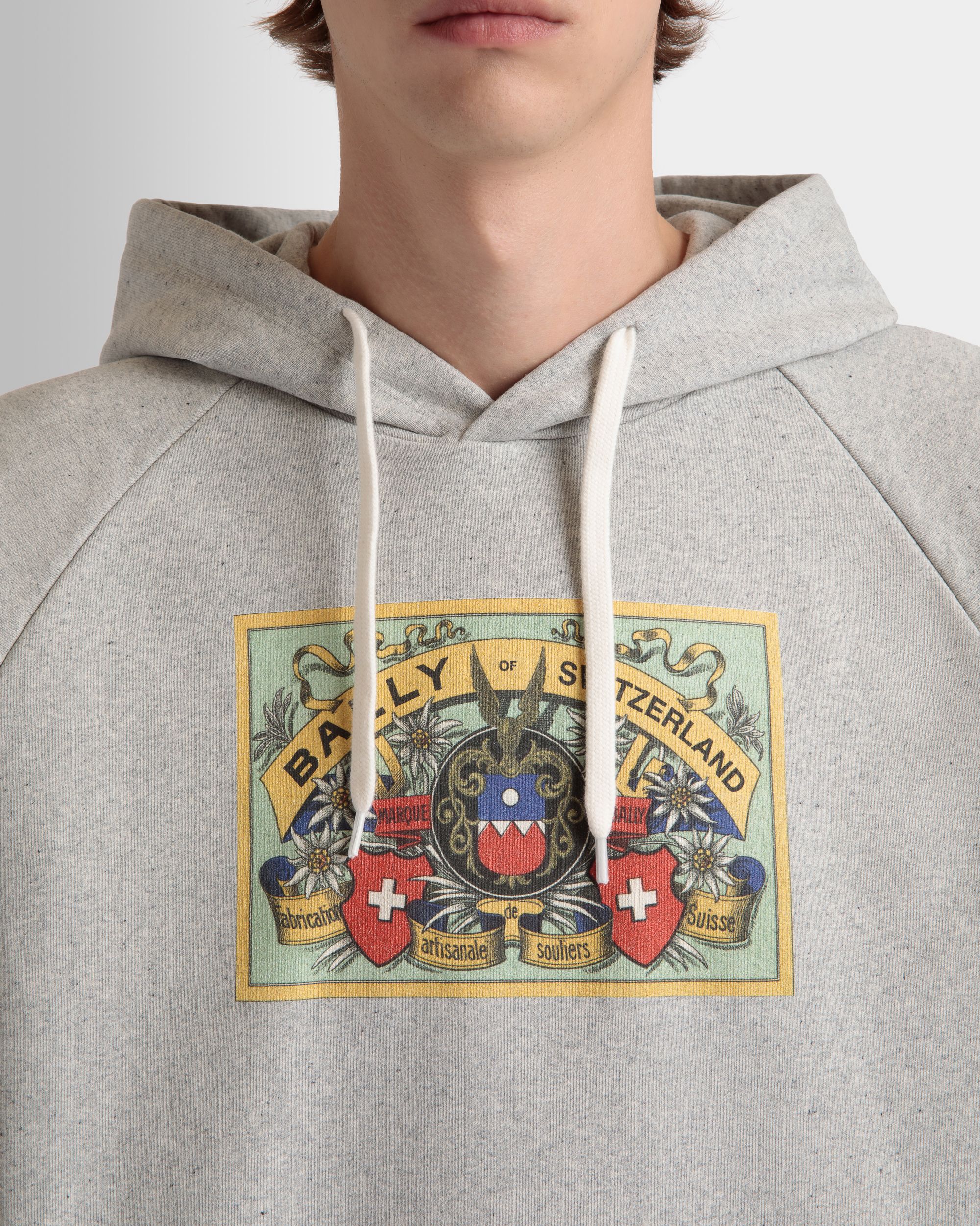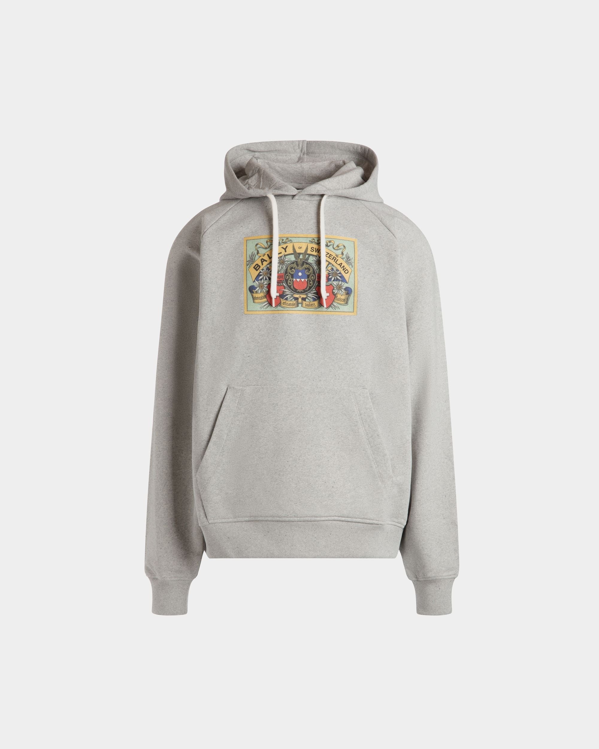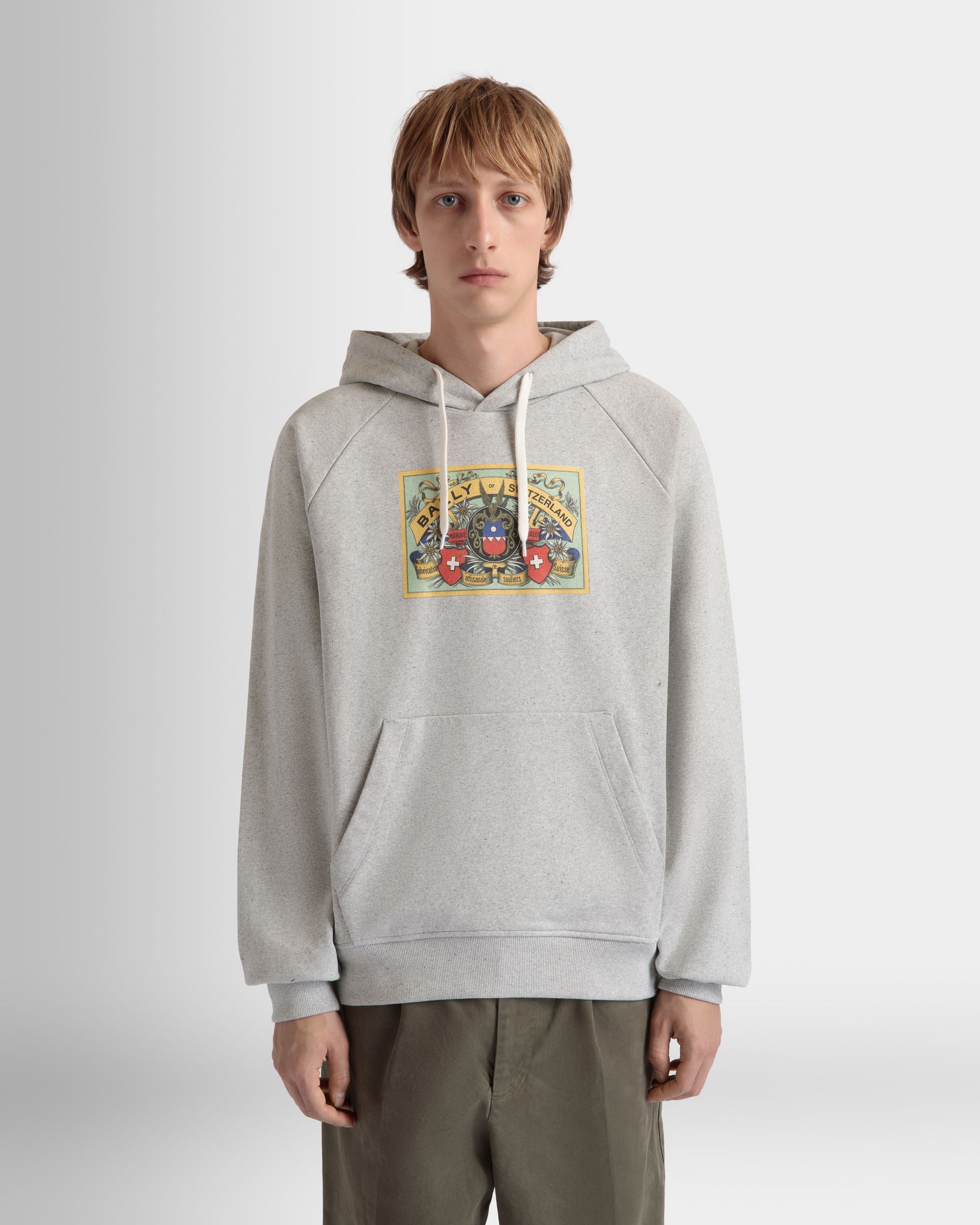 Crafted from premium stretch cotton. a Bally Crest graphic from the archives is printed on the front of this classic m??lange grey hoodie.