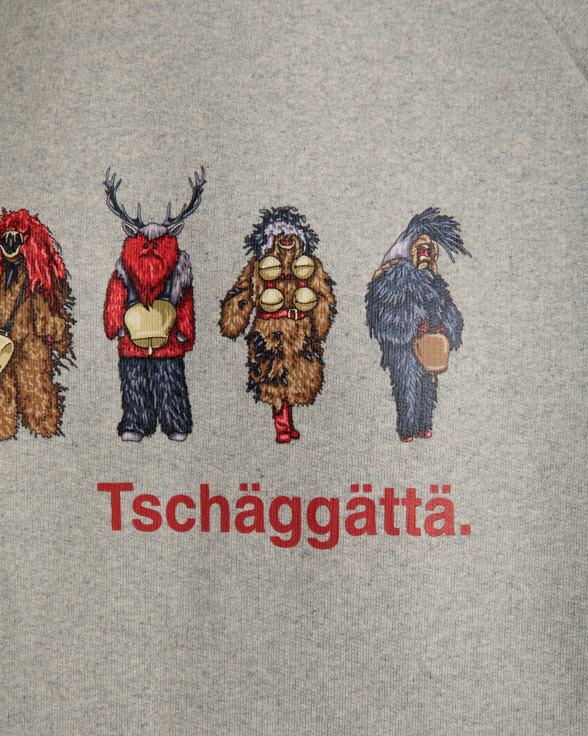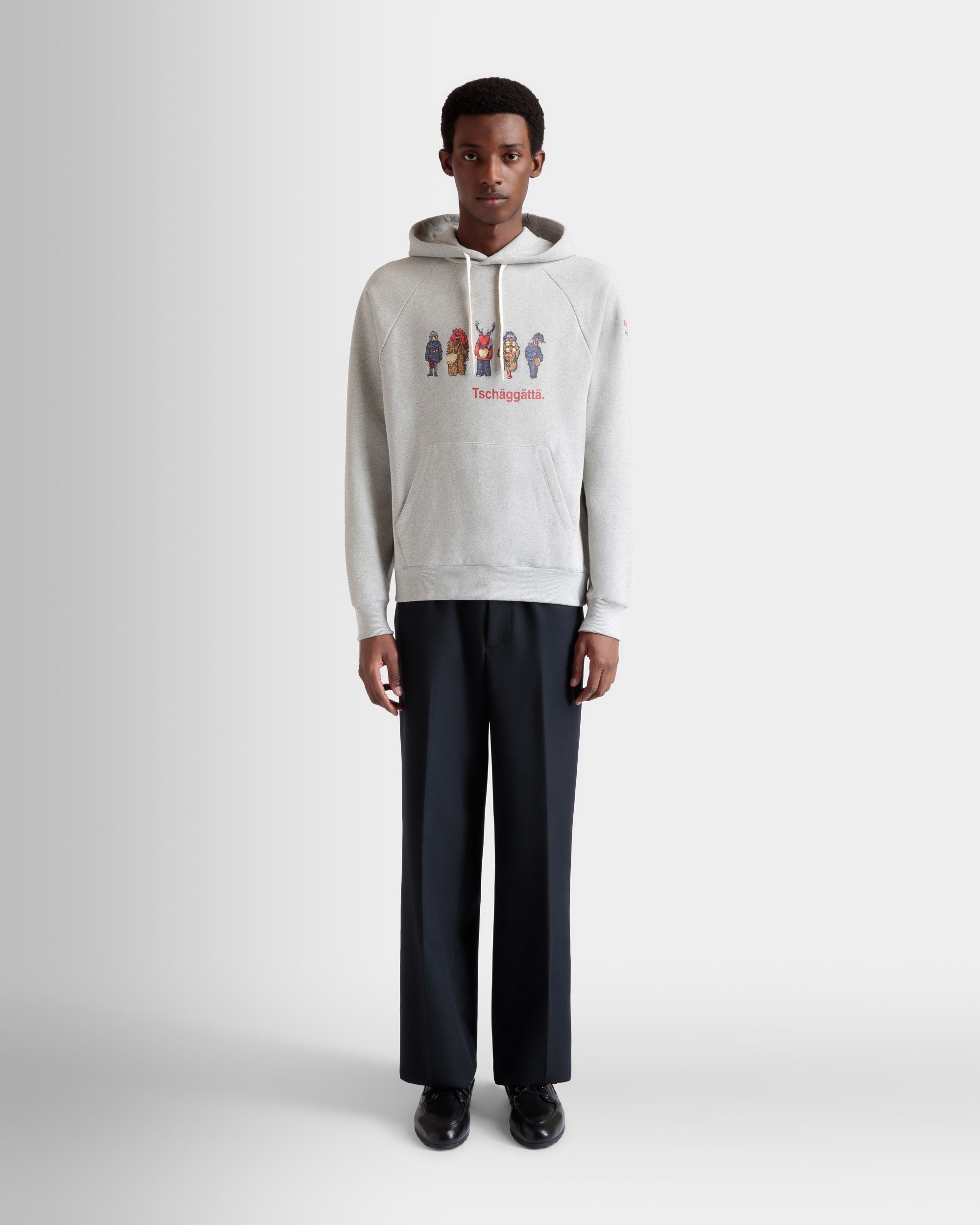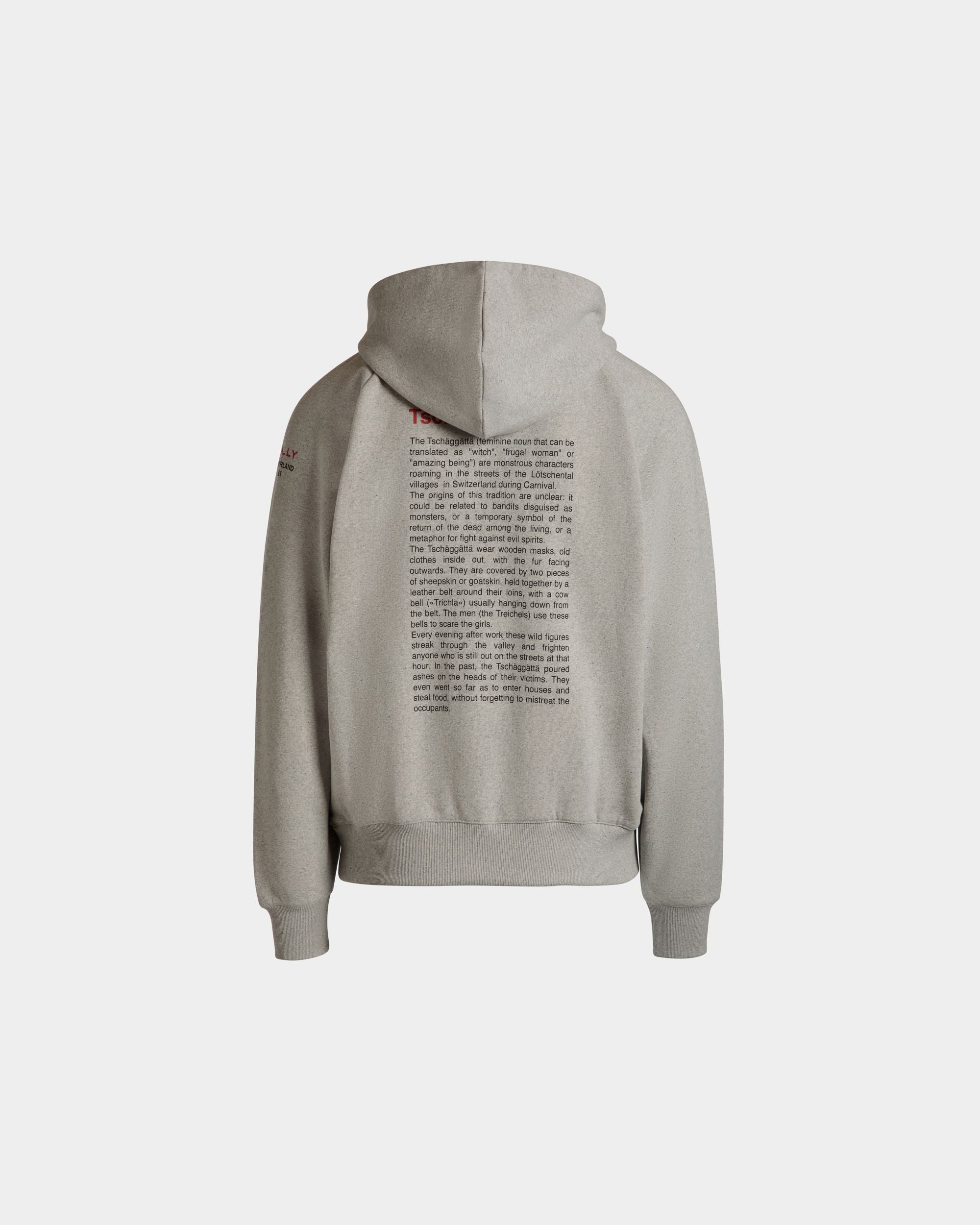 Prints on the front and back of this long-sleeve hoodie in grey melange cotton portray the Tsch?gg?tt?. fanciful characters from Alpine lore which appear during Carnival celebrations.