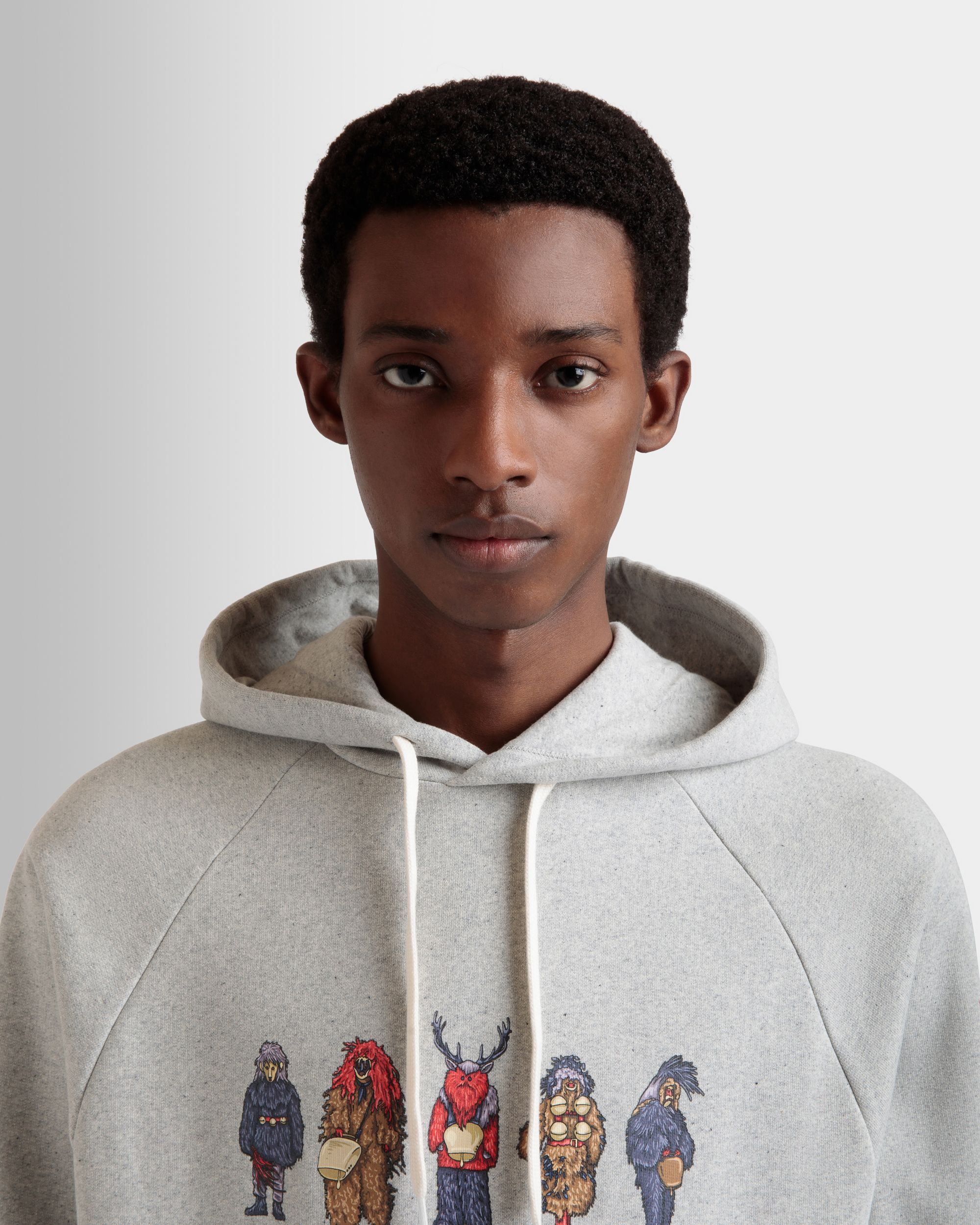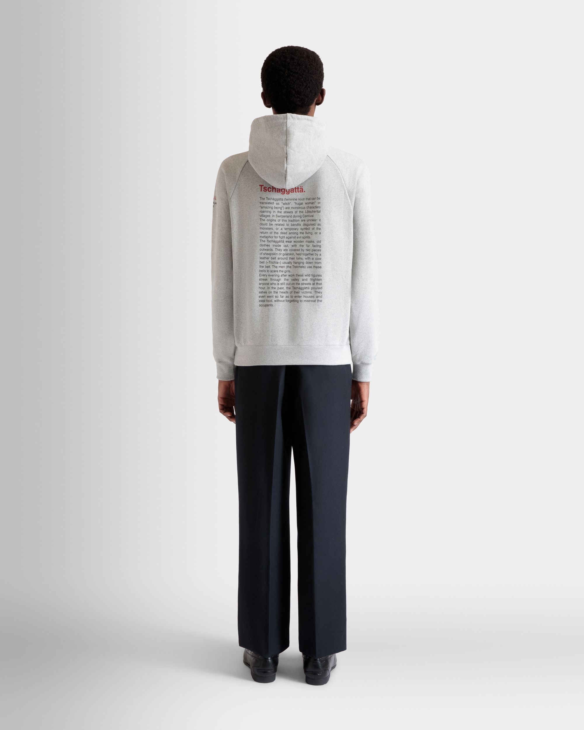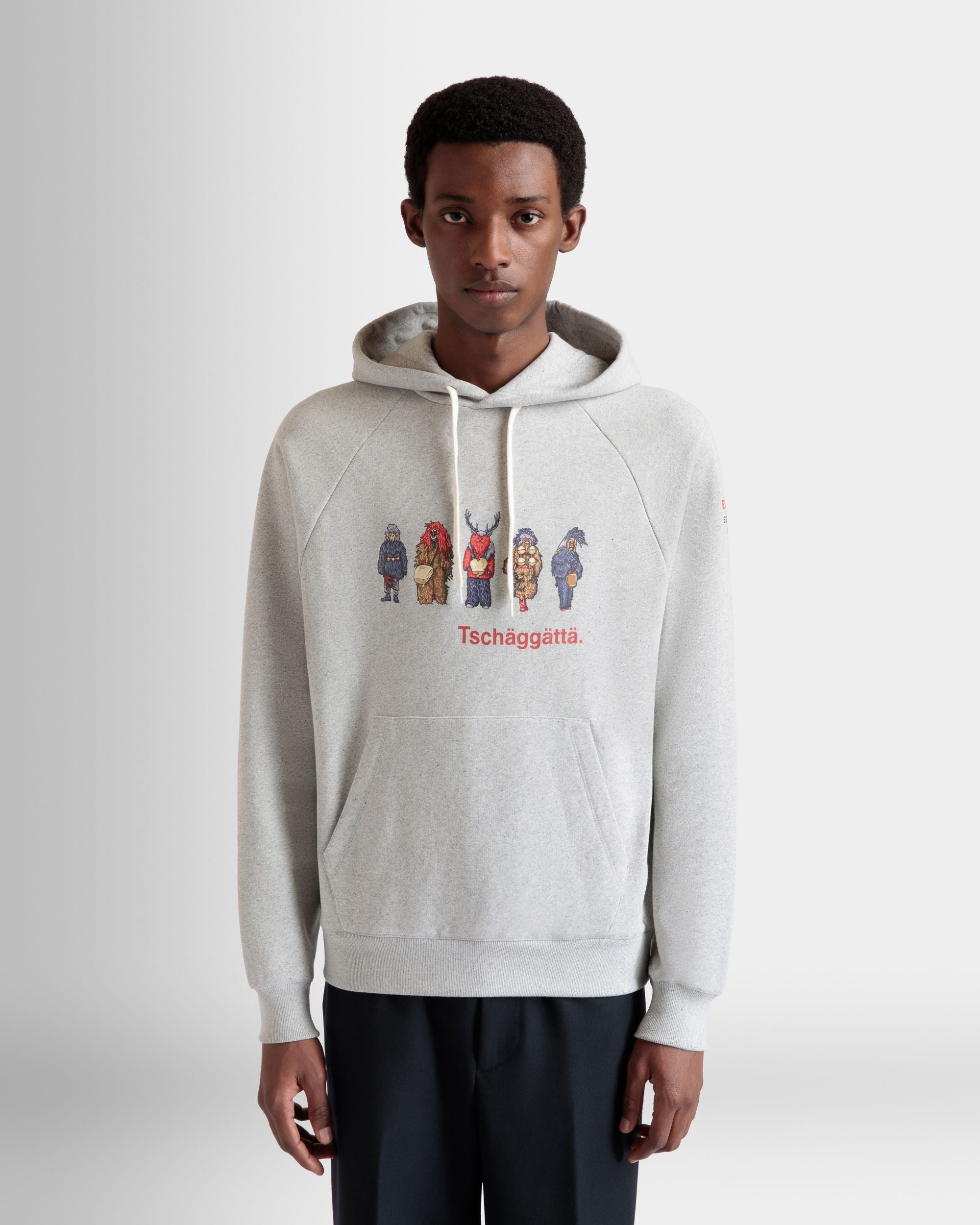 Prints on the front and back of this long-sleeve hoodie in grey melange cotton portray the Tsch?gg?tt?. fanciful characters from Alpine lore which appear during Carnival celebrations.