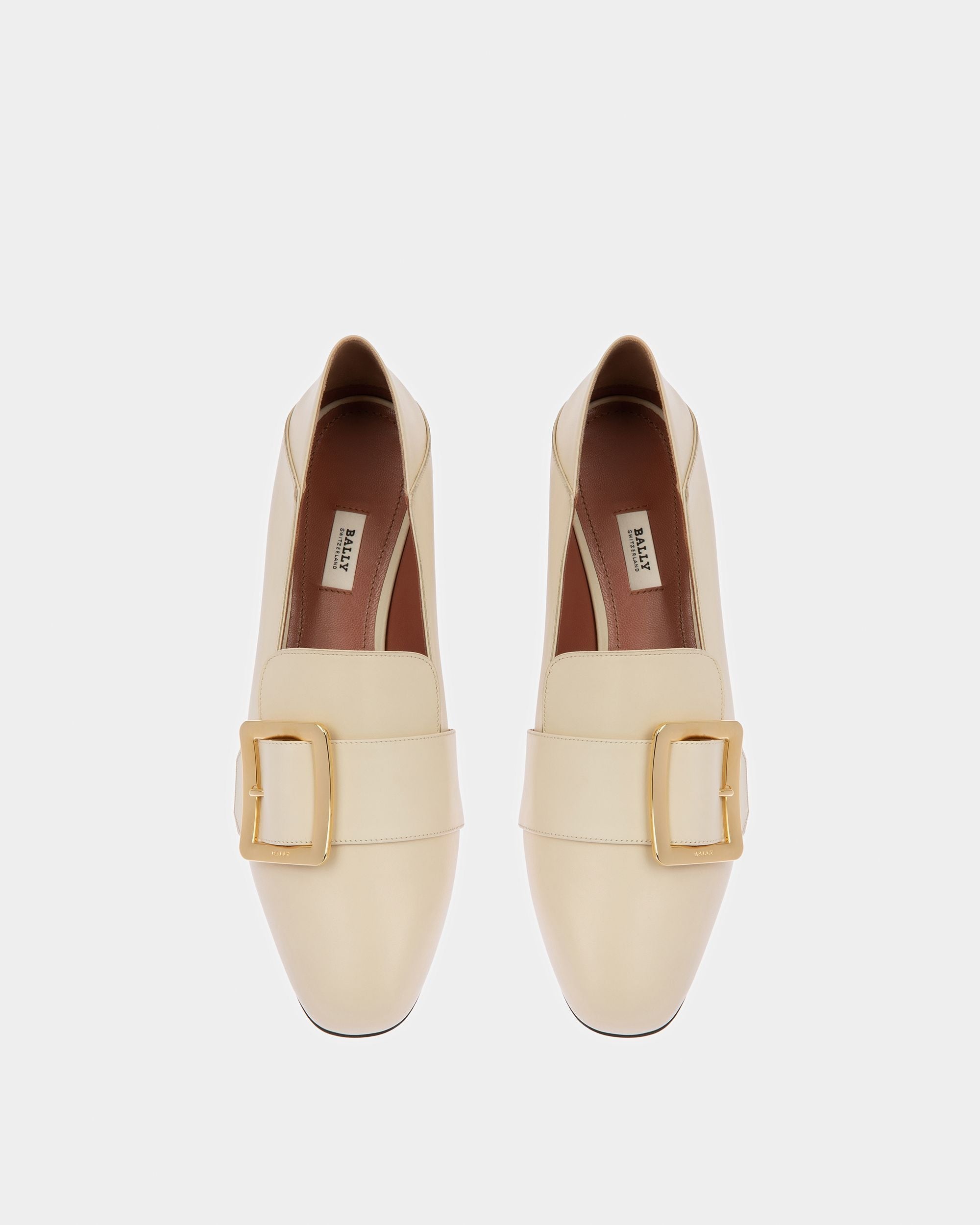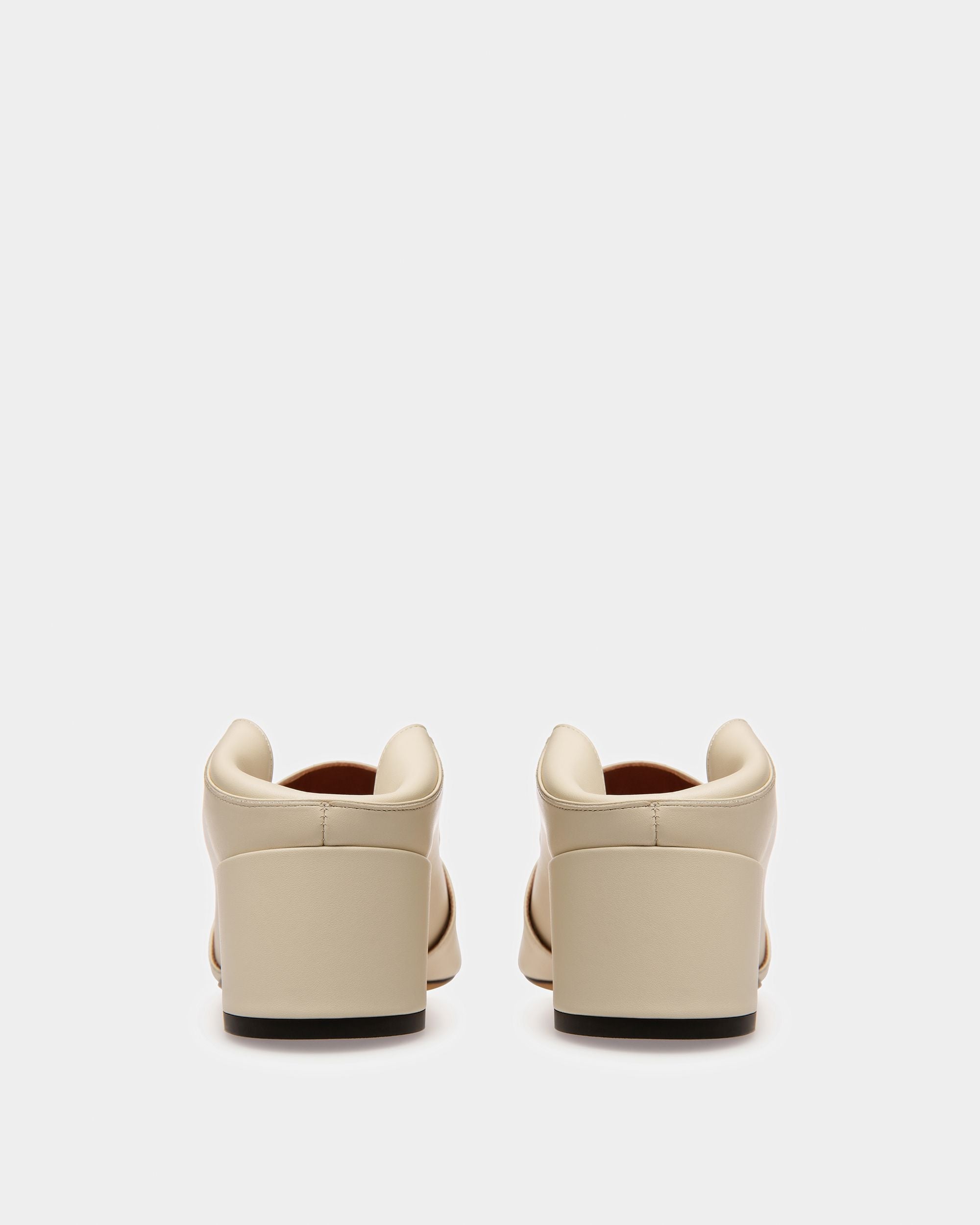 The classic Janelle pump in bone-colored leather features a babouche construction. allowing this style to be worn as both a pump and a mule. A Janelle Buckle detail and block heel finish this Bally signature.
