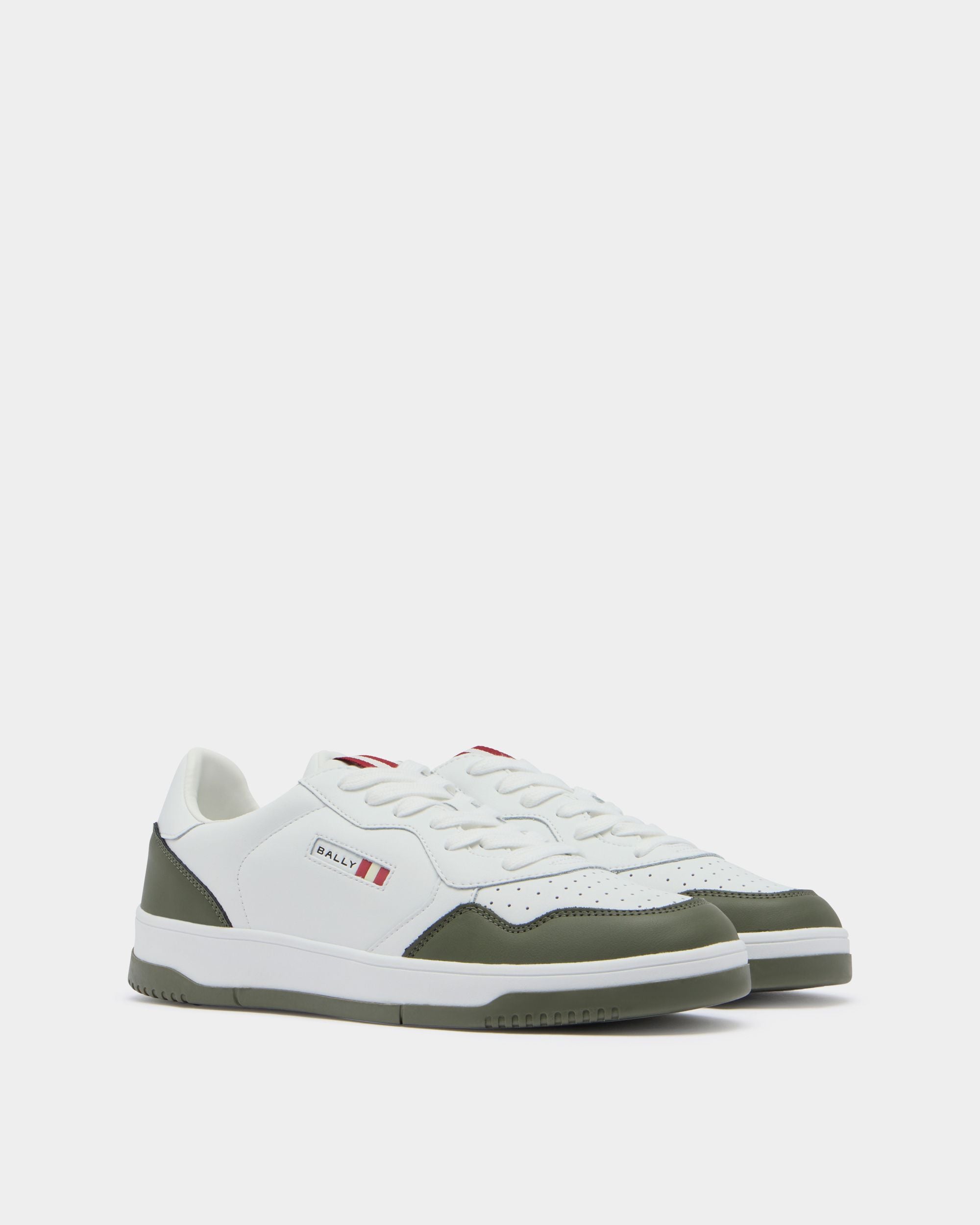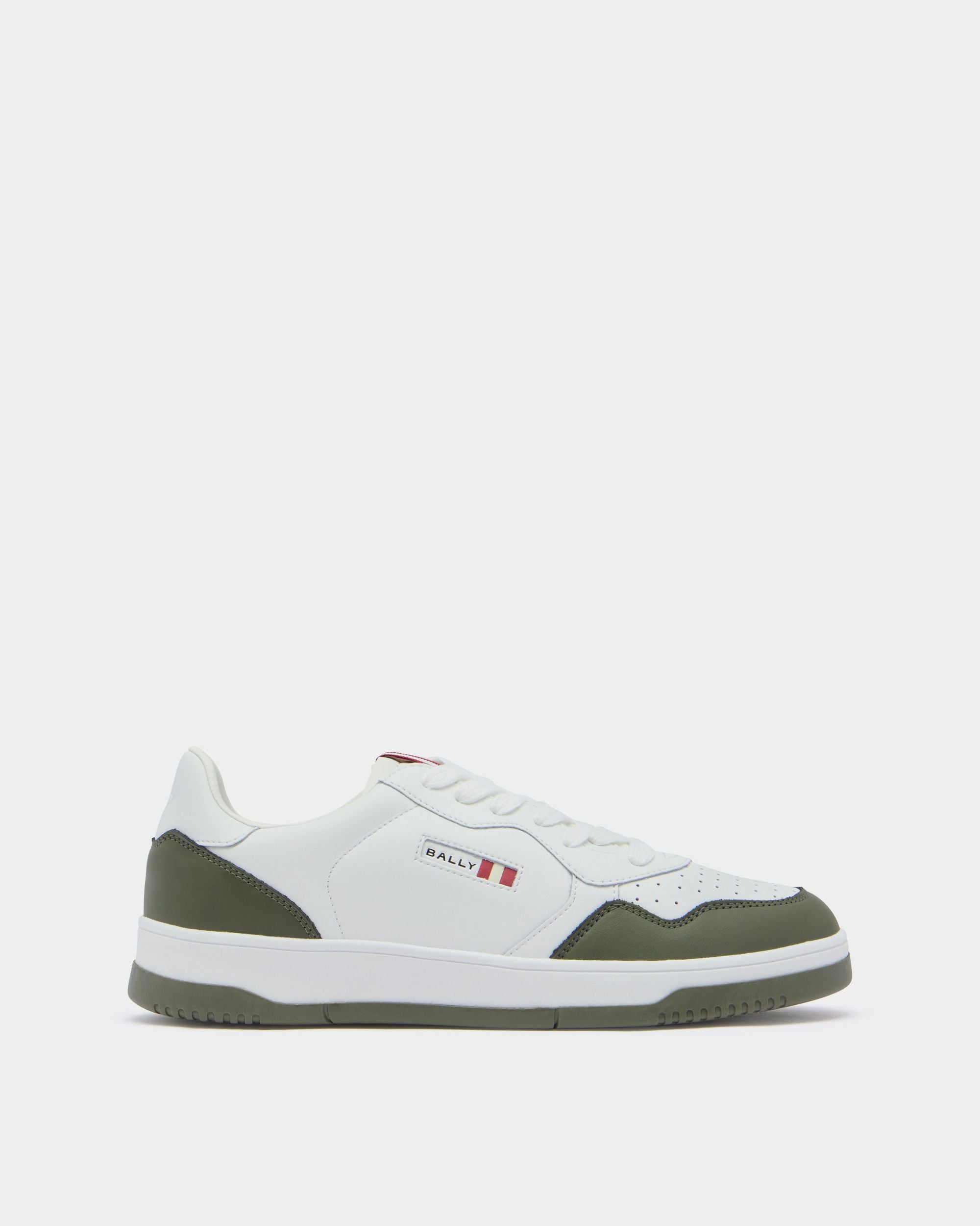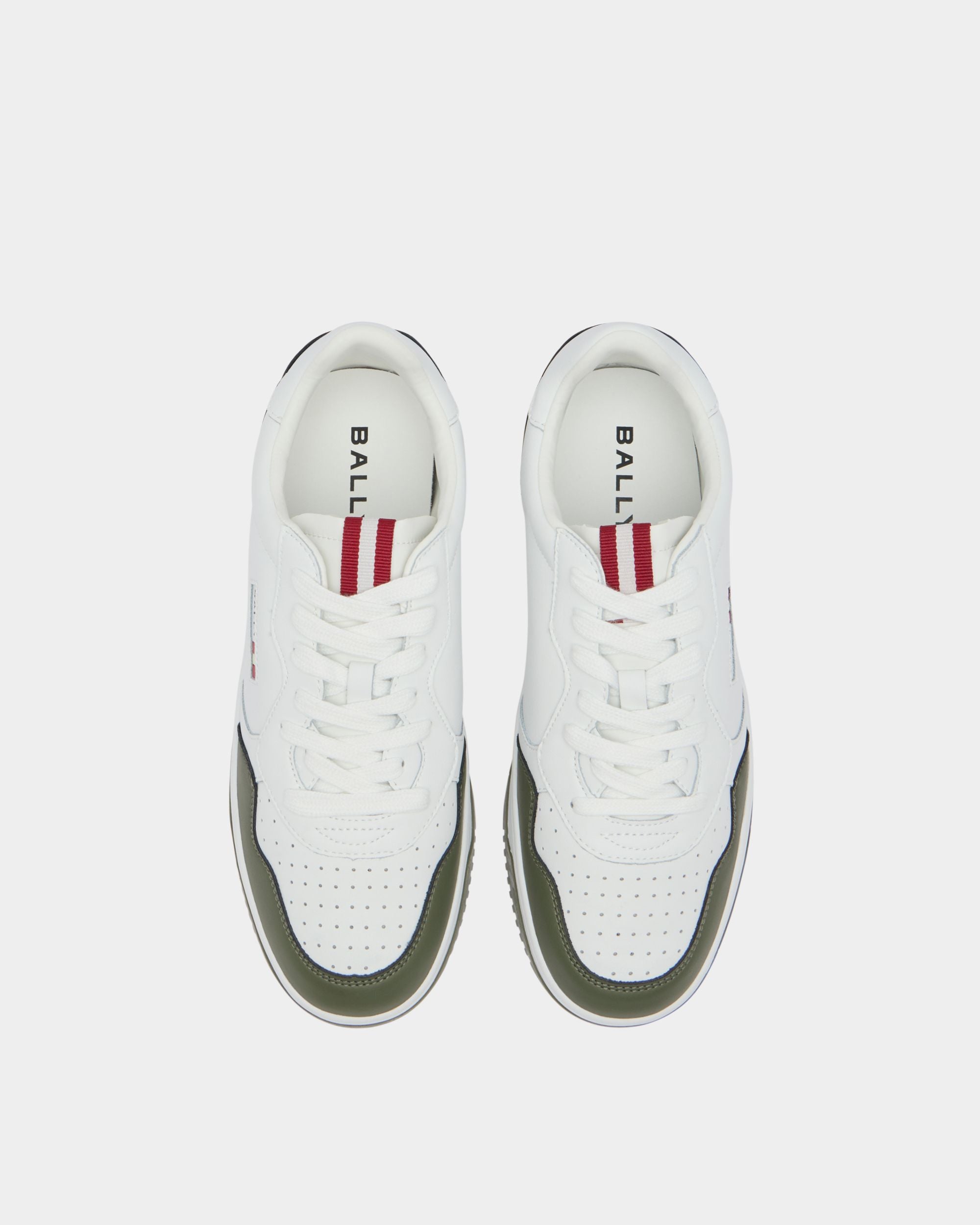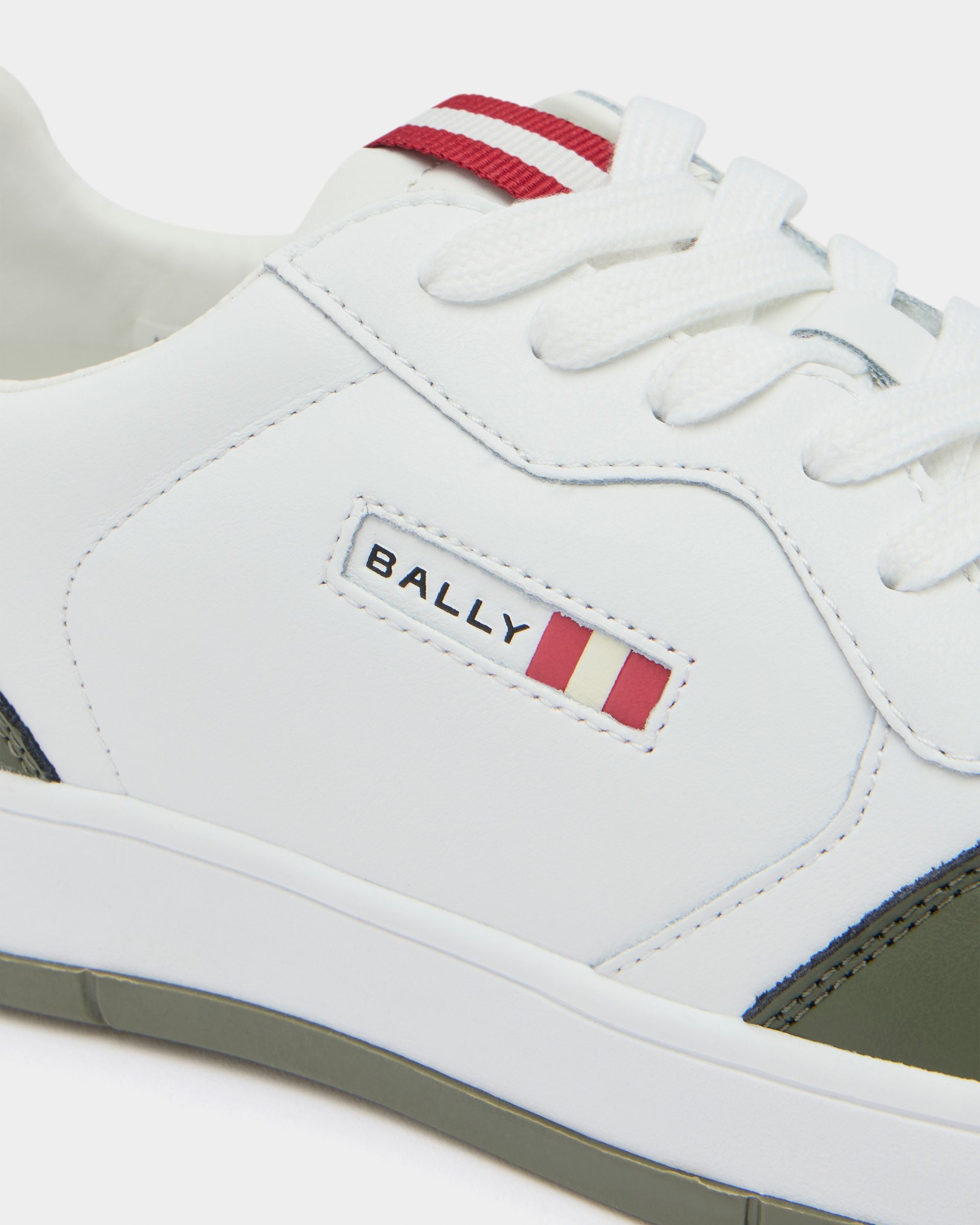 The Jasper sneaker in white leather enriches a classic tennis style with green leather accents on the toe and heel and a timeless Bally Ribbon on the tongue. The Bally logo is seen to the side.