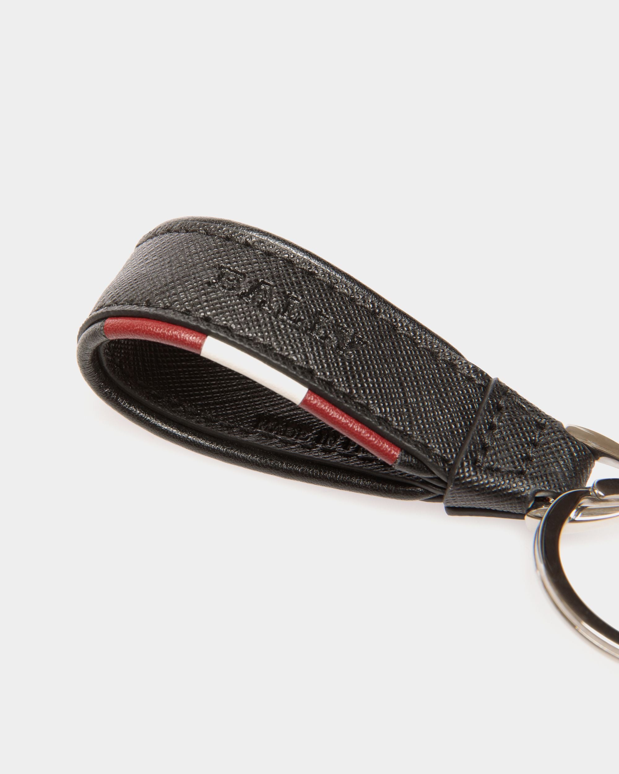 This keyring is made from embossed leather. It is finished with a Bally ribbon detail.
