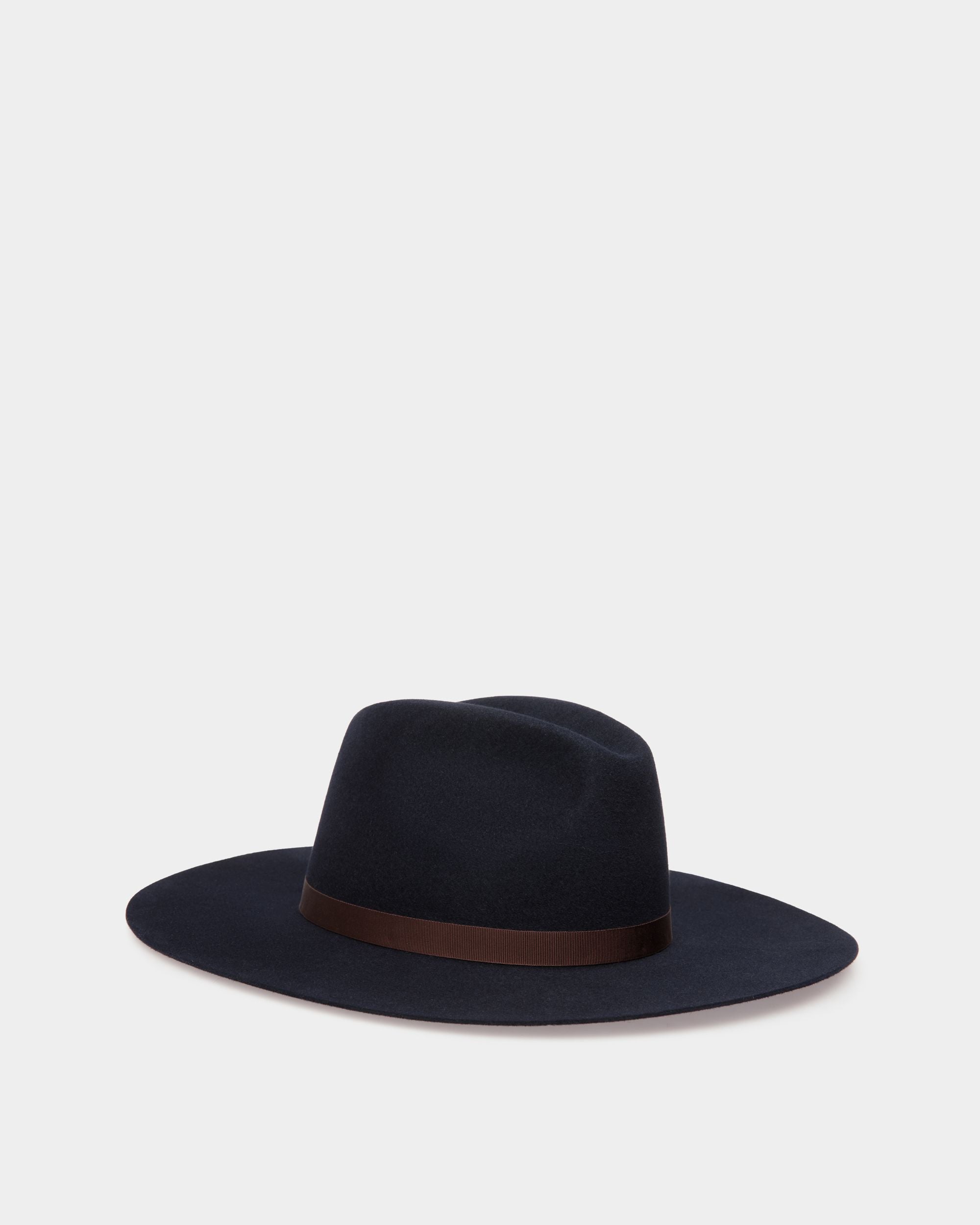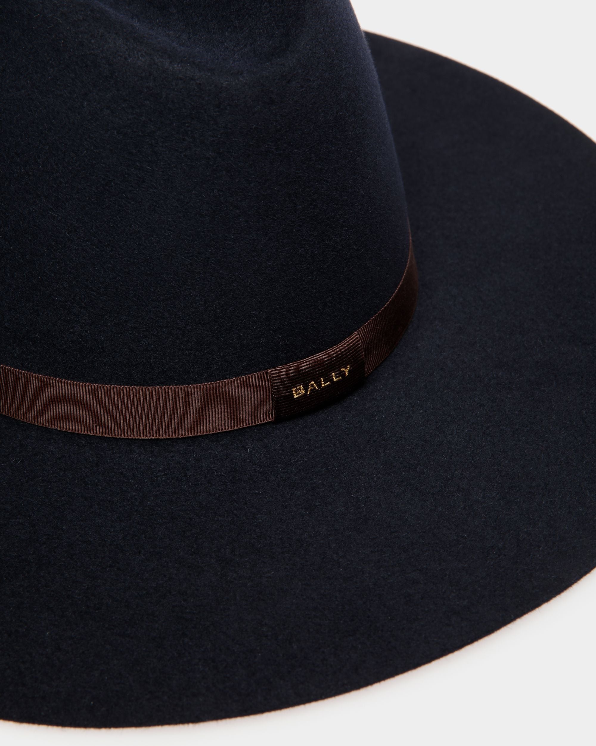 This wide-brim hat in navy blue felt is embellished by a burgundy grosgrain band with golden-yellow Bally embroidery on the bow.