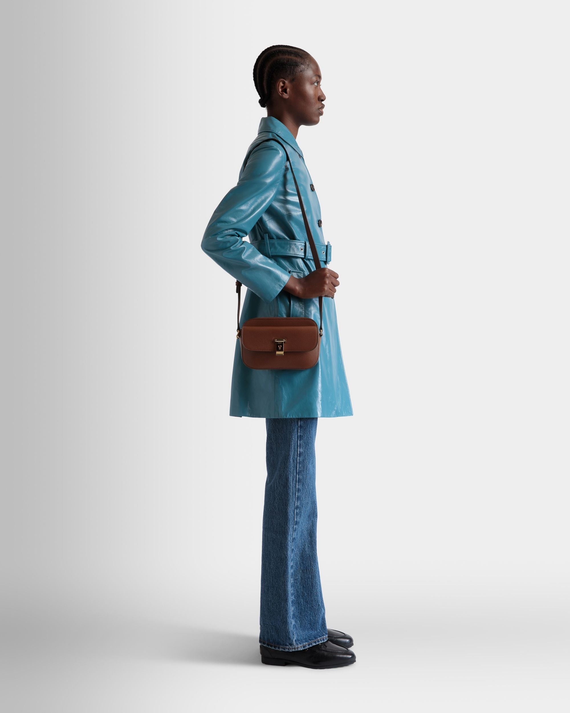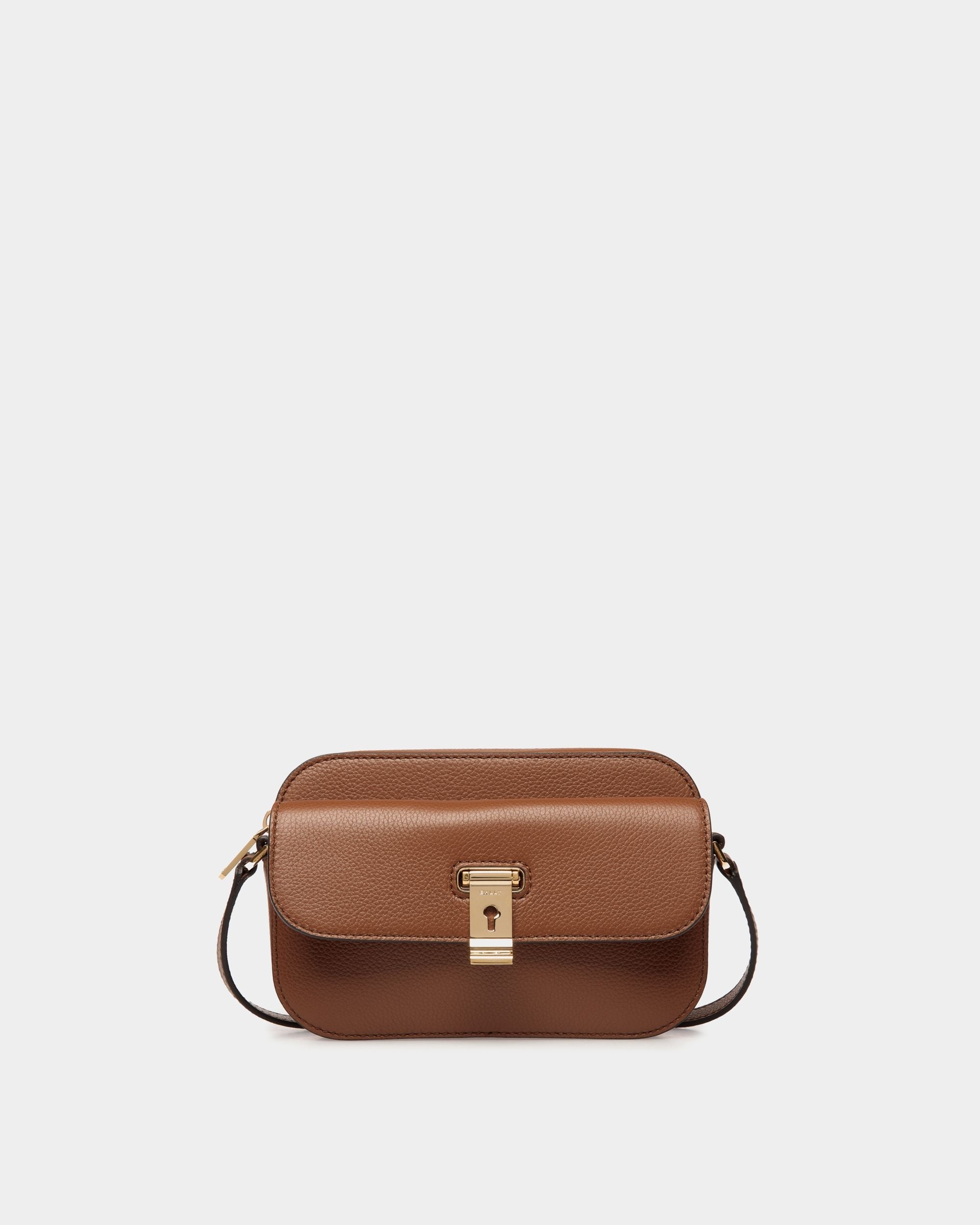 This Lock Me small crossbody bag in brown grained leather is crafted into a soft rectangular silhouette and embellished by iconic Bally hardware with an engraved logo. The adjustable strap provides a choice between cross-body or shoulder portability.