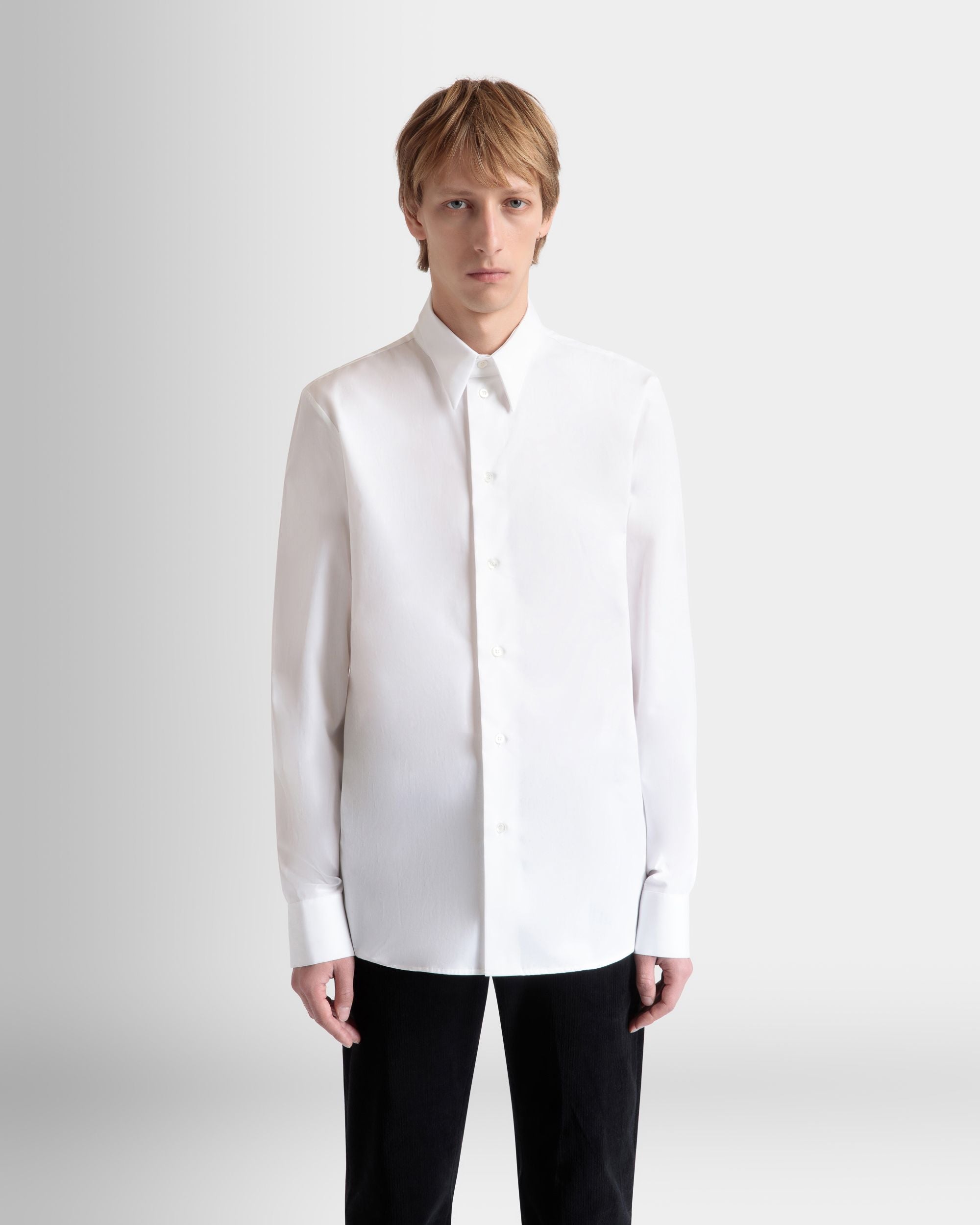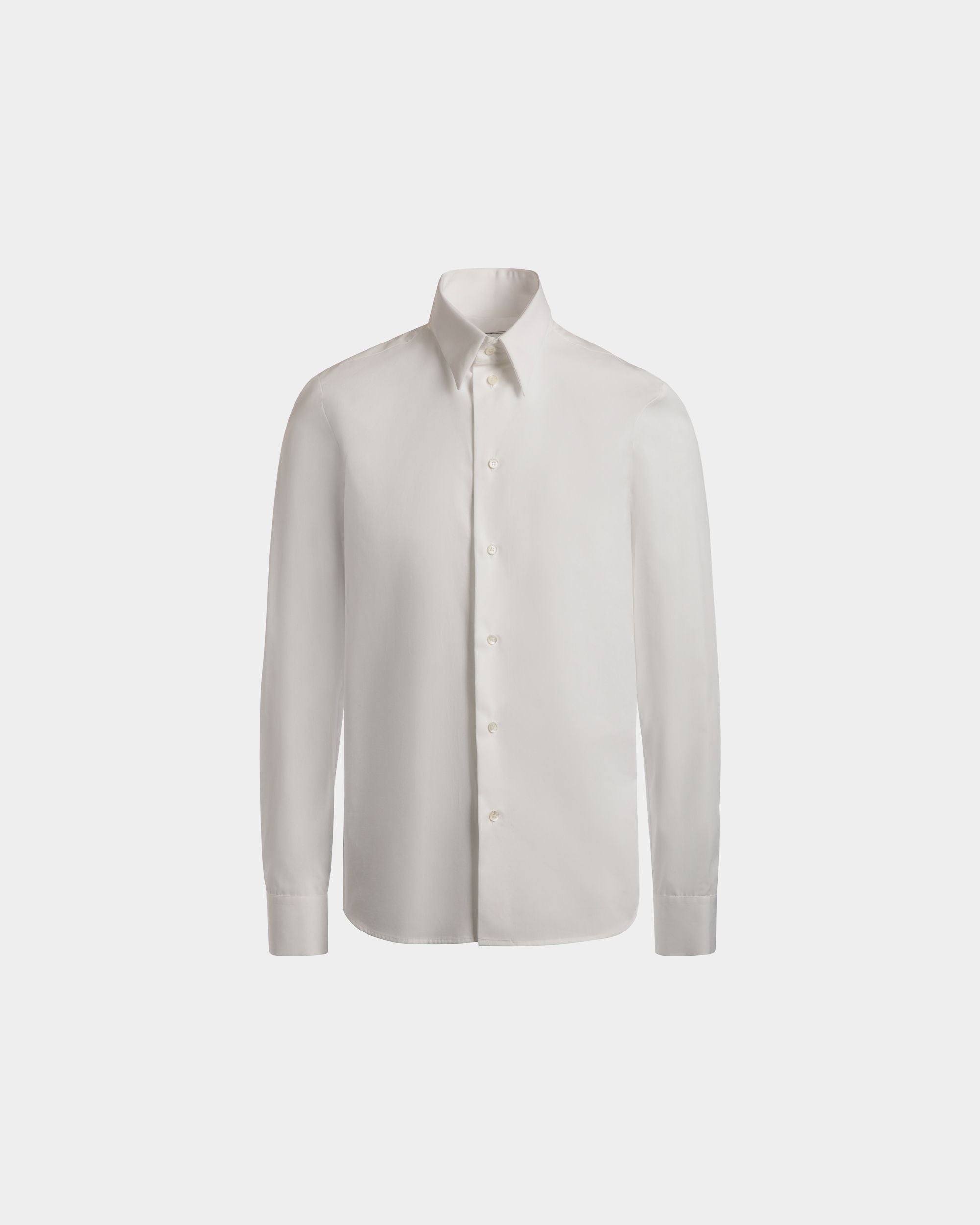This white long-sleeve shirt is in fine woven cotton with seven mother-of-pearl buttons at the front.