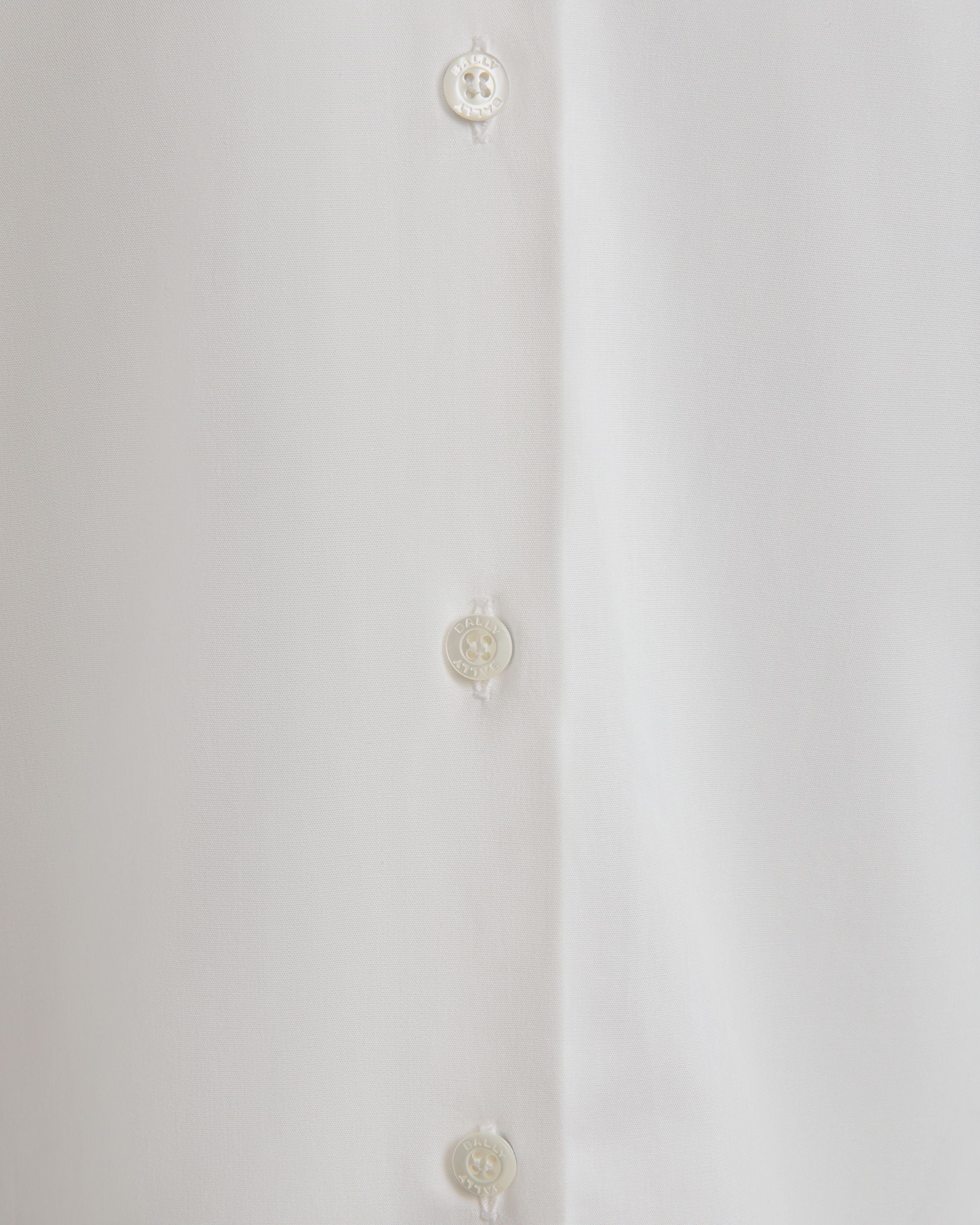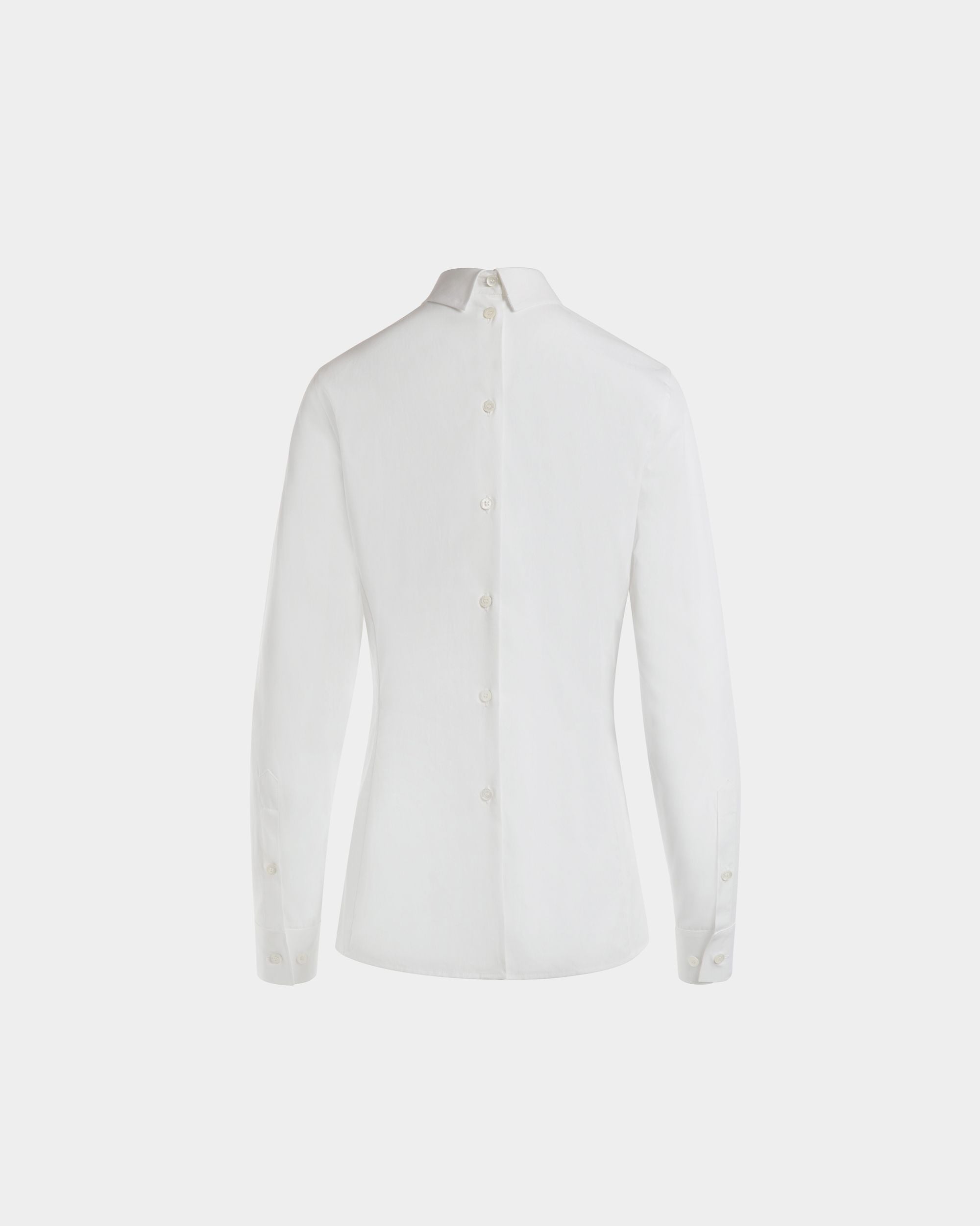 This long-sleeve shirt in white cotton has a clean. essential front. a waisted silhouette and a button placket at the back.