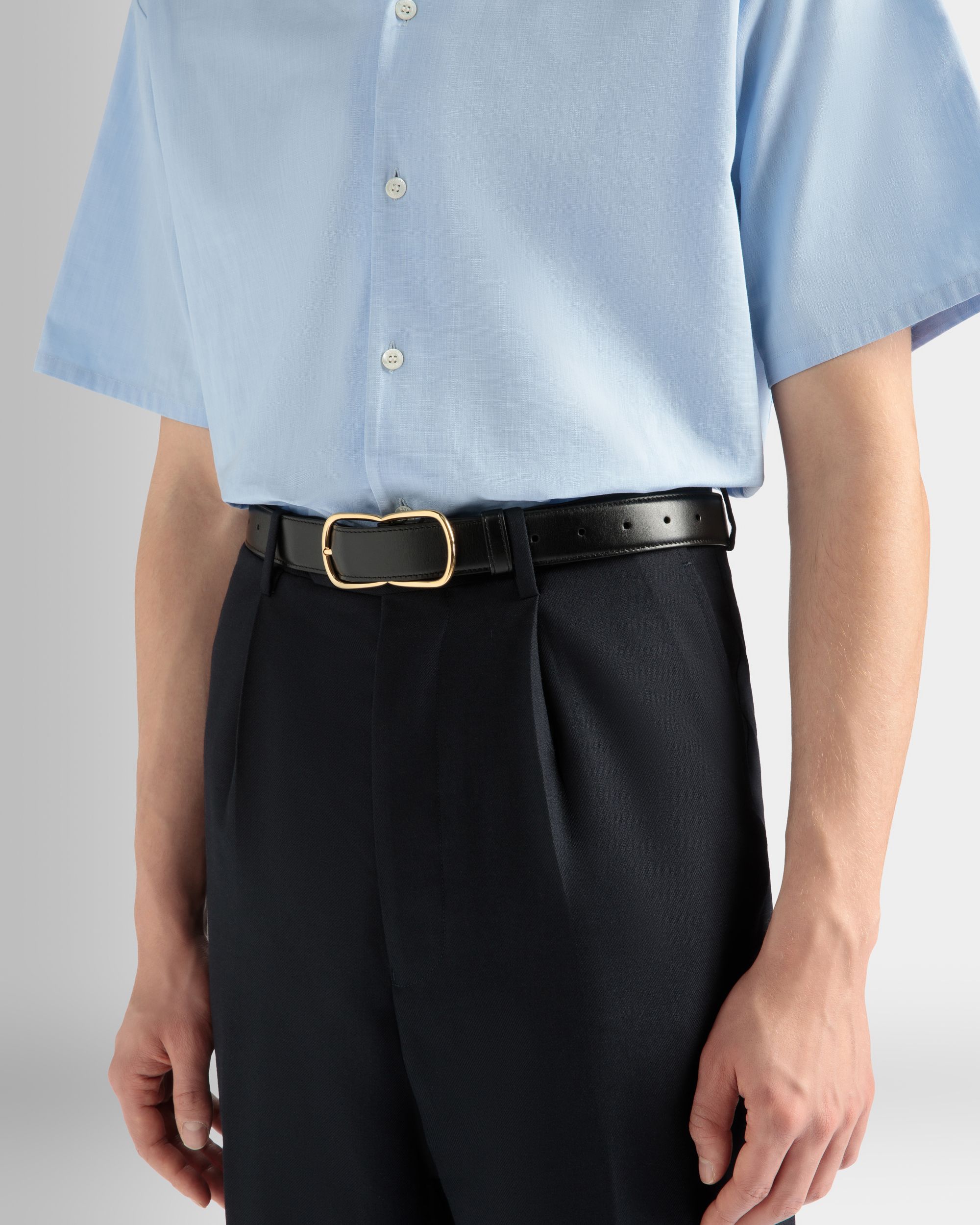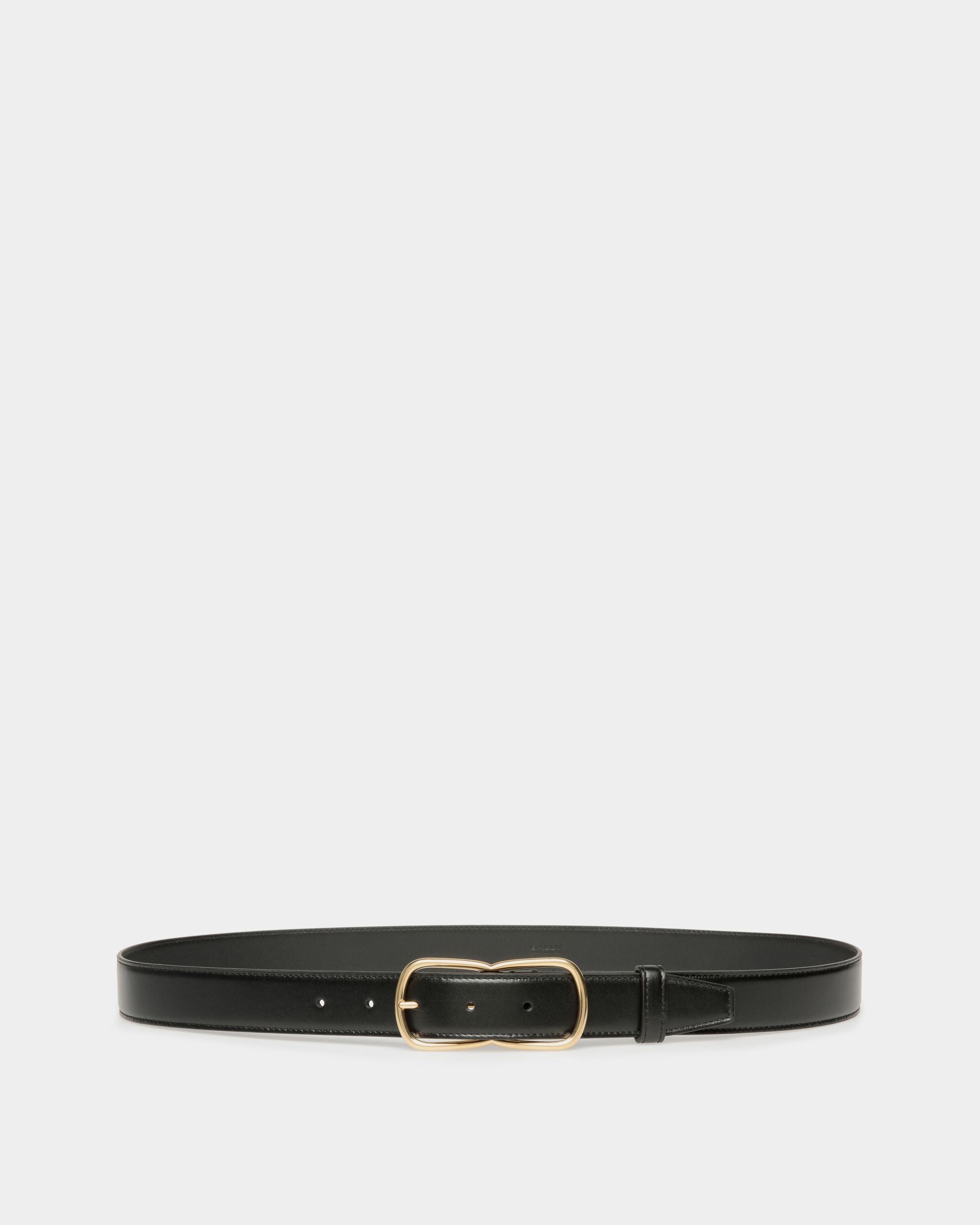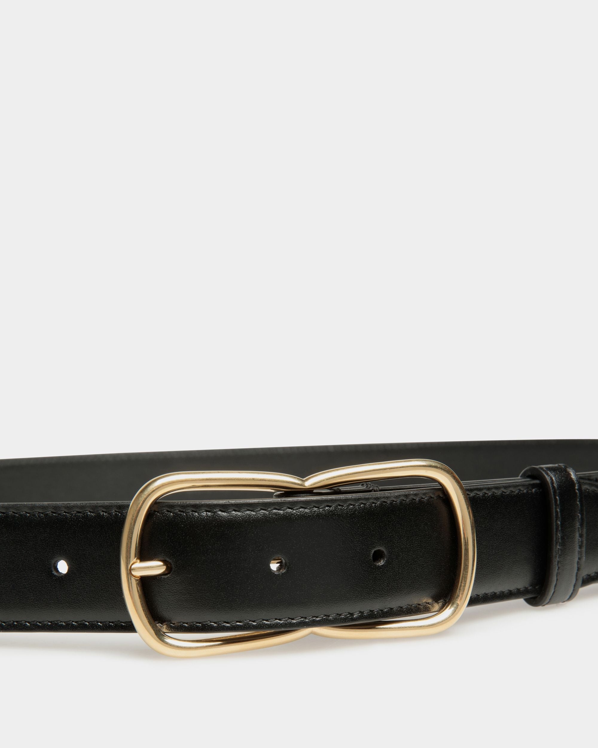 The Loto 30mm belt in black calfskin features a slender figure-eight buckle in gold-tone metal to the front. On-tone stitching runs along the edges.