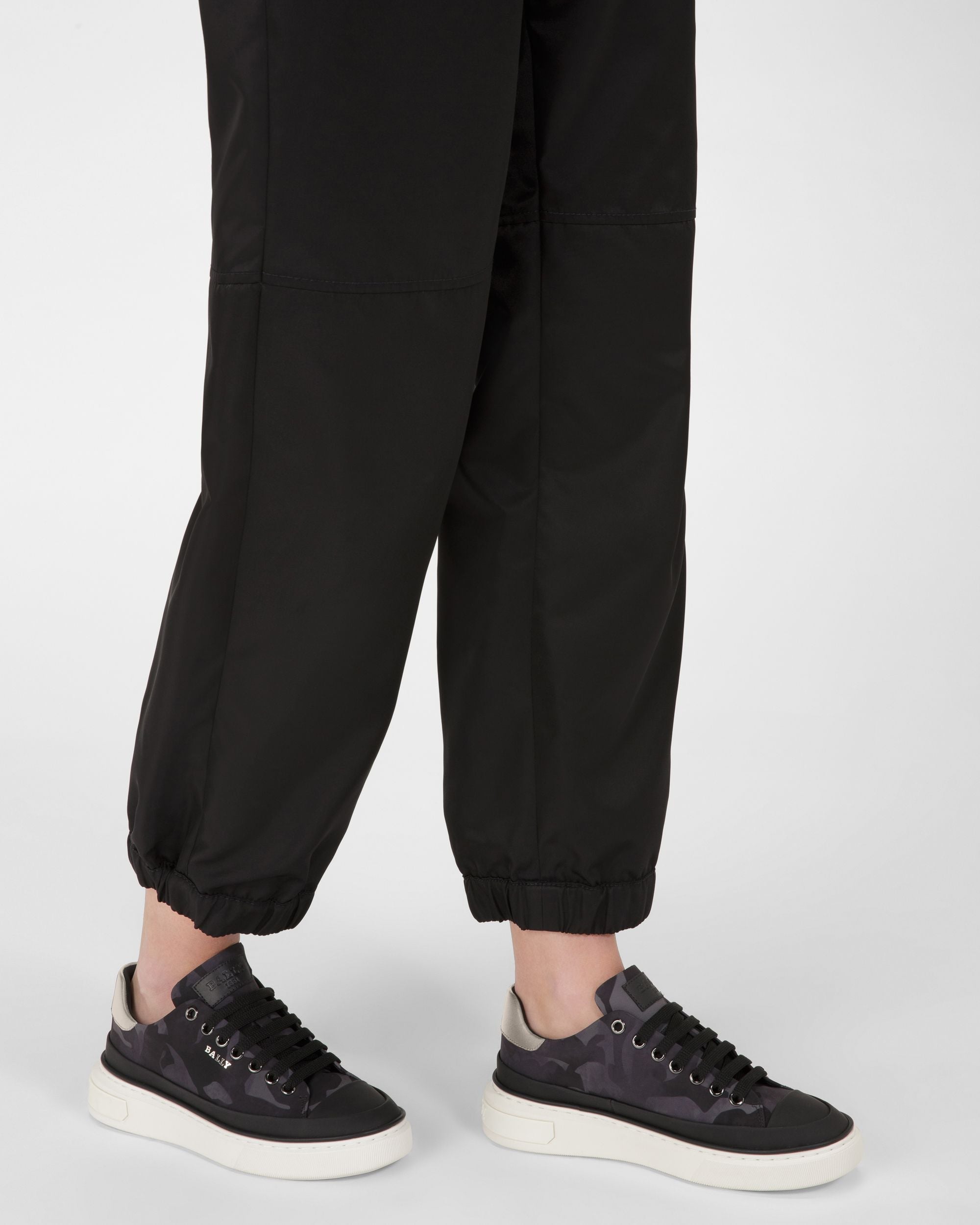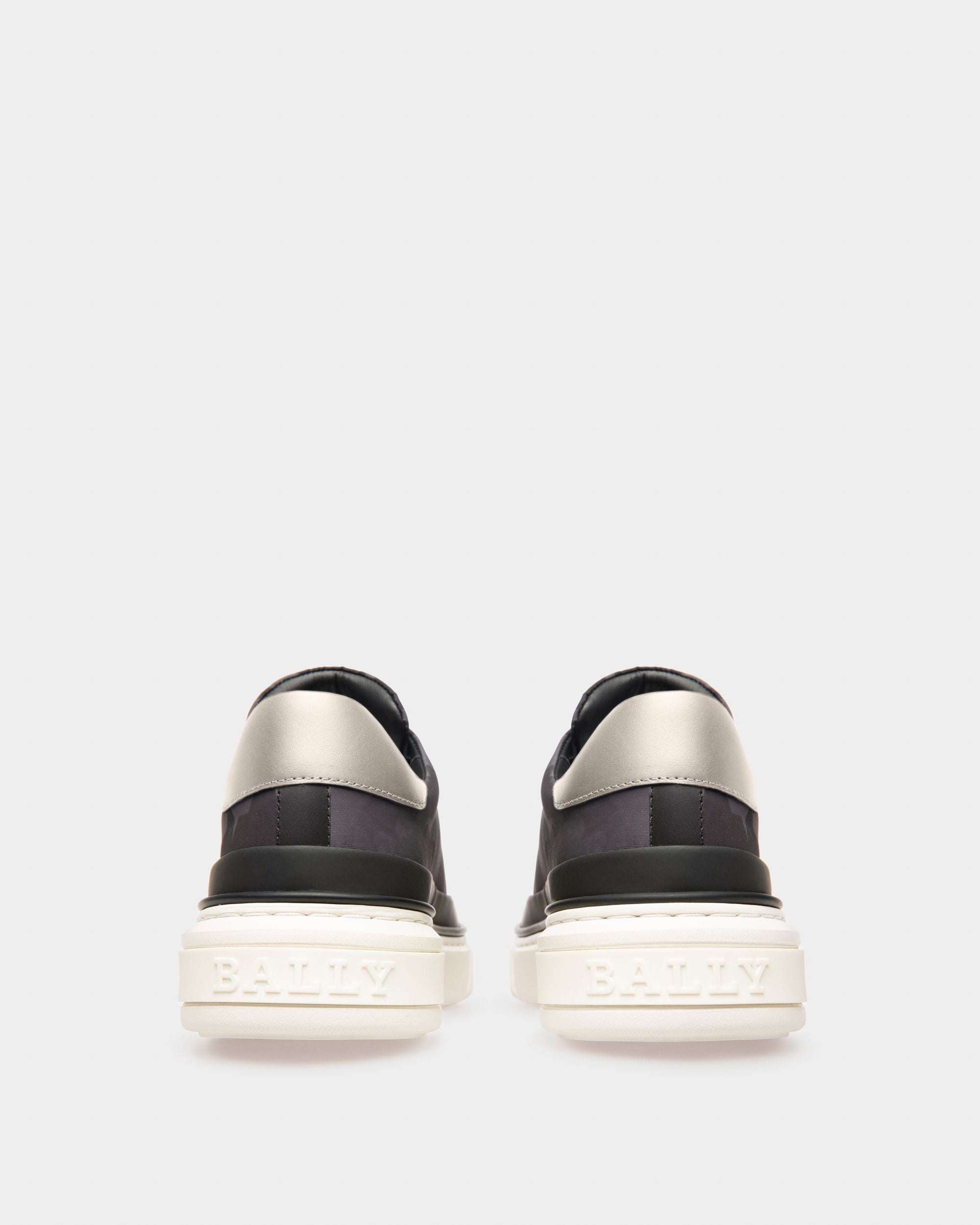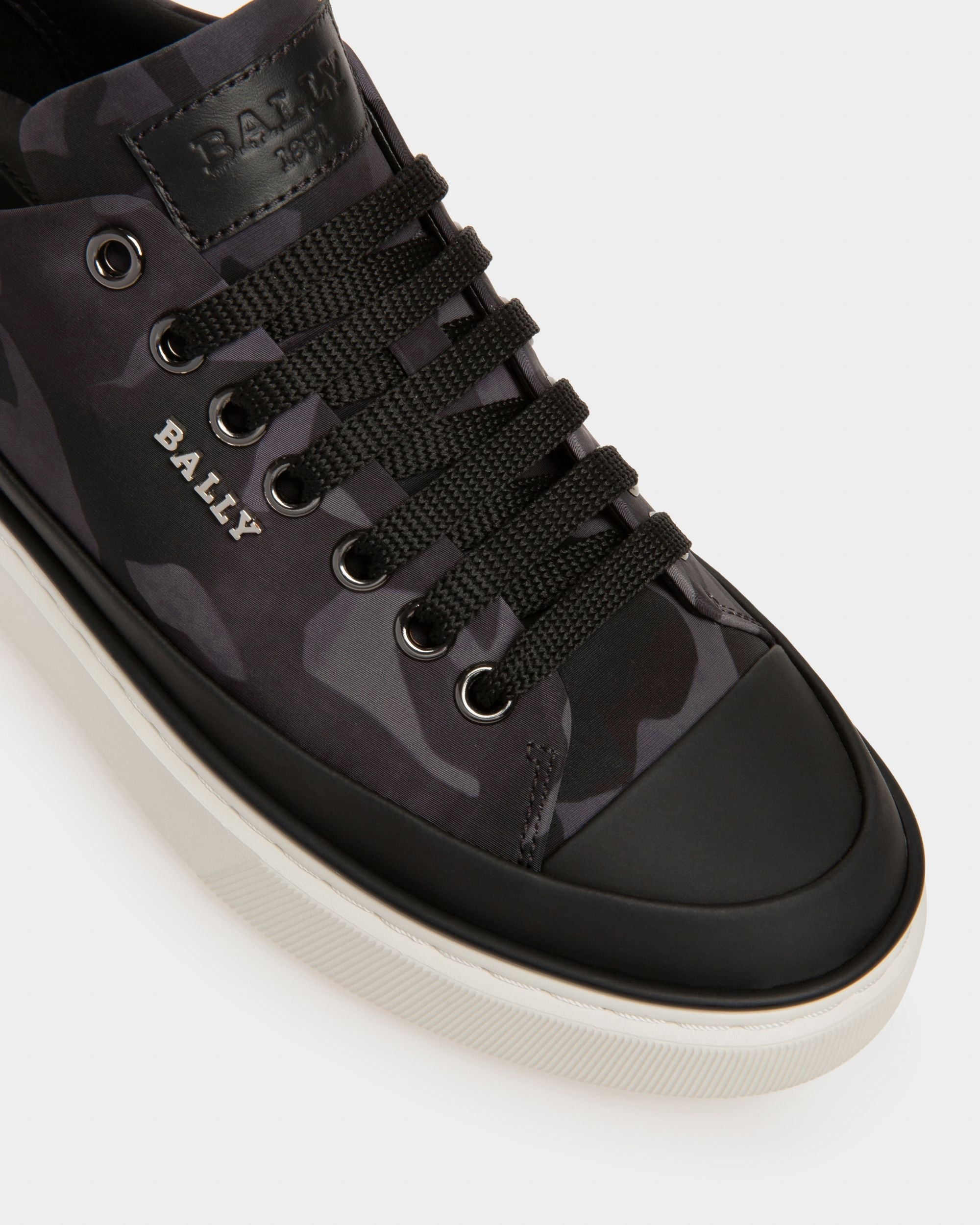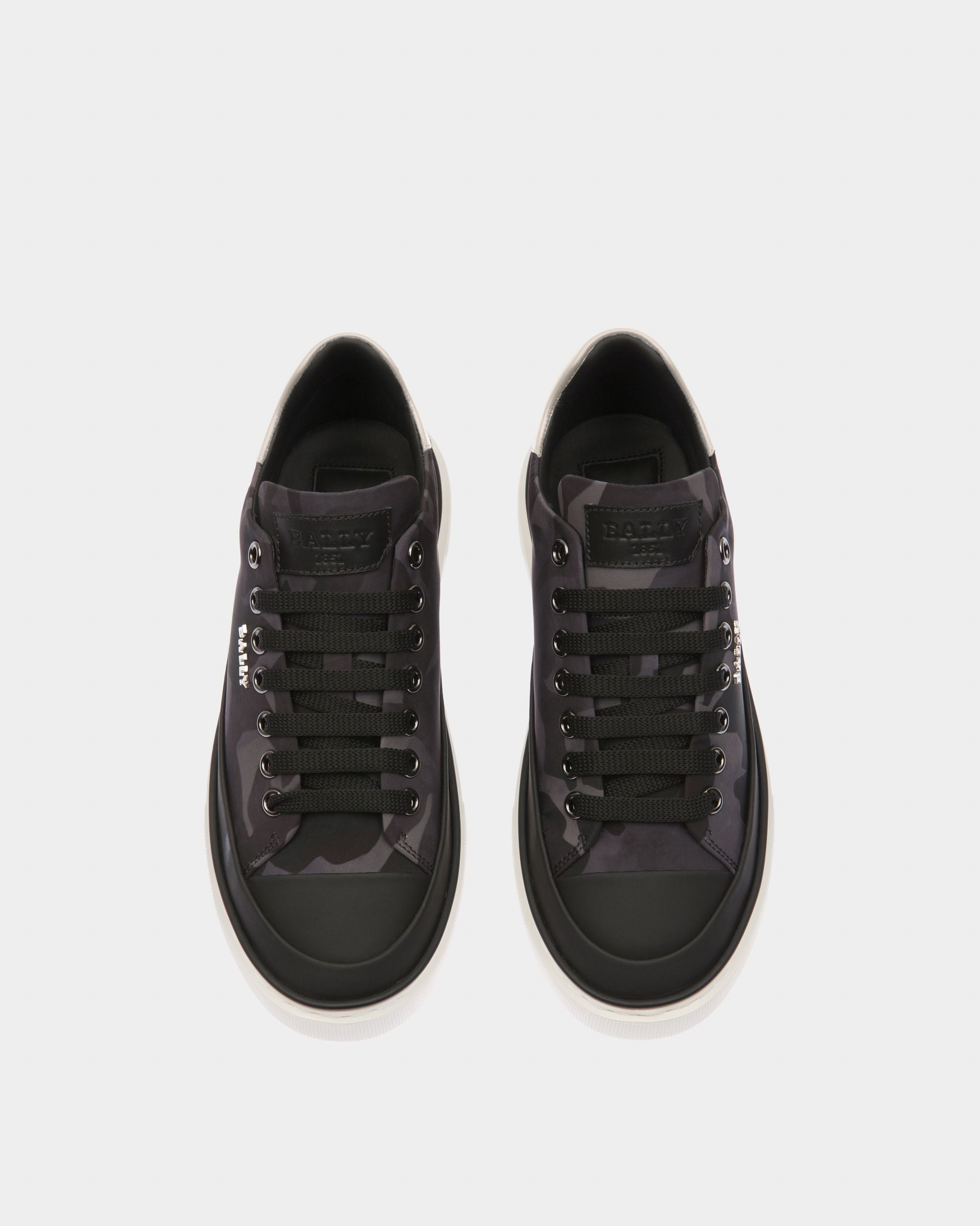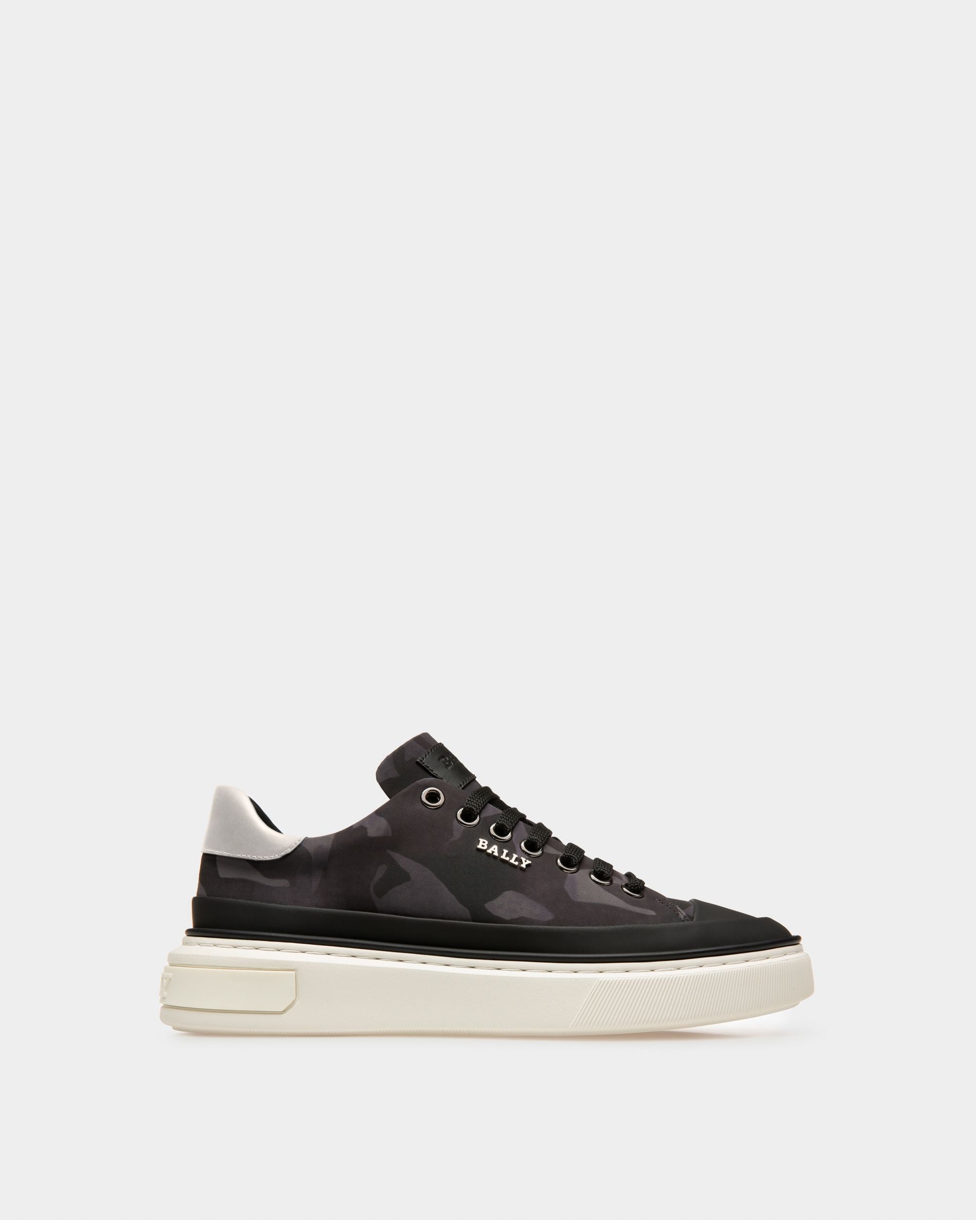 Featuring minimalistic silhouettes. styles from the Bally Lift range make a contemporary statement thanks to their high raised soles. Crafted from recycled polyester adorned in a camouflage pattern and black leather. the Maily is an effortless lace-up sneaker elevated by a grey leather panel on the heel and shiny palladium hardware.