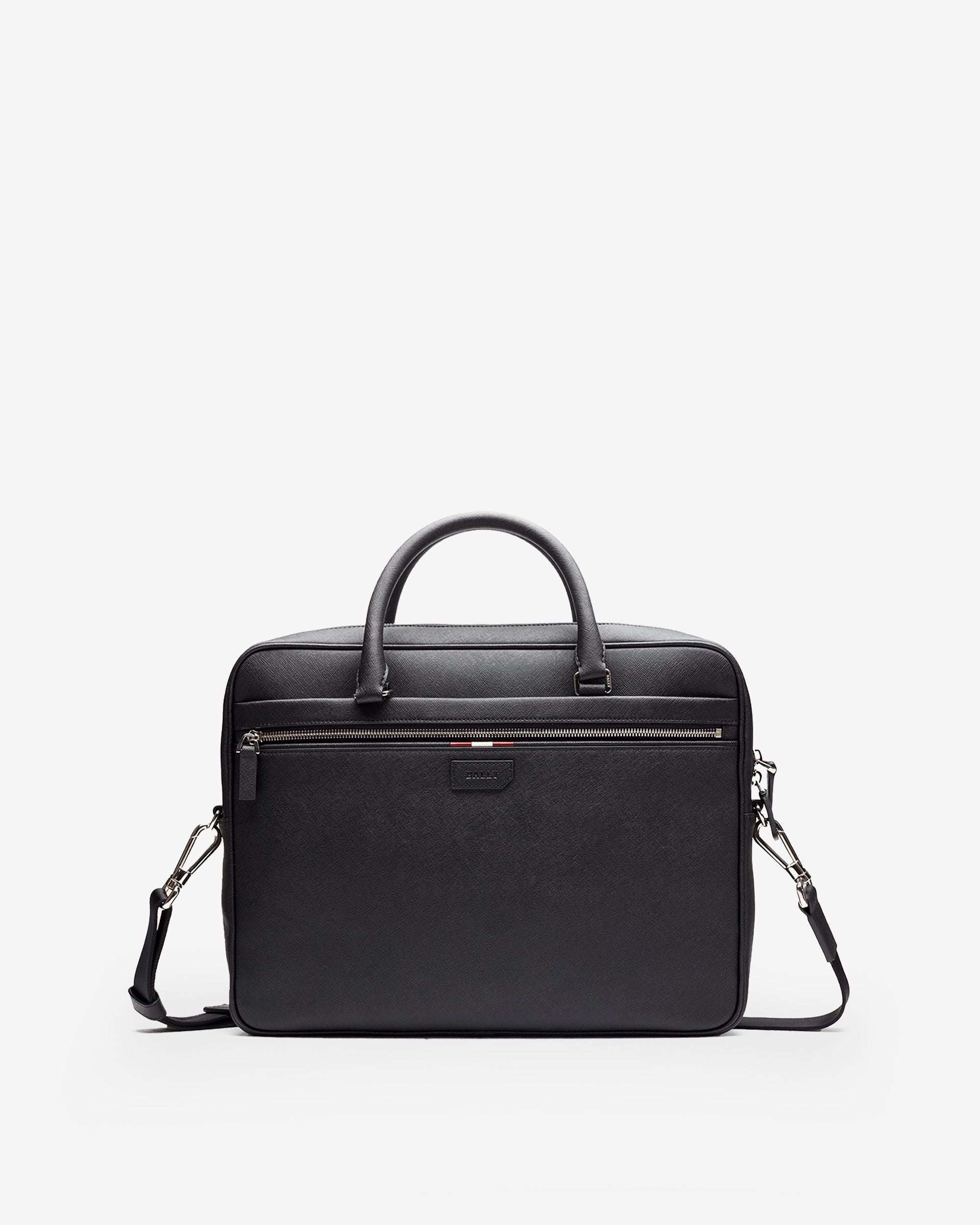 Crafted from black leather. the Pauly briefcase can be carried by hand thanks to double top handles or over the shoulder via a detachable and adjustable strap. A rear trolley sleeve allows it to be placed over the handle of an airport carry-on trolley bag for easy transportation.