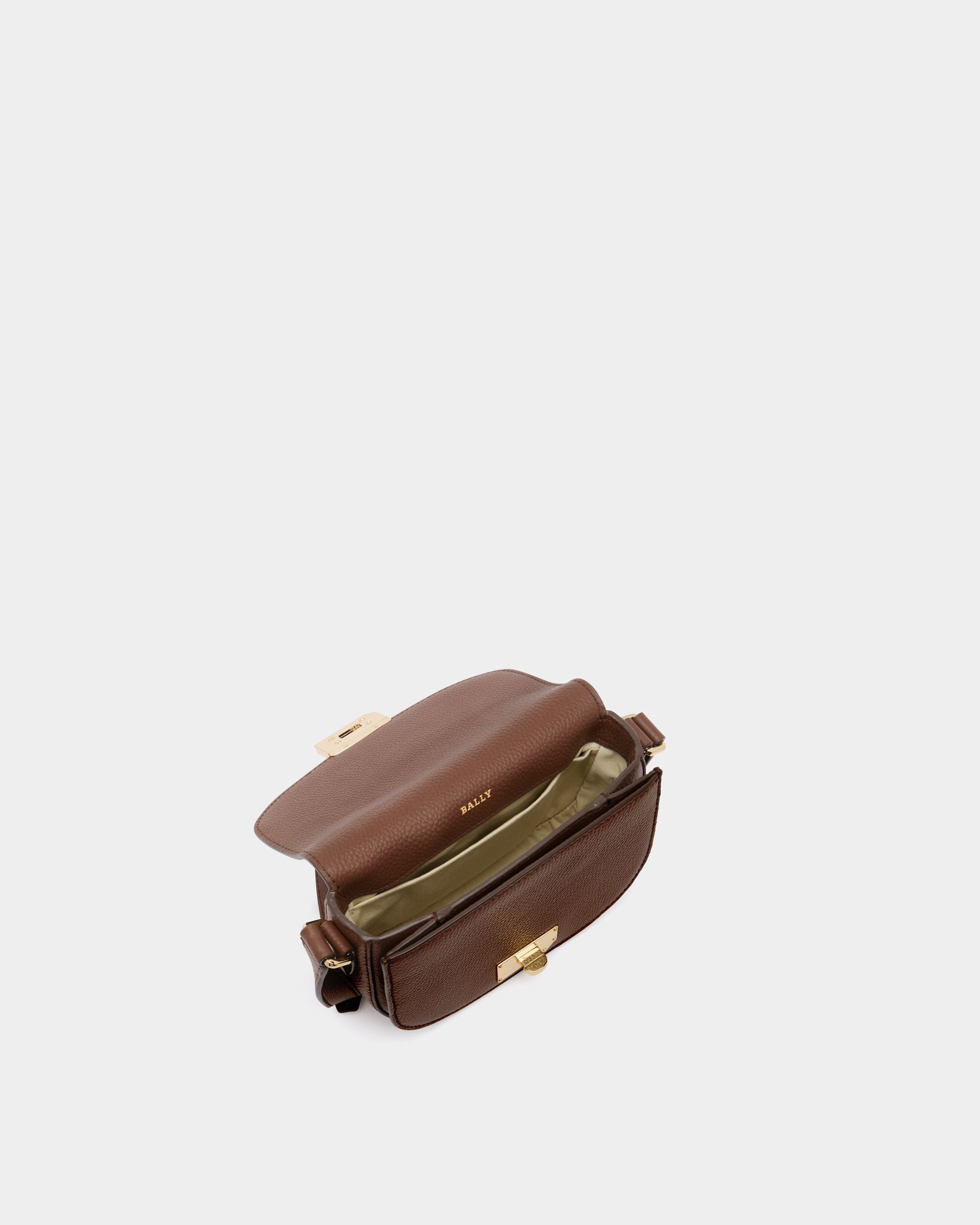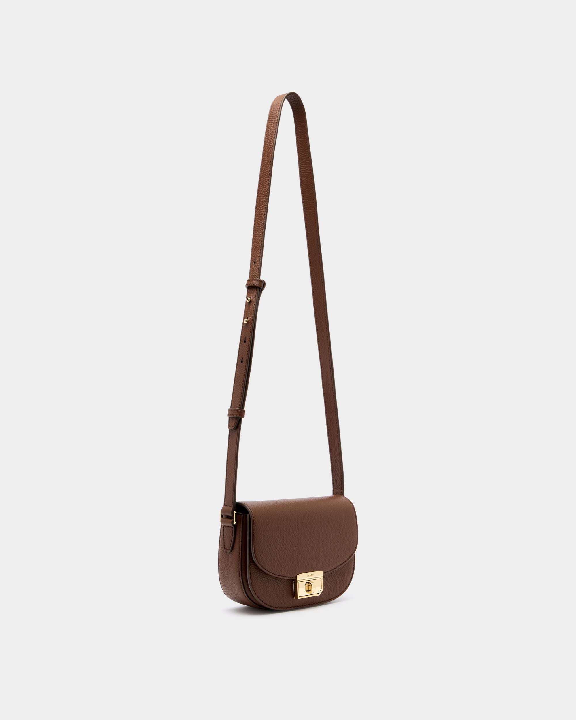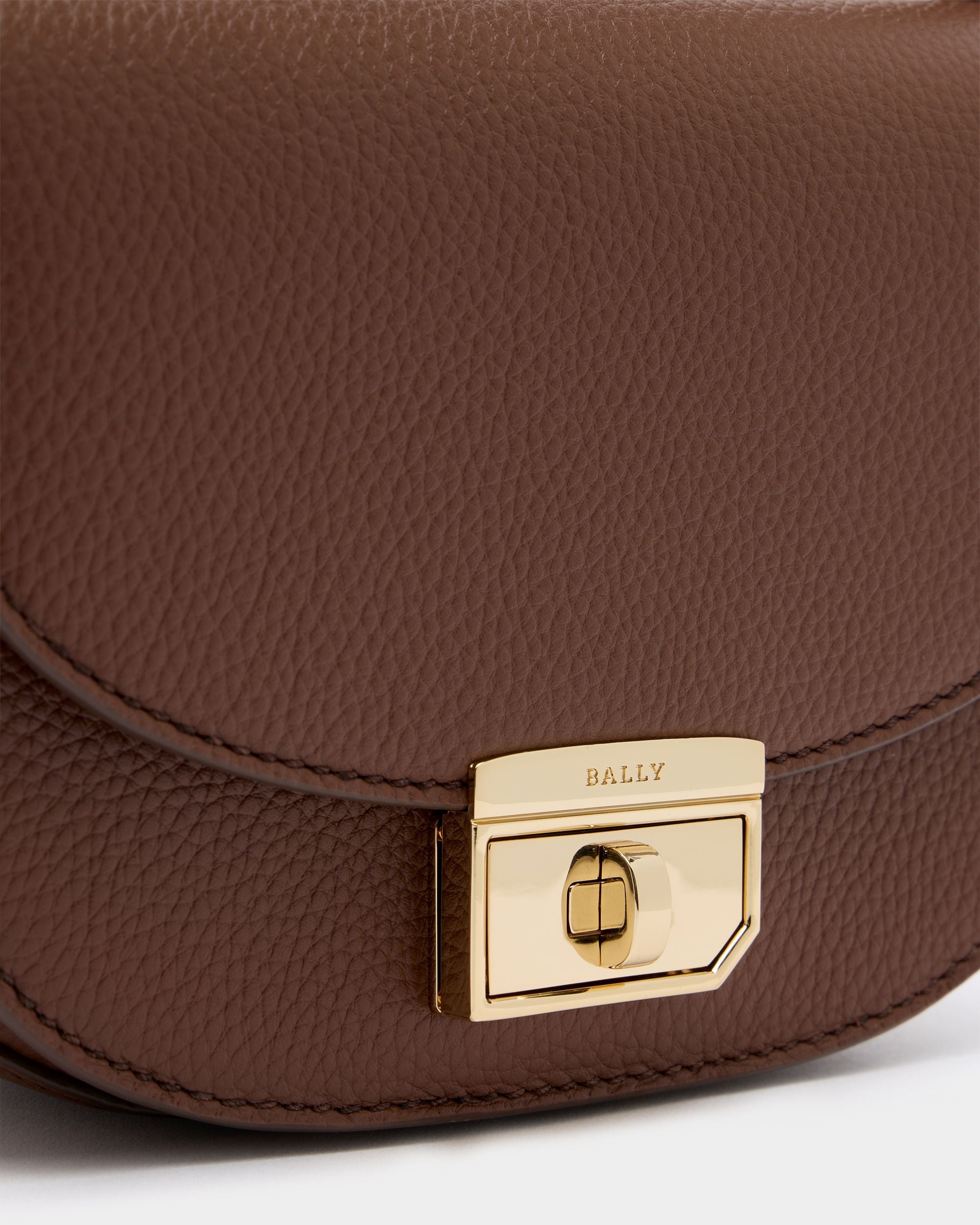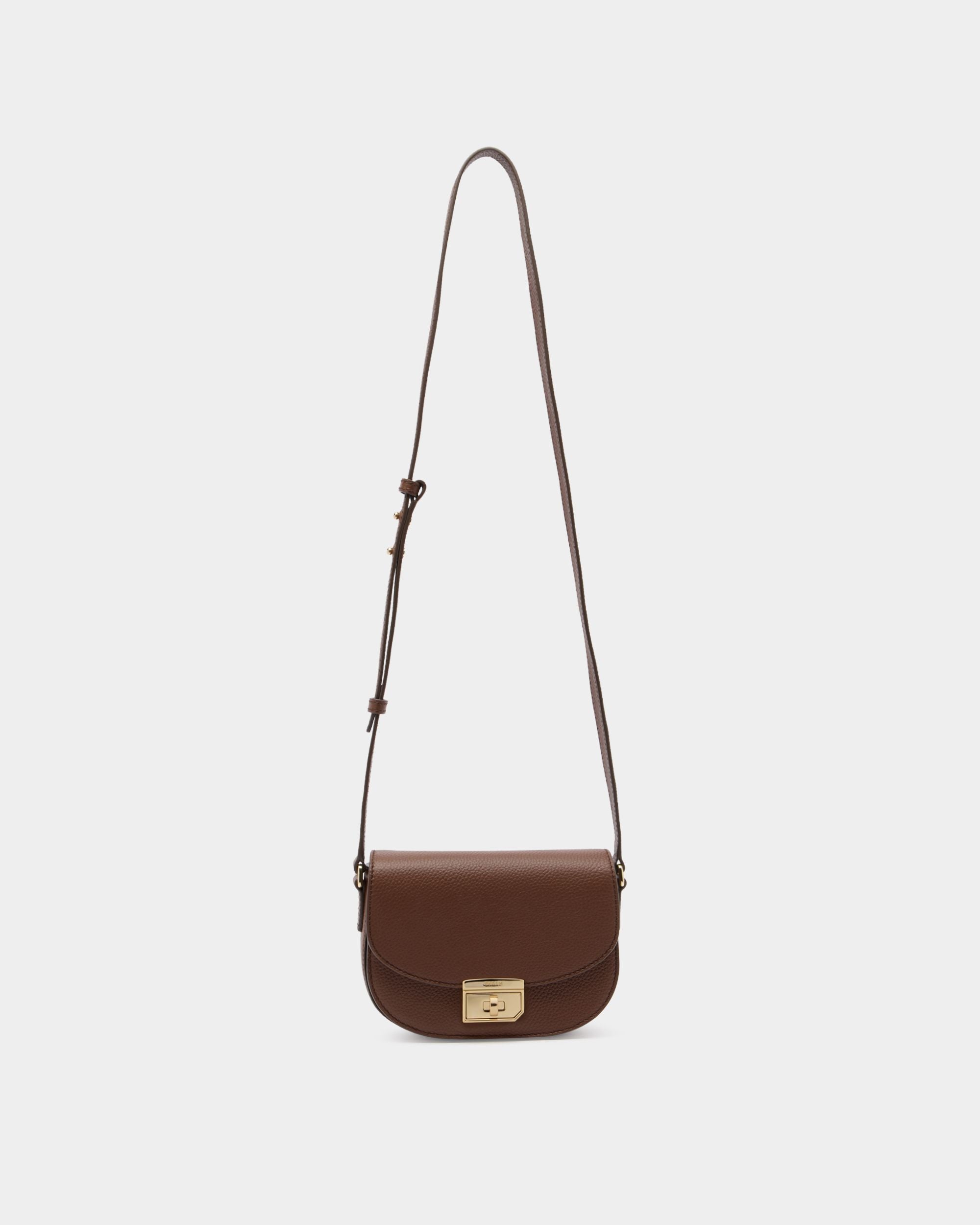 This mini bag is made from brown calfskin with a grained finish. The flap is secured via a gold-tone metal twist clasp that is engraved with the Bally logo.