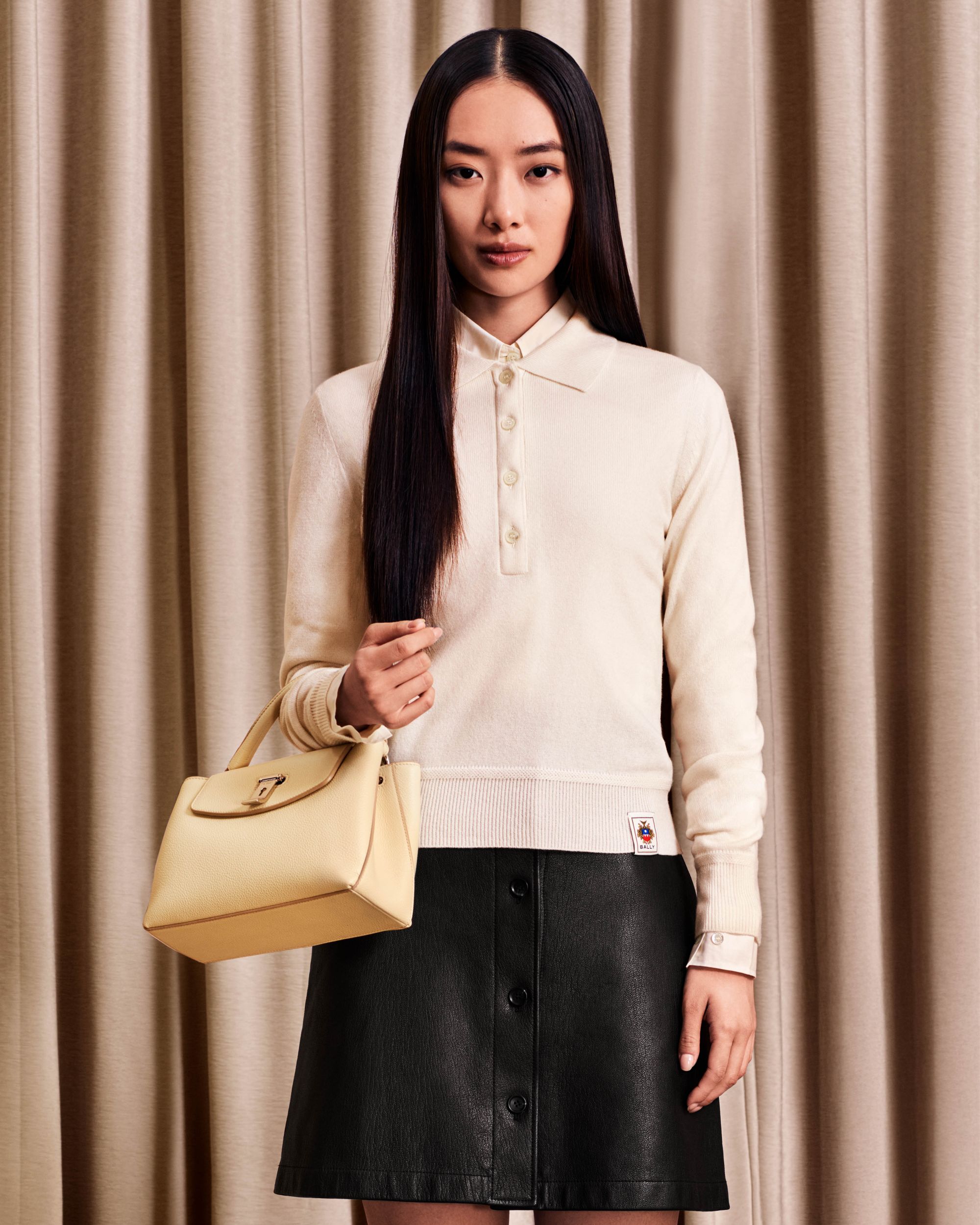 This black leather mini skirt is decorated by round horn-effect buttons to the front.