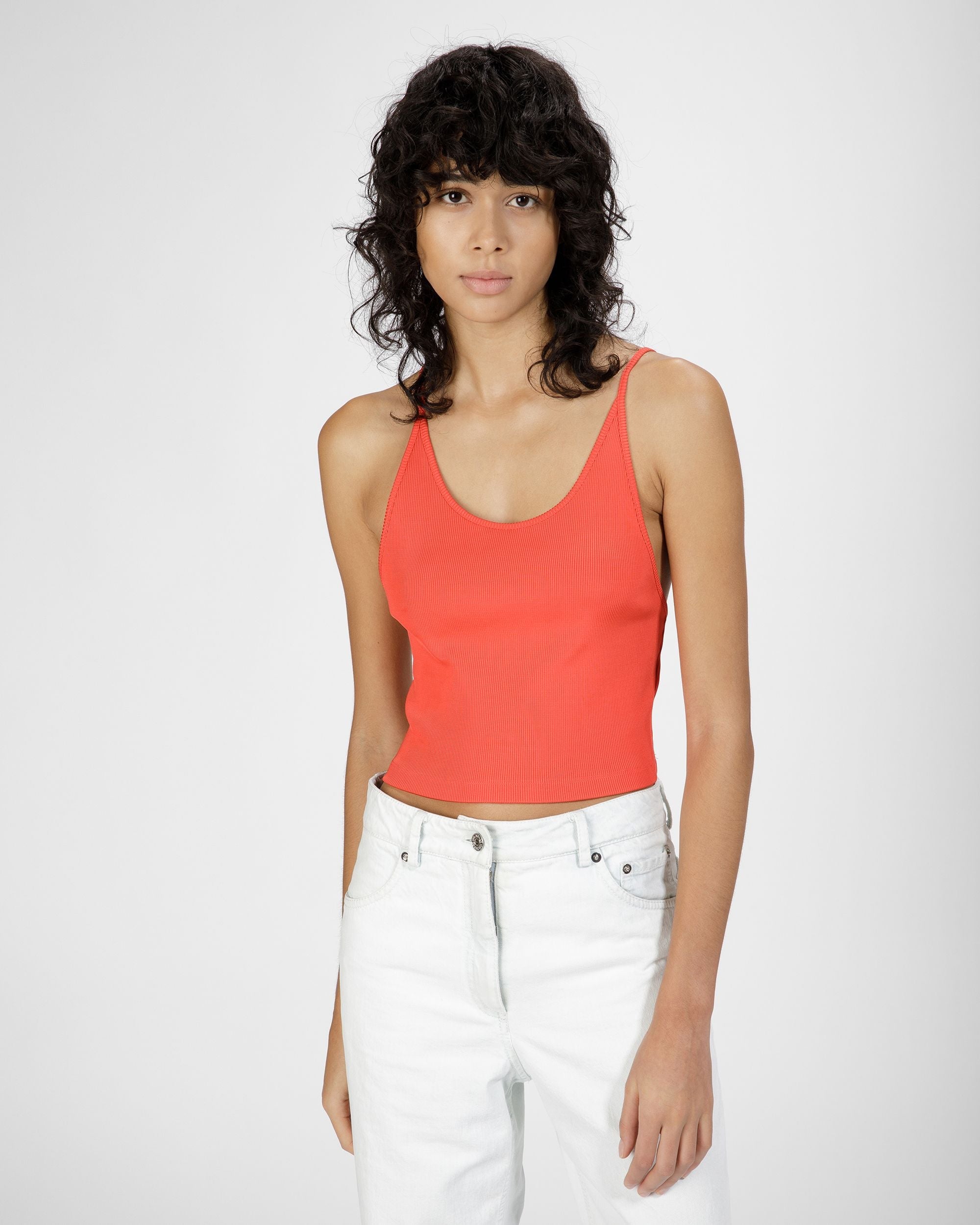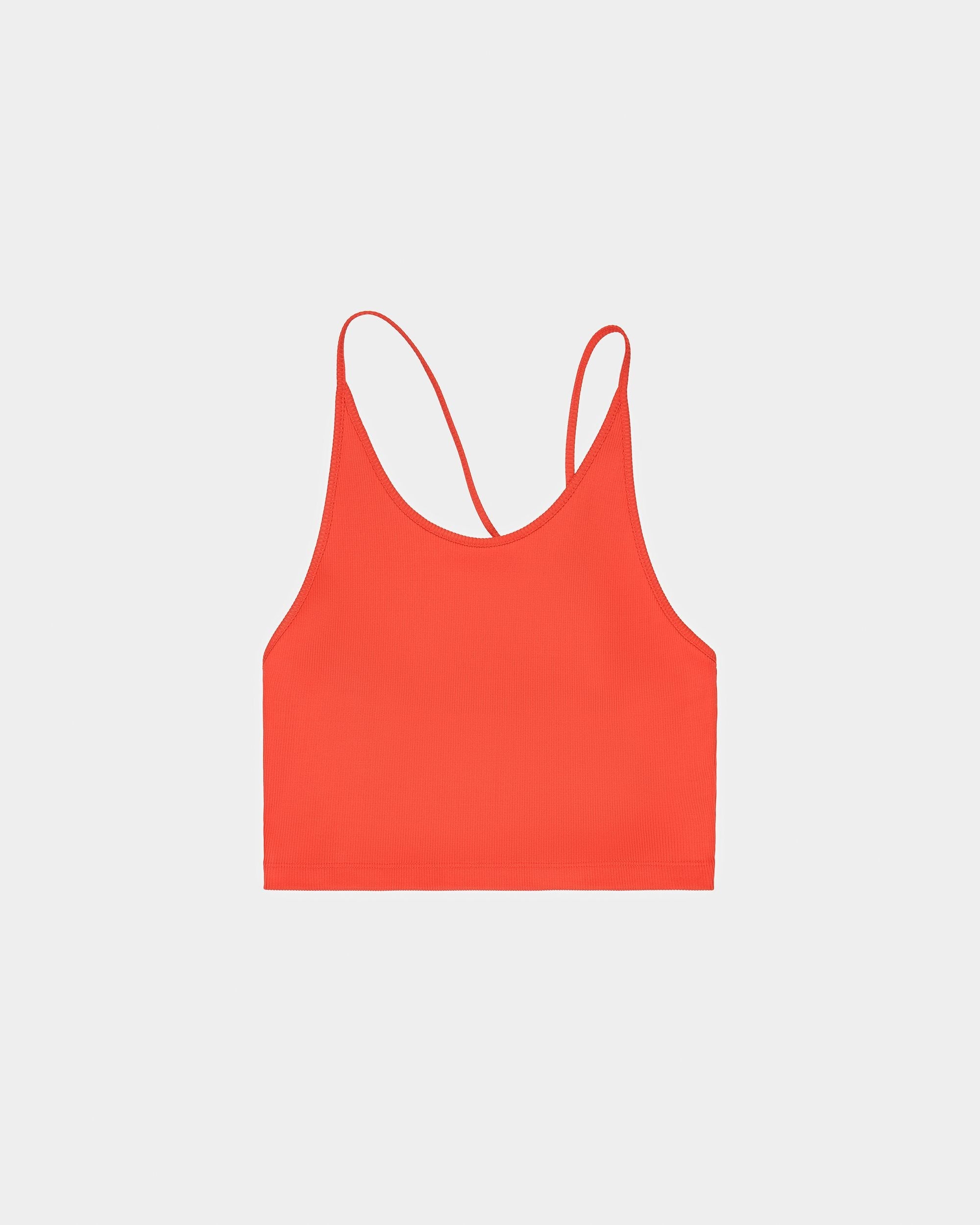 In a striking orange hue. this tank is cut from ribbed fabric for a close. flattering fit. With thin straps. wear solo or layered under a jacket.