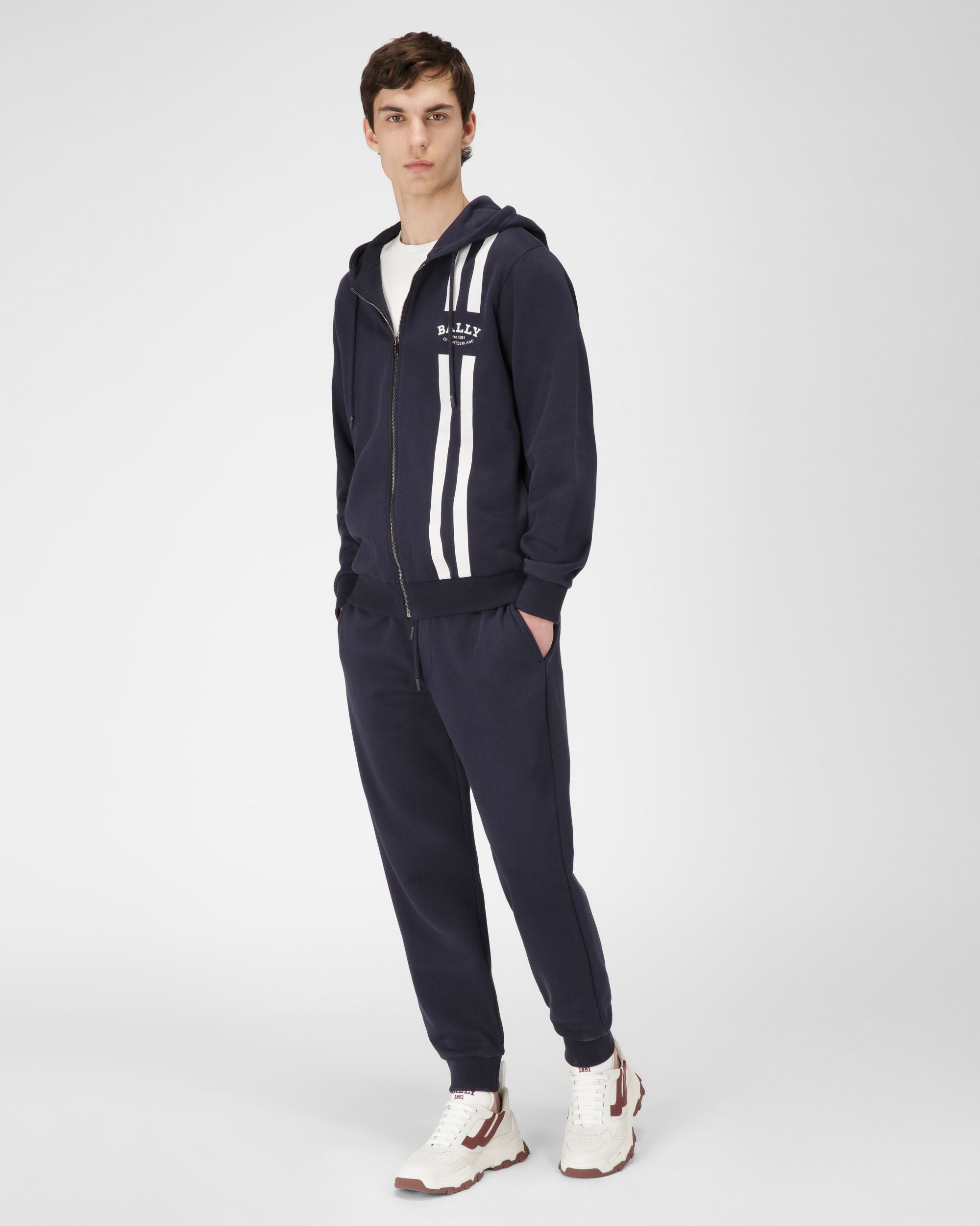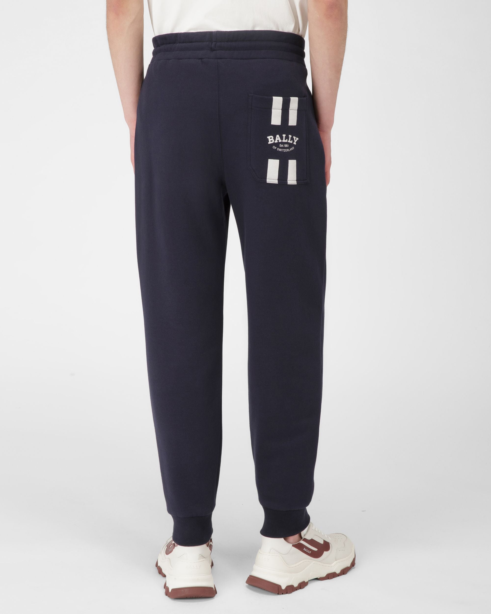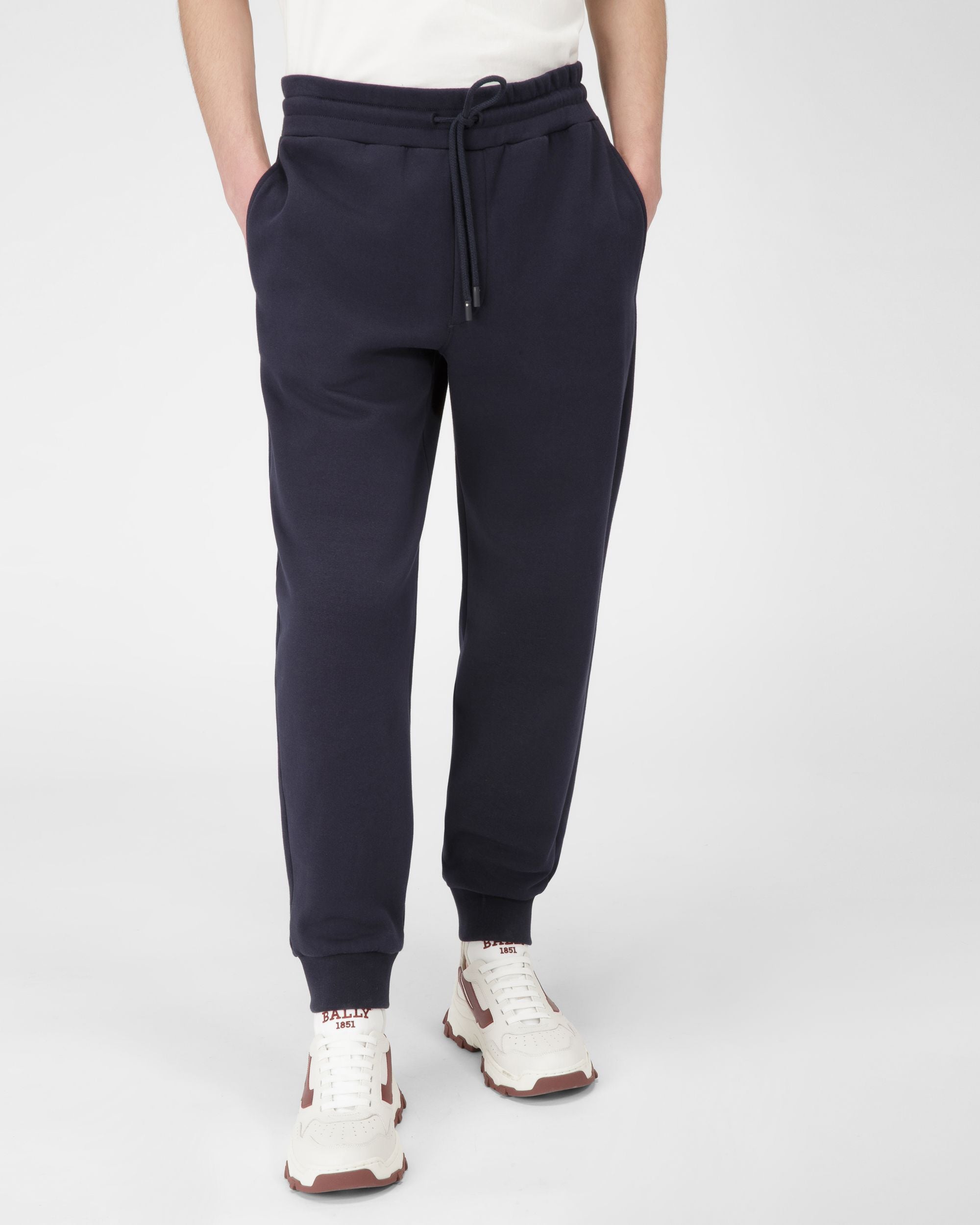 A casual yet refined pair of men’s sweatpants in navy mixed cotton detailed with a drawstring waist and a signature logo accent at the rear patch pocket.