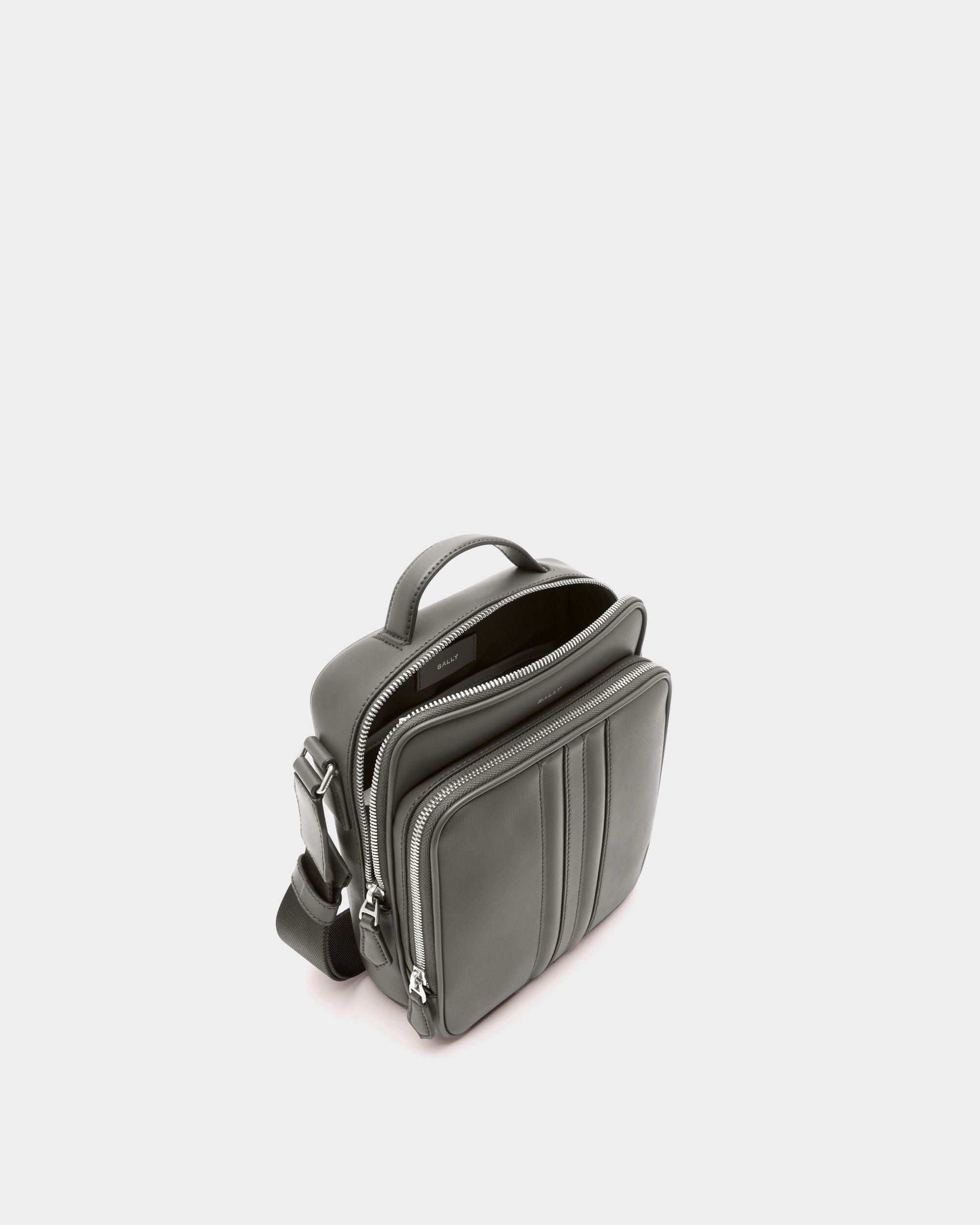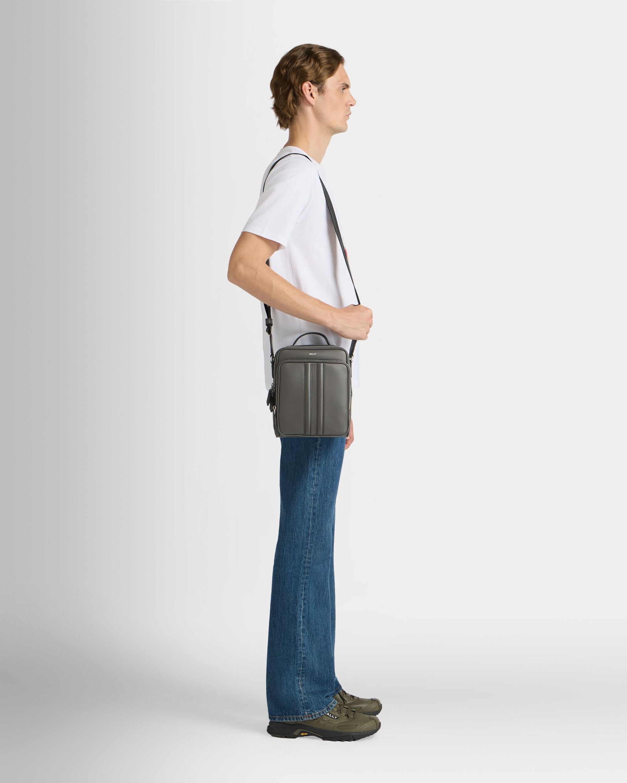 This Mythos crossbody bag in grey recycled leather is embellished by a foil logo and a padded leather Ribbon at the front. crafted via meticulous inlay. The adjustable strap offers a choice between shoulder or crossbody carry.