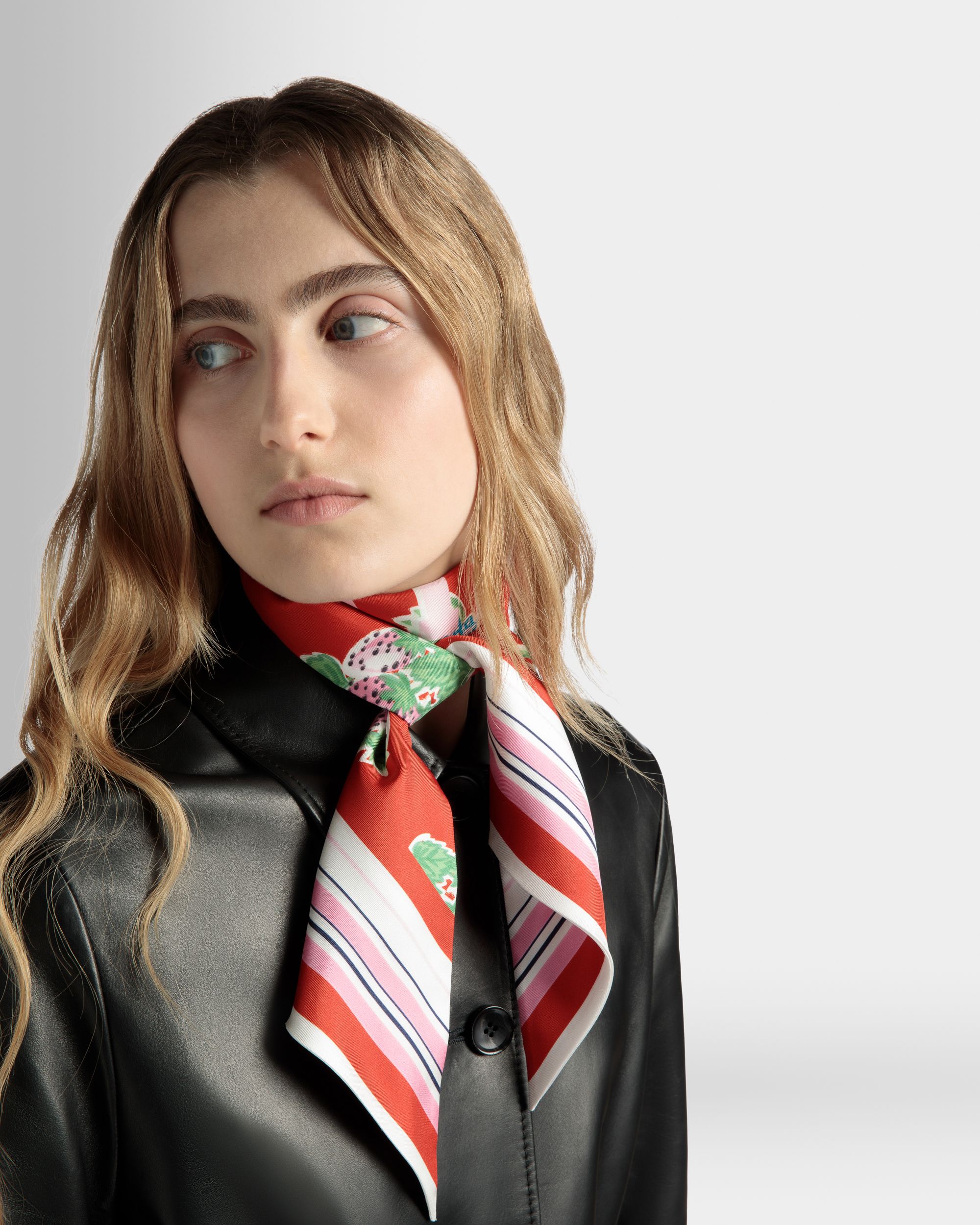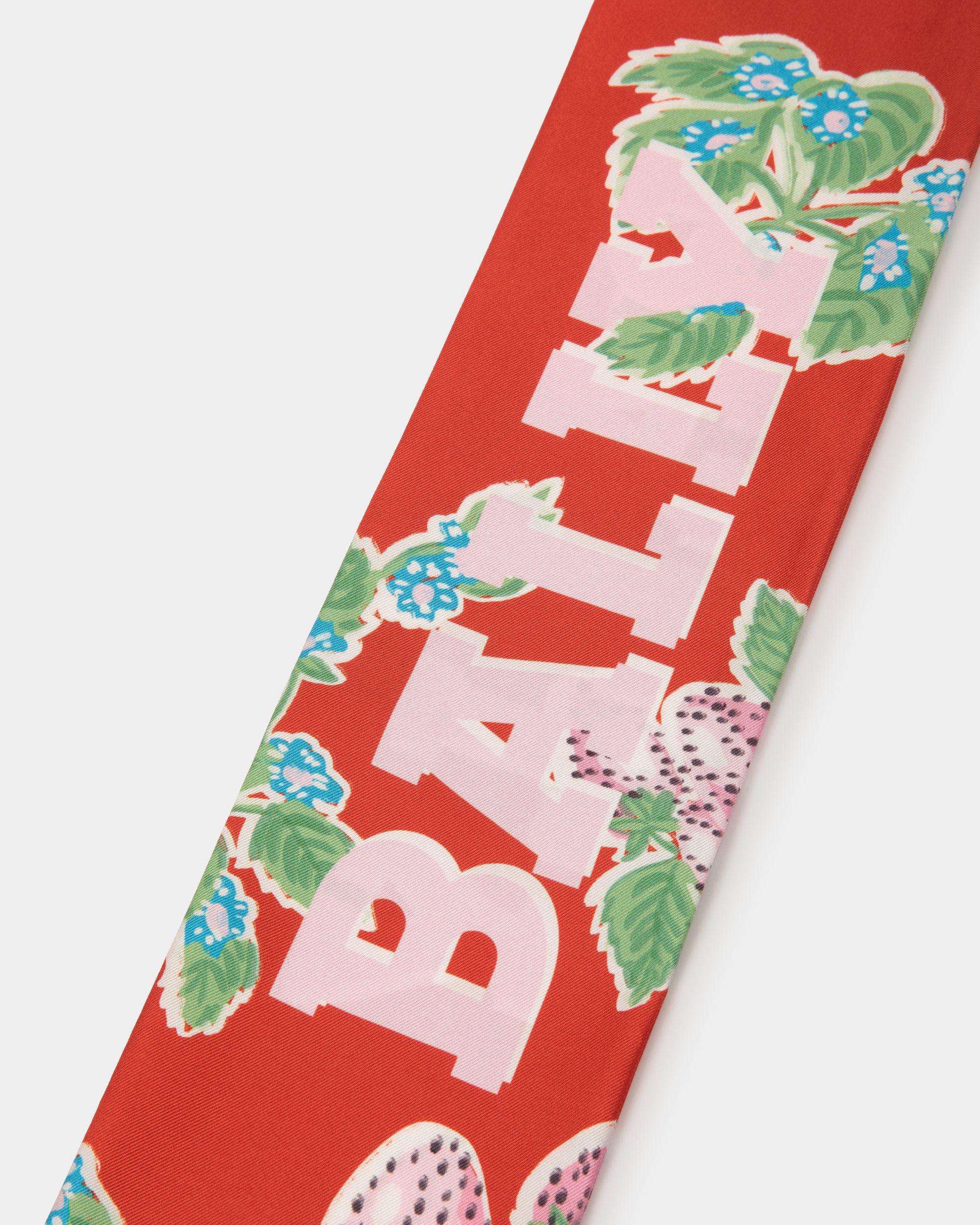 Silk scarf printed with a vintage-inspired Strawberry motif and a collegiate Bally logo. On-tone stripes trim the short edges.