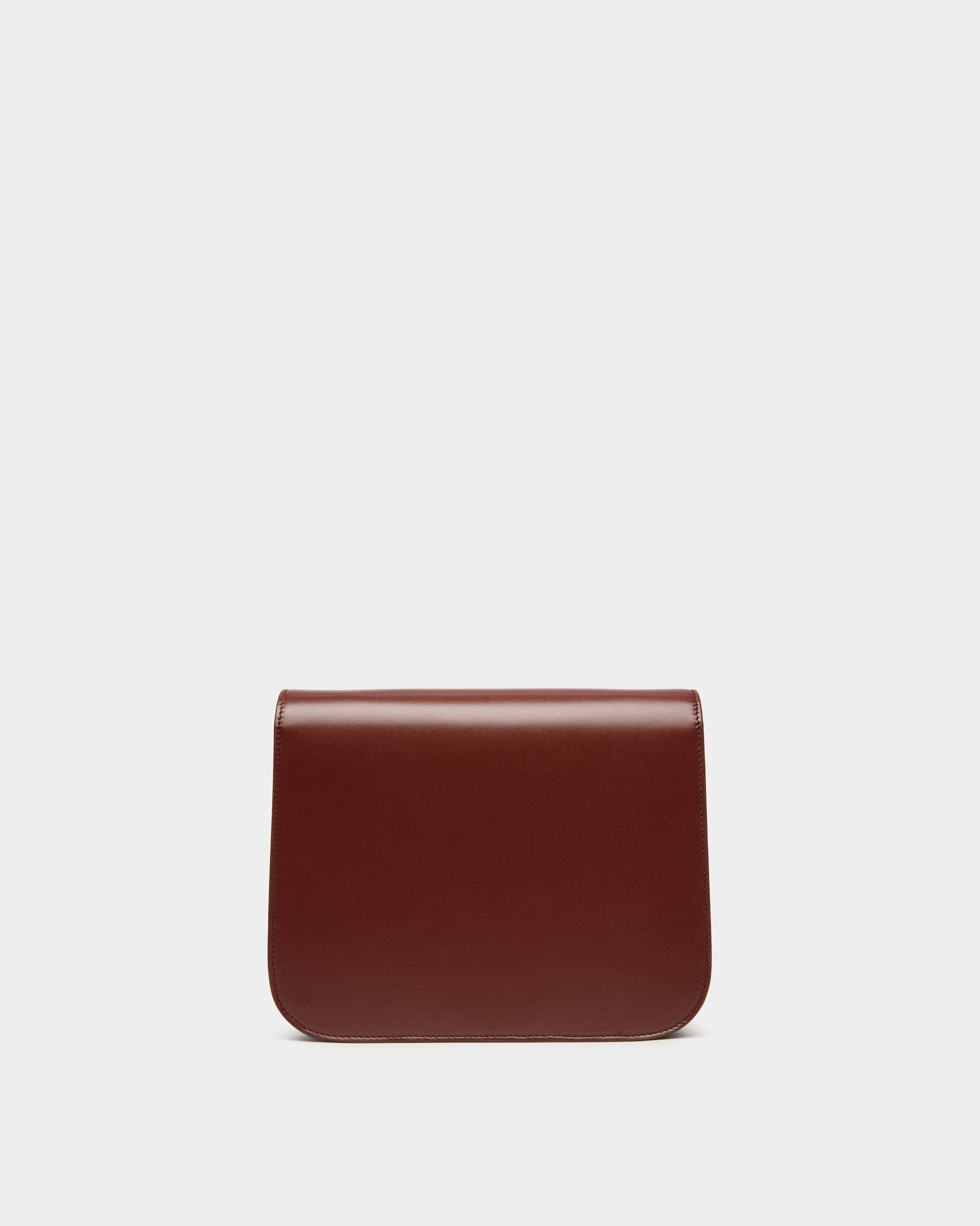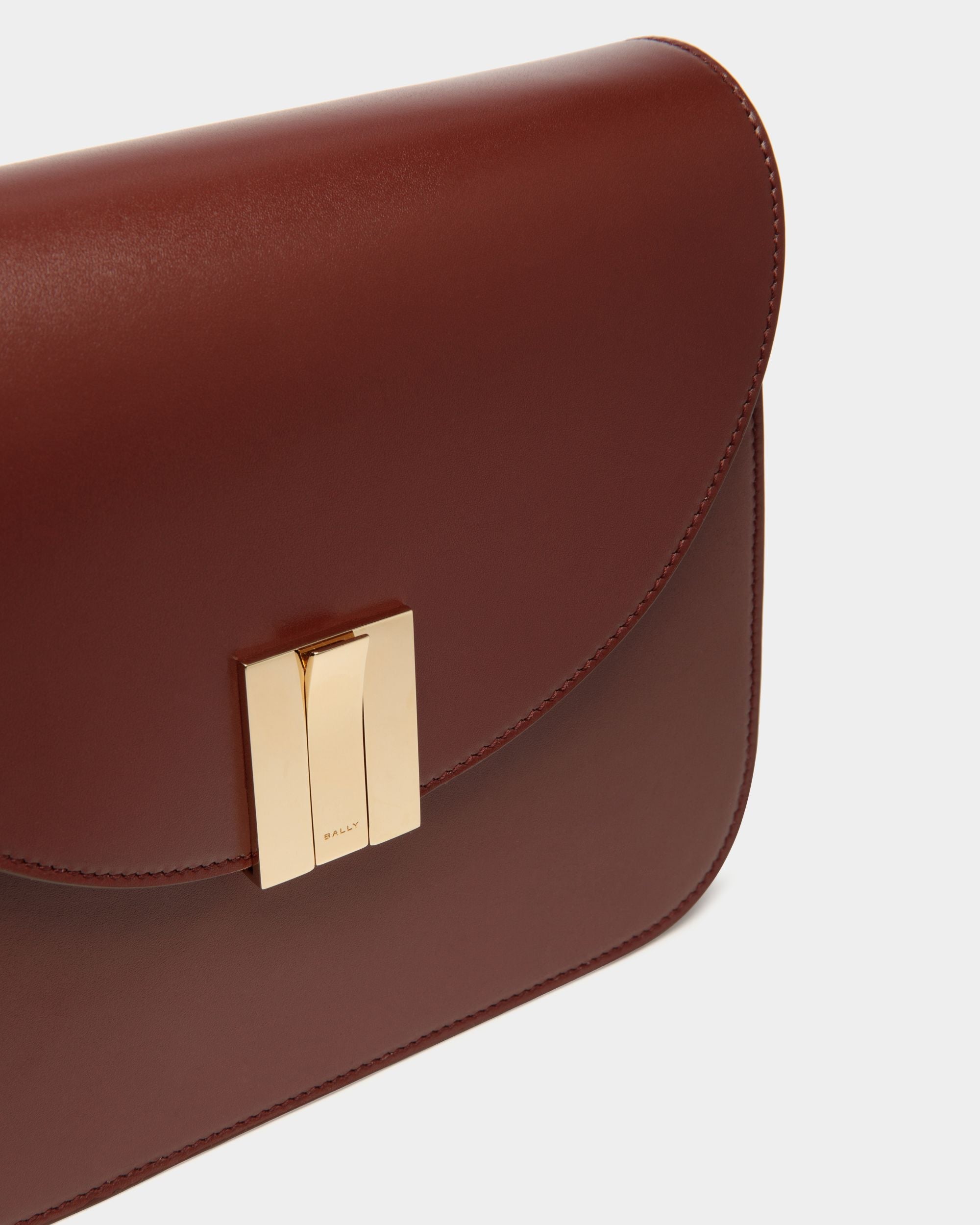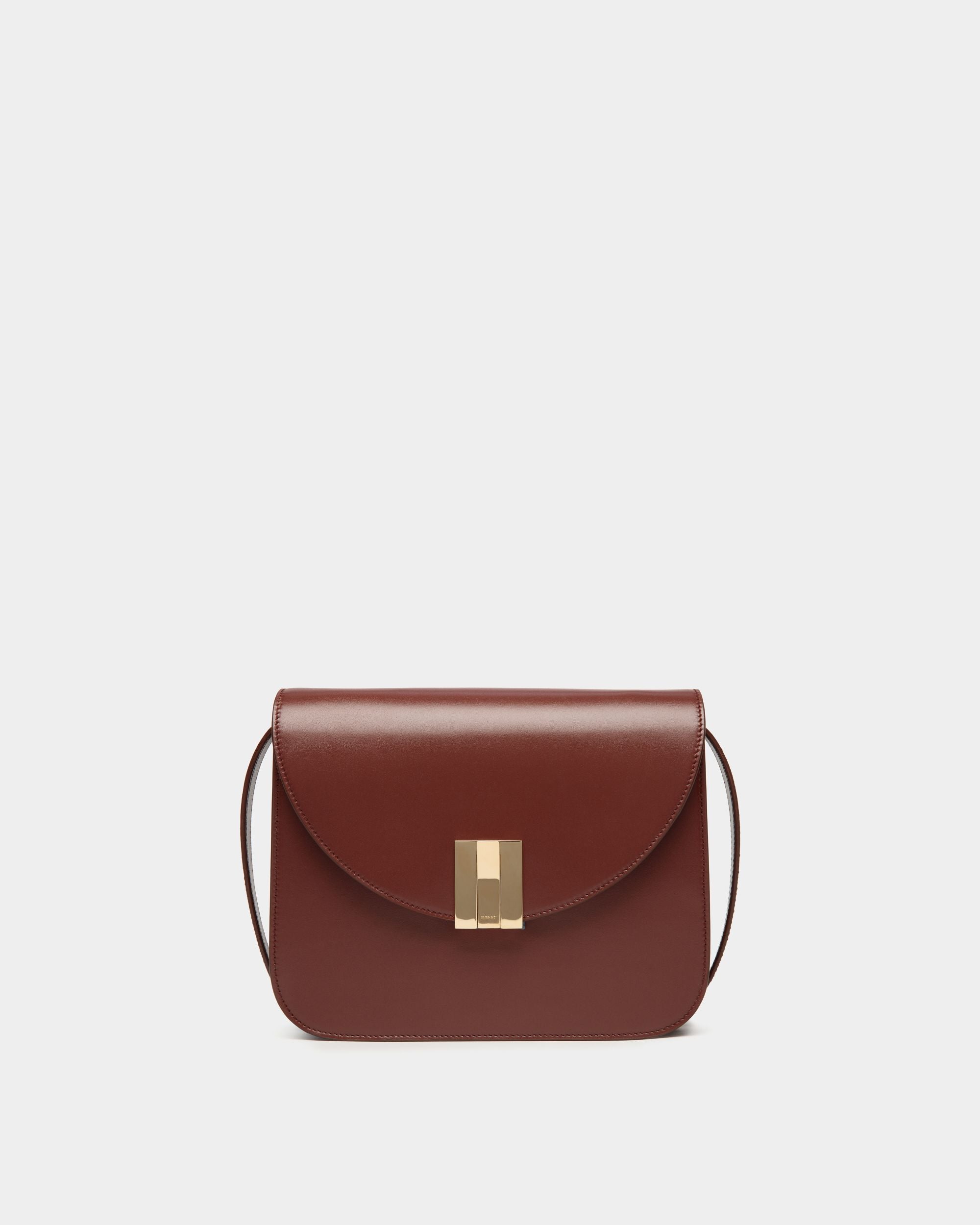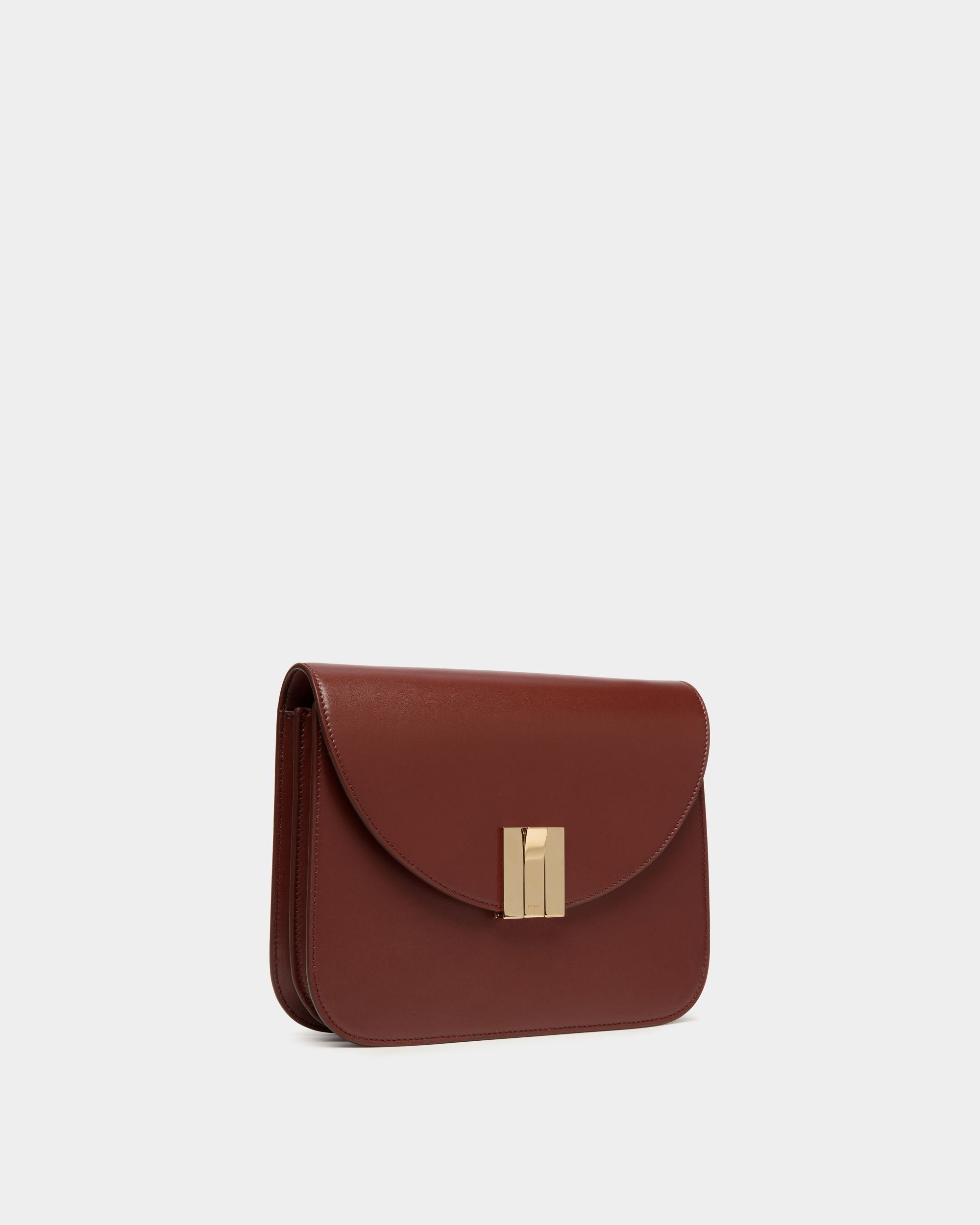 The Ollam crossbody bag in brown calfskin with gold-tone hardware and a flap closure is made of divided compartments that expand as needed. while the zip pocket holds smaller items.