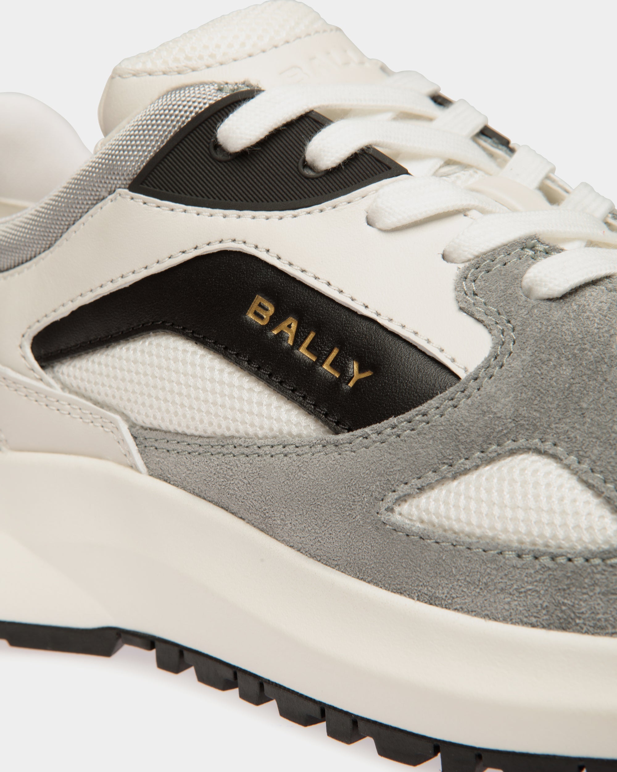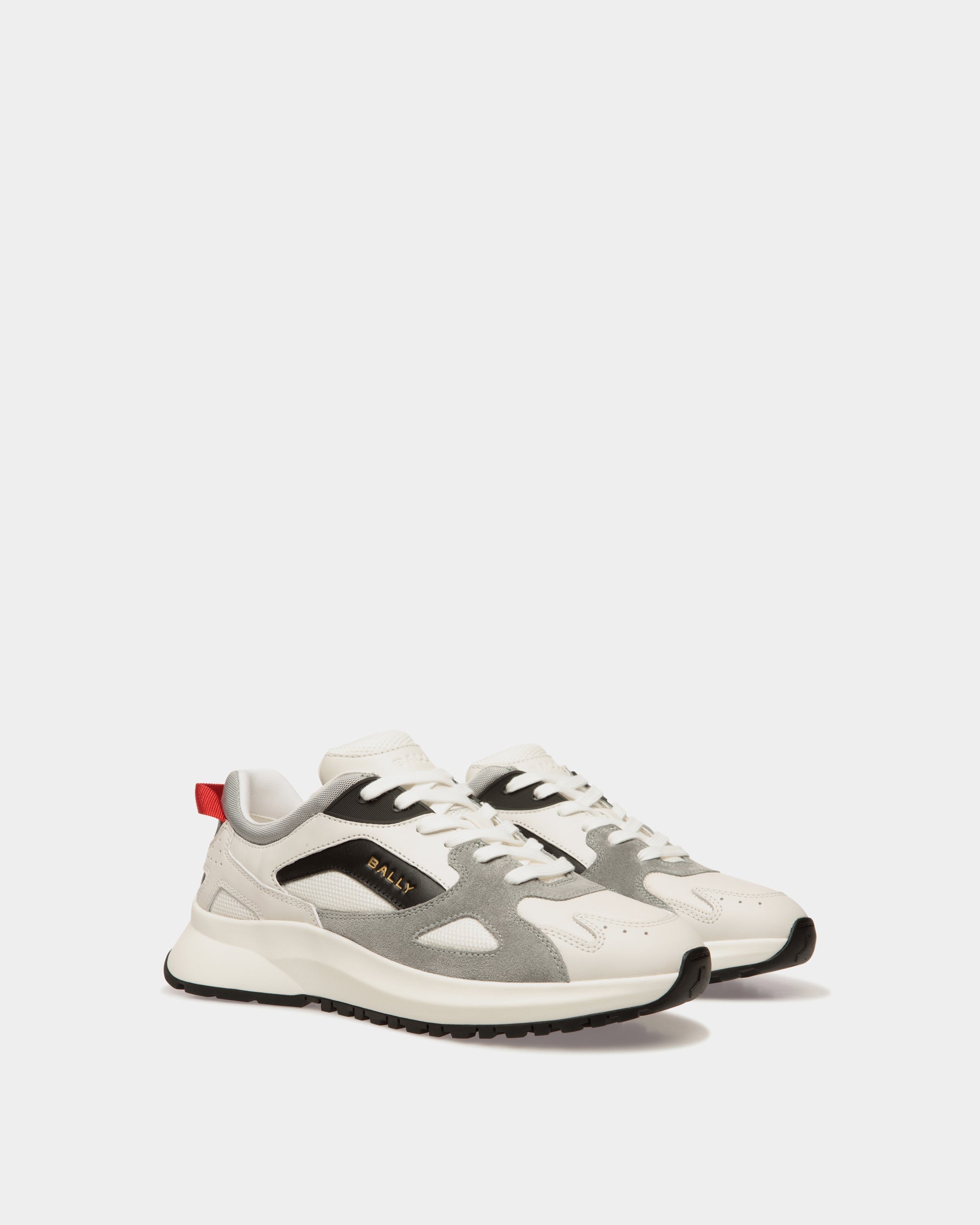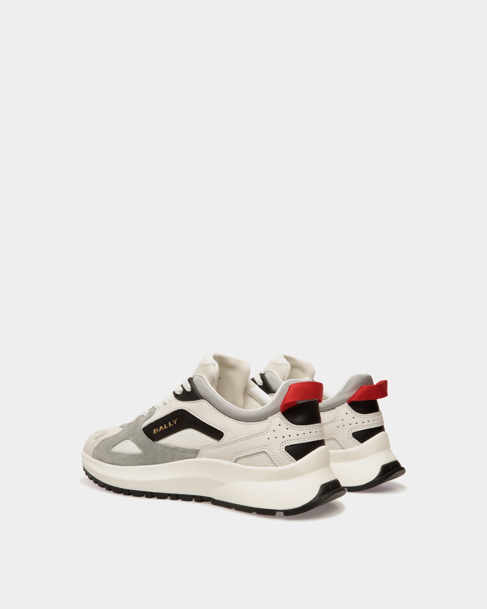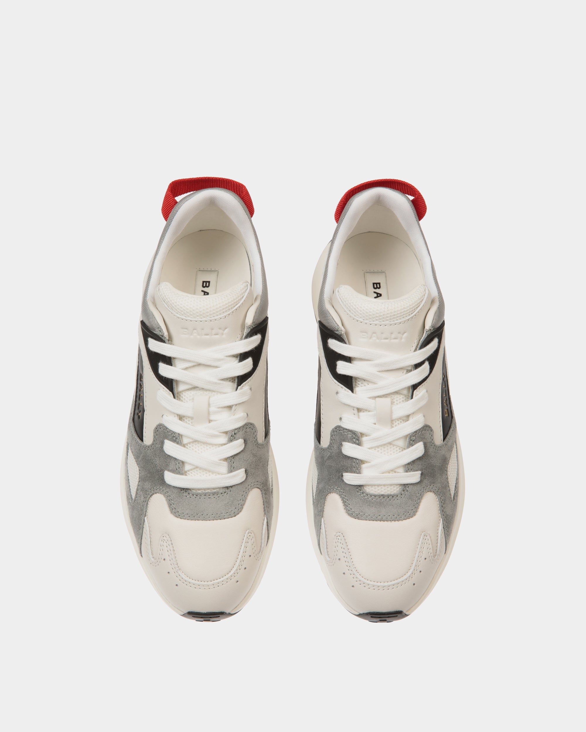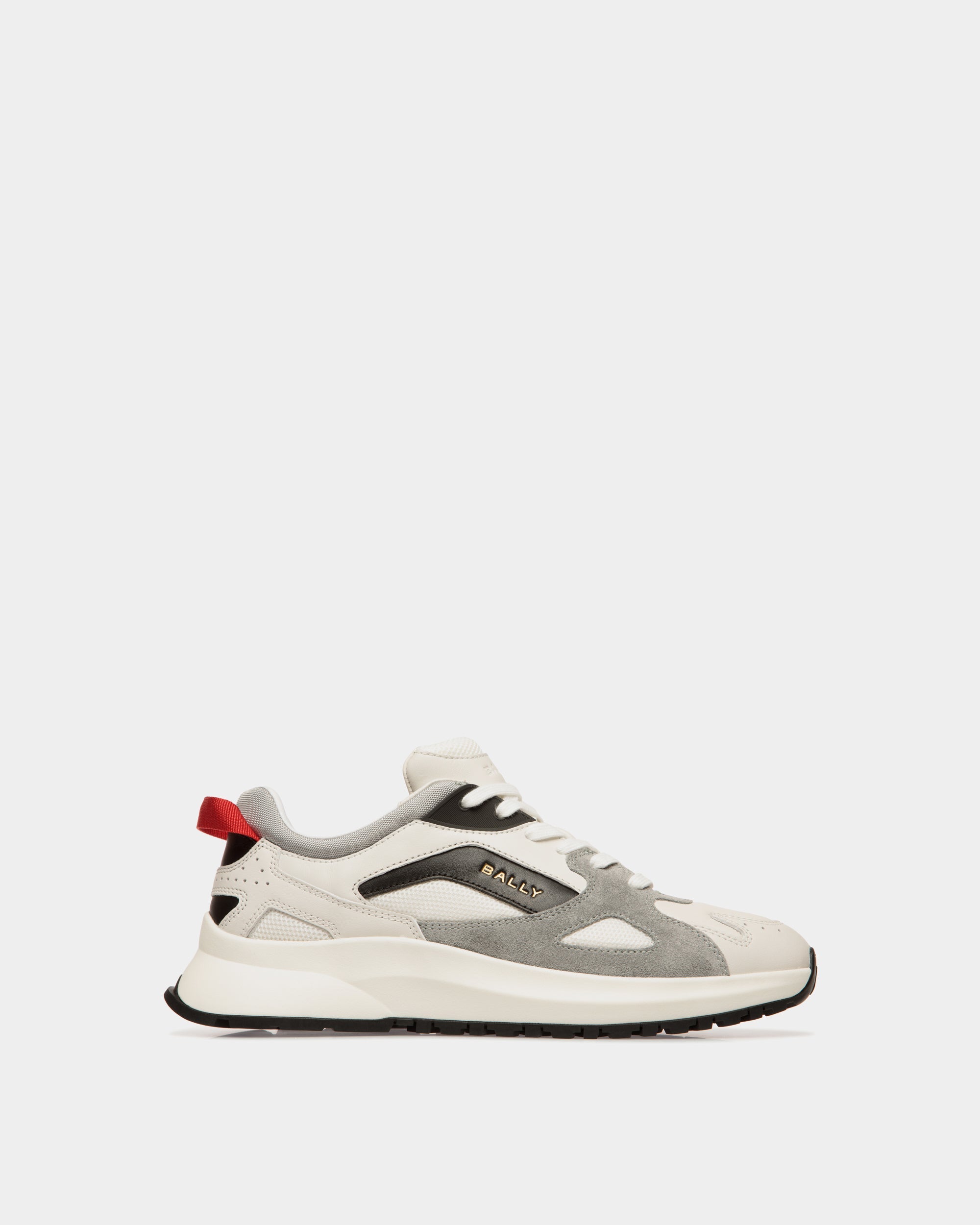 This Outline sneaker in leather and nylon has a black. white and grey colorway. The chunky yet lightweight Vibram running sole guarantees all-terrain grip. A red pull loop in grosgrain adds a pop of color.