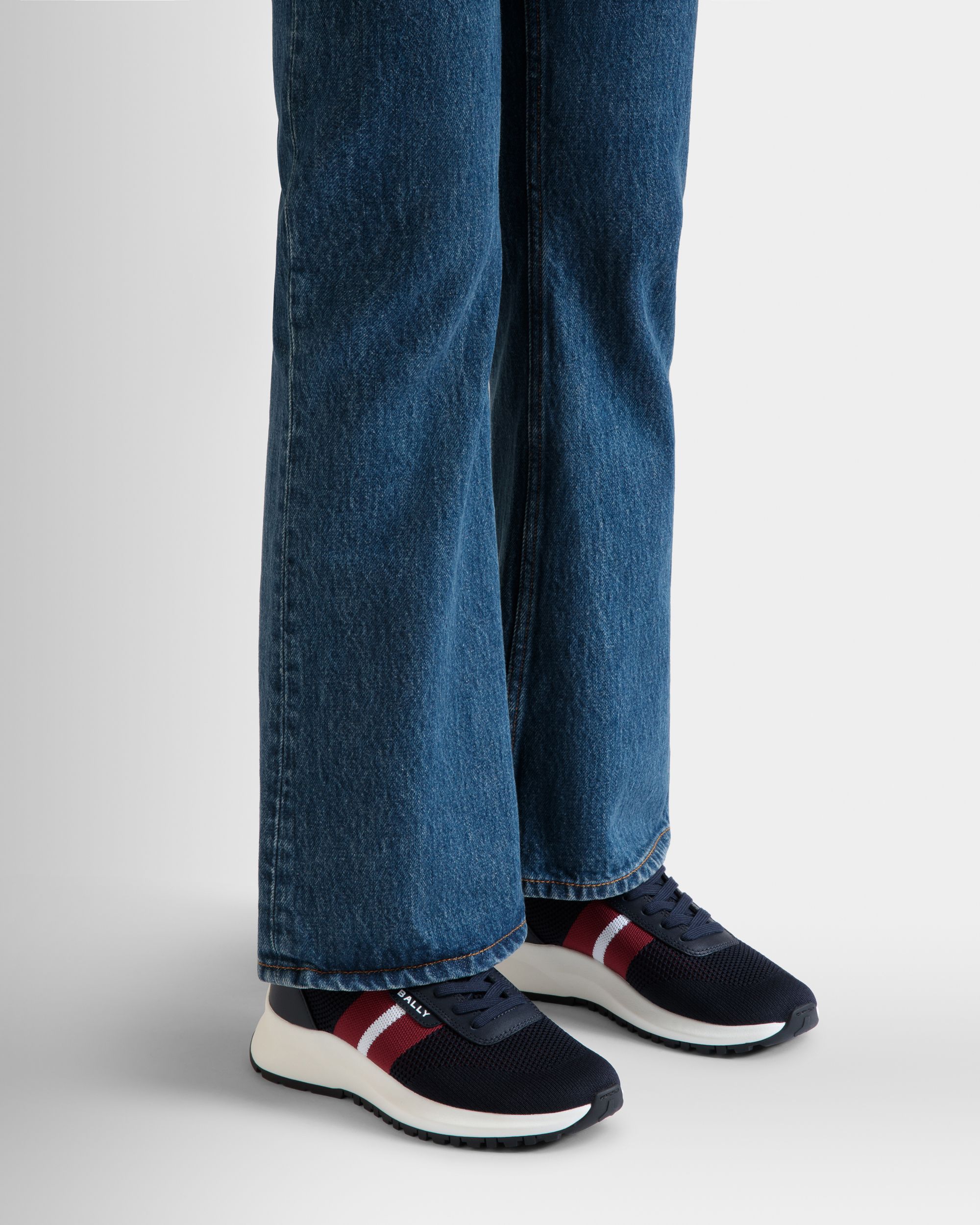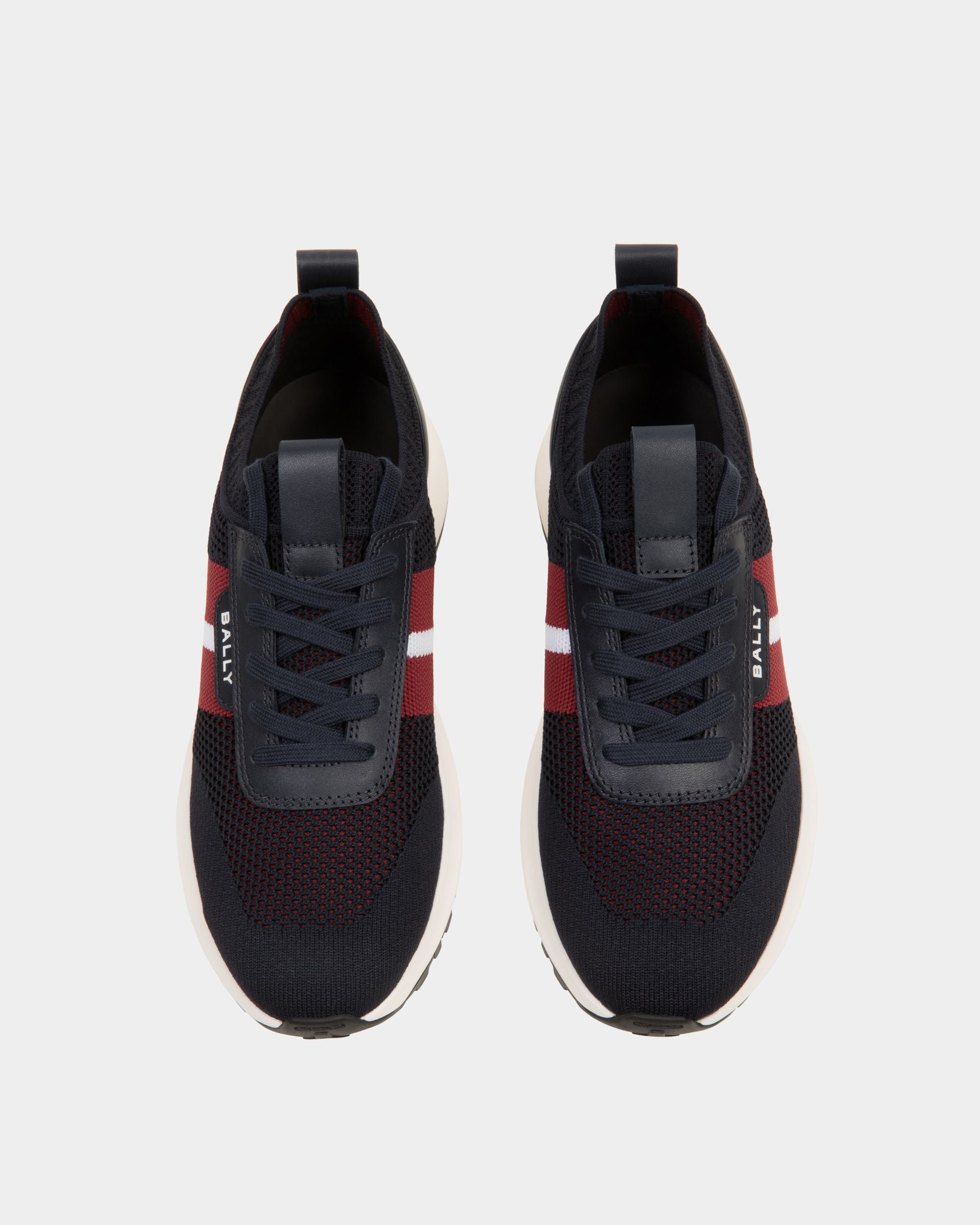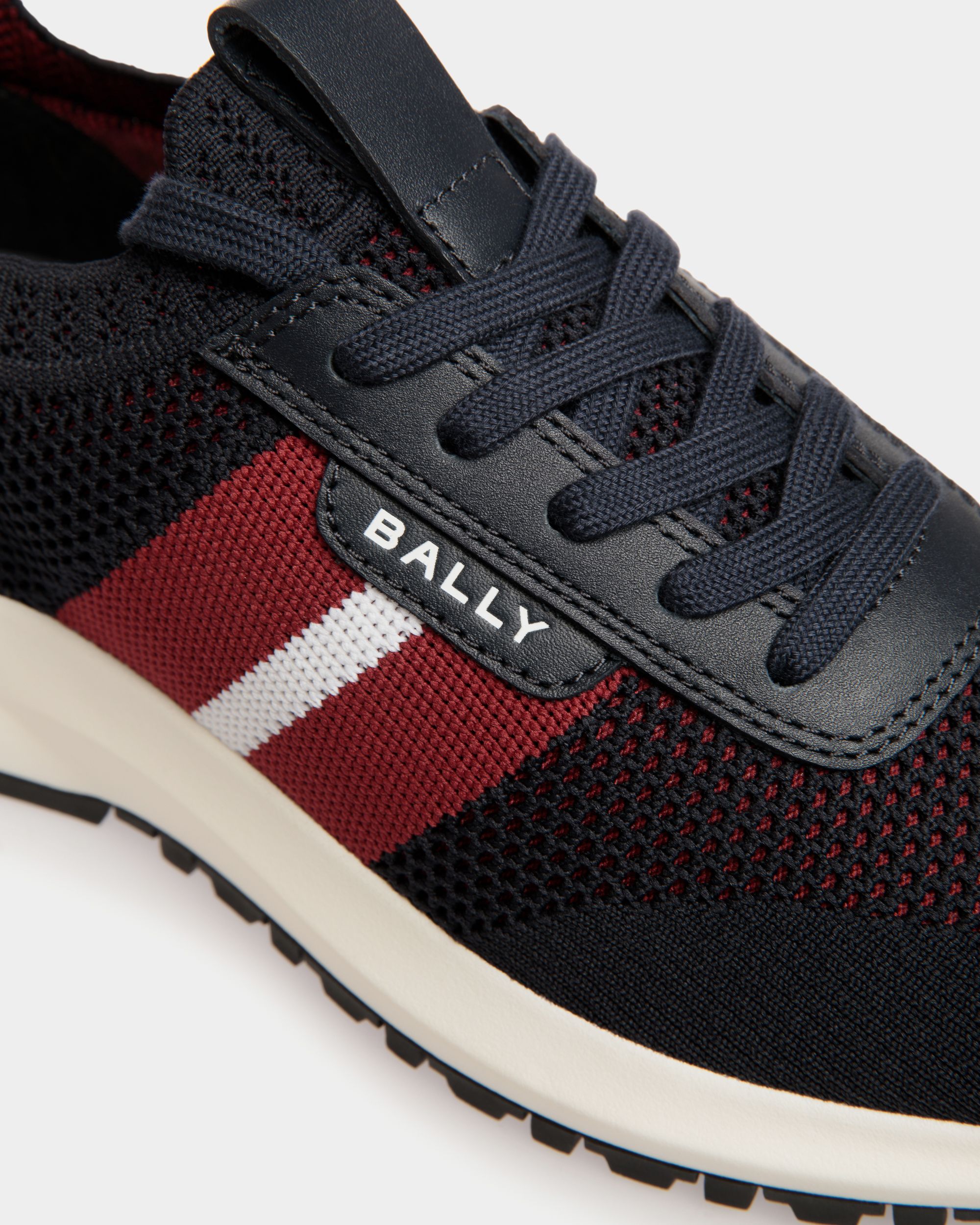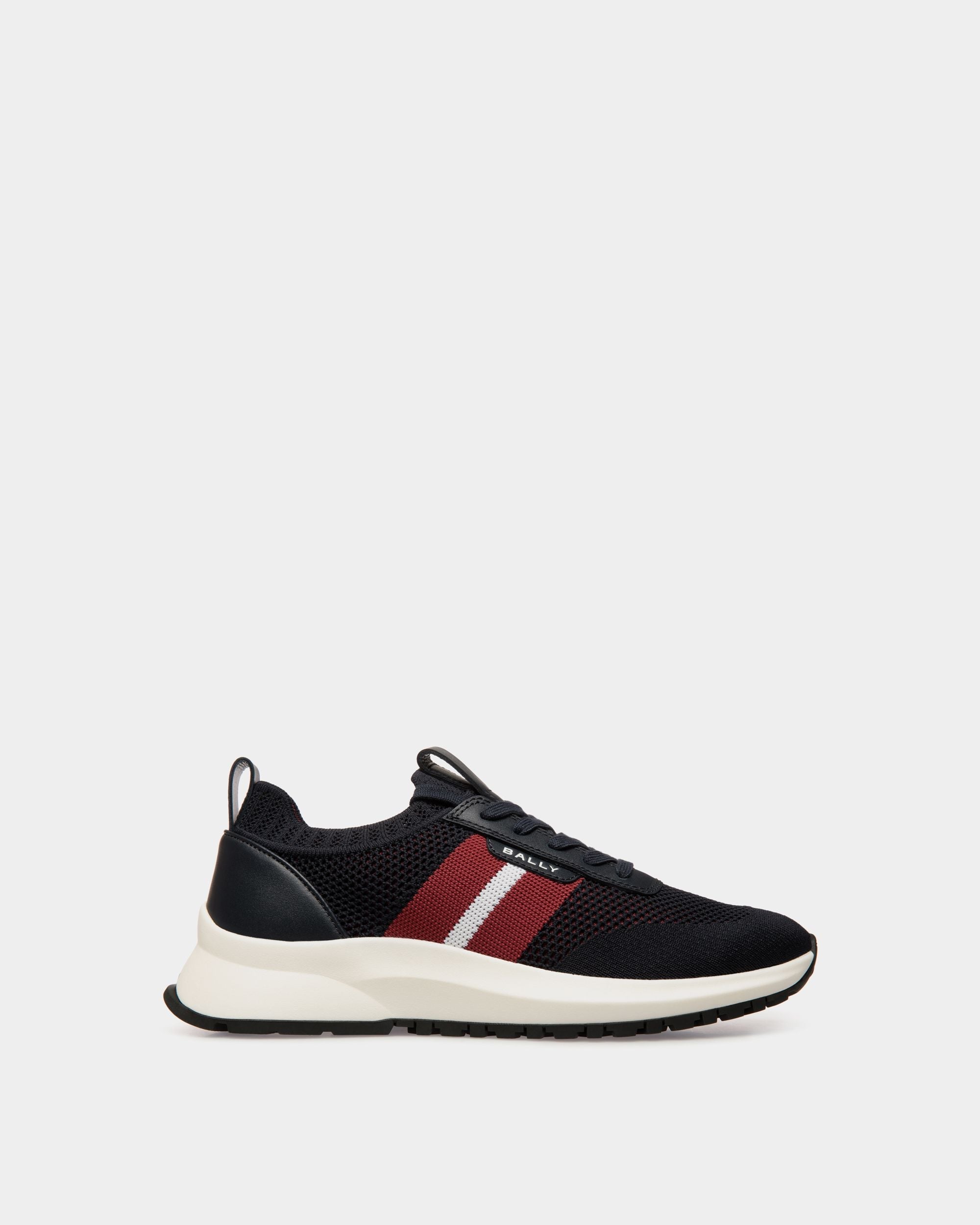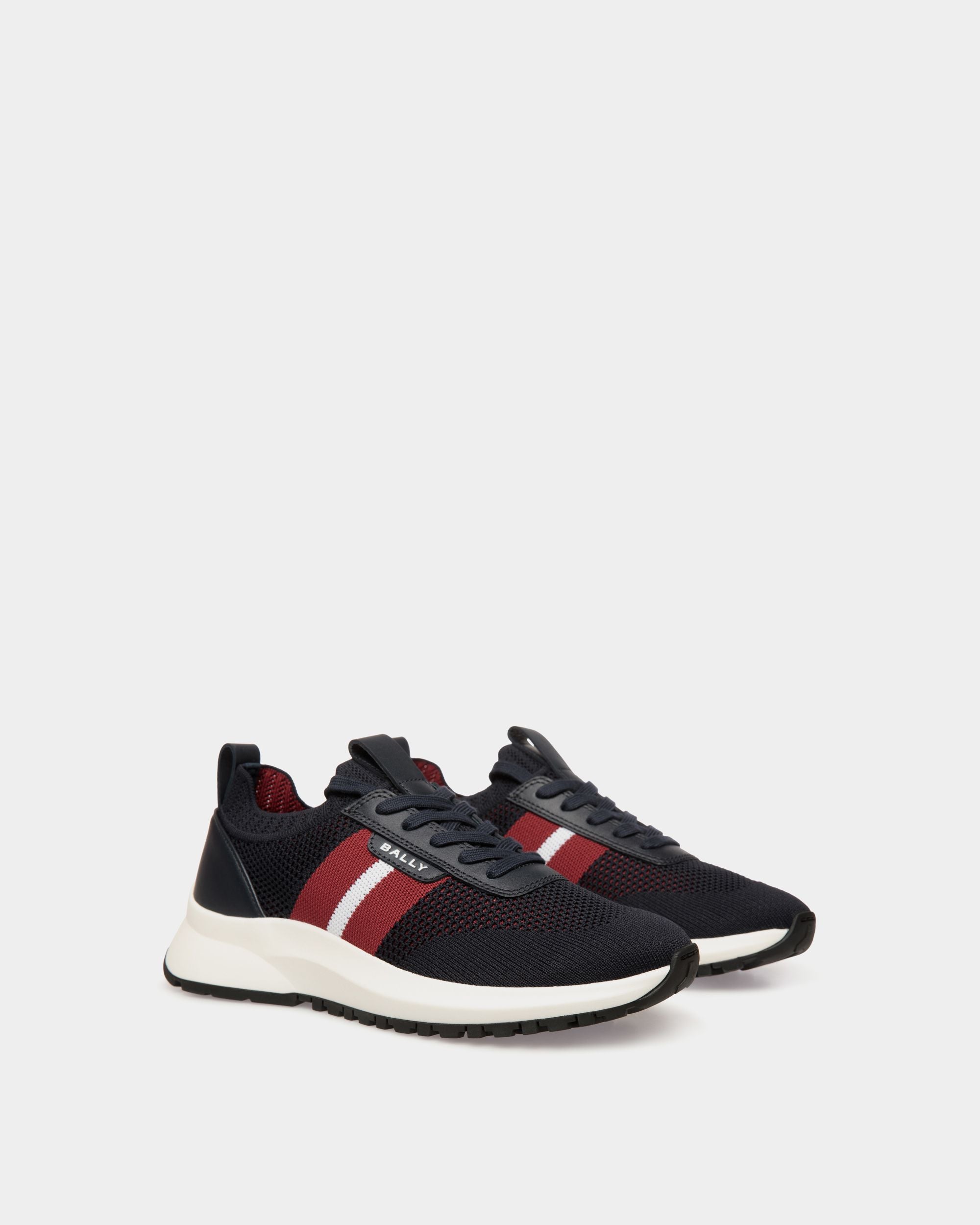 This slip-on Outline sneaker has a lightweight. breathable navy blue knit upper and a shock-absorbing sole in white rubber. A Bally Ribbon and logo embellish the side.
