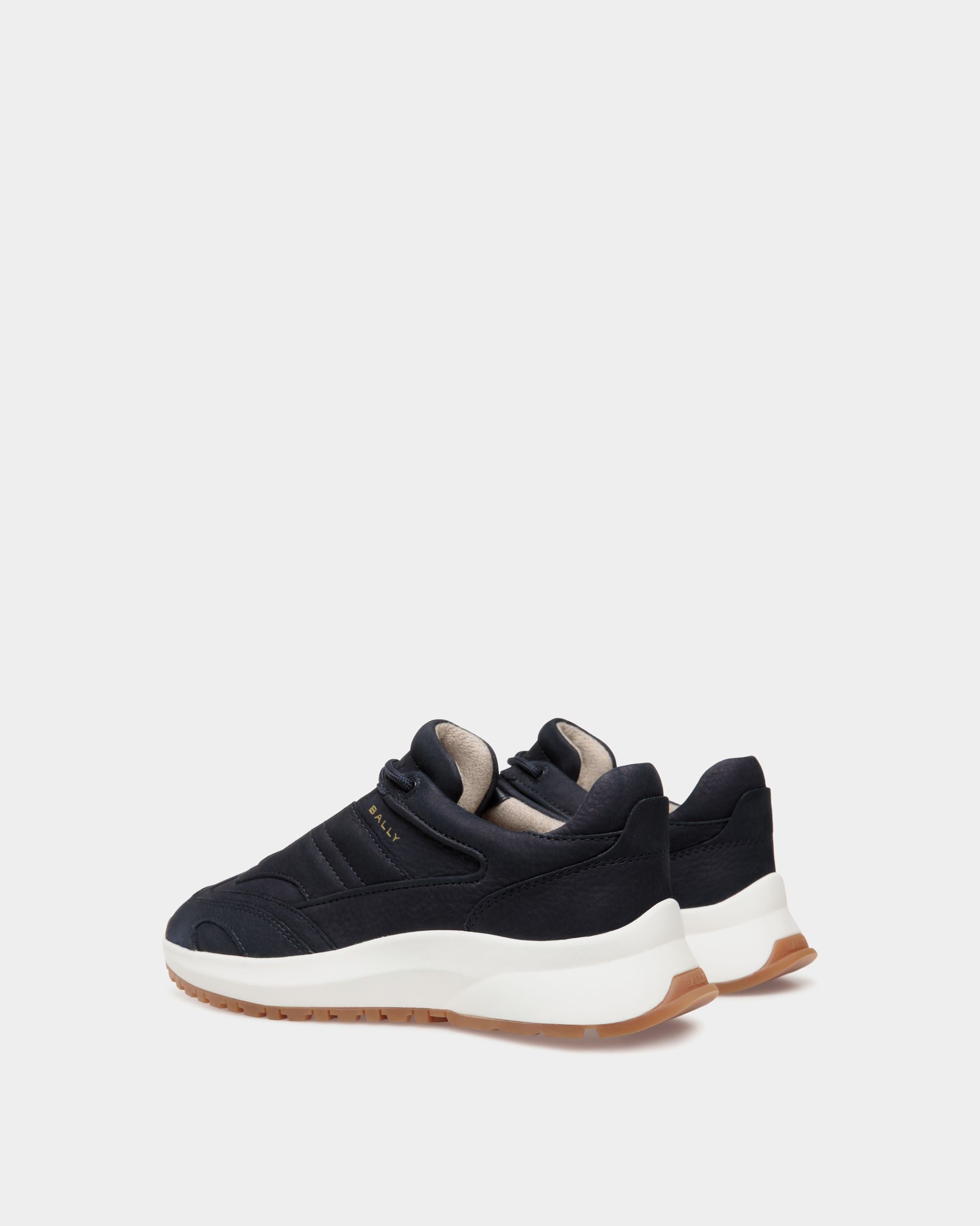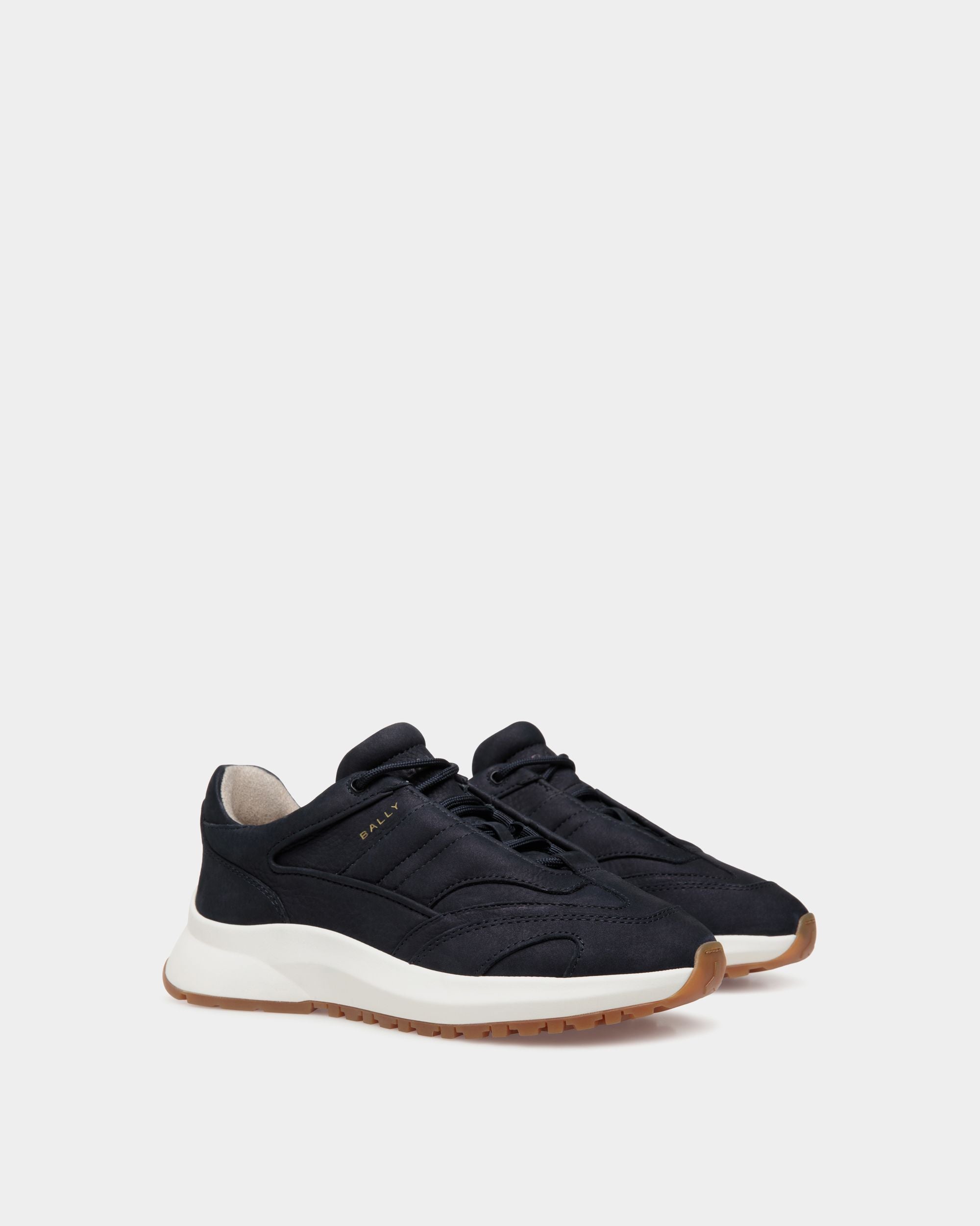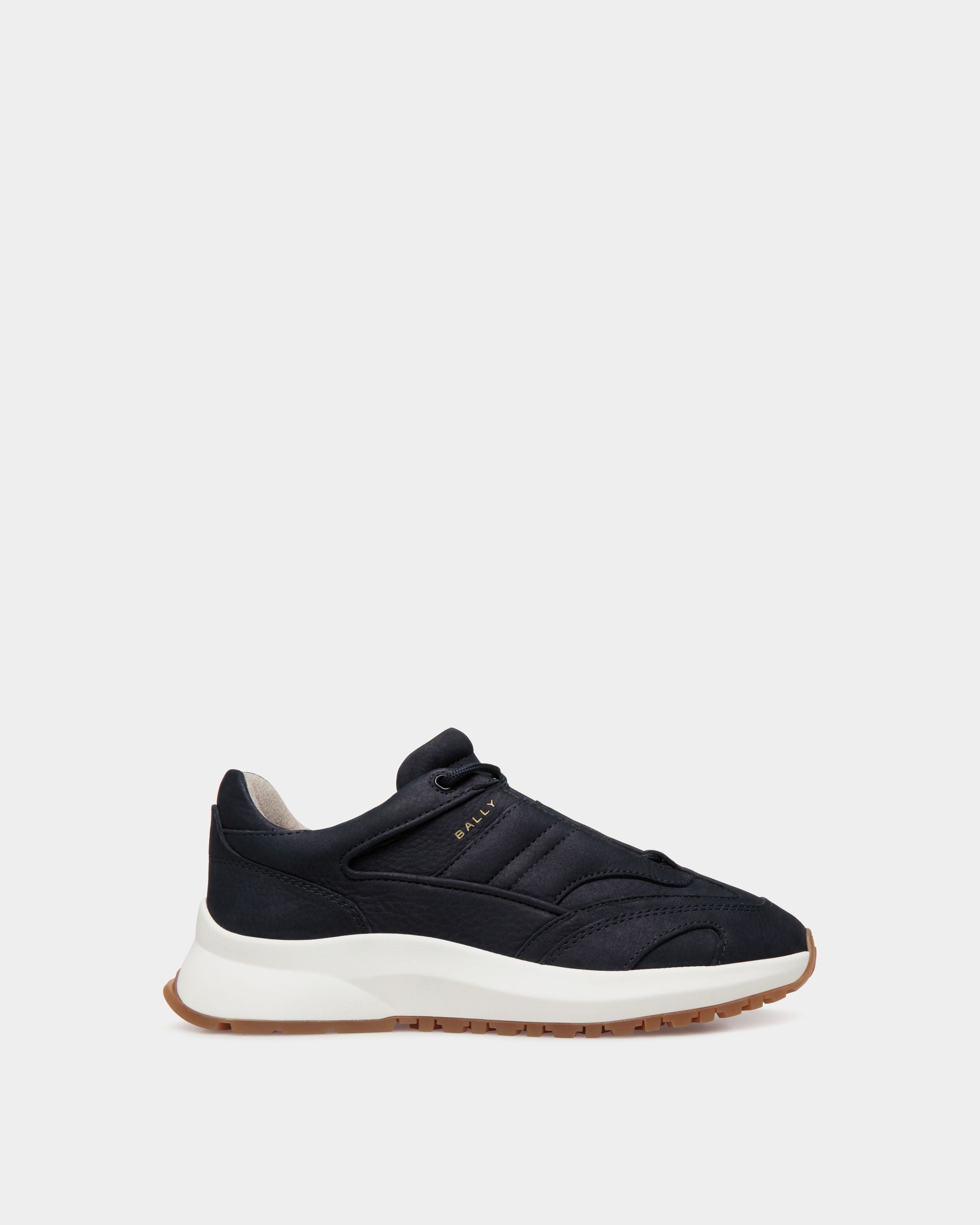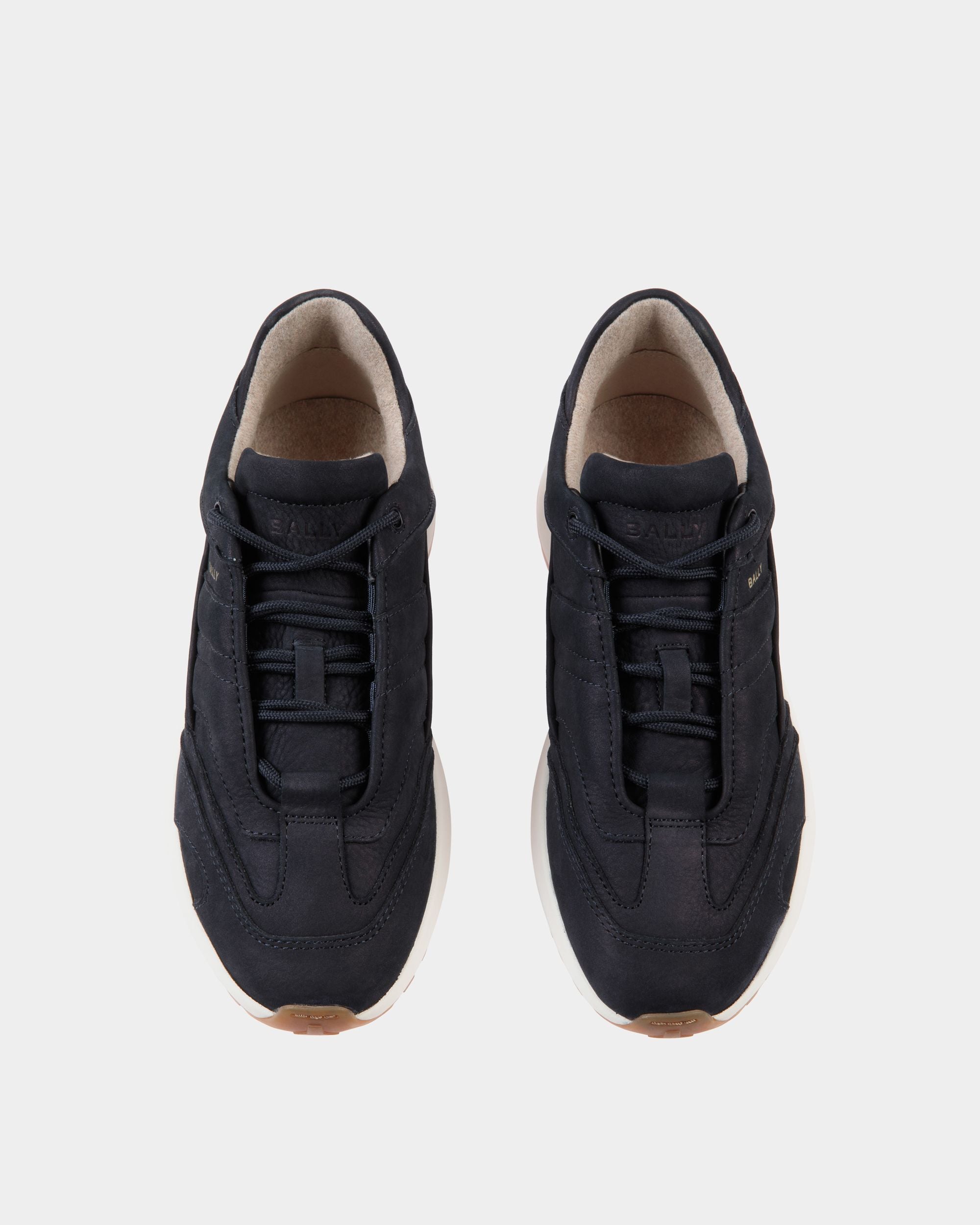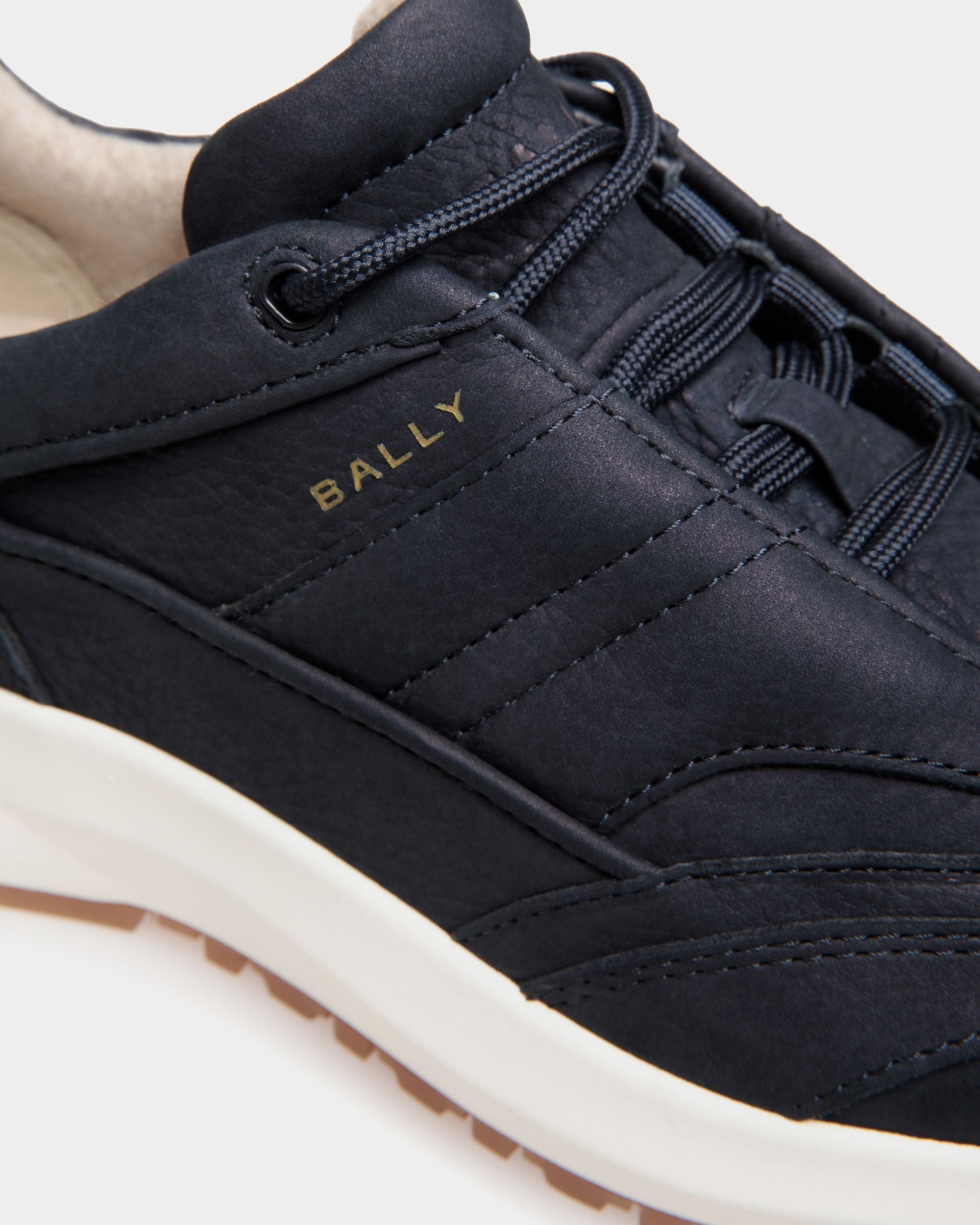 Inspired by running styles. this Outline sneaker in navy blue nubuck is enlivened by panels and stitching that subtly recall the Bally Ribbon at the sides. The thick Vibram rubber sole remains lightweight. with Bally grips on the outsole for all-terrain practicality.