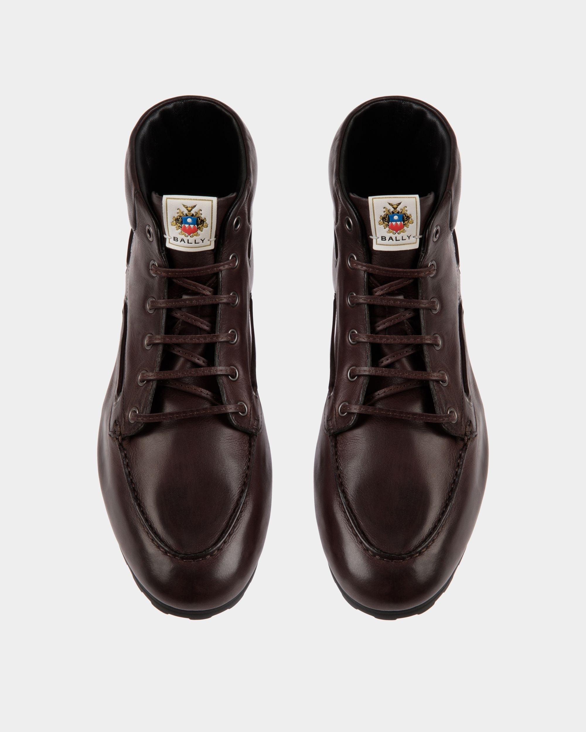 Seen in key looks on the FW24 Bally runway. this Plume bootie in Ebano buffalo leather is a reinterpretation of a boat shoe. giving it the silhouette of an ankle boot. The upper is combined with a rubber sole via reverse Goodyear construction. a hand-worked method that delivers exceptional flexibility and lightness.