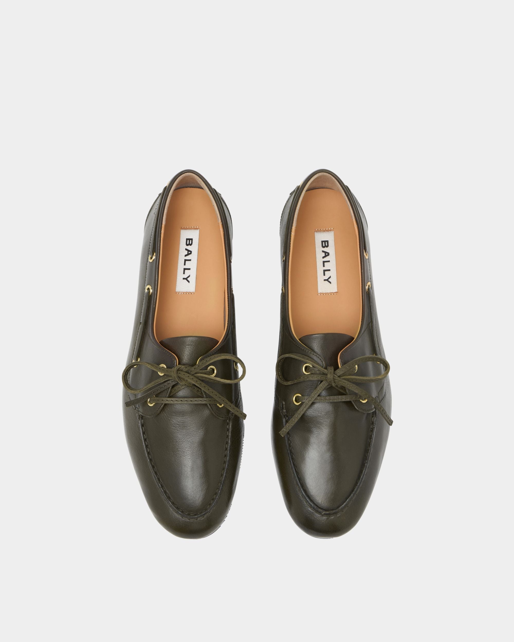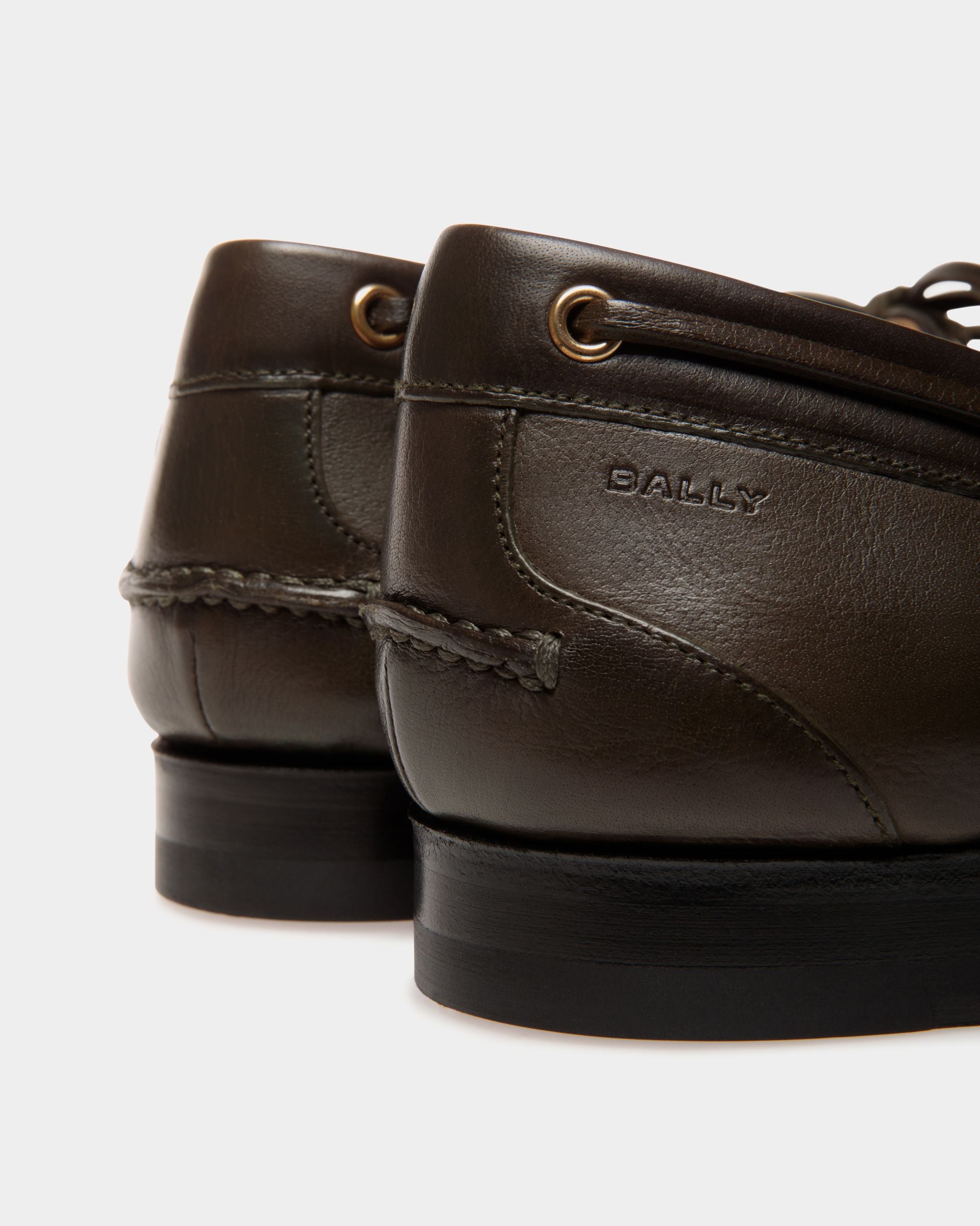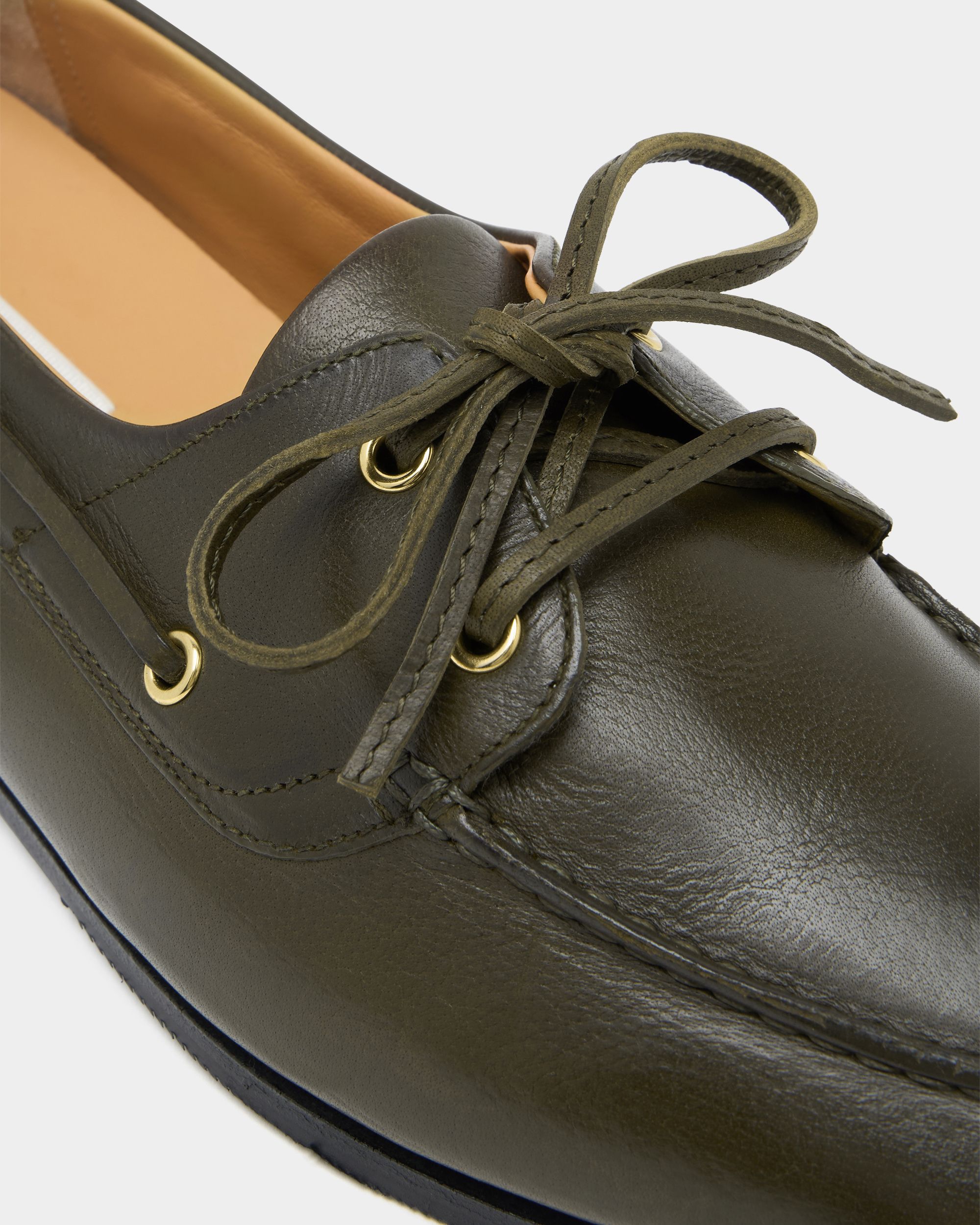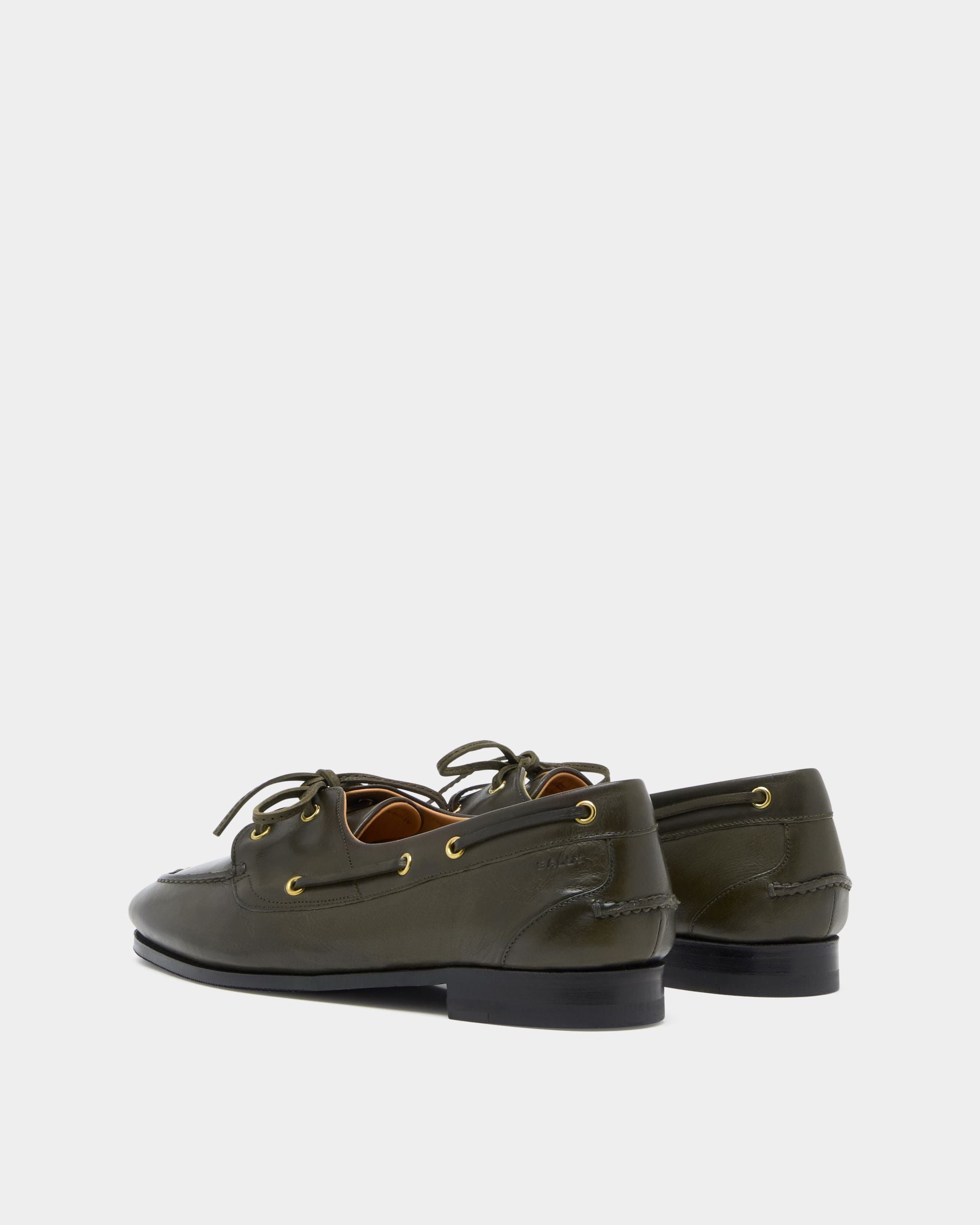 Bally’s interpretation of a boat shoe. the Plume moccasin is a masterpiece of comfort. flexibility and lightness. This step-in style boasts artisanal Goodyear Reverse construction. in which the lining is sewn around the welt inside-out. like a glove. before being stitched to the military green buffalo leather upper.