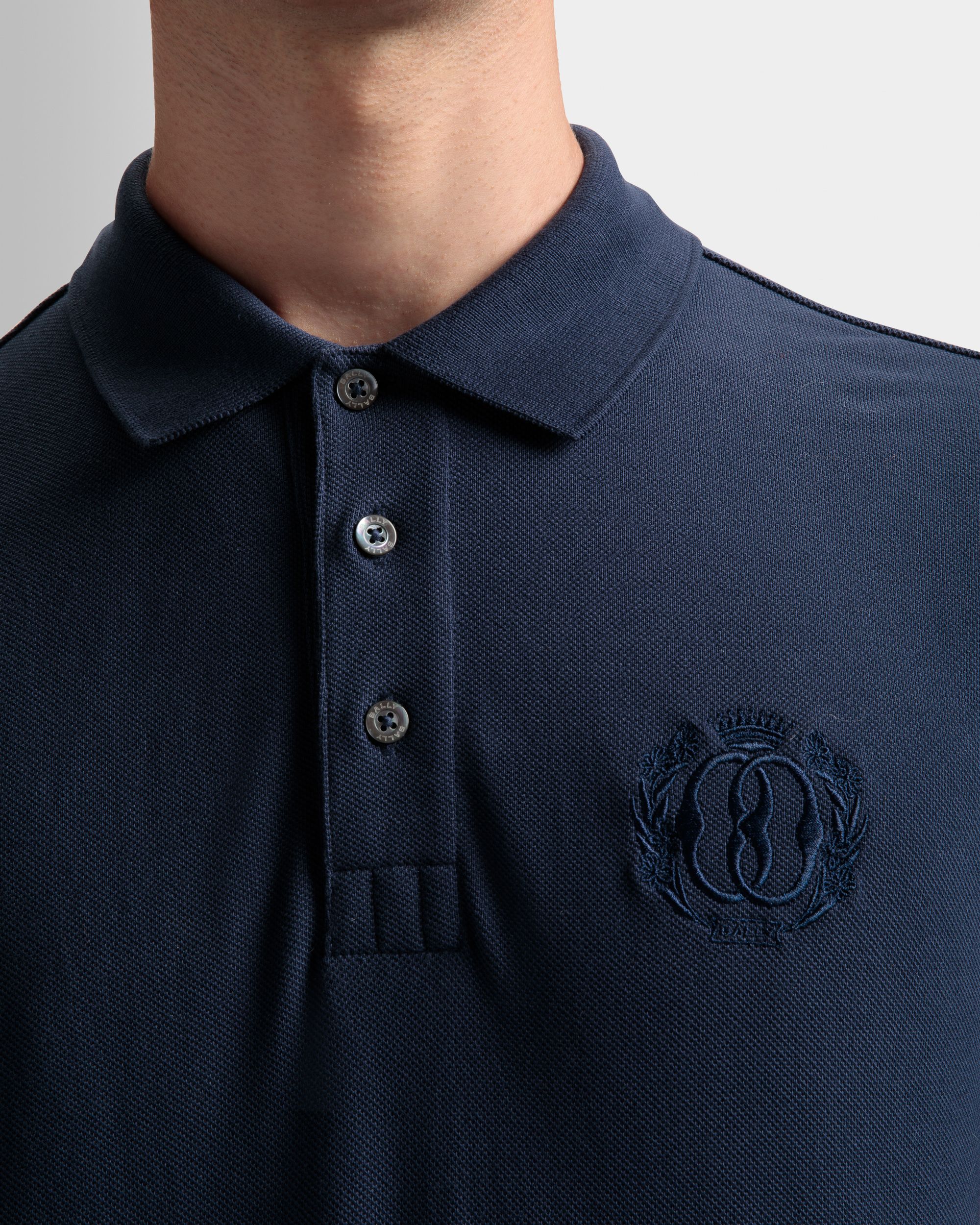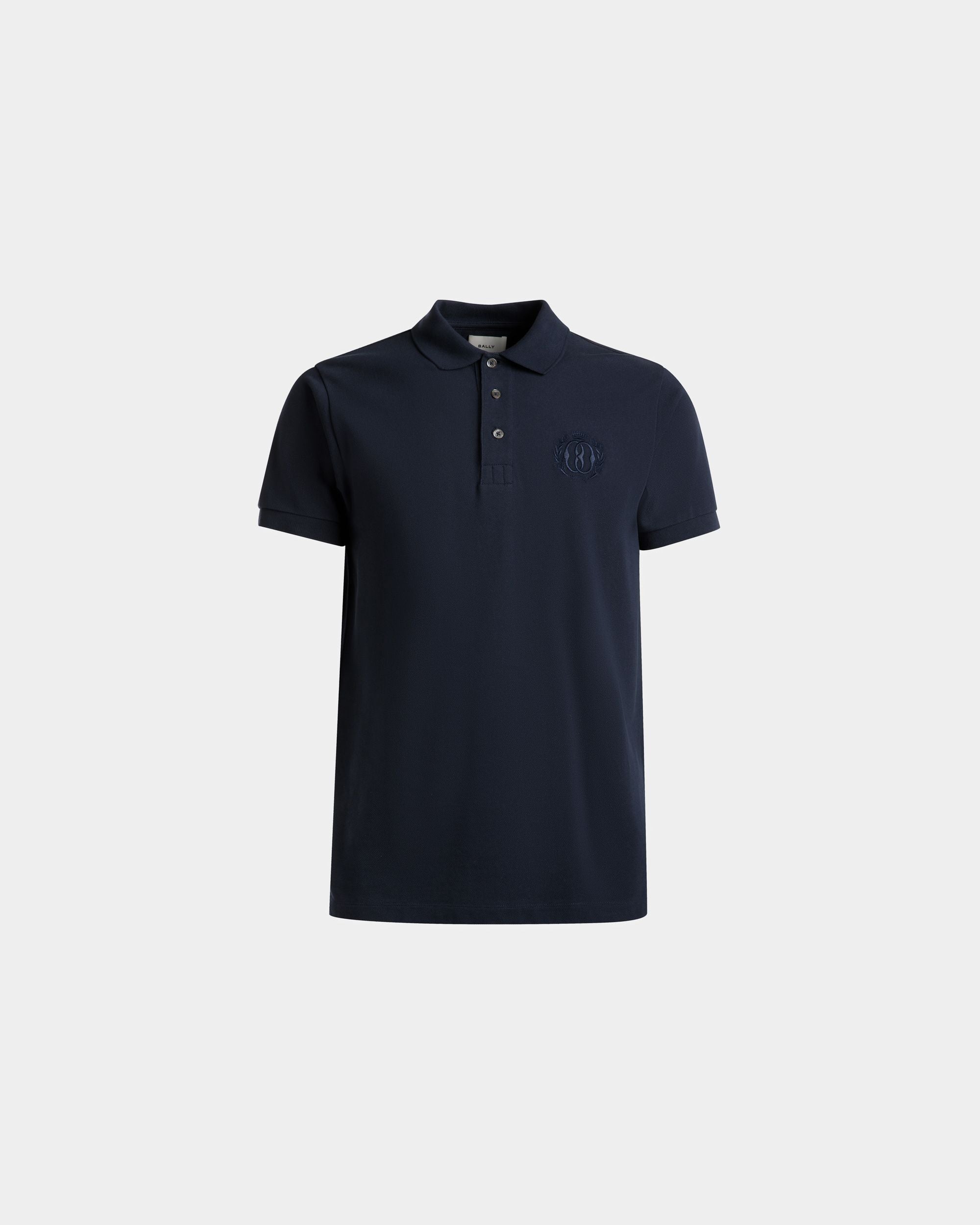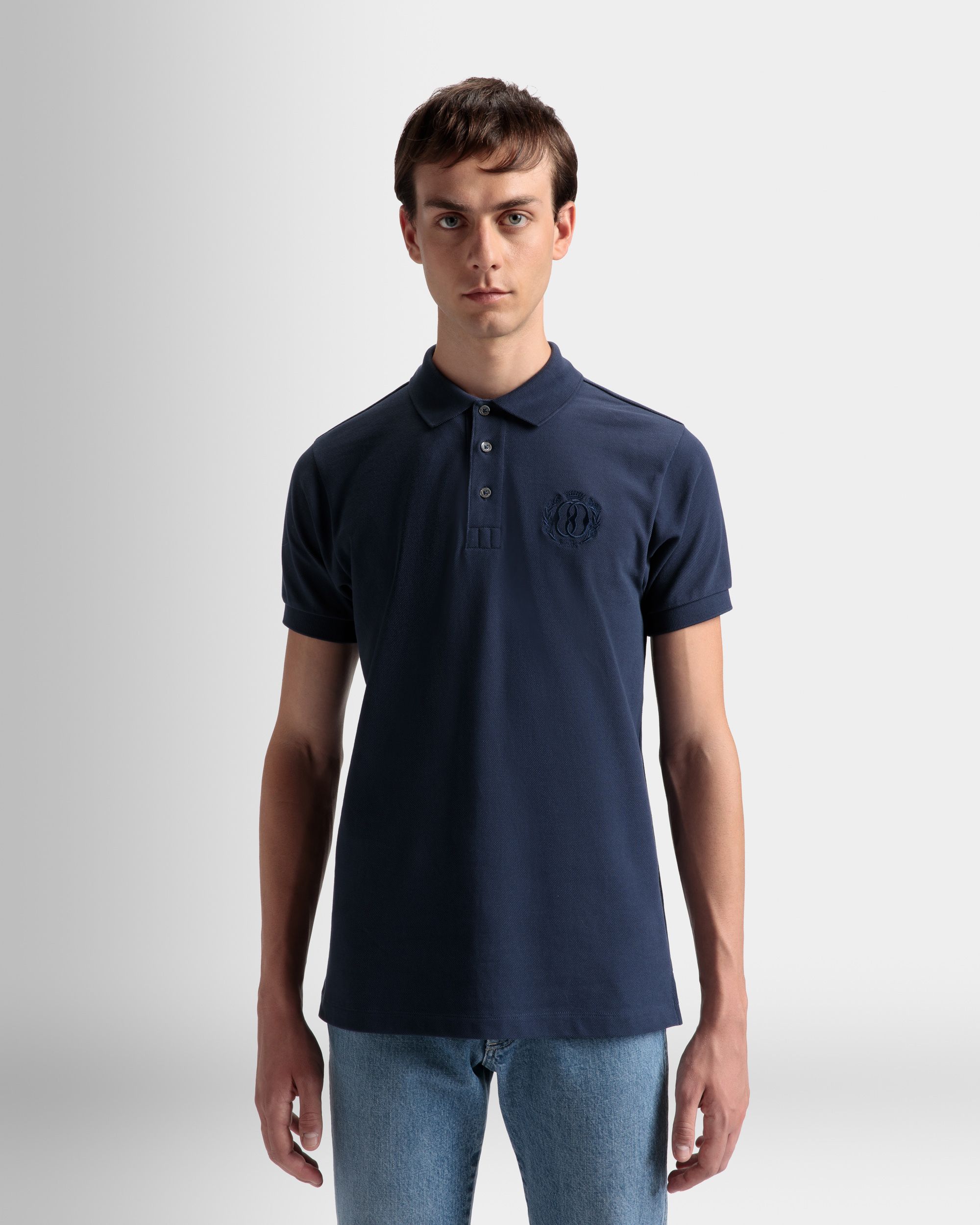 Classic short-sleeve pique-knit polo shirt in a navy blue hue. Ribbed trim on the collar and cuffs. An embroidered Bally Crest decorates the left chest. complementing the three-button placket.