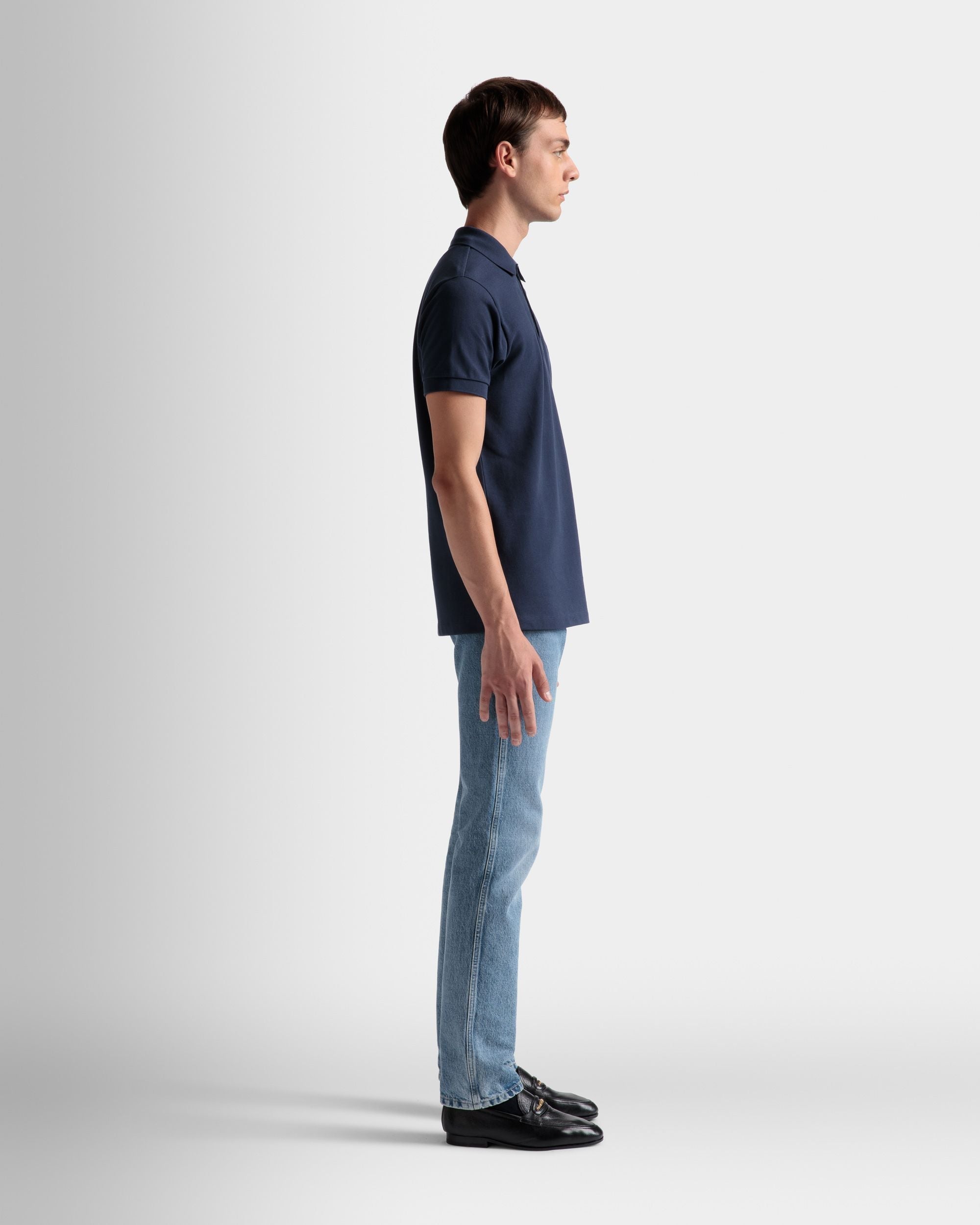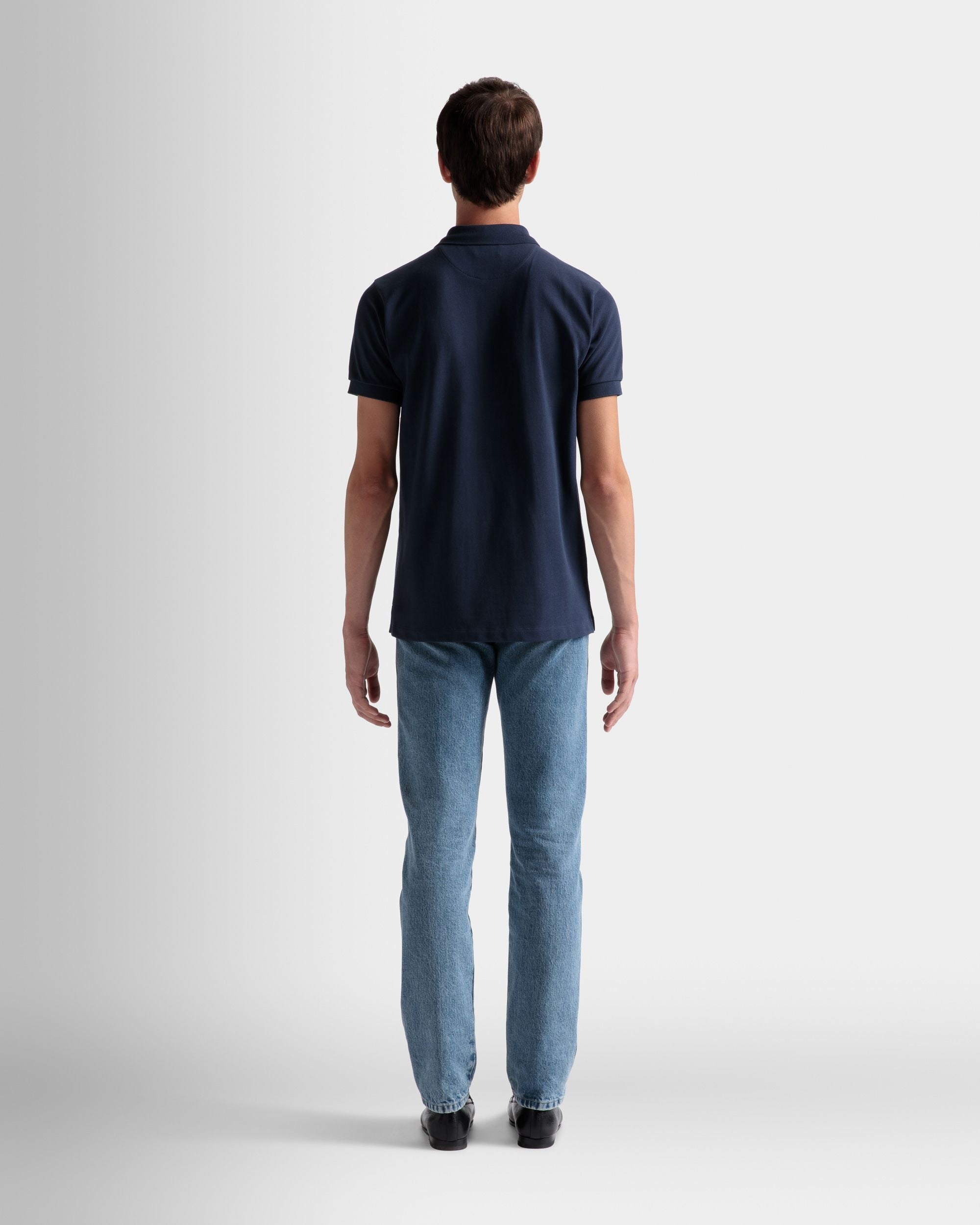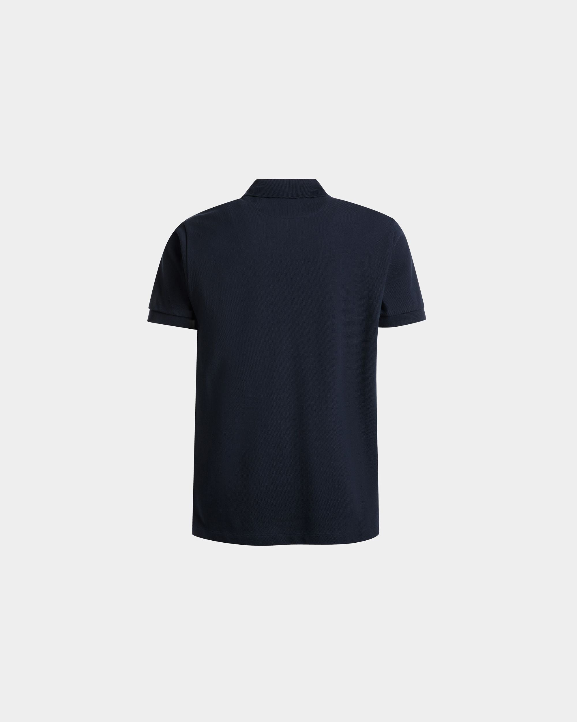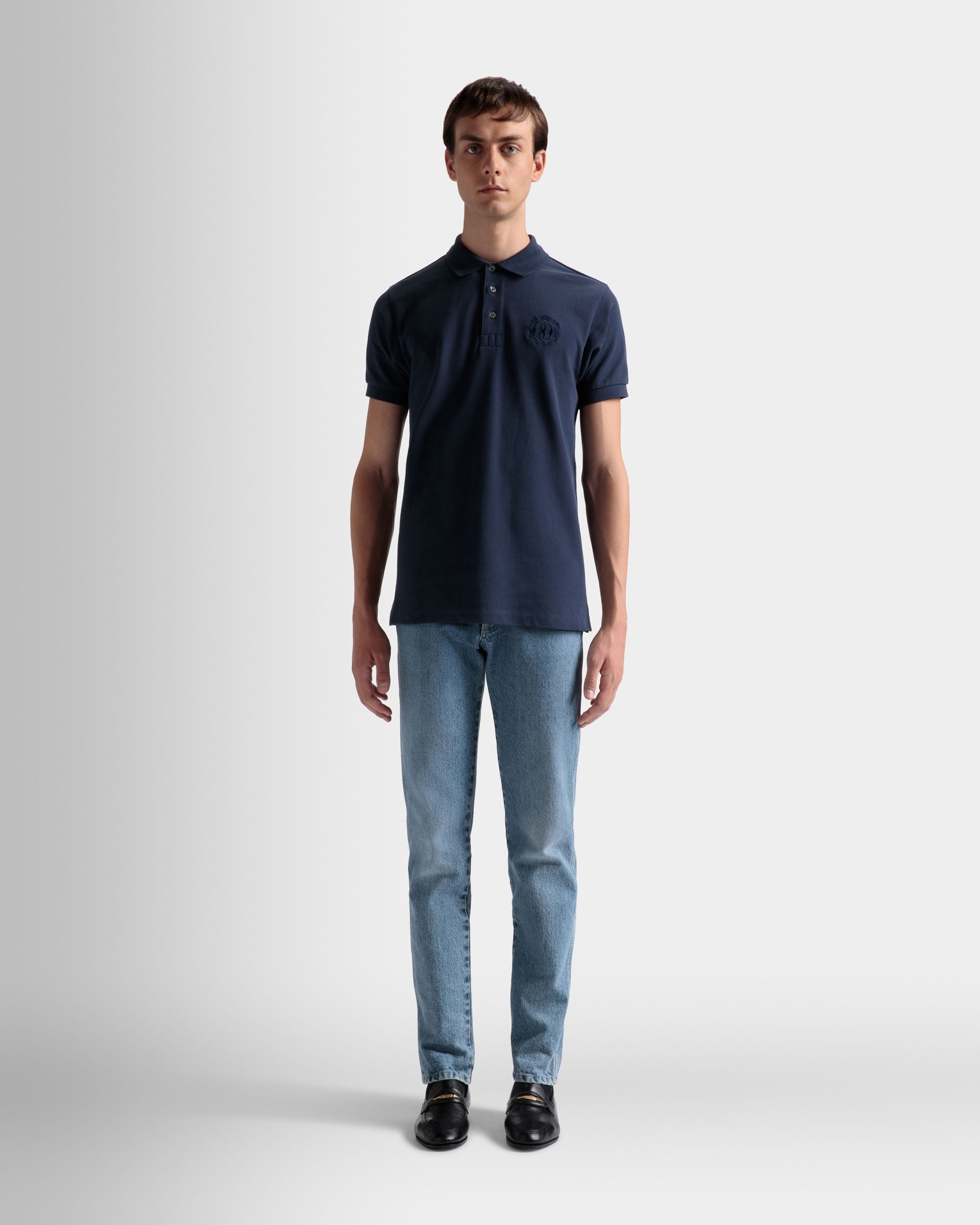 Classic short-sleeve pique-knit polo shirt in a navy blue hue. Ribbed trim on the collar and cuffs. An embroidered Bally Crest decorates the left chest. complementing the three-button placket.