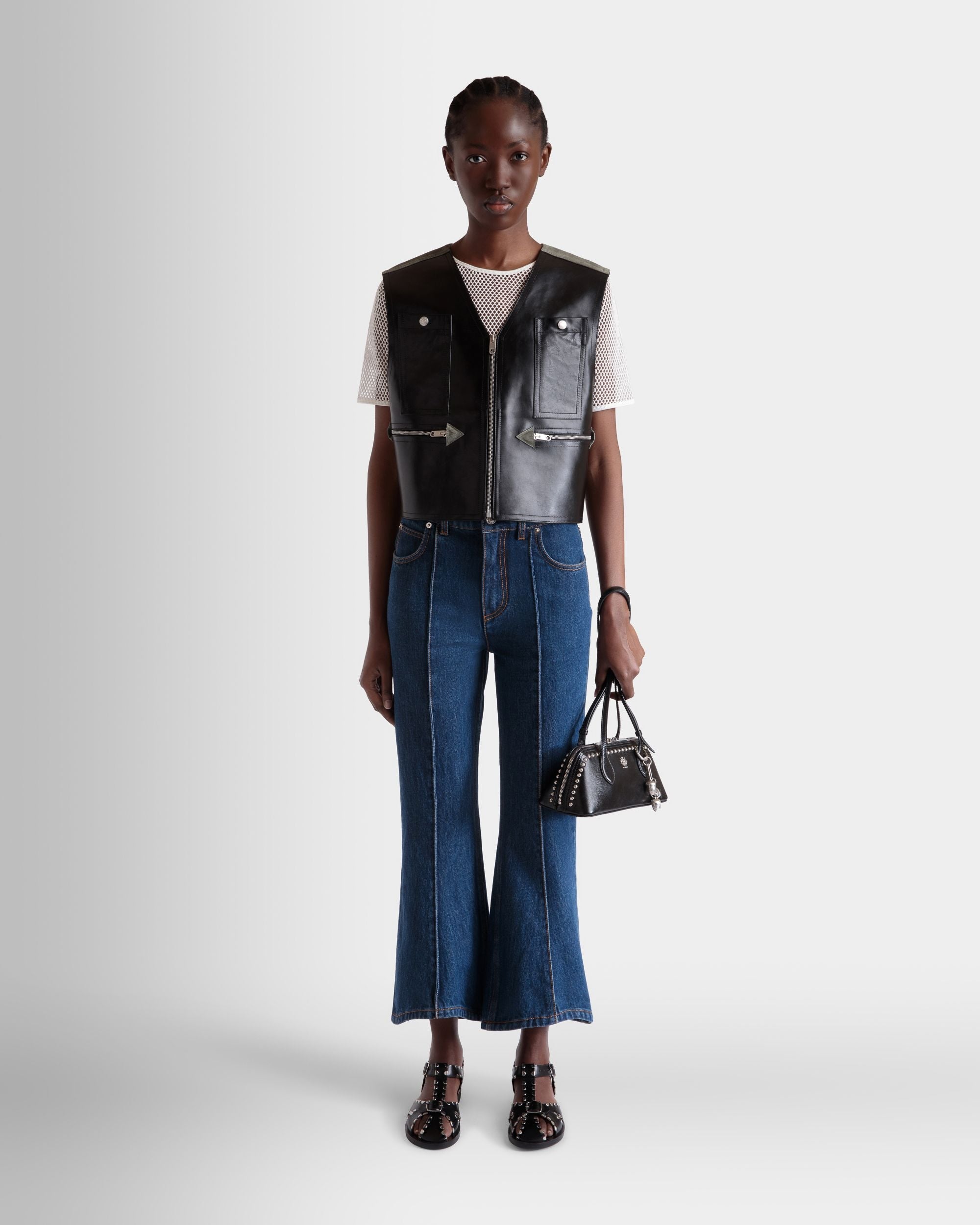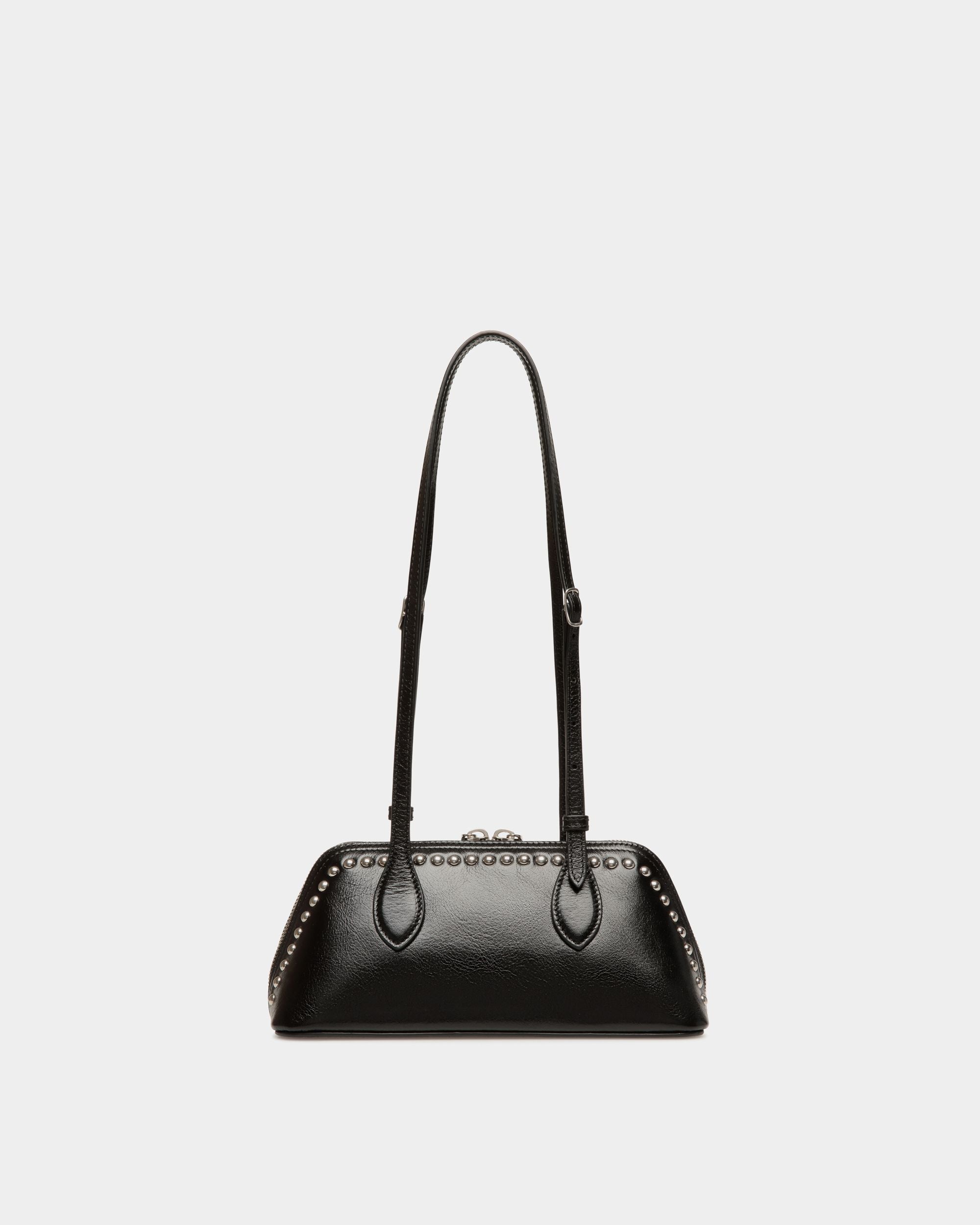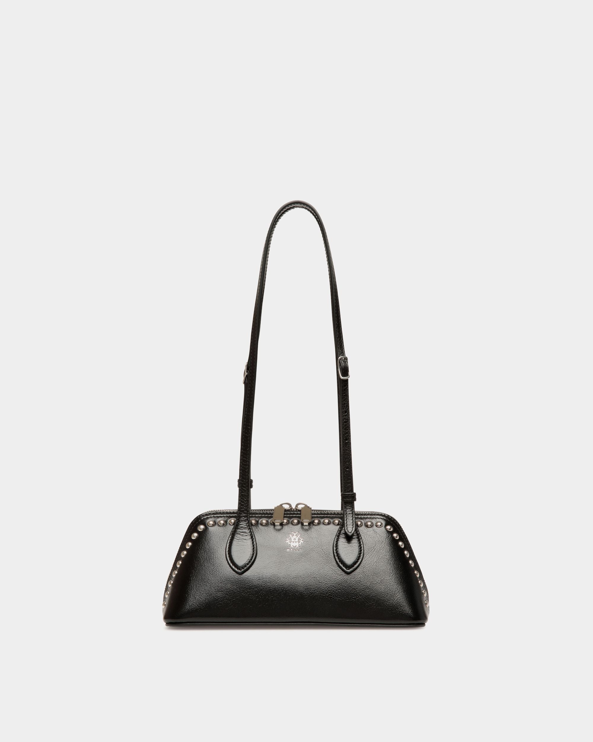 The Praline minibag in black craquelure leather features a compact trapezoid silhouette carried by two elongated top handles. The zipper opening extends along the top. studded by palladium-hue orbs.