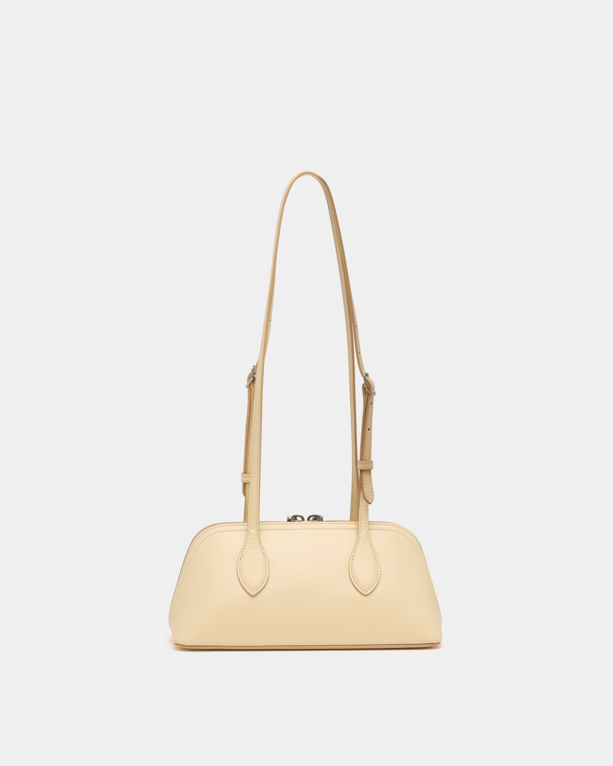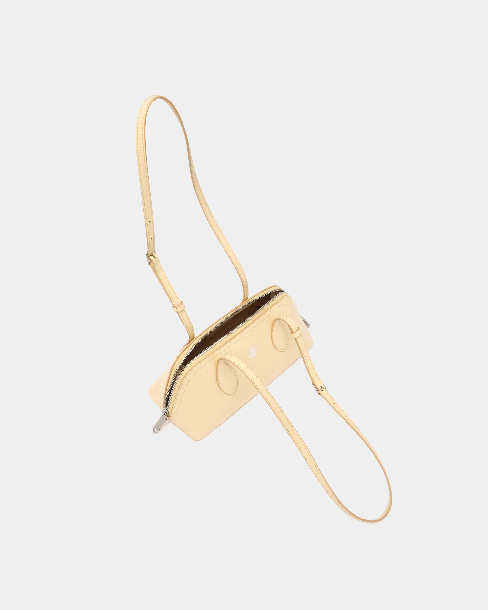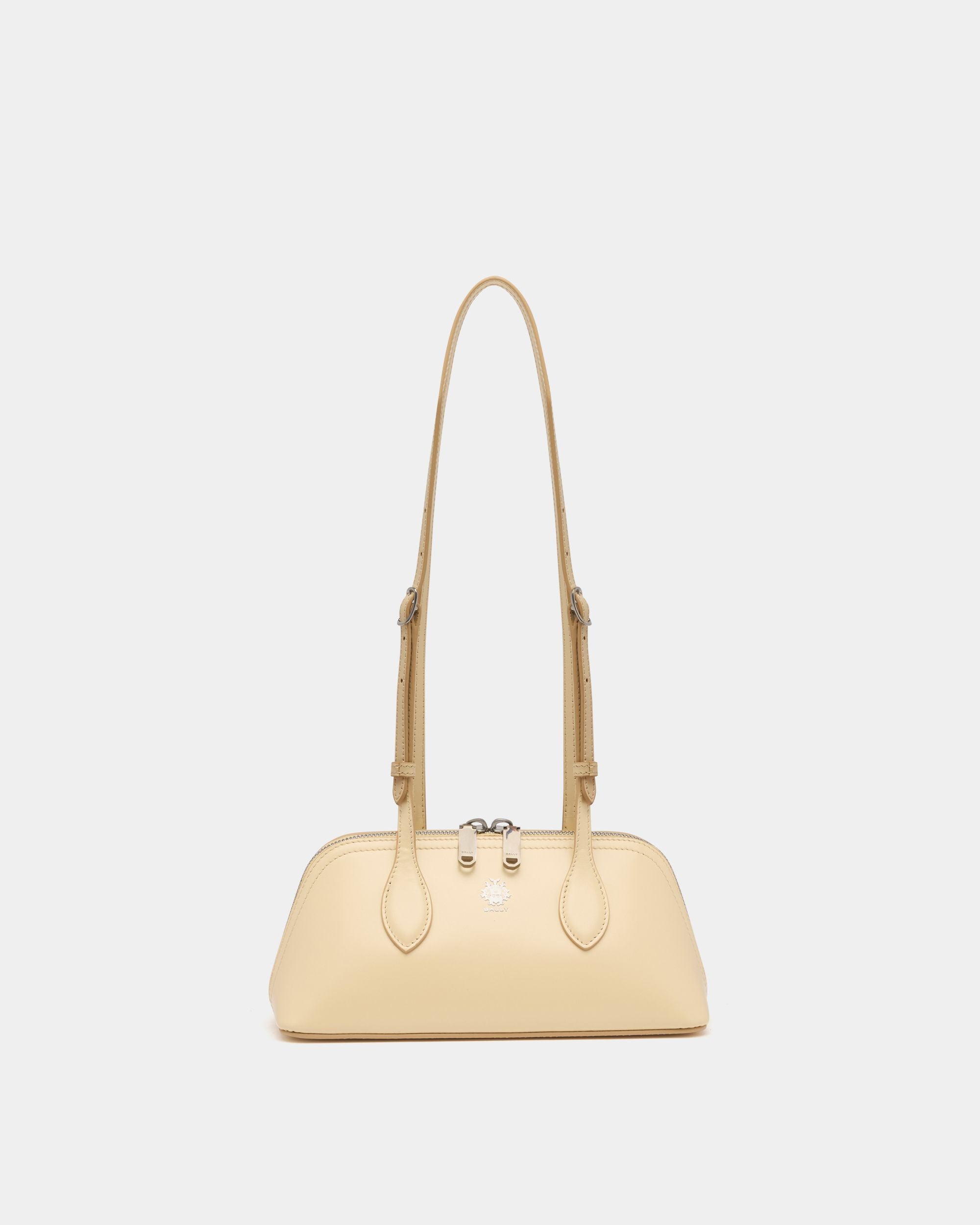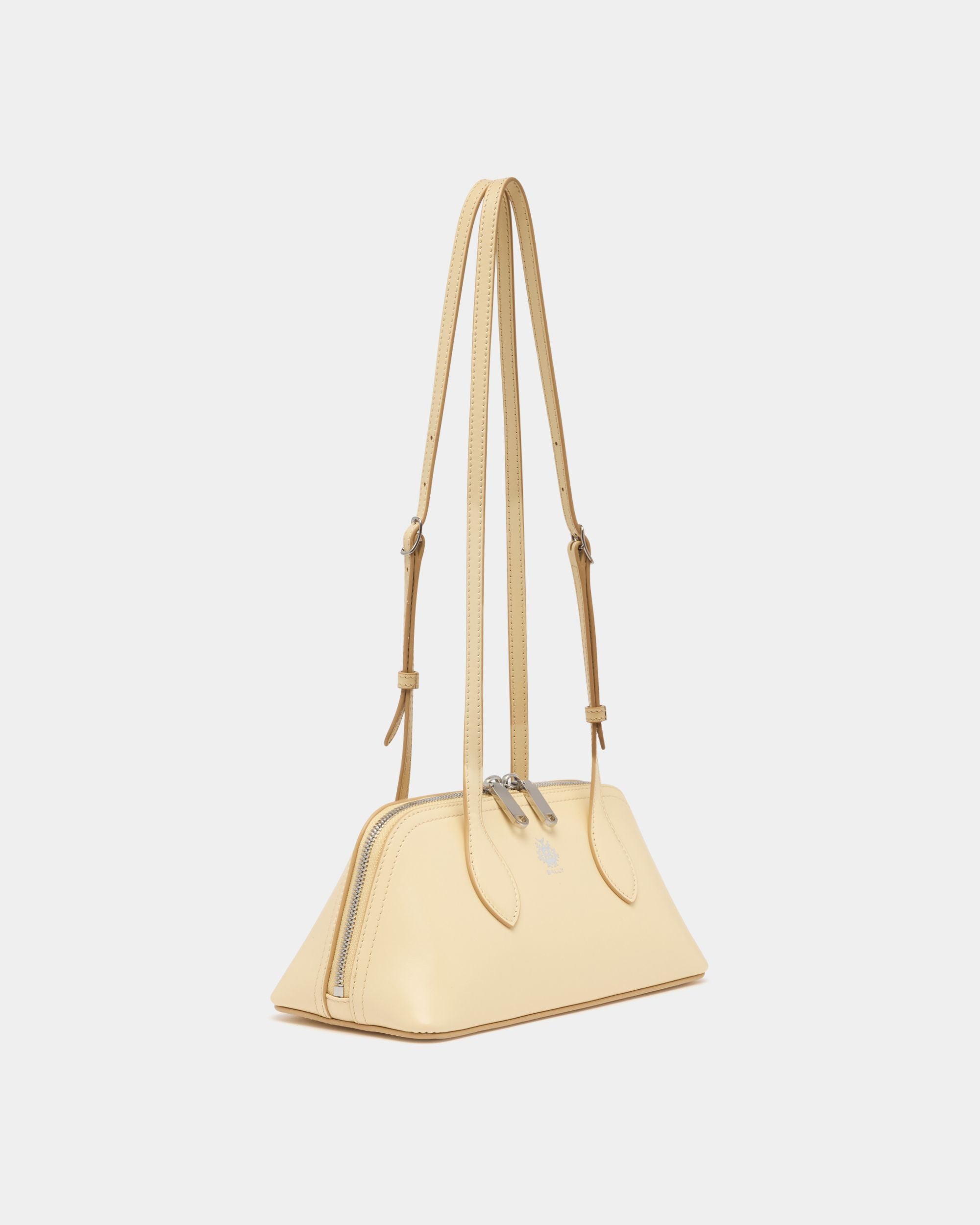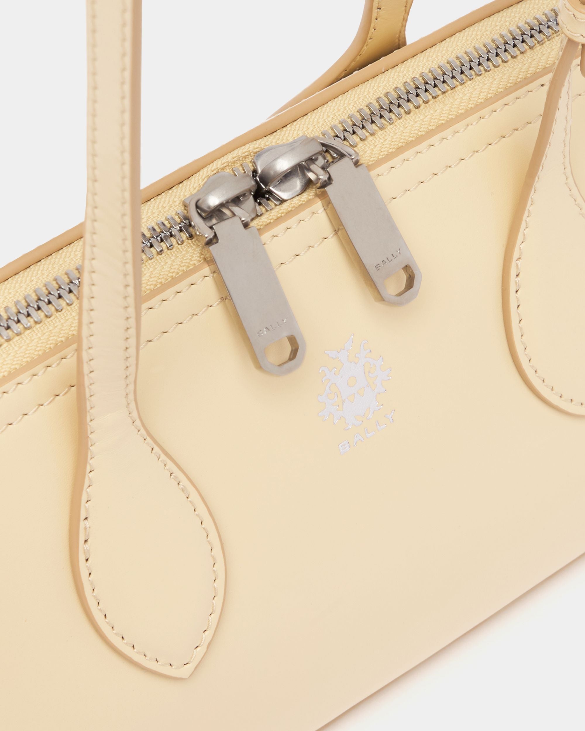 The Praline minibag in Ginger leather features a compact trapezoid volume carried by two elongated top handles. A Bally Crest in palladium-hue foil creates an iconic note.