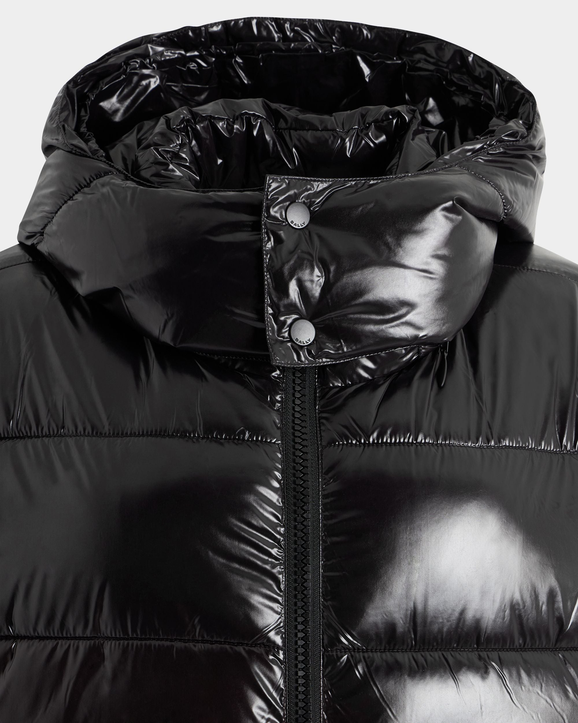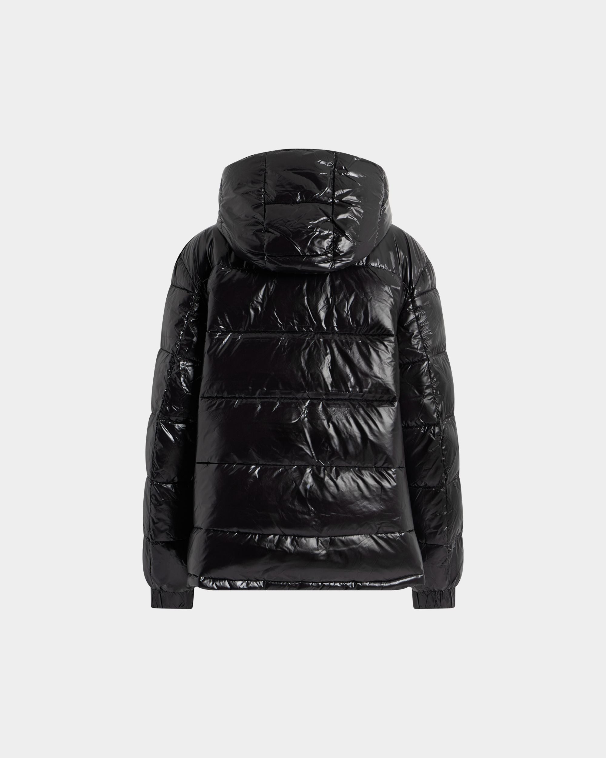 This style features a generous fit. We recommend selecting TWO SIZES SMALLER than your usual size. This sleek puffer jacket in shiny black nylon features wide bar quilting. a high neck and a detachable hood.
