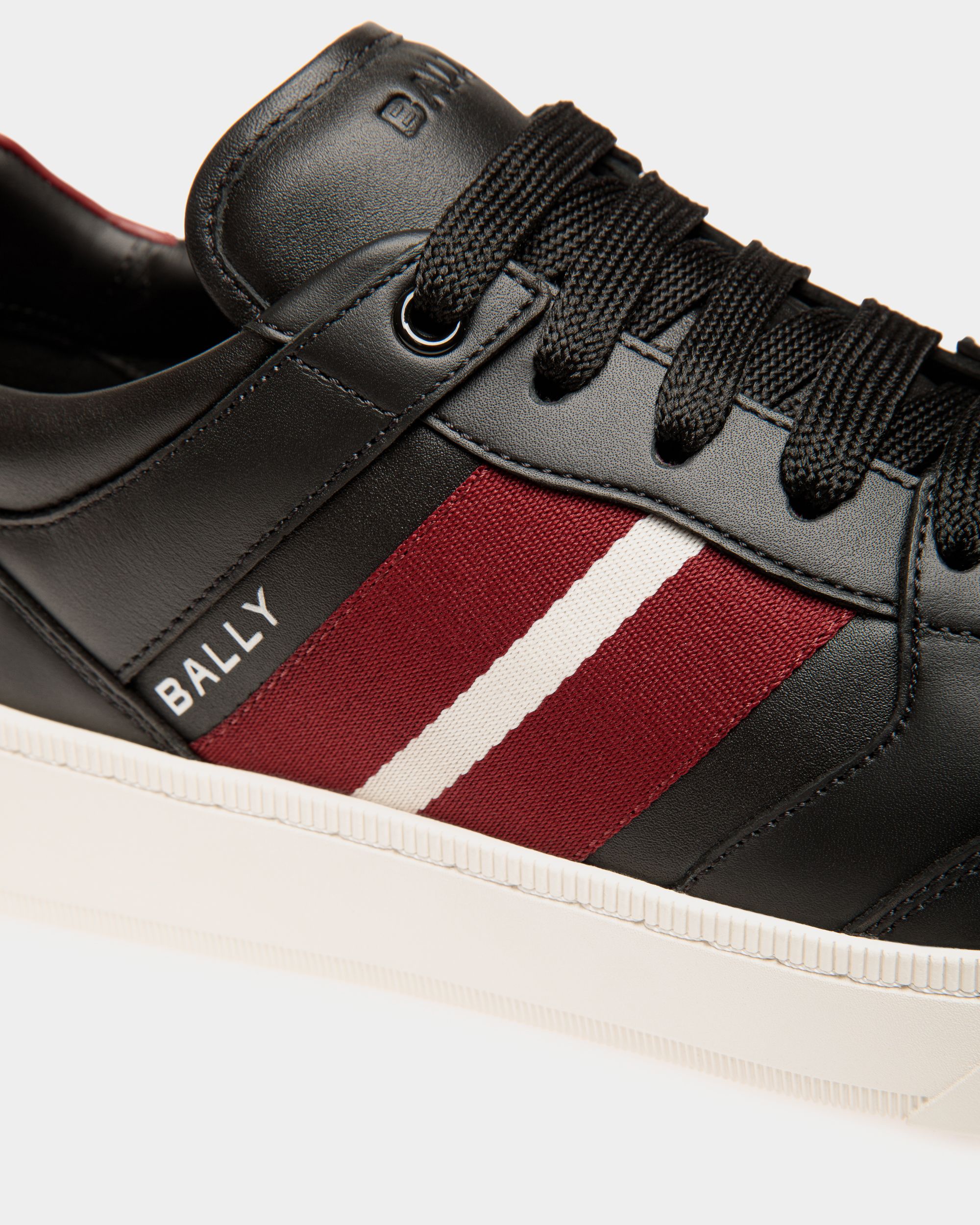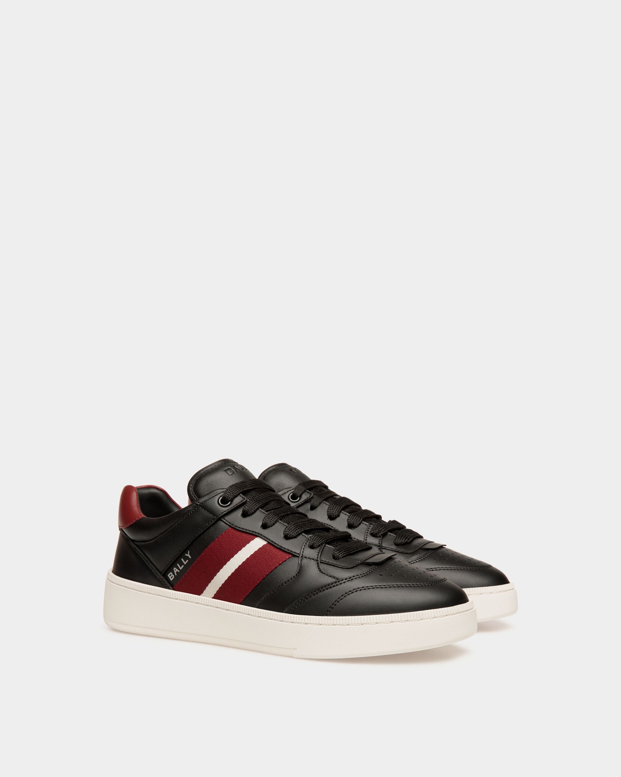 With a sleek design emblazoned by a red and white Bally Ribbon. these black leather sneakers combine style and functionality. The supple calfskin upper offers a luxurious feel. while the rubber sole guarantees optimal grip and flexibility for all-day comfort.